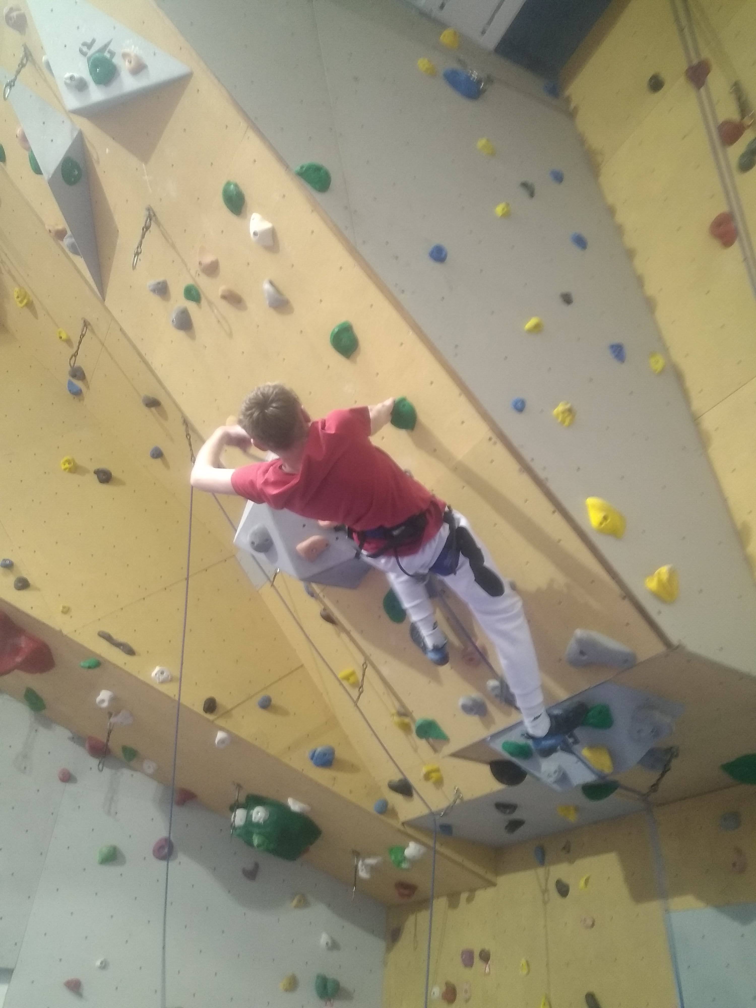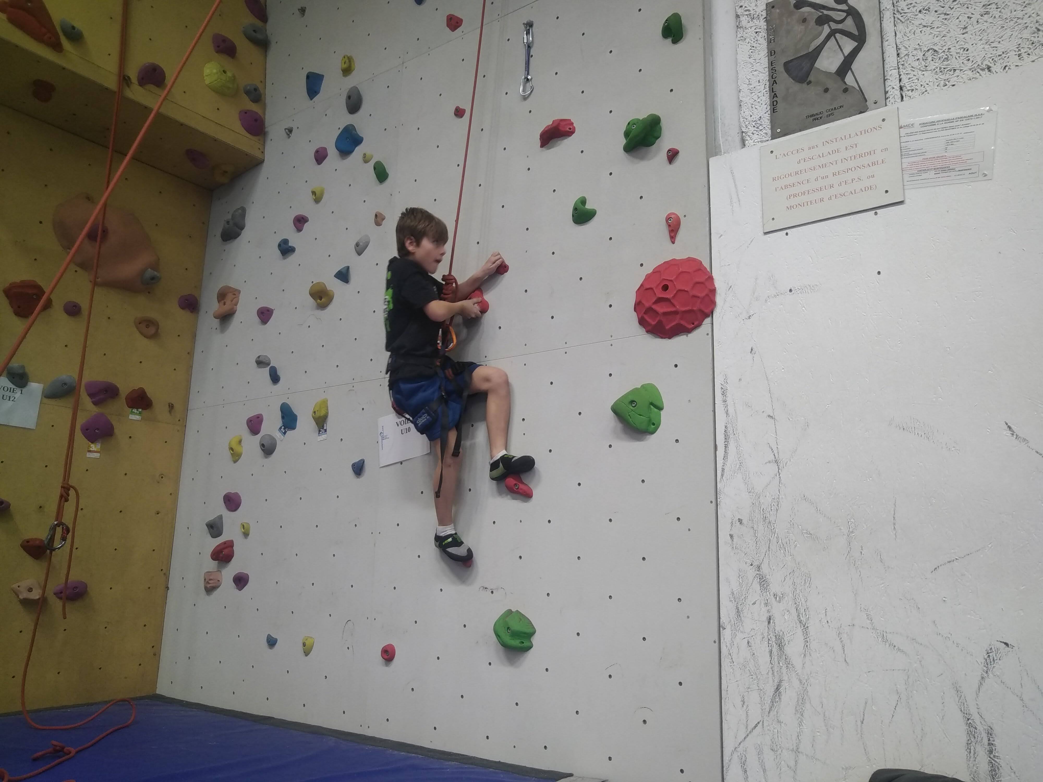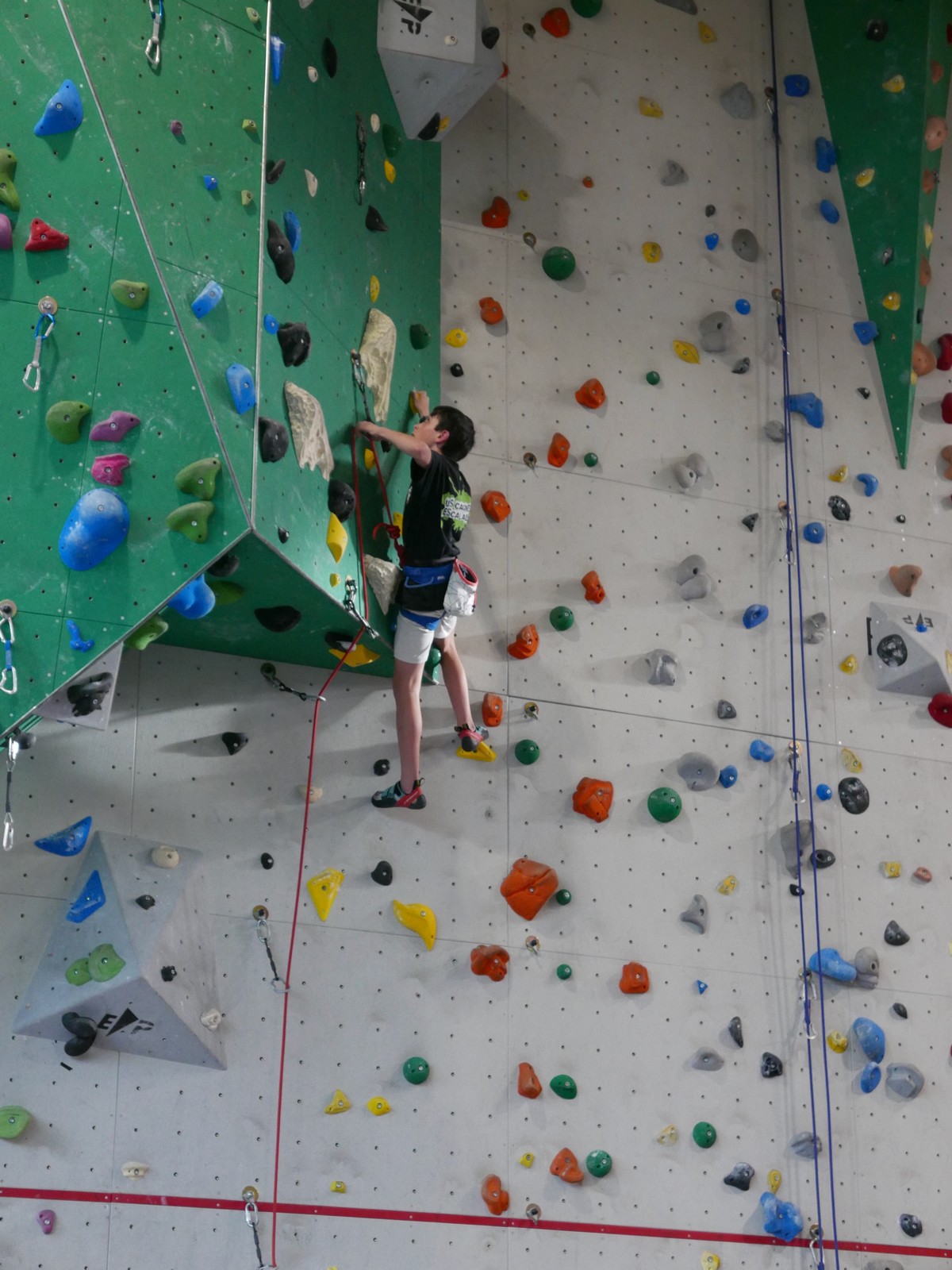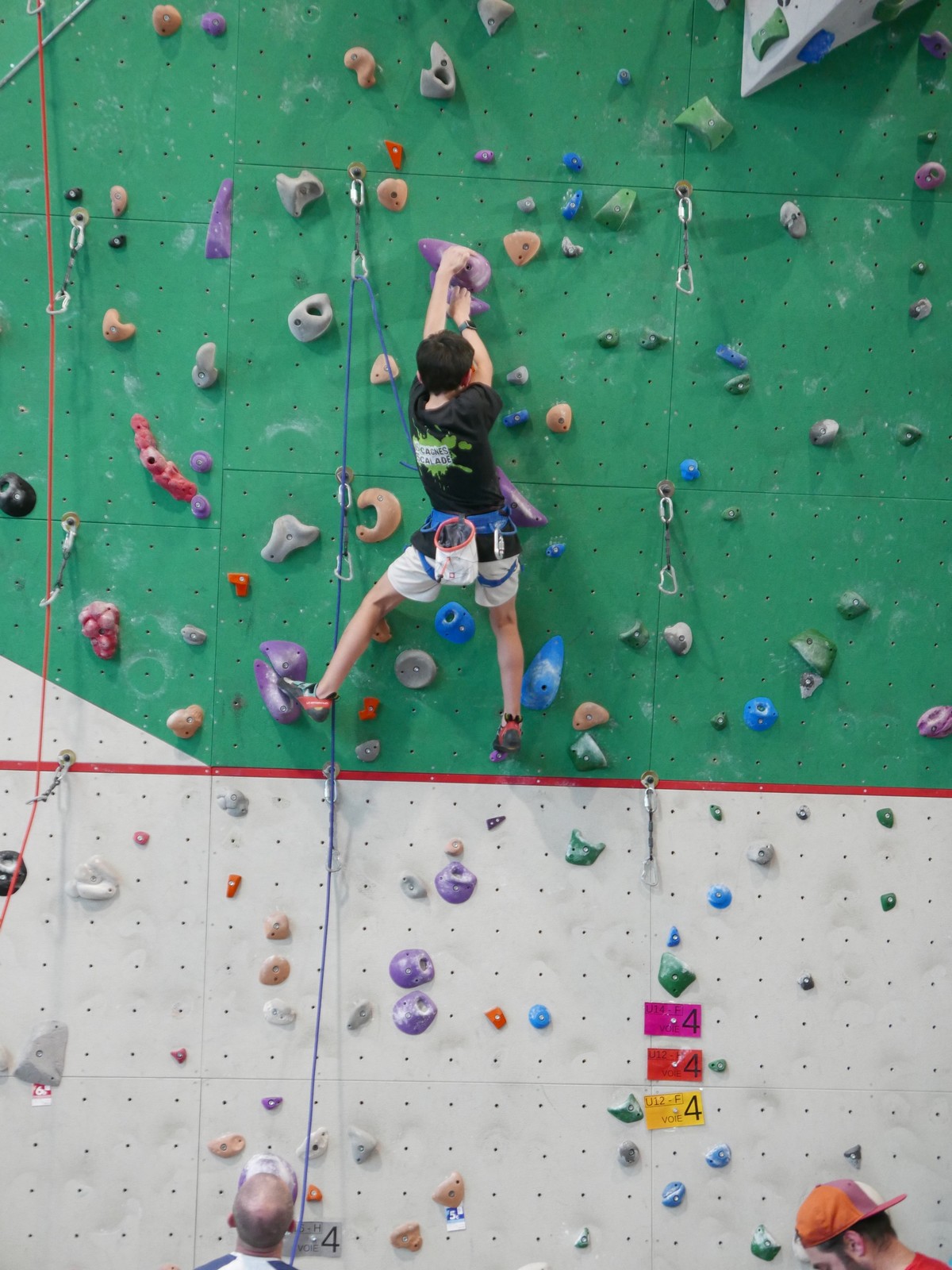 Une fois les filles passées, c’est au tour des garçons et en U10H, nous avons Paul, Robin, Léon et Boris. Robin sort sa voie 1, fait une belle montée presque au sommet de la voie 2, s’en sort avec les honneurs dans la terrible voie 3 mais ne comprend pas le départ de la voie 4, ce qui le fait dégringoler dans le classement. Il termine 17ème mais peut viser bien plus haut.