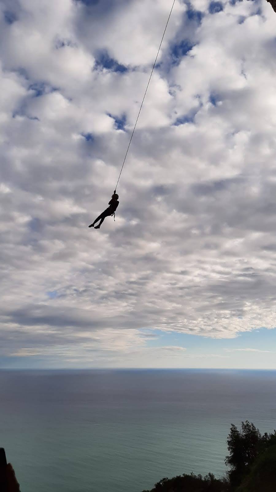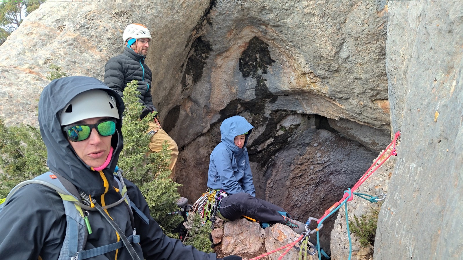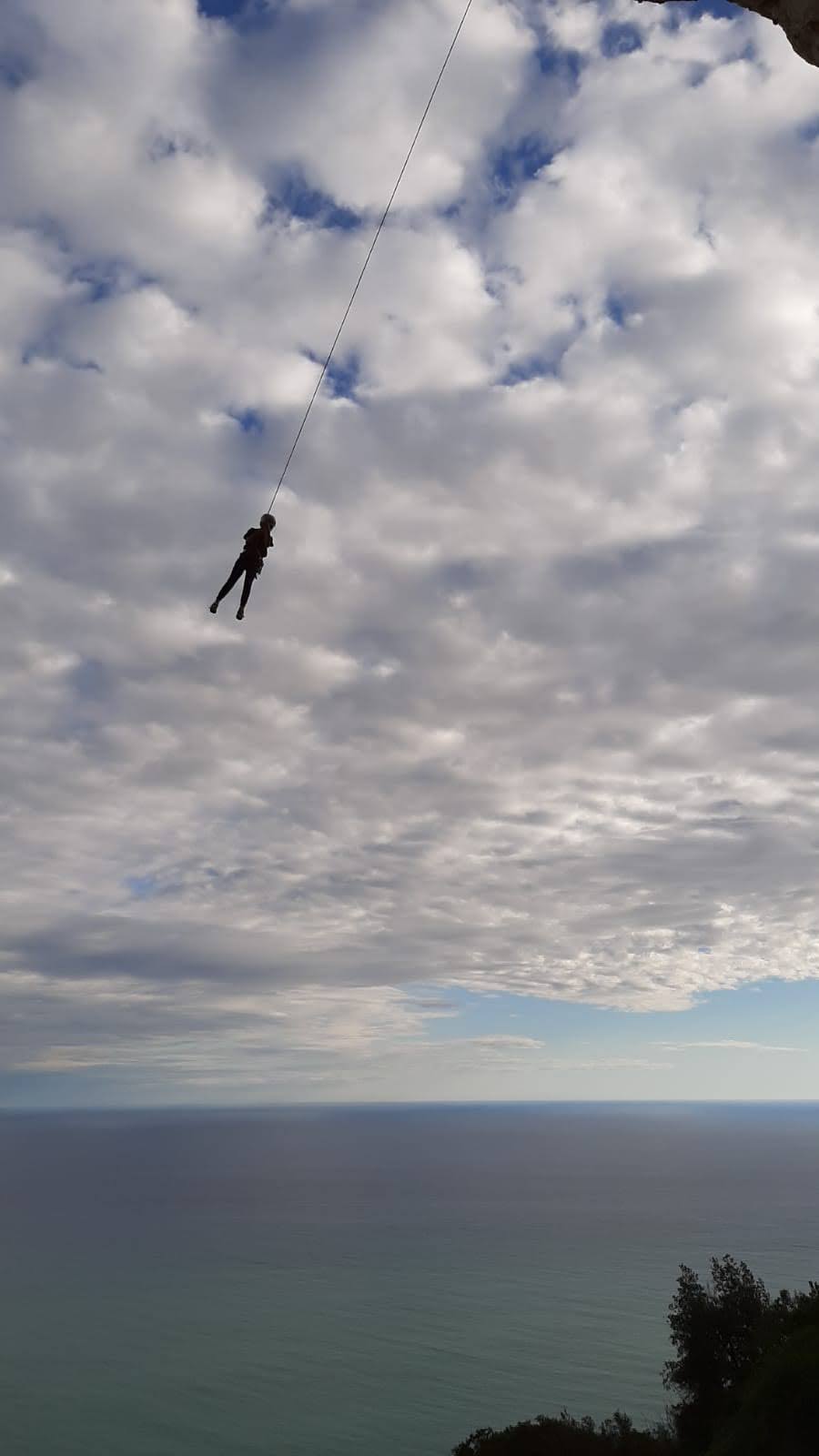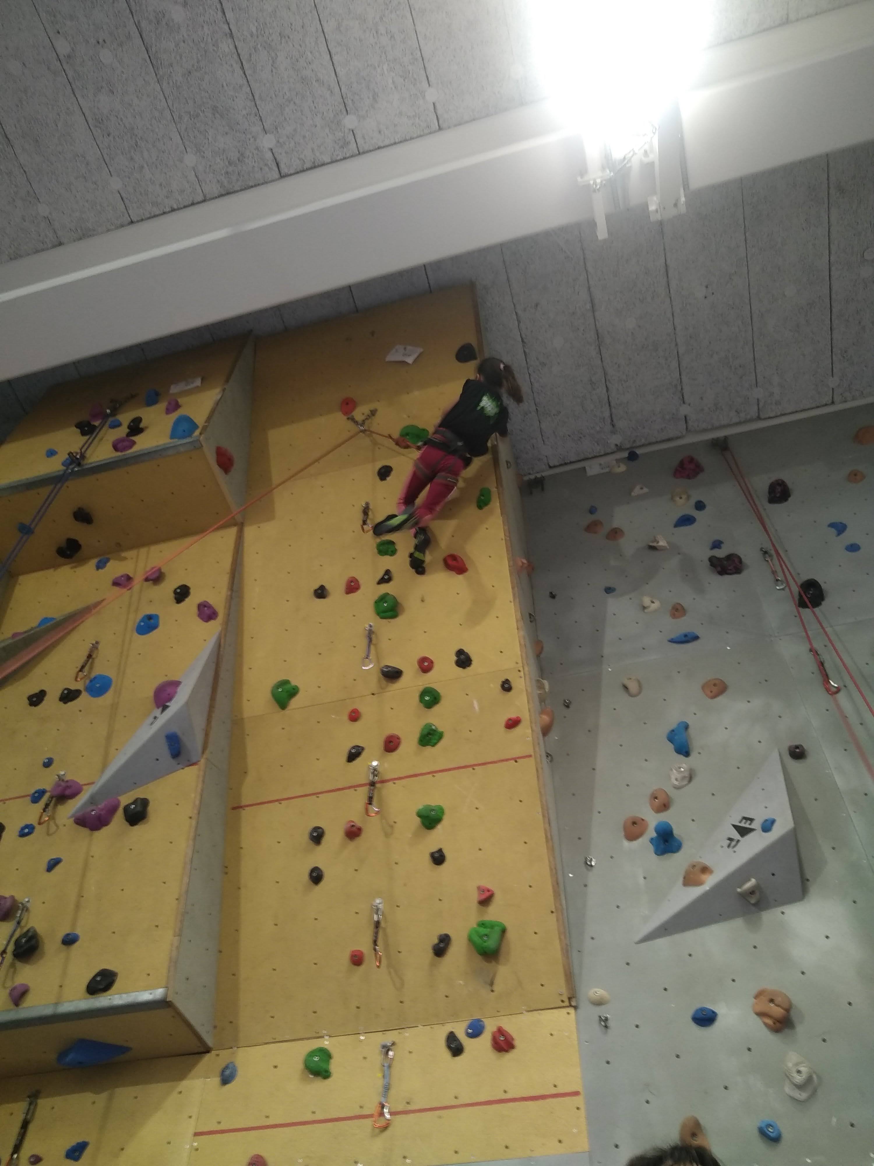 Hanaé a pas mal de pression sur les épaules quand elle s’élance mais je sais qu’elle peut le faire. Elle grimpe bien, propre, mais le toit vient puiser dans ses réserves. Elle reste concentrée et se atteint la dernière prise. Ne lui reste qu’à clipper le relais mais un manque de mou à l’assurage l’en empêche et la renvoie dans les airs. Il faut dire que le toit n’est pas non plus très haut et que la disposition de la dernière prise obligeait les grimpeurs à sortir pas mal de mou, situation particulièrement tendue pour l’assureur ! Mieux vaut un échec qu’un retour au sol !!