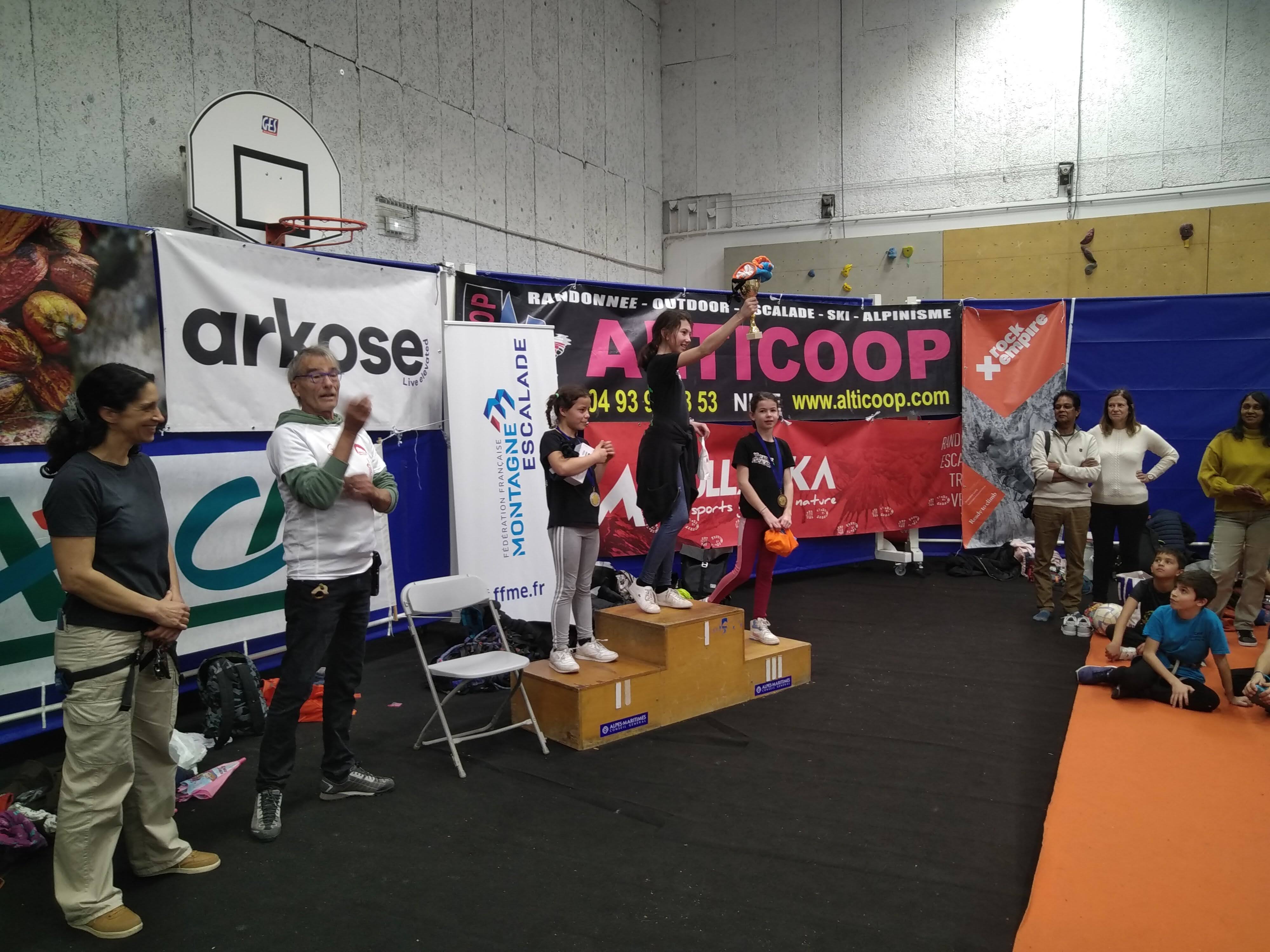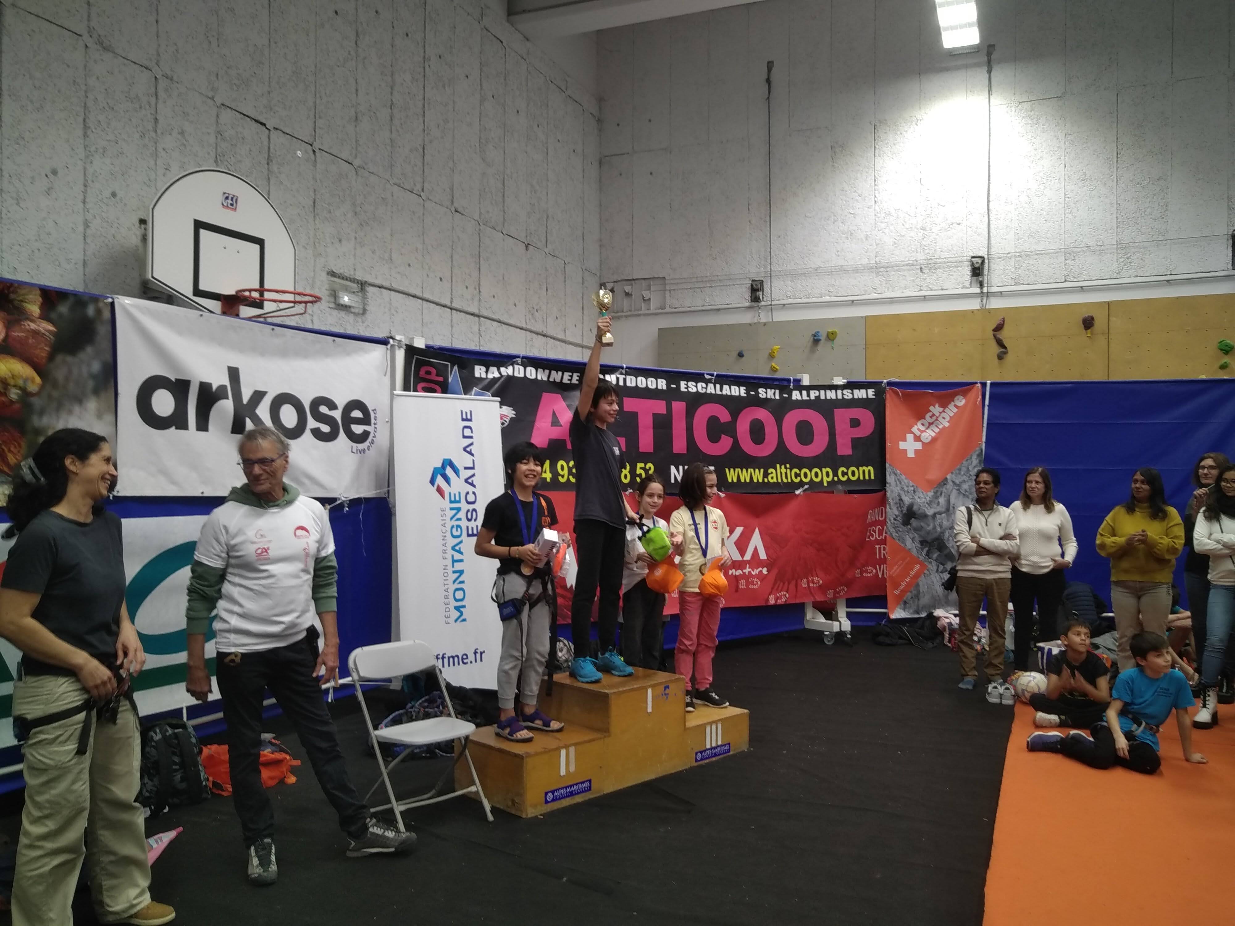 Et finalement et sans surprise, c’est Kaya qui obtient la meilleure place pour le club en sortant les voies 1 et 2 et faisant une belle performance dans la voie 3 au final un peu ambigu (la pancarte de top était accessible depuis l’avant dernière prise et il était tentant pour les enfants de sauter dessus, ce qui ne la valide pas). Elle obtient le deuxième meilleur score dans la voie 4, décidément trop dure dans le bas et prend la médaille d’argent, dans les traces de sa soeur Hanaé !