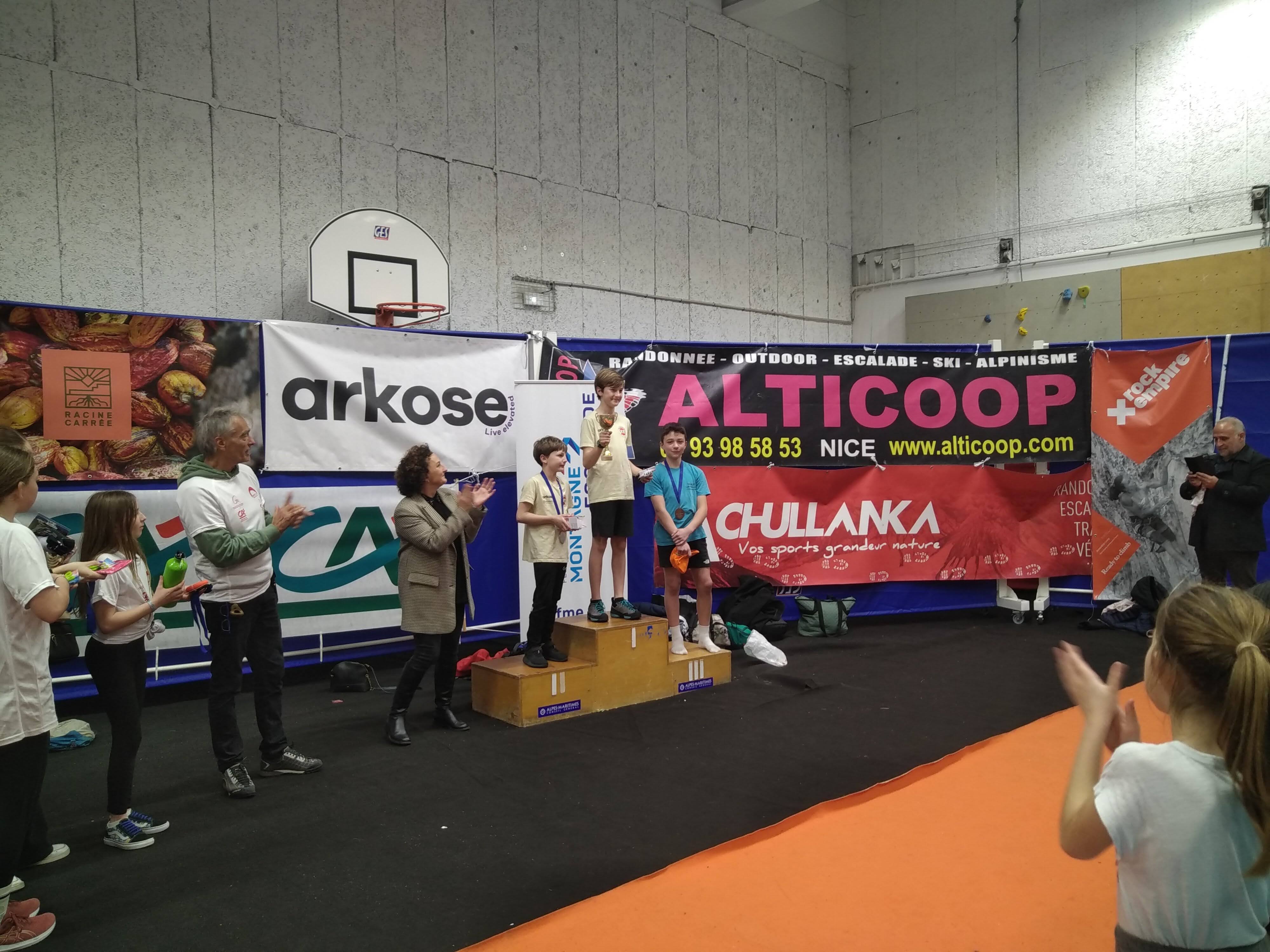 Devant, Boris est assez intouchable et malgré un stress évident et deux essais nécessaires pour toper sa voie 4, il gagne haut la main devant un Léon qui progresse à fond en ce moment avec 3 voies topées et une belle grimpe en voie 4. Léon mérite bien sa médaille d’argent. On notera tout de même une grosse disparité dans la façon d’assurer les participants avec parfois de l’aide, voire même des chutes non comptées, et cette fameuse ambiguïté sur le top de la voie 3 qui biaise un peu le haut du tableau.