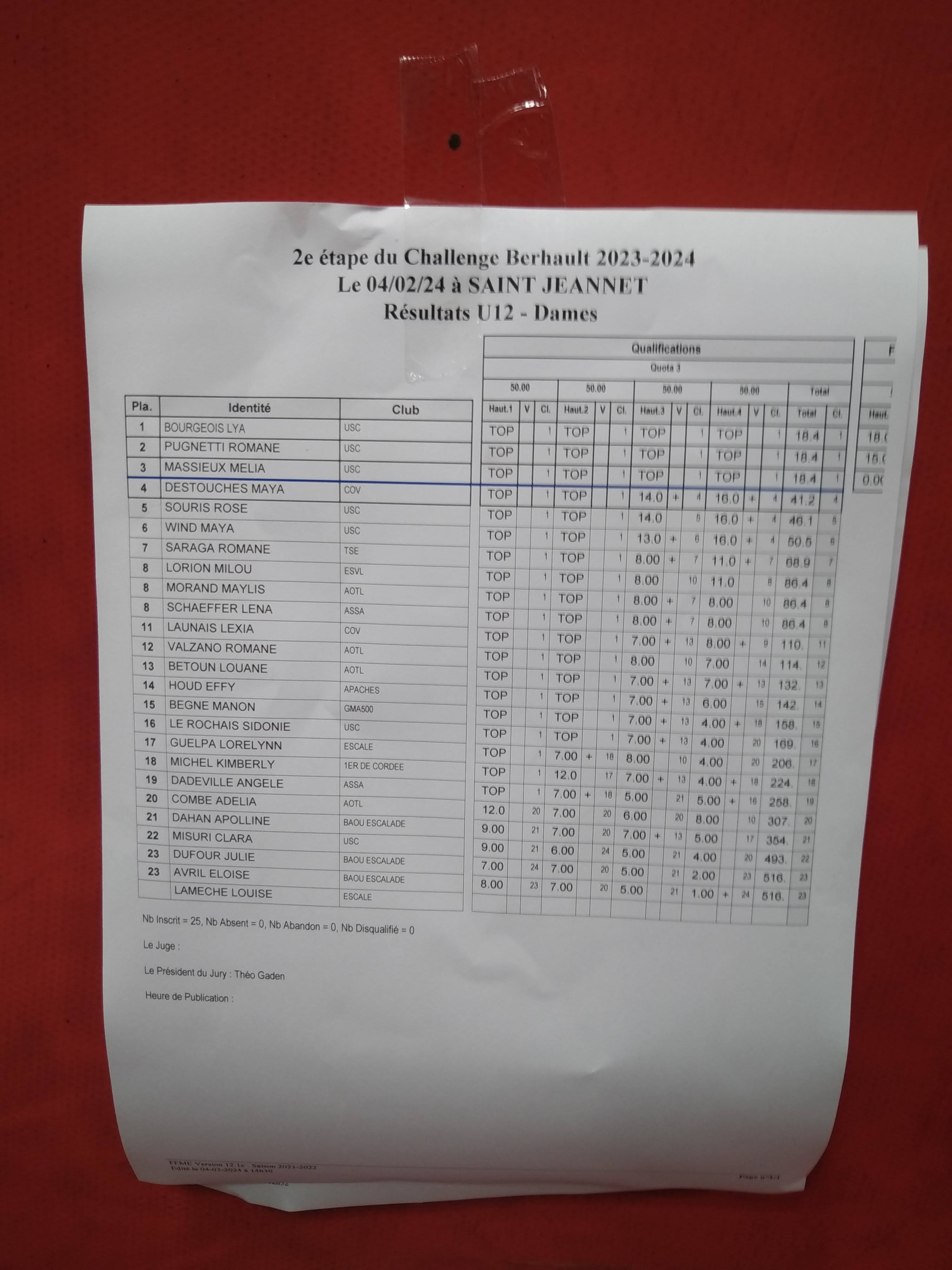 En U12H, ils ne sont que 2 du club : Malik et Timéo. Je ne parviens pas trop à voir grimper Malik, la faute à ce qu’il a mis le t-shirt blanc et rouge de St Jeannet, se confondant avec la masse d’enfants sur le mur ! Sans coaching, il ne parvient pas au sommet de la voie 2 alors qu’il a largement le niveau de la faire et se fait expulser en bas de tableau à la 26ème place, bien loin de la place qu’il peut faire. Timéo, quant à lui, fait une belle compétition. Tout se jouait dans la voie 3 qu’il sera le seul à sortir avec mes conseils et ceux du quintet des U12F. Bravo Timéo, tu as fait ce qu’il fallait et, une fois n’est pas coutume, tu es resté investi dans ta compétition et bien concentré jusqu’au bout et ça paie !