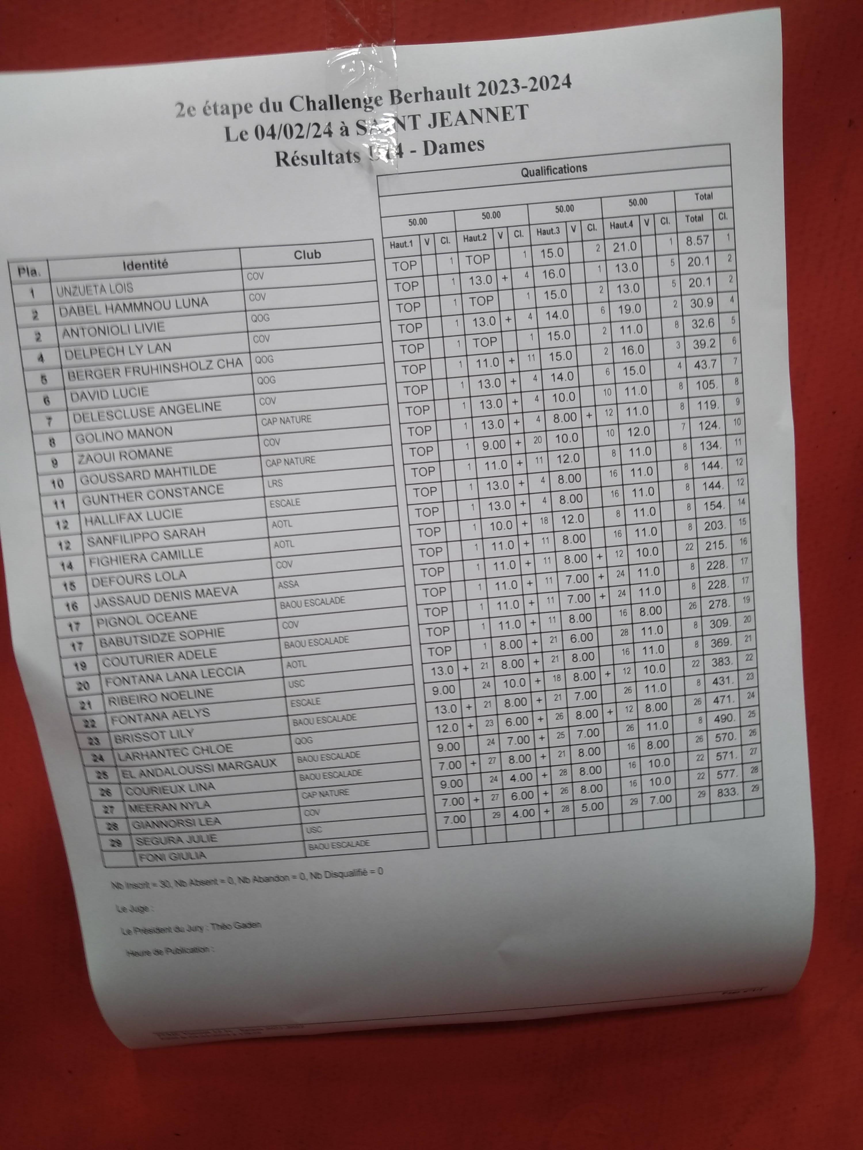 Plus haut dans le tableau on a Sidonie qui se retrouve dans le gros du paquet de celles qui ont réussis les 2 premières voies et se sont fait surprendre dans le bas des voies 3 et 4. De la 8ème place à la 16ème place, le classement n’est pas très significatif avec des écarts minimes. Le profil des voies à St Jeannet, qui présente souvent un petit toit dès la première dégaine, rend difficile d’ouvrir des voies typées « compétition » dont on souhait une difficulté progressive afin de bien départager les concurrents. Dans cette catégorie, c’est raté. Sidonie prend la 16ème place.