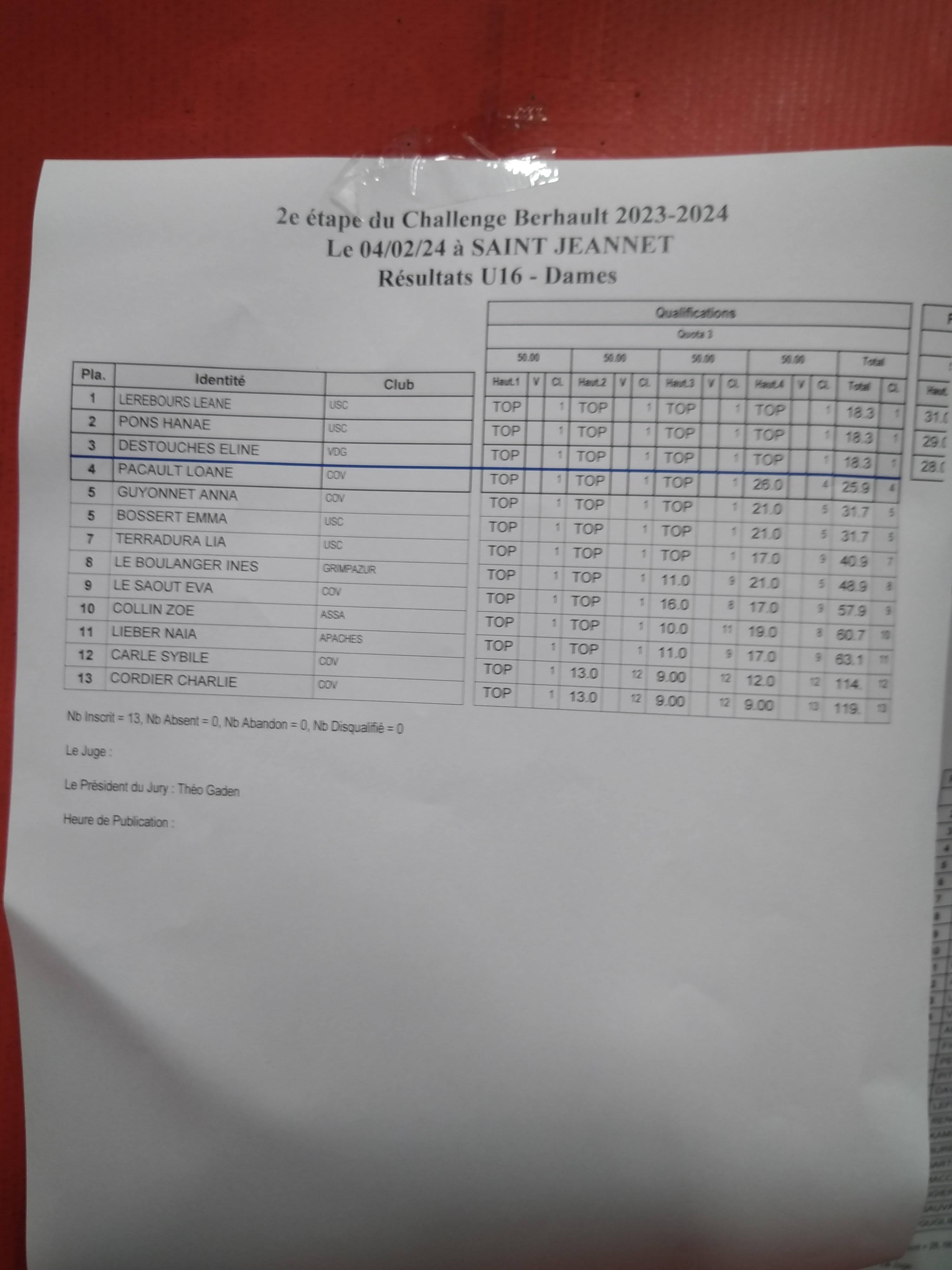 Passons chez les plus grandes avec en U16F, les célèbres Léane et Hanaé et leur duel de longue date, ainsi qu’Emma et Lia. Léane n’ayant pas participé à la première manche, elle est la première du club a attaquer le circuit et place la barre très haut en enchaînant ses 4 voies. Le ton est donné. Les 3 premières voies sont pour la peine assez faciles et la difficulté bien dosée même si on se questionne sur la pertinence de mettre leur mettre en voie 3 la voie 4 des U10 sans modification. Avec 6 ans d’écart elles ne font pas la même taille ! Le classement va se jouer dans la voie 4, un long plafond ! Et on sait que ce n’est pas à l’avantage d’Emma et de Lia, grimpeuses exprimant leur talent plutôt par leur technicité que par la force de leurs biceps ! Emma parvient cependant à bien entamer le toit et prend la 5ème place. Lia s’effondre physiquement juste à son début après déjà une longue grimpe fort déversante et un peu décontenancée par les clips. Elle termine 7ème.