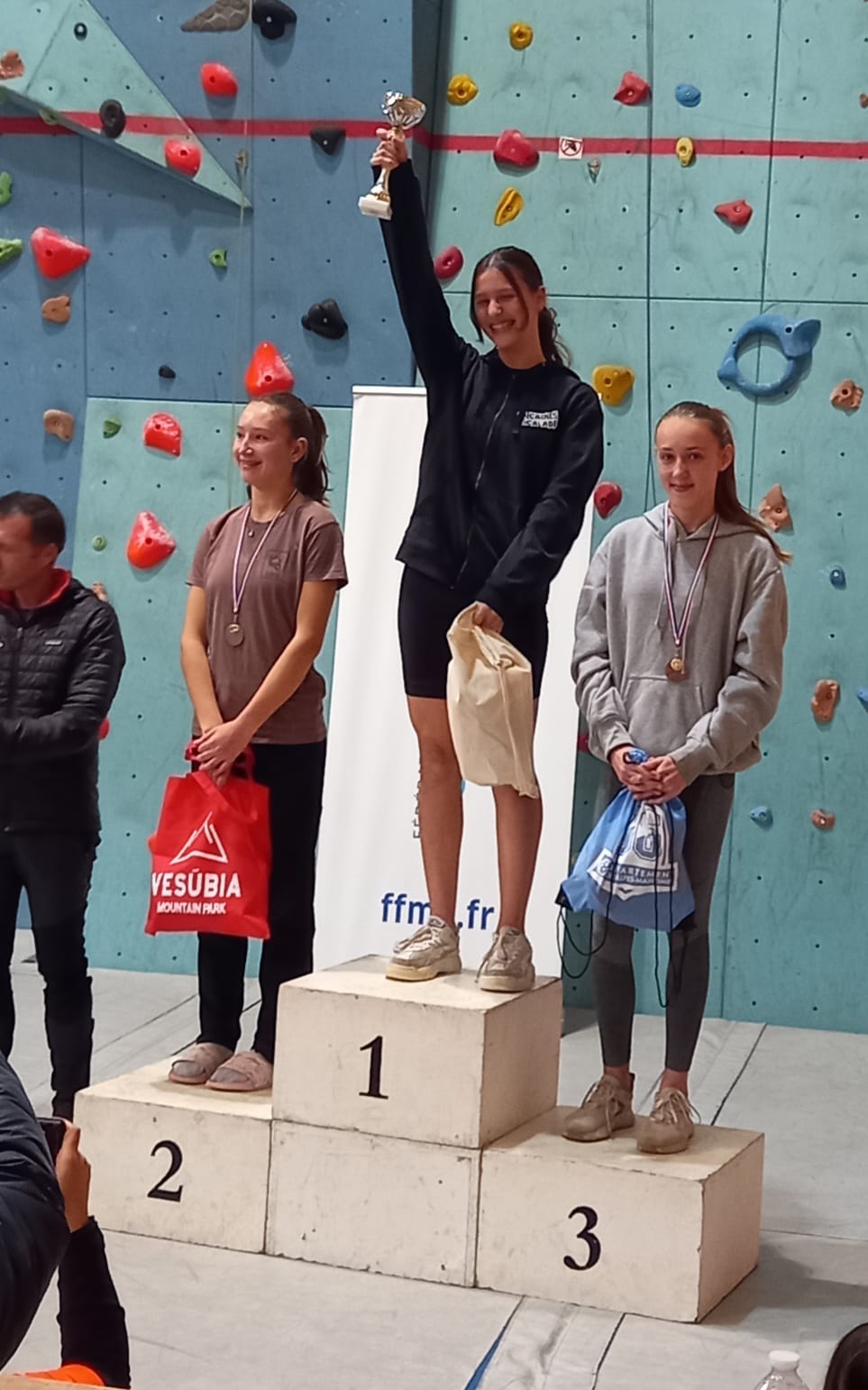 – Enfin, à l’extrême droite de la falaise, Cécile, Camille et François s’engagent dans « la voie de la fenêtre », en parfaite autonomie.