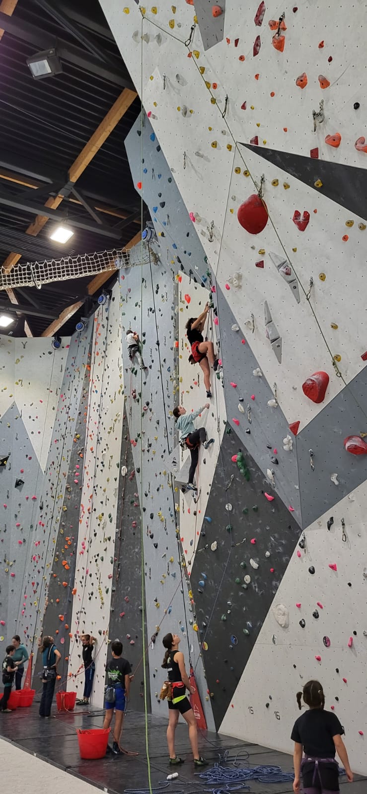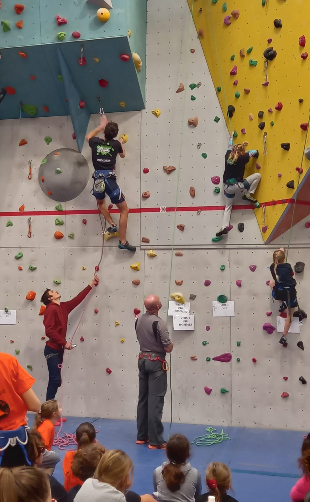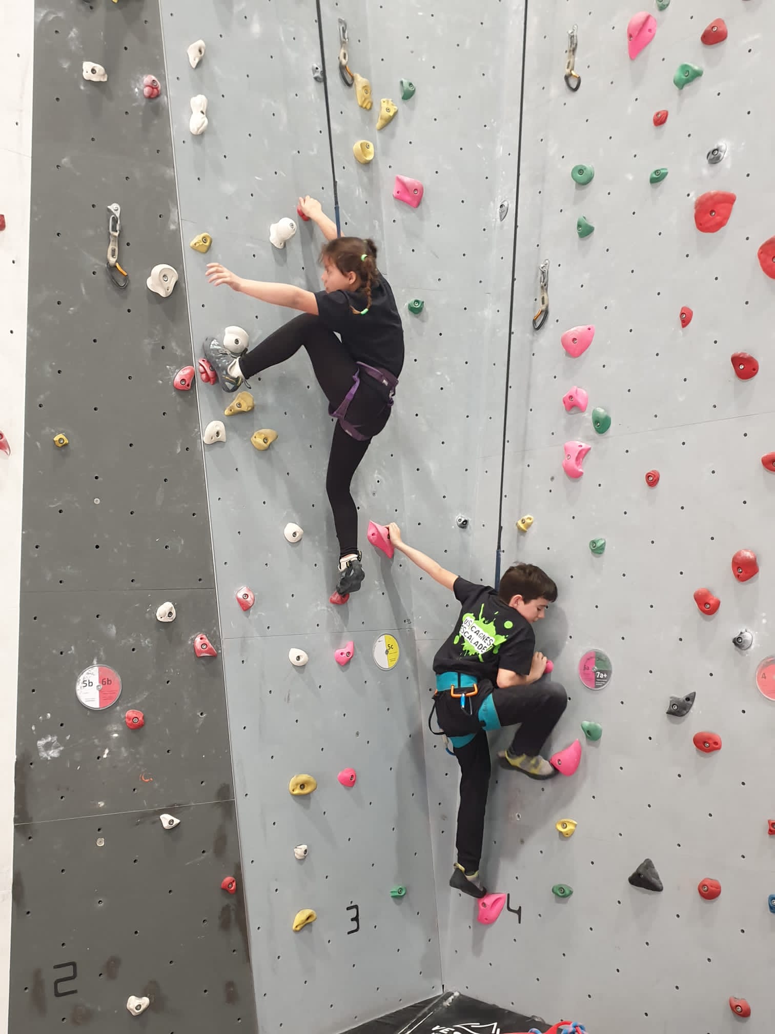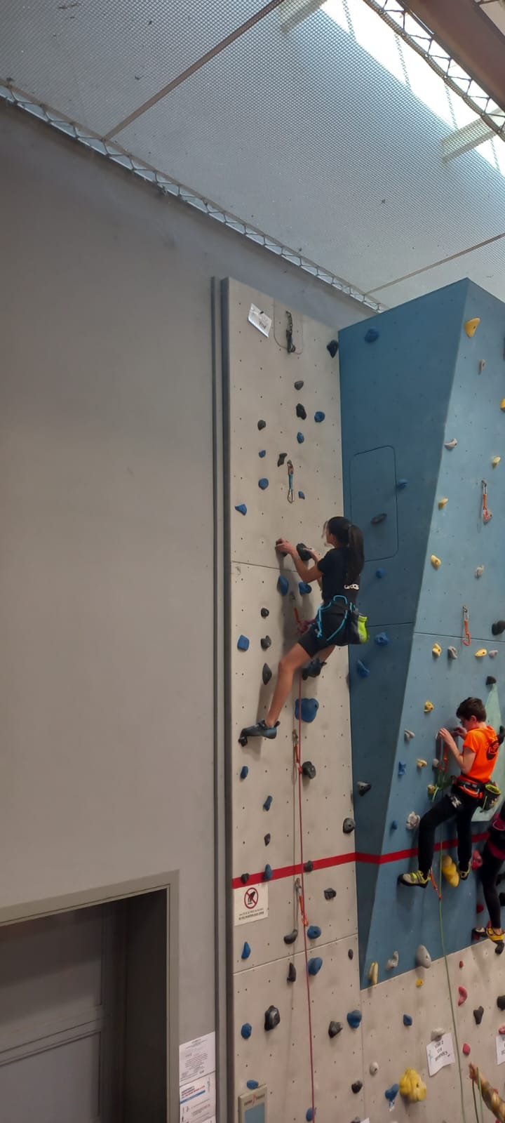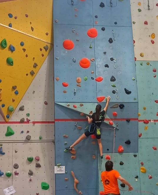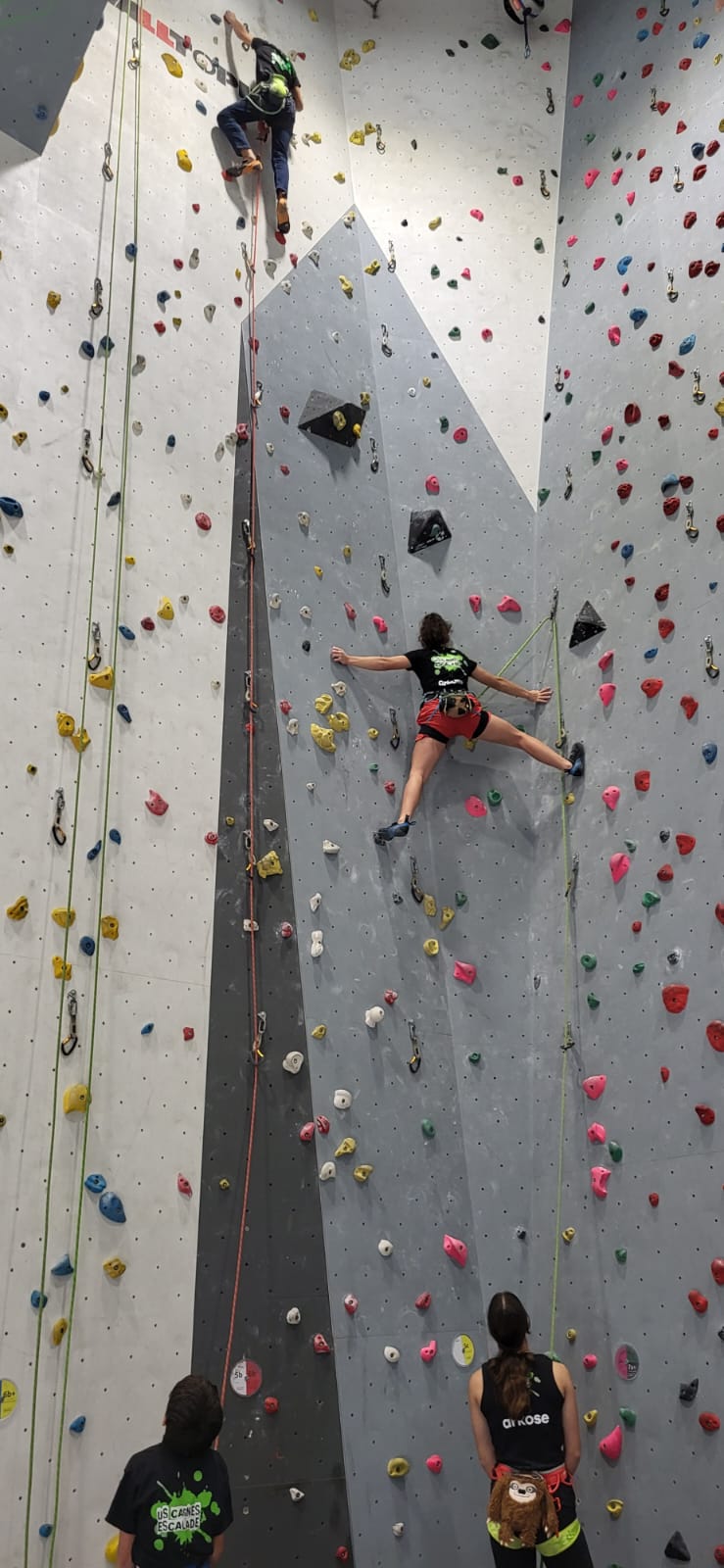 Déjà l’heure de la pause où se partagent les cakes et autres gâteaux, un peu de café et les jeunes sont déjà repartis. J’envoie Romane dans le long 5+ « symphonie de destruction » pour une belle ascension soldée malheureusement par un échec à quelques mètres de la fin. 30m de concentration et à gérer l’engagement, c’est déjà une belle performance ! Adèle la suivra en moulinette tandis que Boris s’essaie dans un 6c encore un peu trop dur pour lui avant de finir en tête dans une voie plus facile pour travailler la manip. Les autres ne sont pas en reste et « Zed et Gnougnou » a beaucoup de succès également, avec son pas d’allonge et son réta pas évident à négocier que Louise essaiera plusieurs fois. Jeanne et Paul se la jouent « tranquille » en moulinette dans toutes les voies installées tandis que Milo s’essaie aux voies un peu dures.
