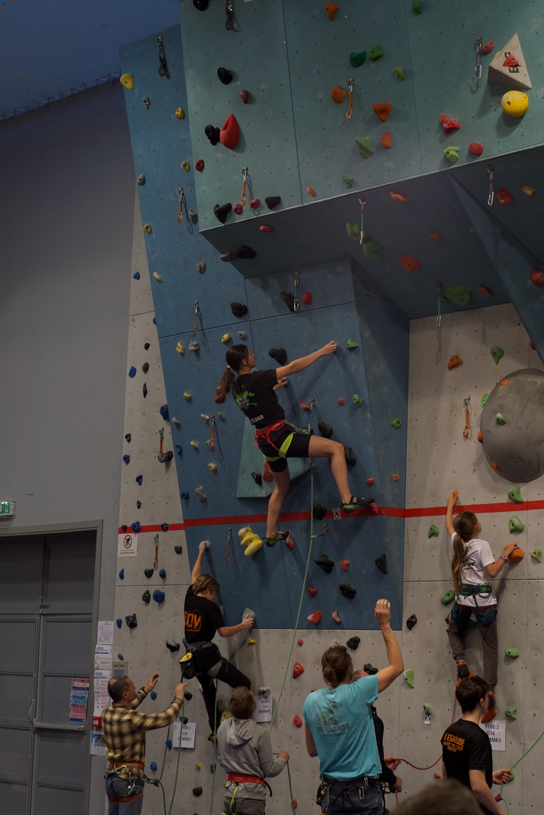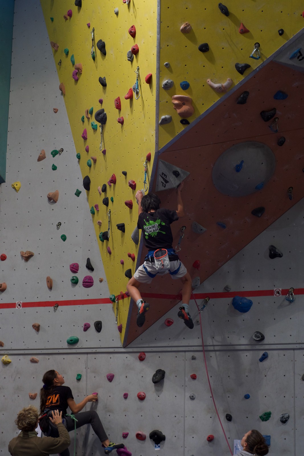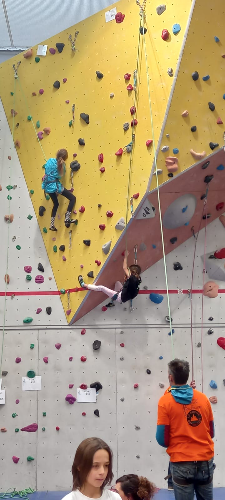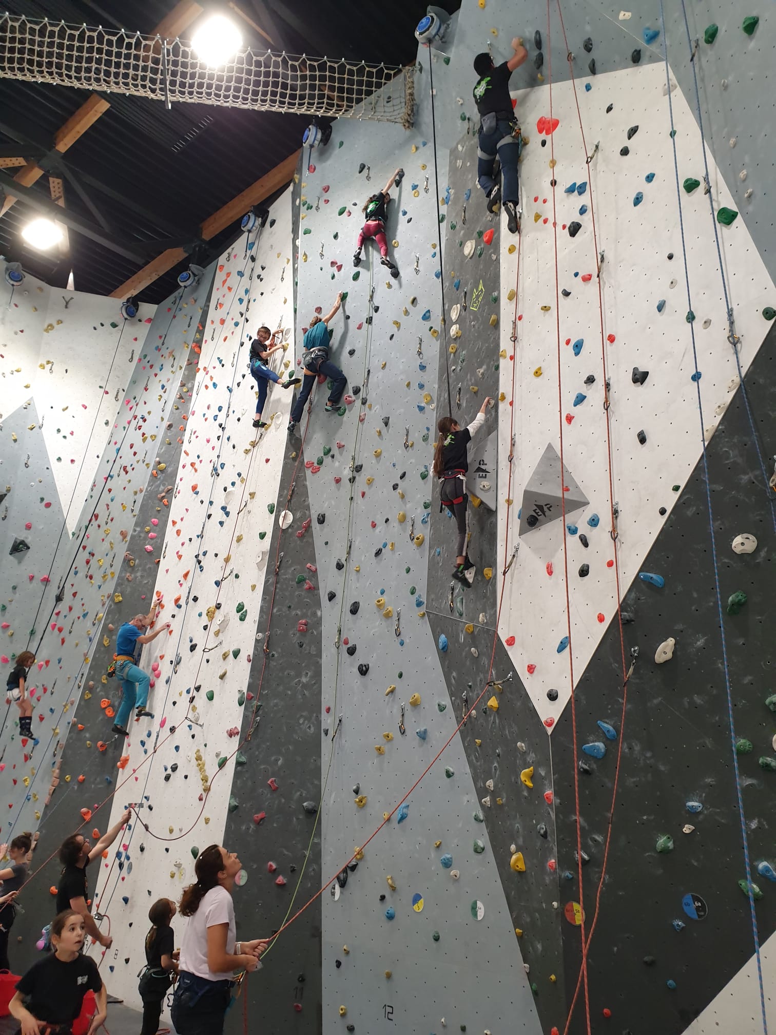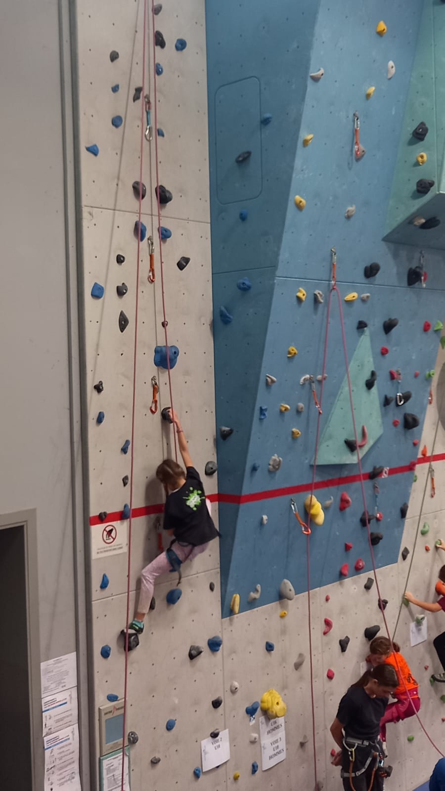 Déjà l’heure de la pause où se partagent les cakes et autres gâteaux, un peu de café et les jeunes sont déjà repartis. J’envoie Romane dans le long 5+ « symphonie de destruction » pour une belle ascension soldée malheureusement par un échec à quelques mètres de la fin. 30m de concentration et à gérer l’engagement, c’est déjà une belle performance ! Adèle la suivra en moulinette tandis que Boris s’essaie dans un 6c encore un peu trop dur pour lui avant de finir en tête dans une voie plus facile pour travailler la manip. Les autres ne sont pas en reste et « Zed et Gnougnou » a beaucoup de succès également, avec son pas d’allonge et son réta pas évident à négocier que Louise essaiera plusieurs fois. Jeanne et Paul se la jouent « tranquille » en moulinette dans toutes les voies installées tandis que Milo s’essaie aux voies un peu dures.