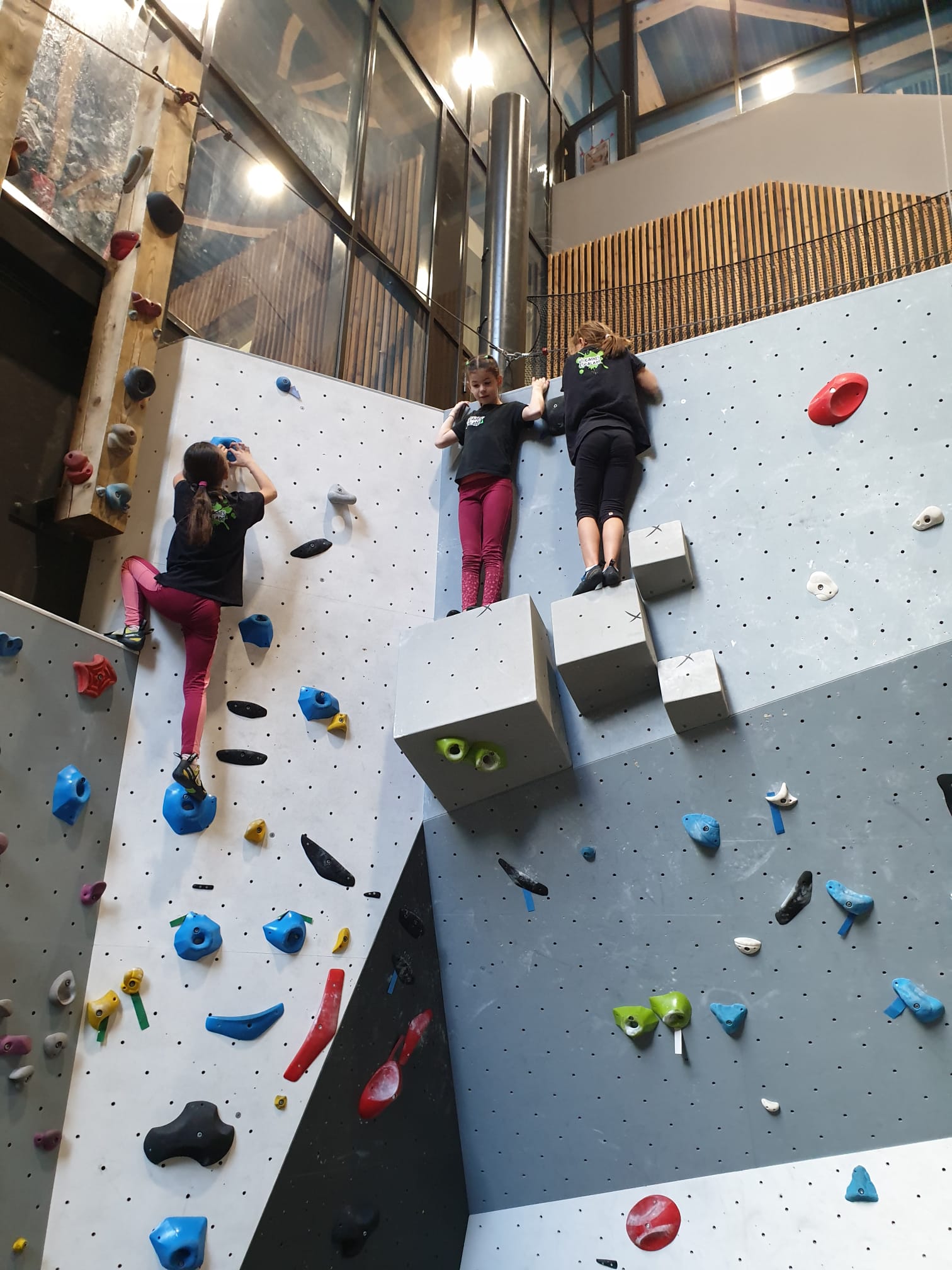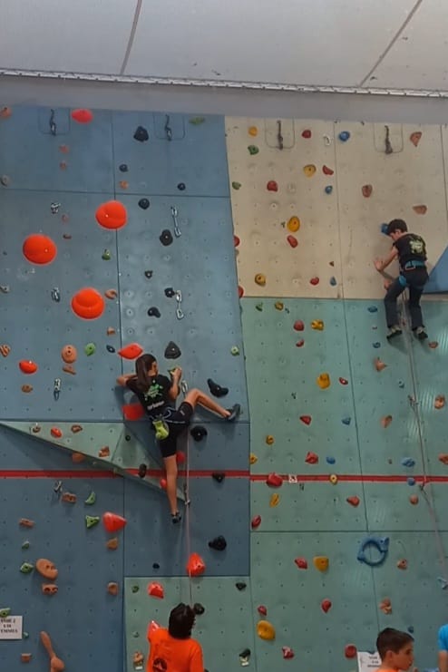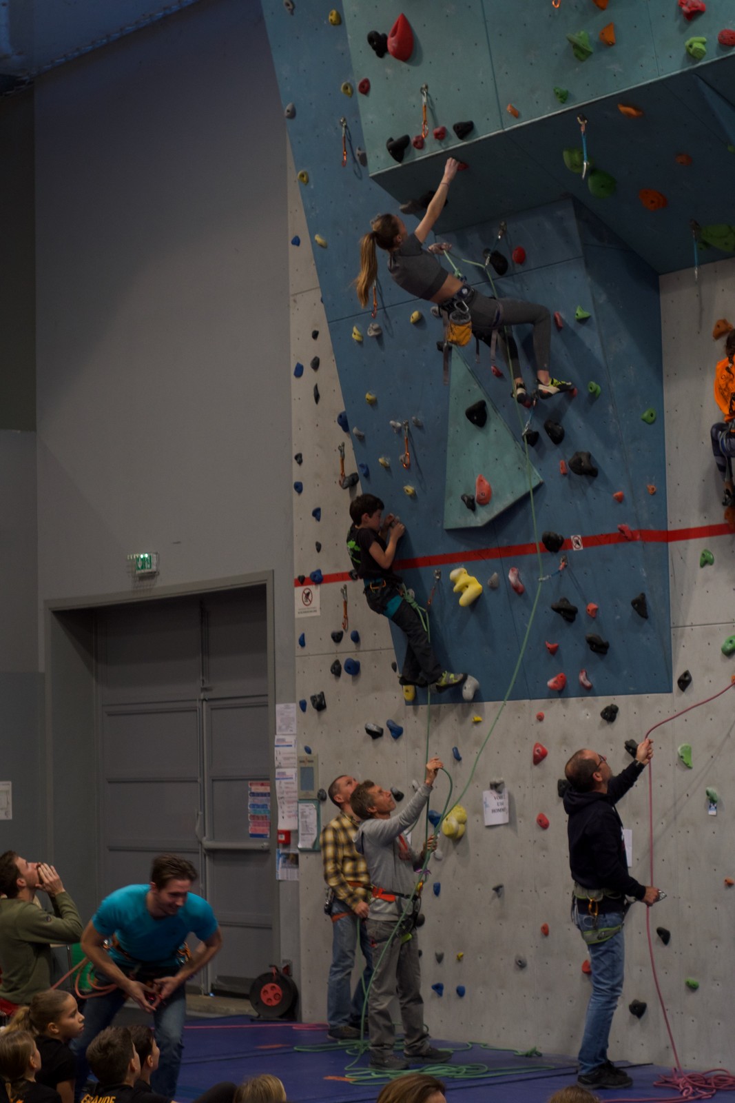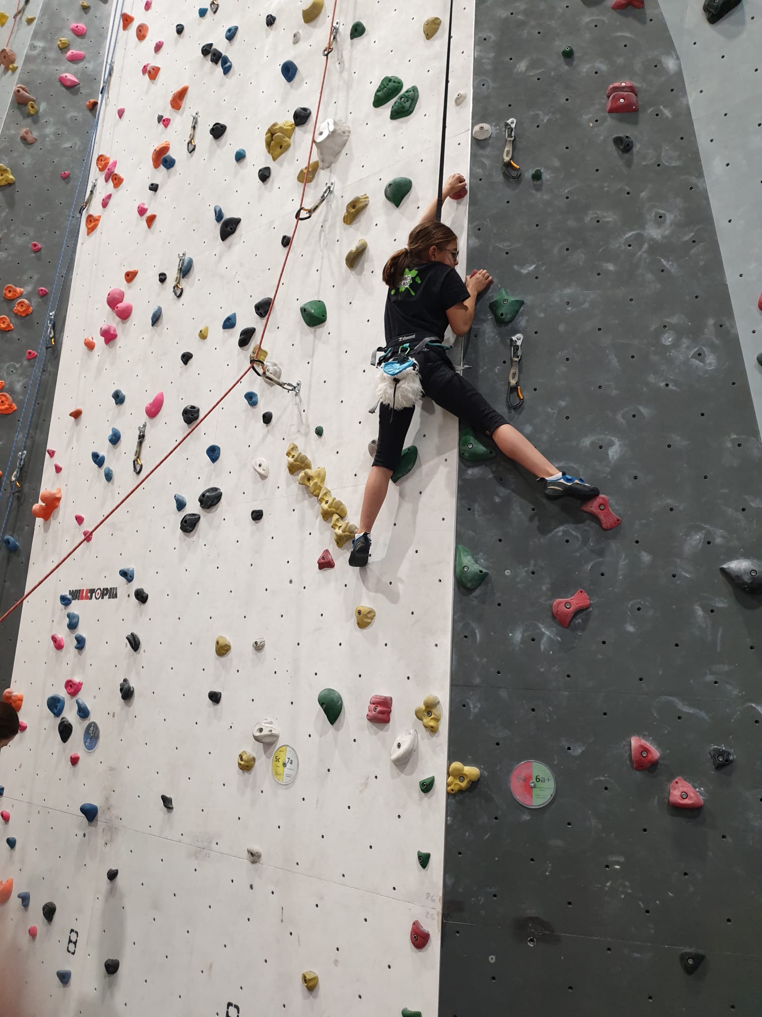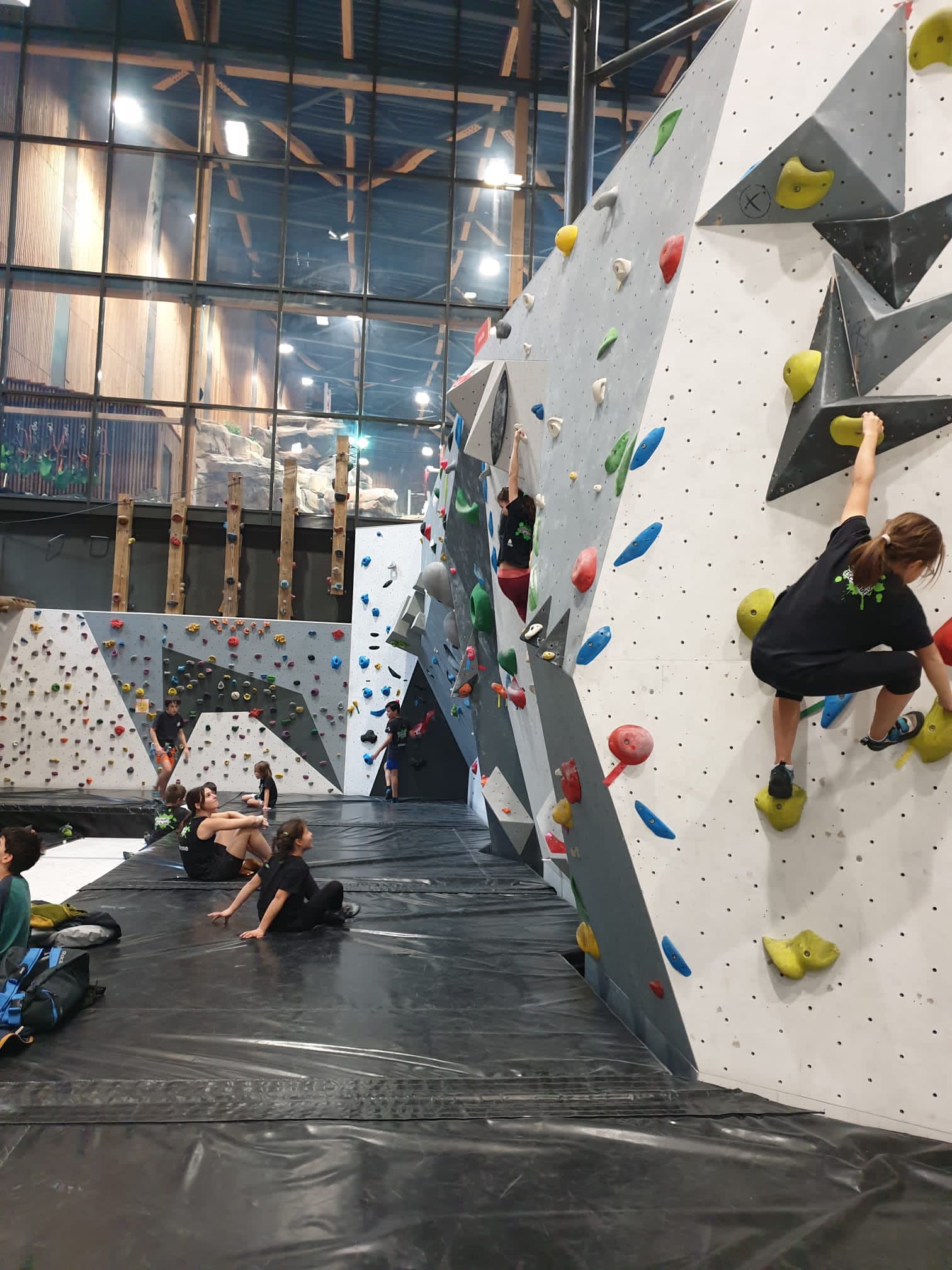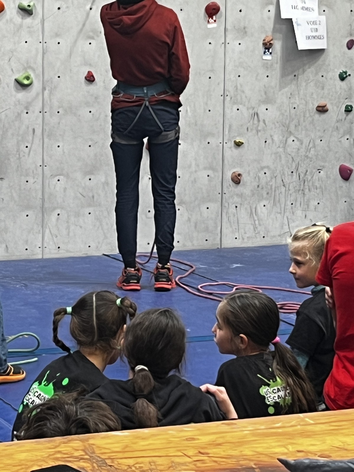 Déjà l’heure de la pause où se partagent les cakes et autres gâteaux, un peu de café et les jeunes sont déjà repartis. J’envoie Romane dans le long 5+ « symphonie de destruction » pour une belle ascension soldée malheureusement par un échec à quelques mètres de la fin. 30m de concentration et à gérer l’engagement, c’est déjà une belle performance ! Adèle la suivra en moulinette tandis que Boris s’essaie dans un 6c encore un peu trop dur pour lui avant de finir en tête dans une voie plus facile pour travailler la manip. Les autres ne sont pas en reste et « Zed et Gnougnou » a beaucoup de succès également, avec son pas d’allonge et son réta pas évident à négocier que Louise essaiera plusieurs fois. Jeanne et Paul se la jouent « tranquille » en moulinette dans toutes les voies installées tandis que Milo s’essaie aux voies un peu dures.