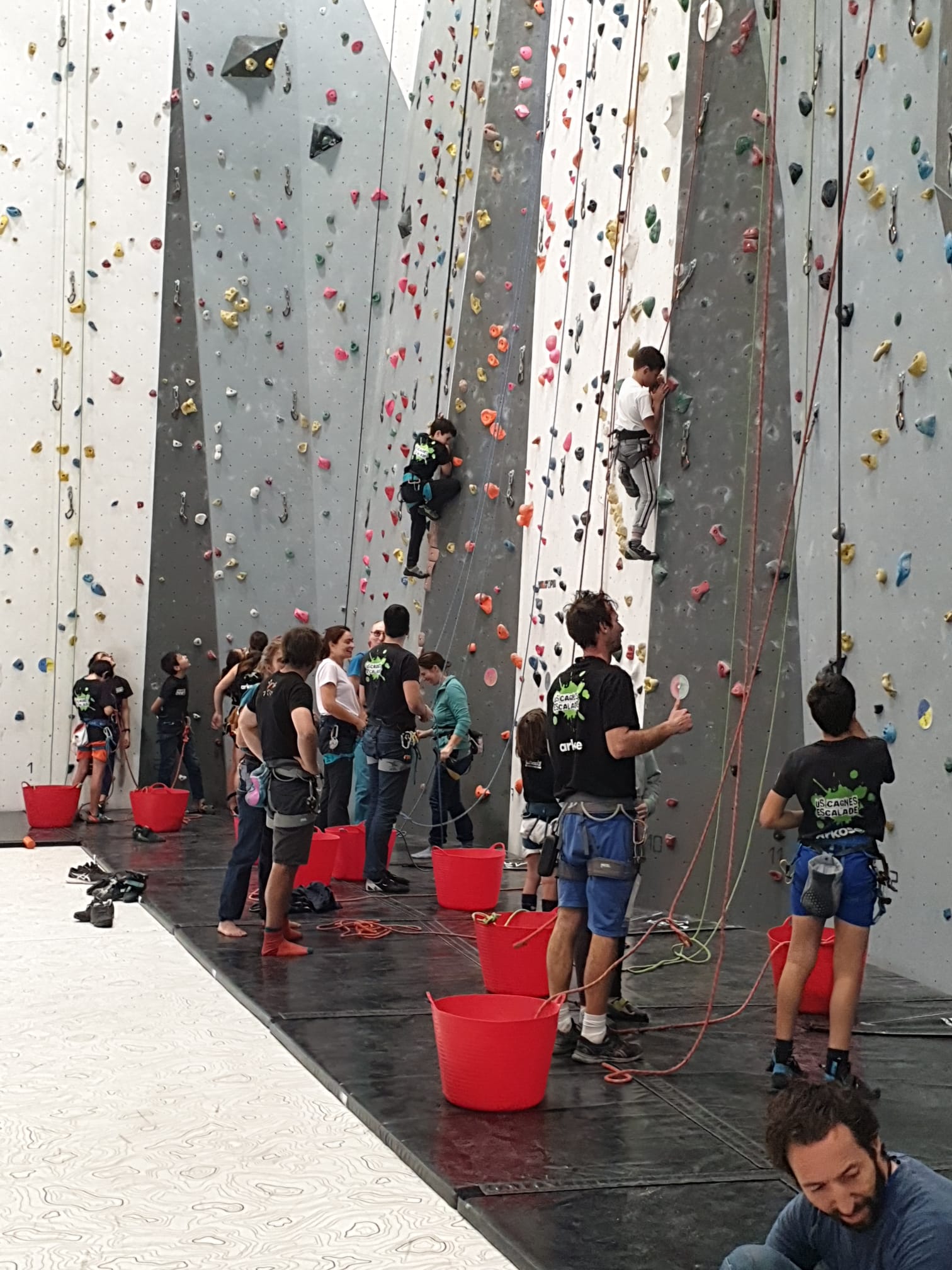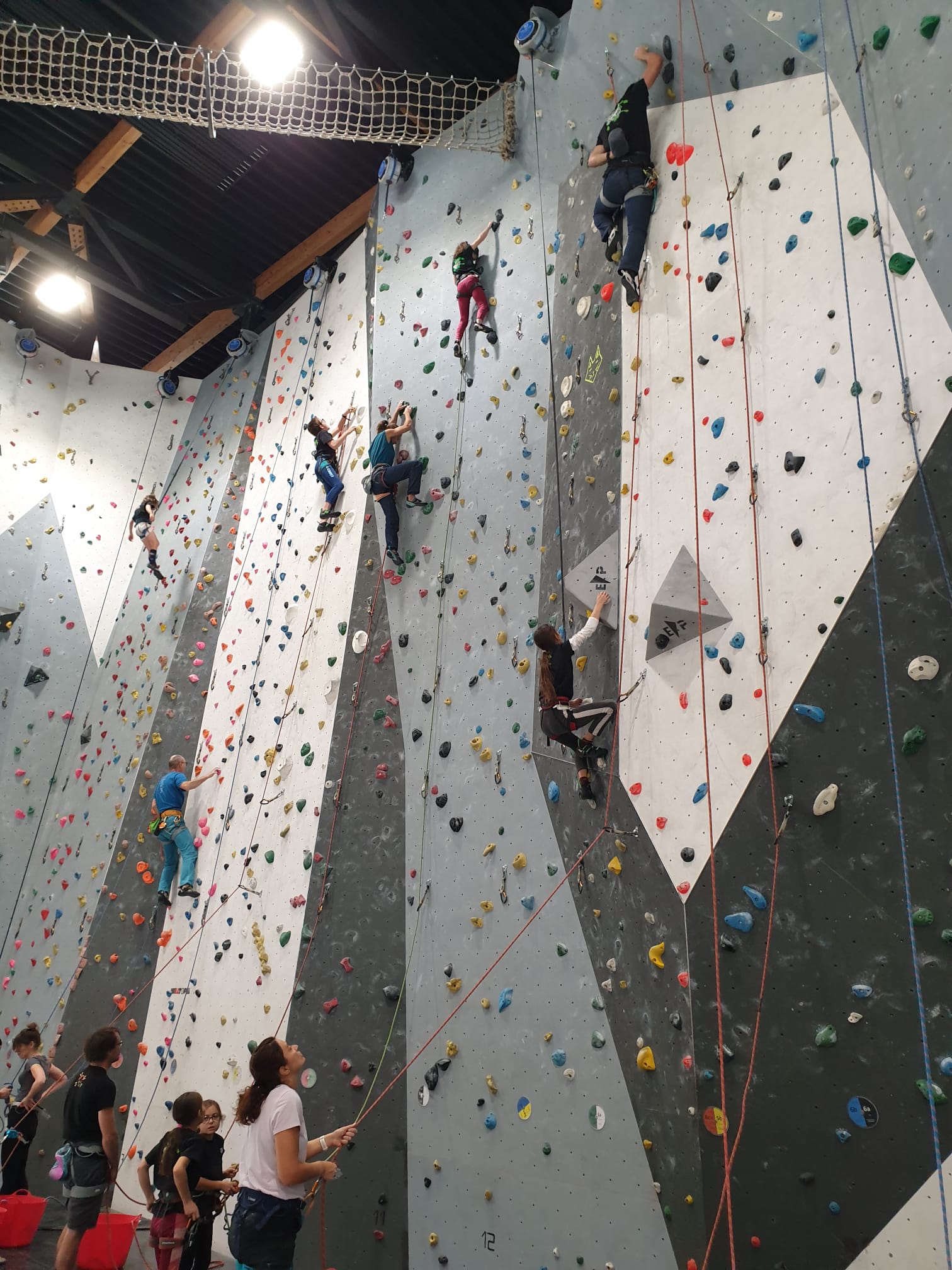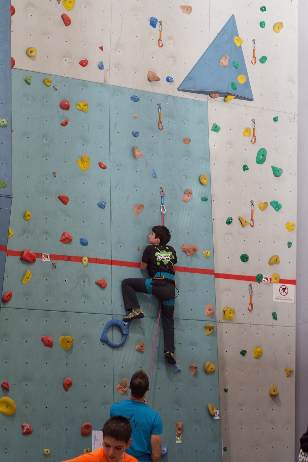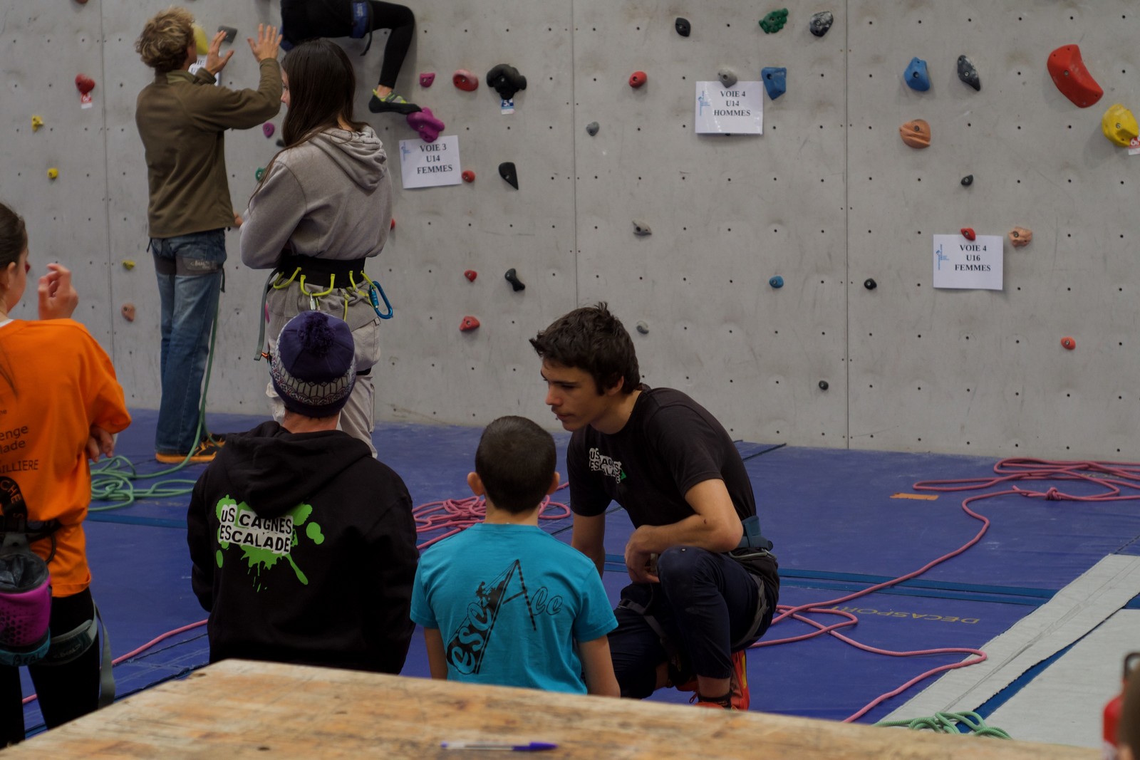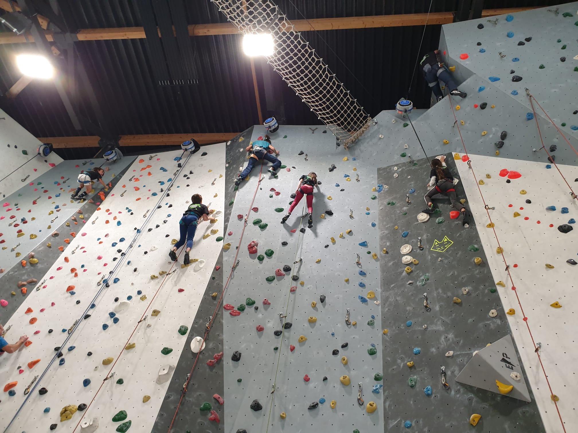 Déjà l’heure de la pause où se partagent les cakes et autres gâteaux, un peu de café et les jeunes sont déjà repartis. J’envoie Romane dans le long 5+ « symphonie de destruction » pour une belle ascension soldée malheureusement par un échec à quelques mètres de la fin. 30m de concentration et à gérer l’engagement, c’est déjà une belle performance ! Adèle la suivra en moulinette tandis que Boris s’essaie dans un 6c encore un peu trop dur pour lui avant de finir en tête dans une voie plus facile pour travailler la manip. Les autres ne sont pas en reste et « Zed et Gnougnou » a beaucoup de succès également, avec son pas d’allonge et son réta pas évident à négocier que Louise essaiera plusieurs fois. Jeanne et Paul se la jouent « tranquille » en moulinette dans toutes les voies installées tandis que Milo s’essaie aux voies un peu dures.