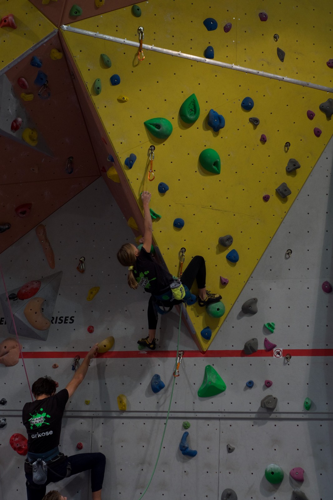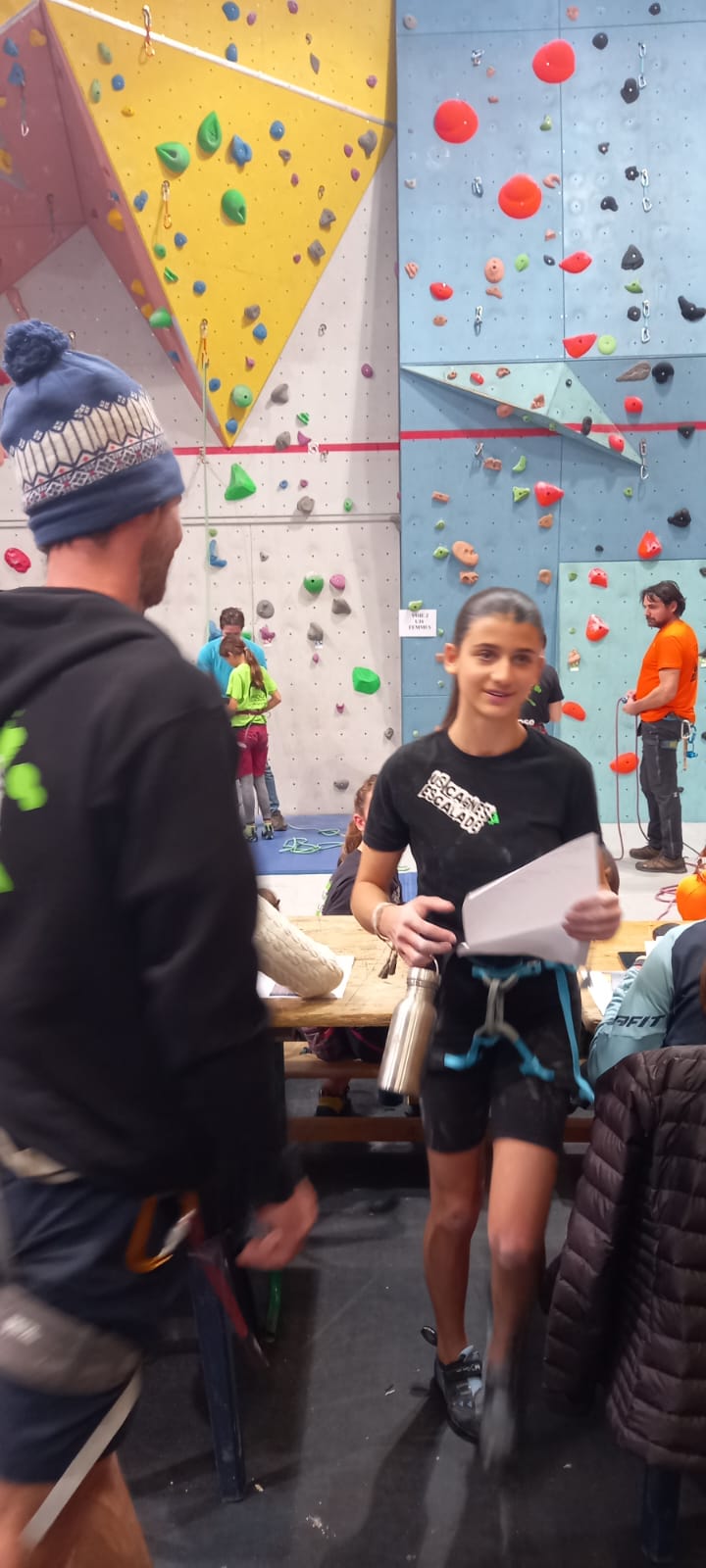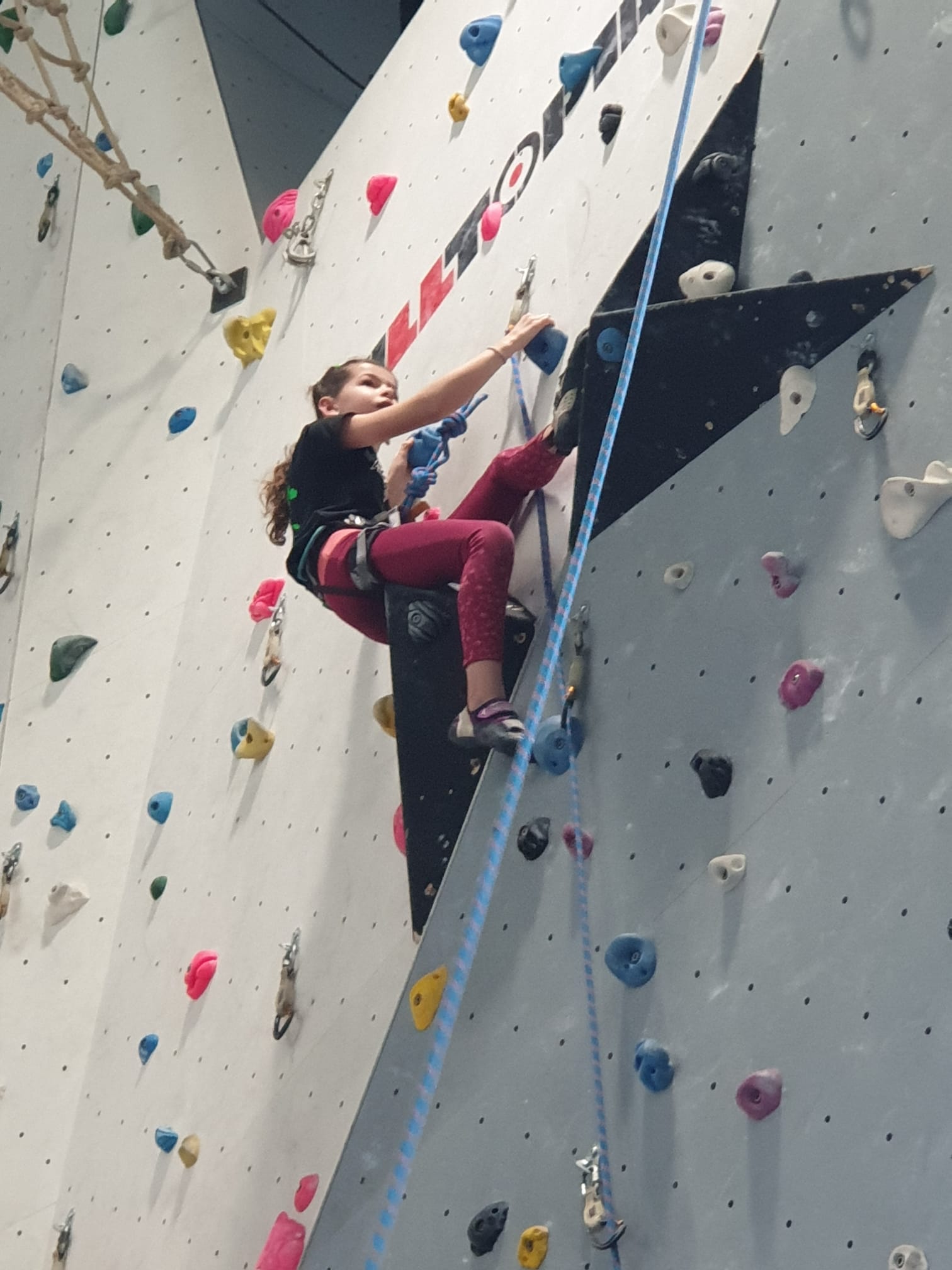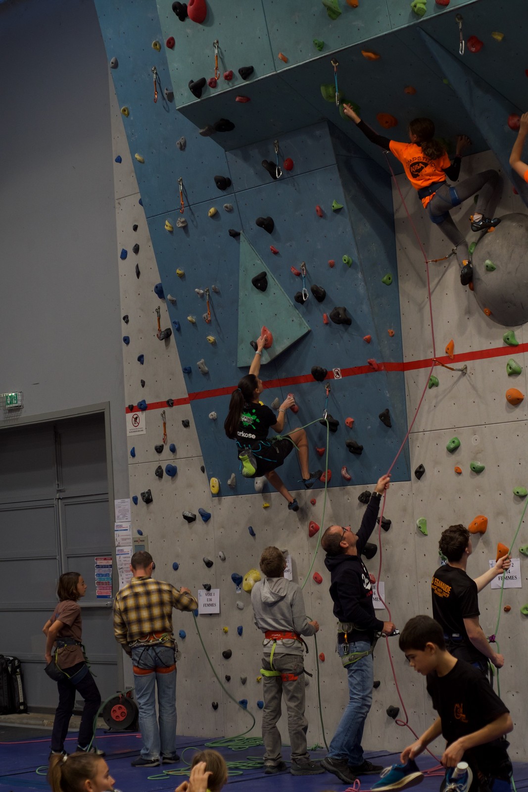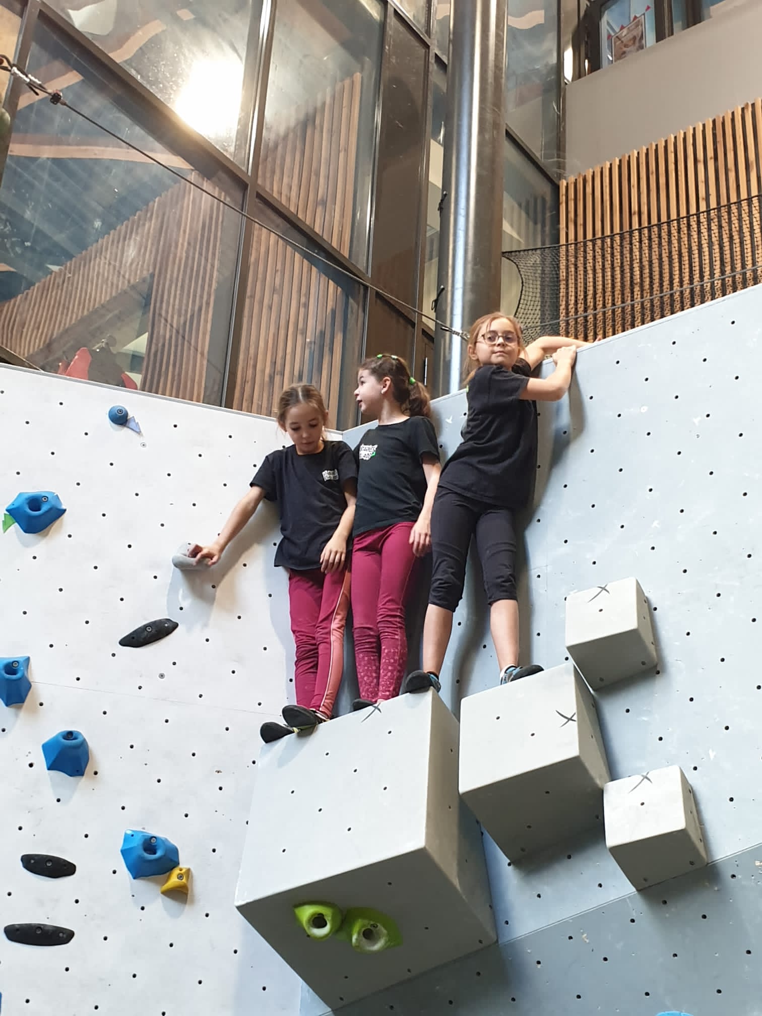 Déjà l’heure de la pause où se partagent les cakes et autres gâteaux, un peu de café et les jeunes sont déjà repartis. J’envoie Romane dans le long 5+ « symphonie de destruction » pour une belle ascension soldée malheureusement par un échec à quelques mètres de la fin. 30m de concentration et à gérer l’engagement, c’est déjà une belle performance ! Adèle la suivra en moulinette tandis que Boris s’essaie dans un 6c encore un peu trop dur pour lui avant de finir en tête dans une voie plus facile pour travailler la manip. Les autres ne sont pas en reste et « Zed et Gnougnou » a beaucoup de succès également, avec son pas d’allonge et son réta pas évident à négocier que Louise essaiera plusieurs fois. Jeanne et Paul se la jouent « tranquille » en moulinette dans toutes les voies installées tandis que Milo s’essaie aux voies un peu dures.
