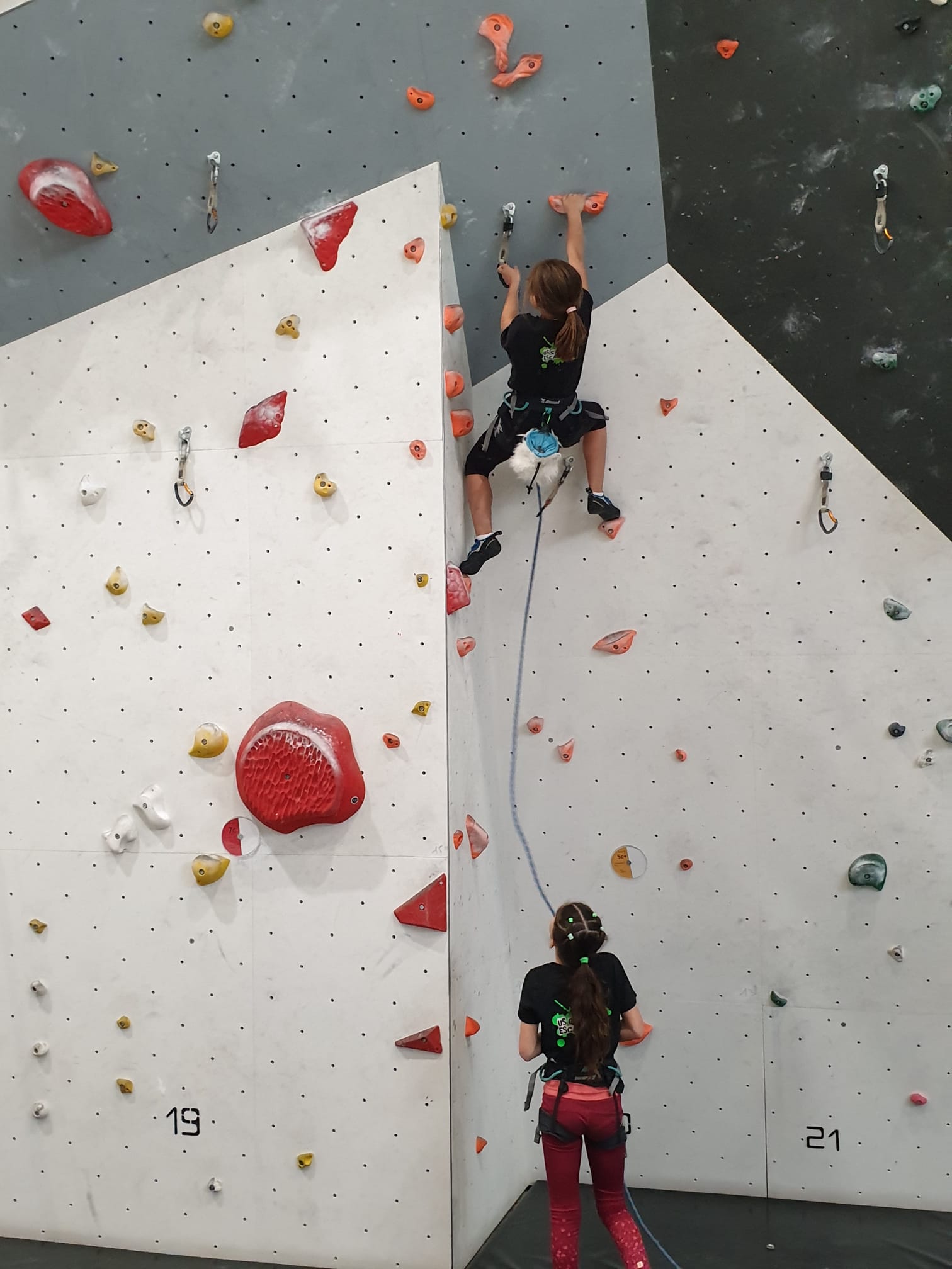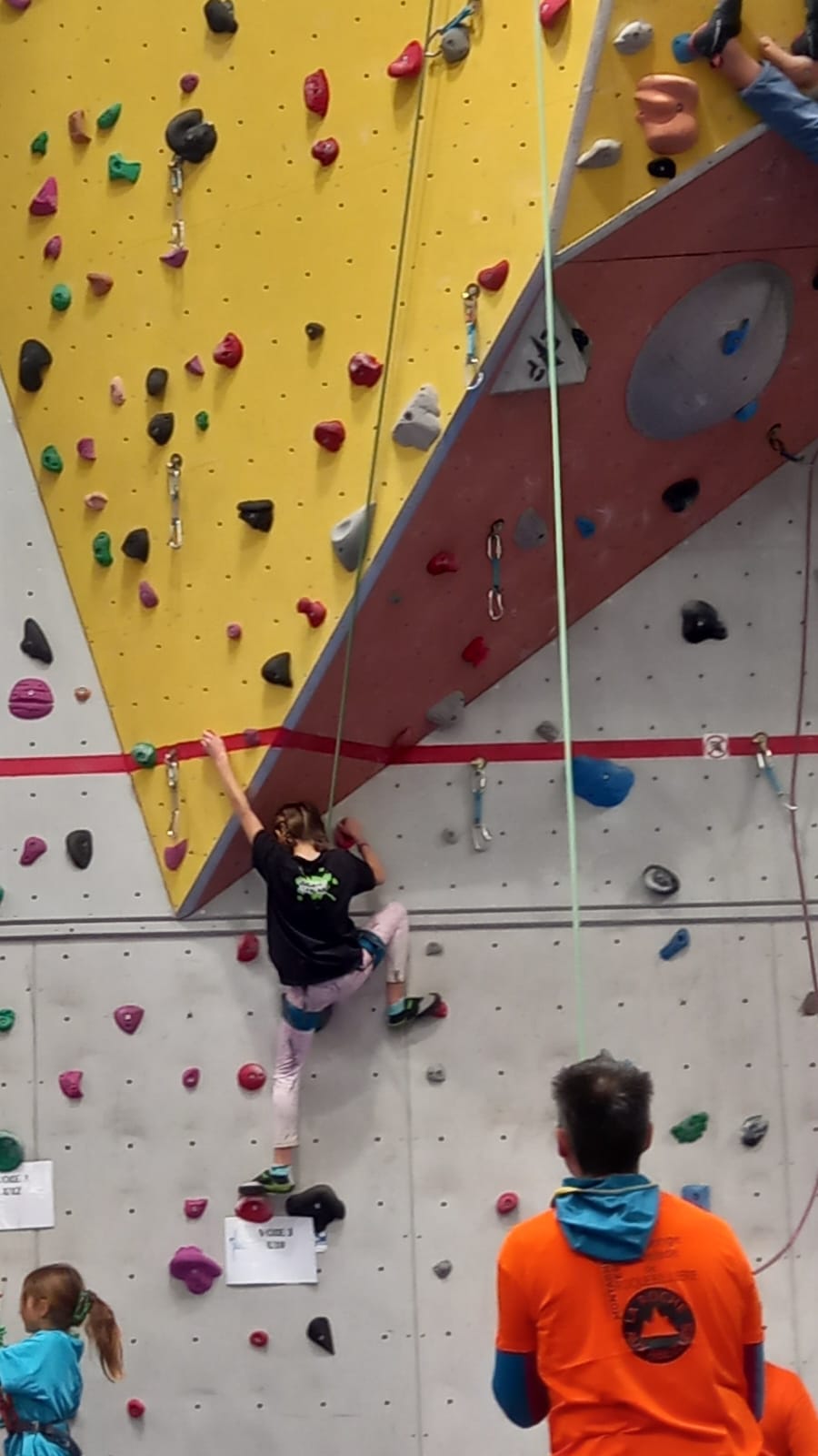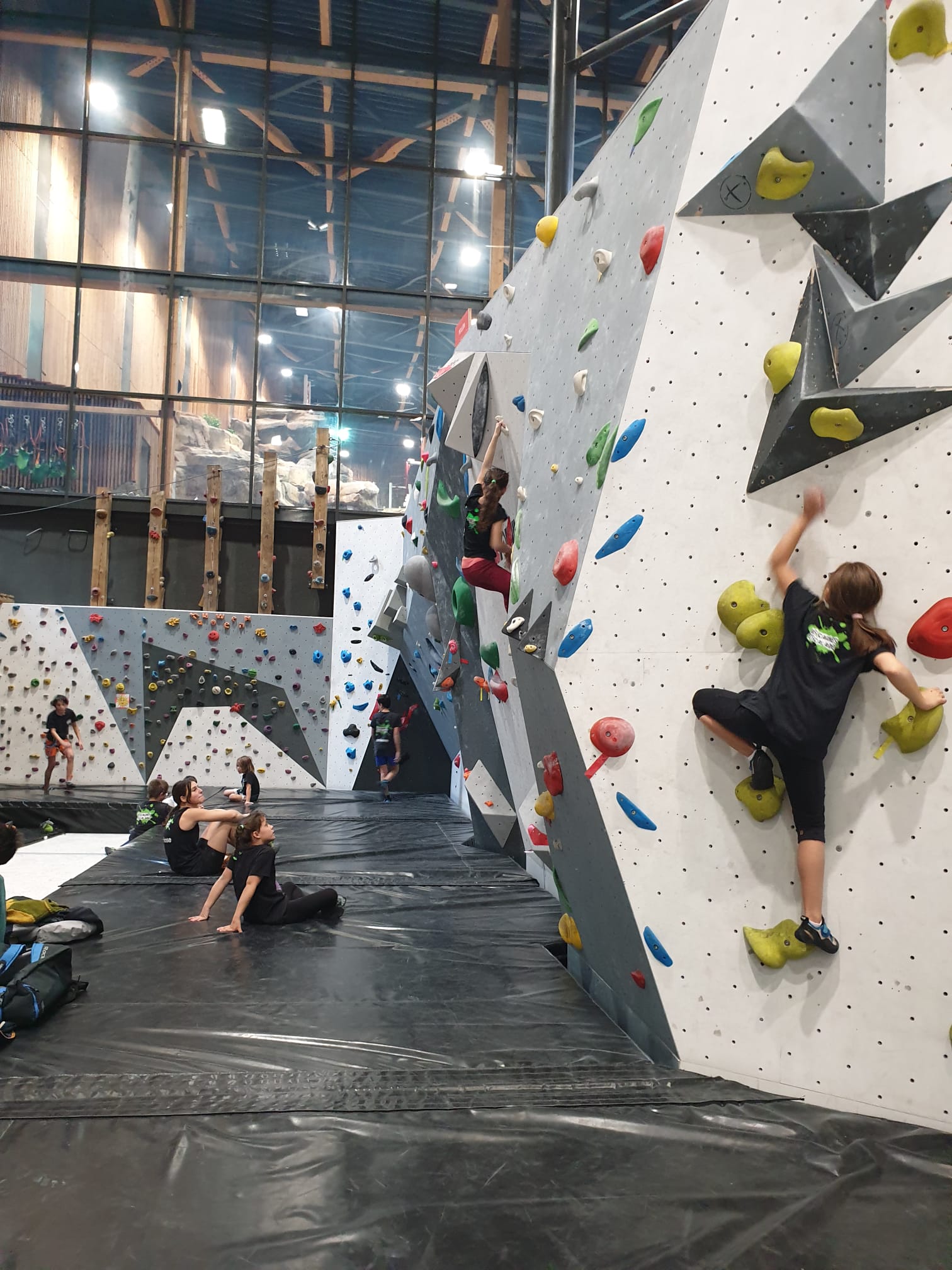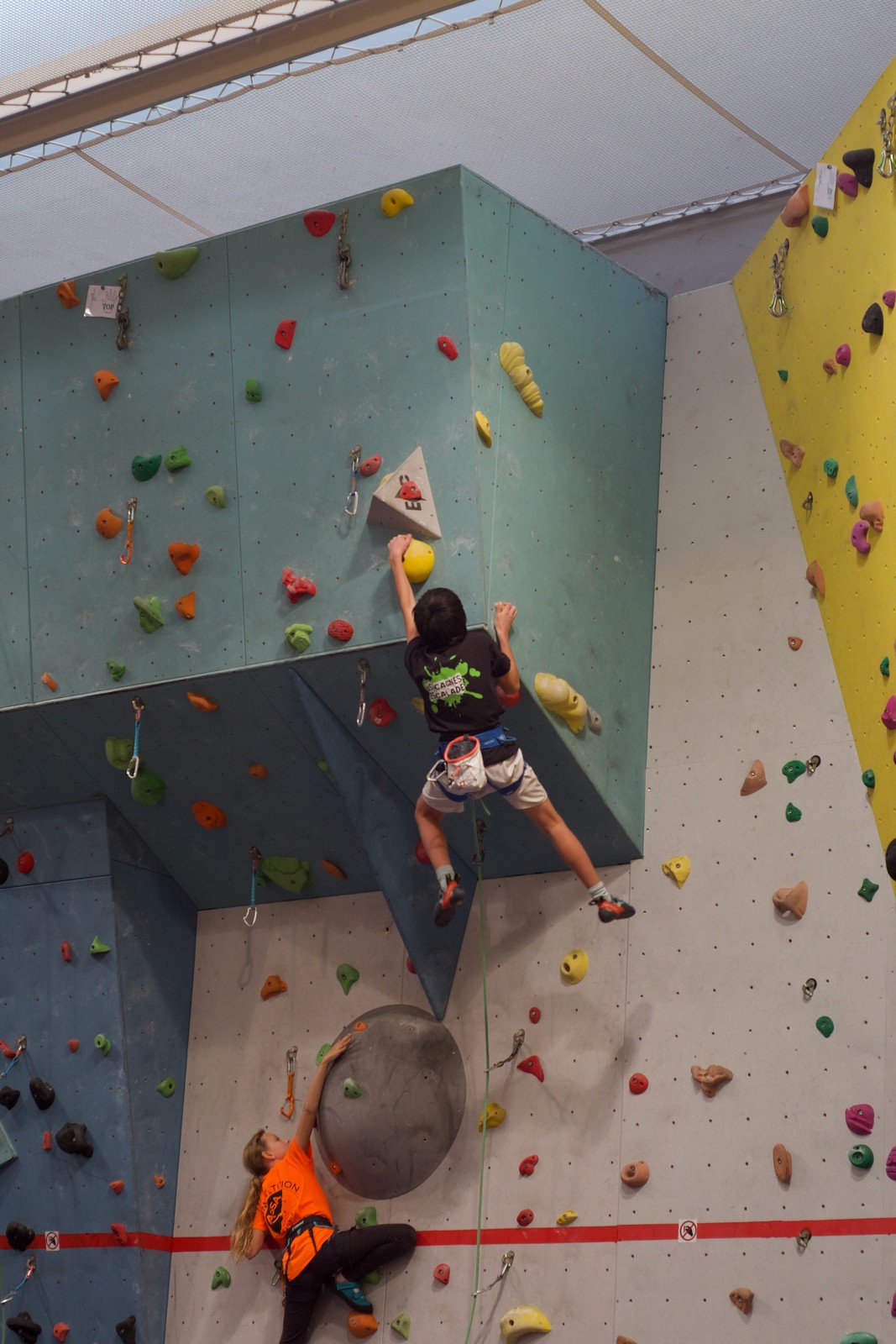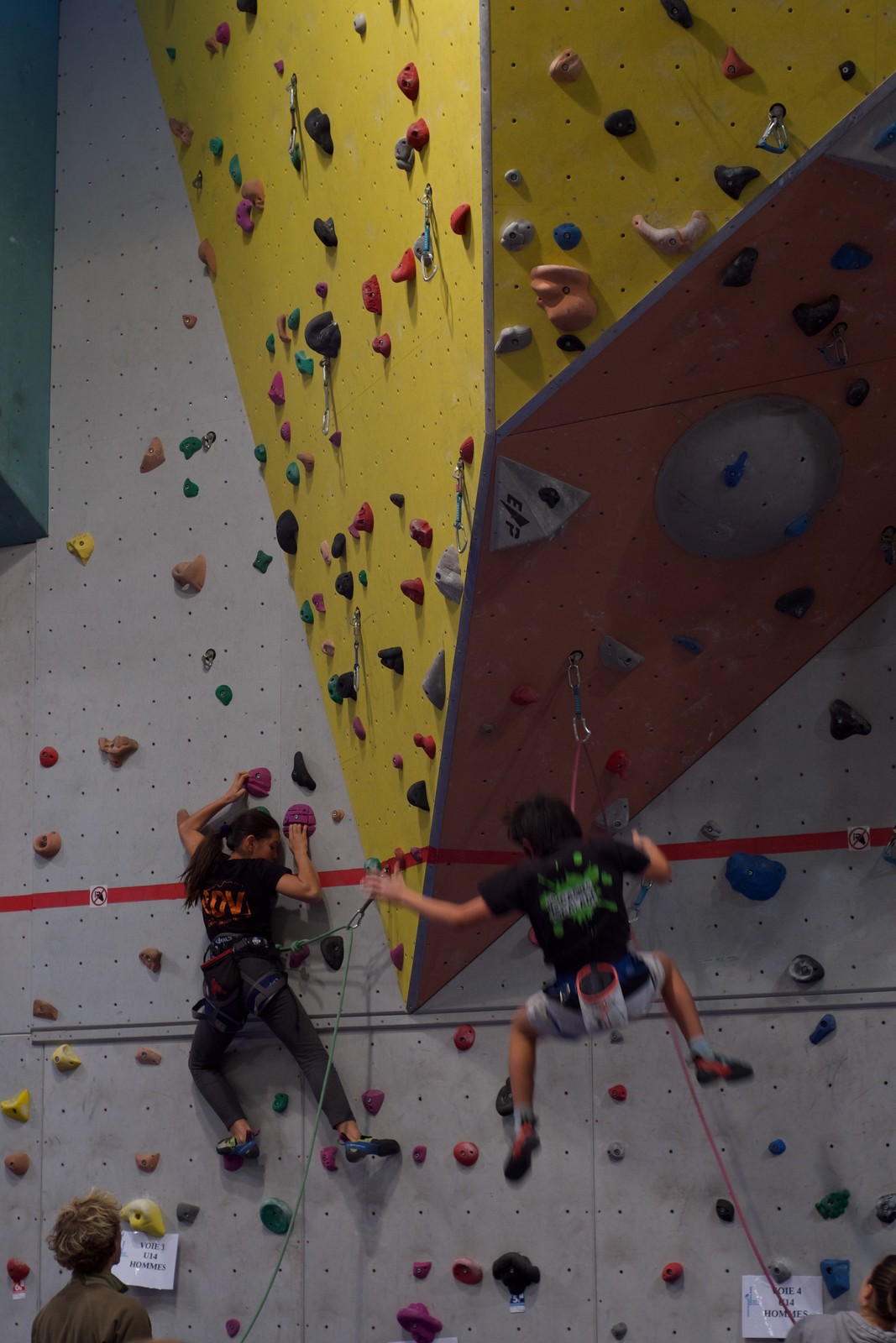 Déjà l’heure de la pause où se partagent les cakes et autres gâteaux, un peu de café et les jeunes sont déjà repartis. J’envoie Romane dans le long 5+ « symphonie de destruction » pour une belle ascension soldée malheureusement par un échec à quelques mètres de la fin. 30m de concentration et à gérer l’engagement, c’est déjà une belle performance ! Adèle la suivra en moulinette tandis que Boris s’essaie dans un 6c encore un peu trop dur pour lui avant de finir en tête dans une voie plus facile pour travailler la manip. Les autres ne sont pas en reste et « Zed et Gnougnou » a beaucoup de succès également, avec son pas d’allonge et son réta pas évident à négocier que Louise essaiera plusieurs fois. Jeanne et Paul se la jouent « tranquille » en moulinette dans toutes les voies installées tandis que Milo s’essaie aux voies un peu dures.