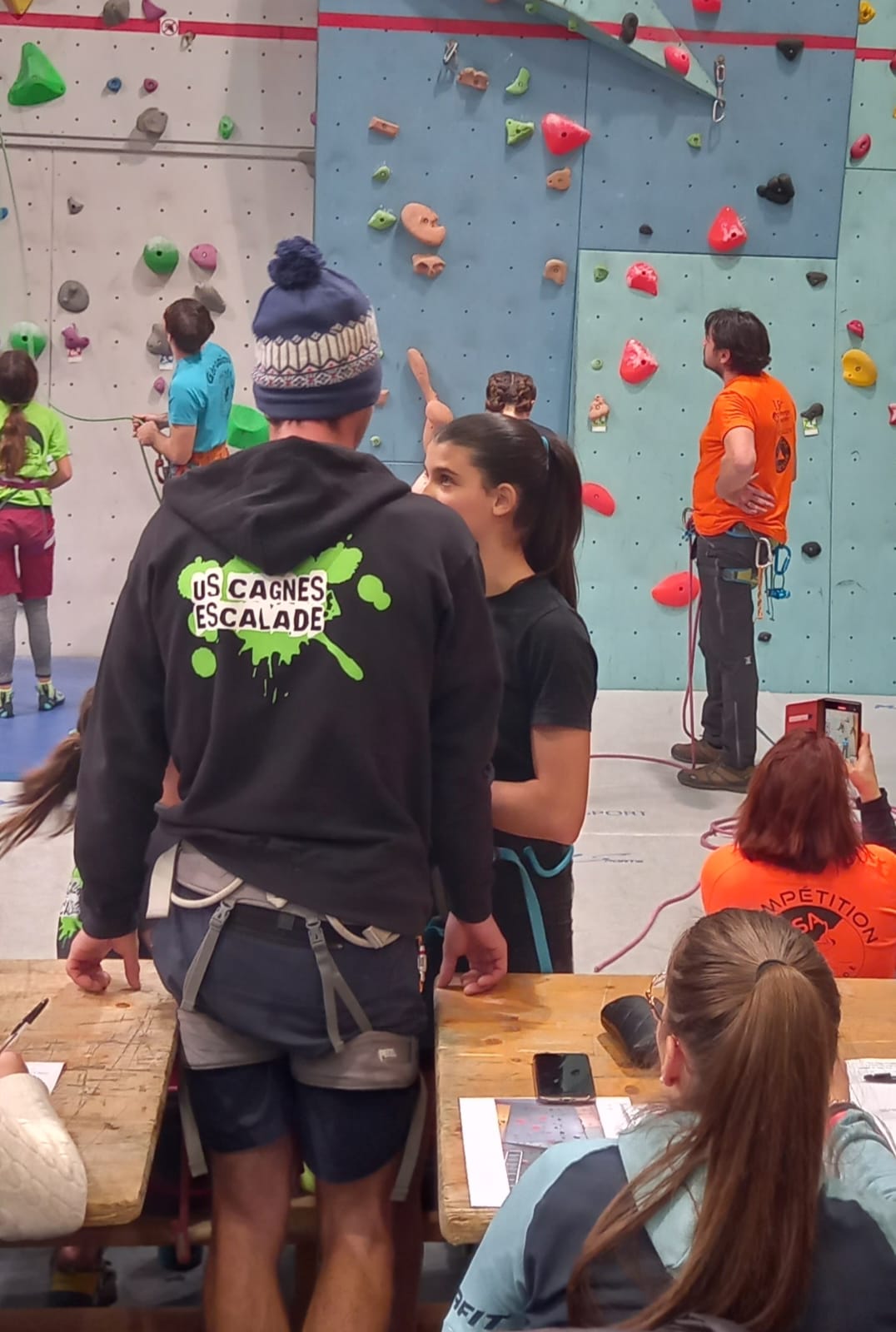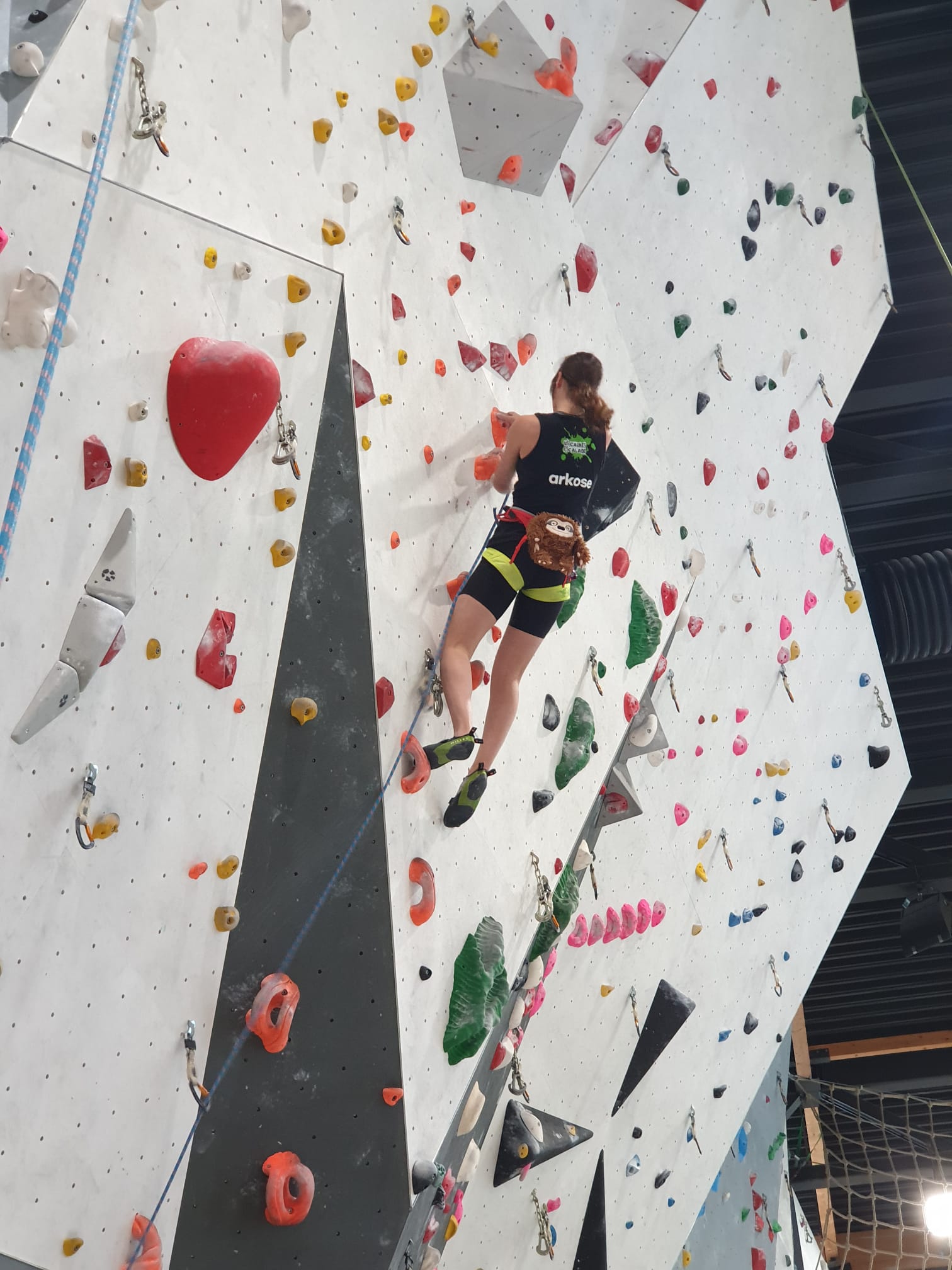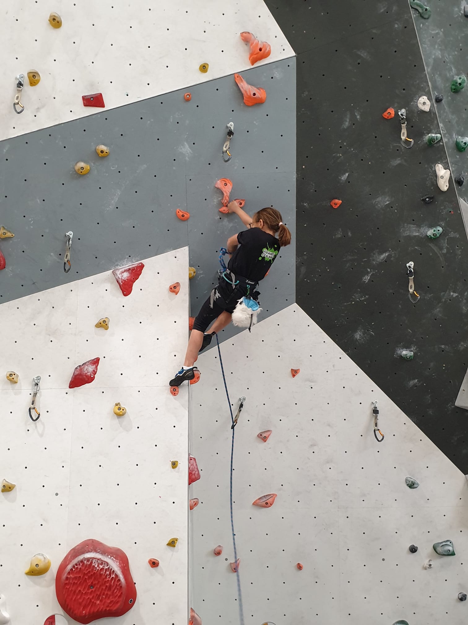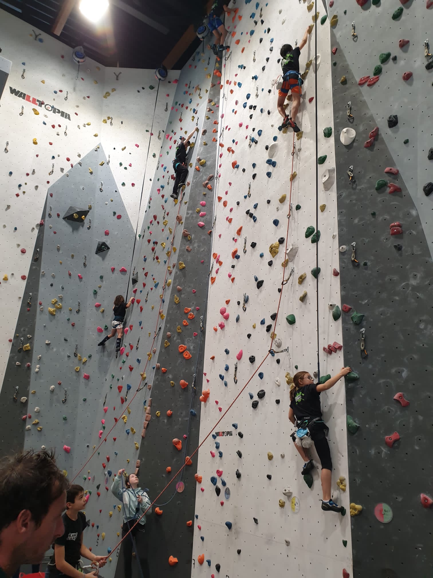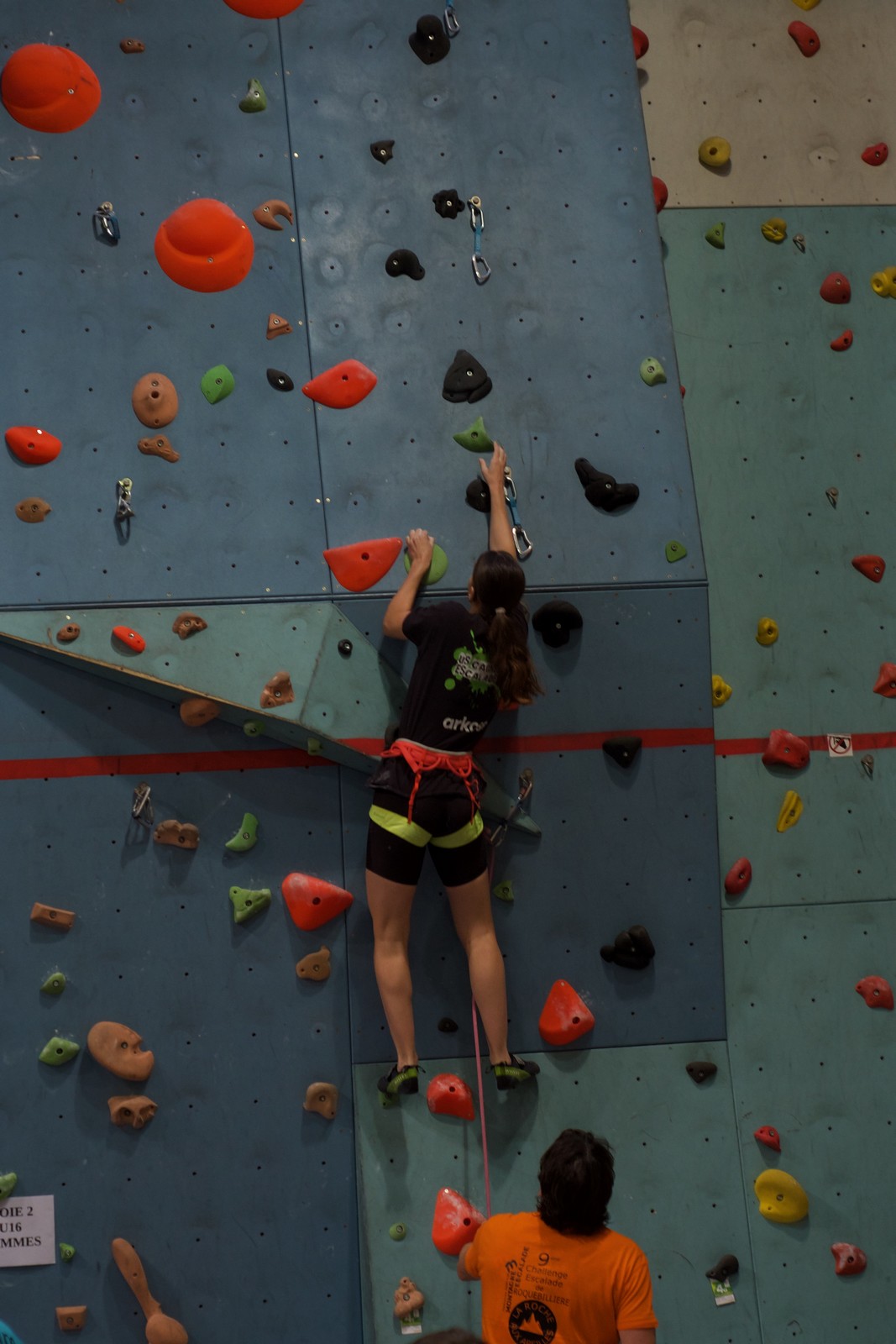 Déjà l’heure de la pause où se partagent les cakes et autres gâteaux, un peu de café et les jeunes sont déjà repartis. J’envoie Romane dans le long 5+ « symphonie de destruction » pour une belle ascension soldée malheureusement par un échec à quelques mètres de la fin. 30m de concentration et à gérer l’engagement, c’est déjà une belle performance ! Adèle la suivra en moulinette tandis que Boris s’essaie dans un 6c encore un peu trop dur pour lui avant de finir en tête dans une voie plus facile pour travailler la manip. Les autres ne sont pas en reste et « Zed et Gnougnou » a beaucoup de succès également, avec son pas d’allonge et son réta pas évident à négocier que Louise essaiera plusieurs fois. Jeanne et Paul se la jouent « tranquille » en moulinette dans toutes les voies installées tandis que Milo s’essaie aux voies un peu dures.