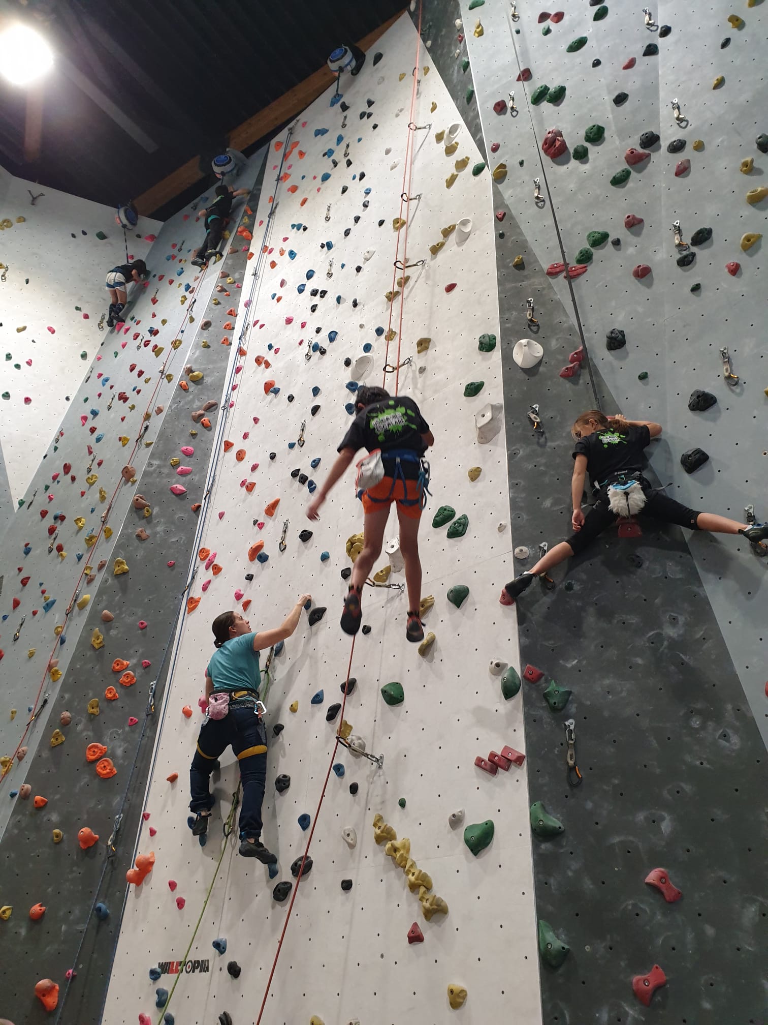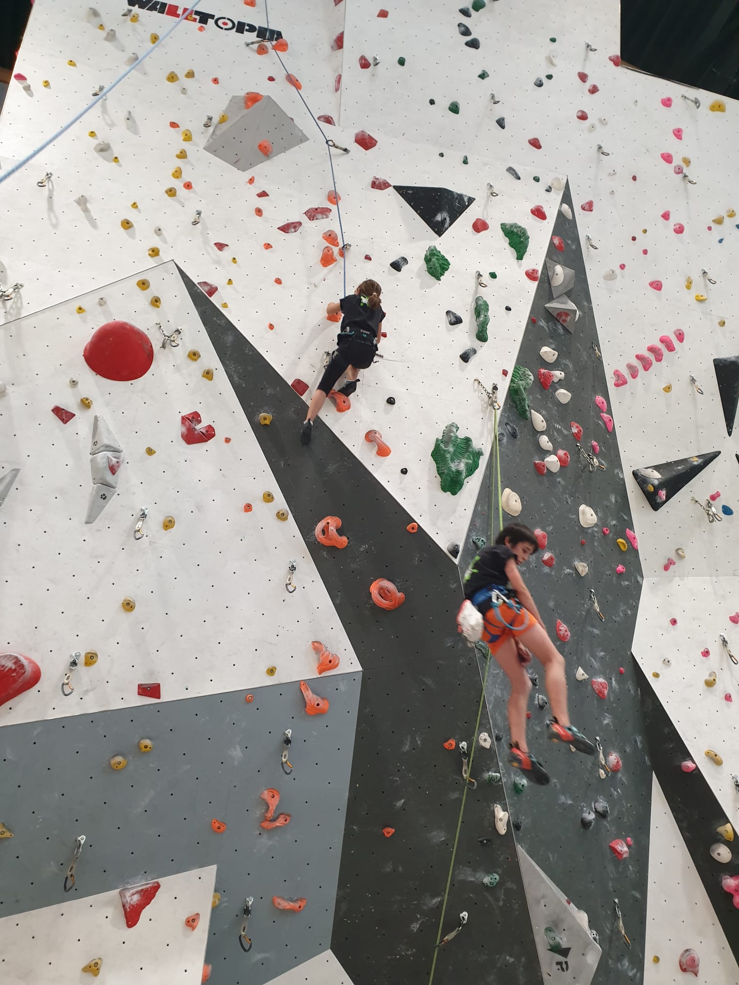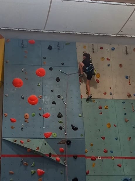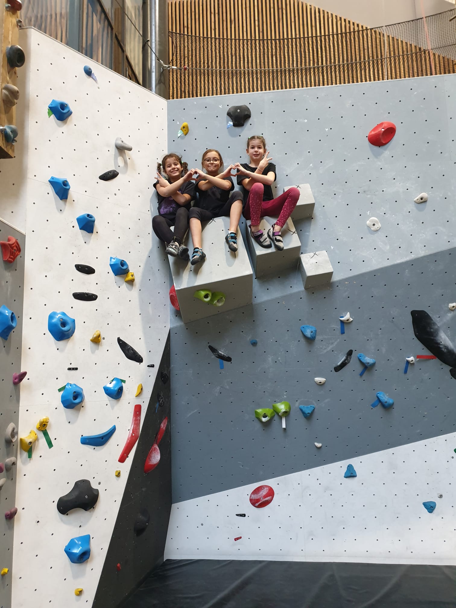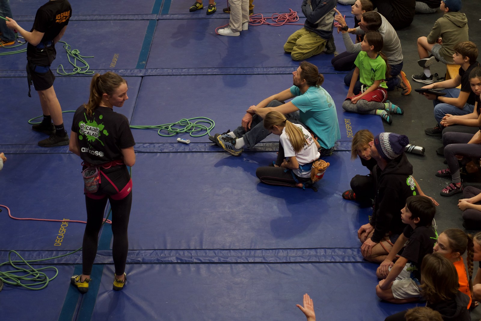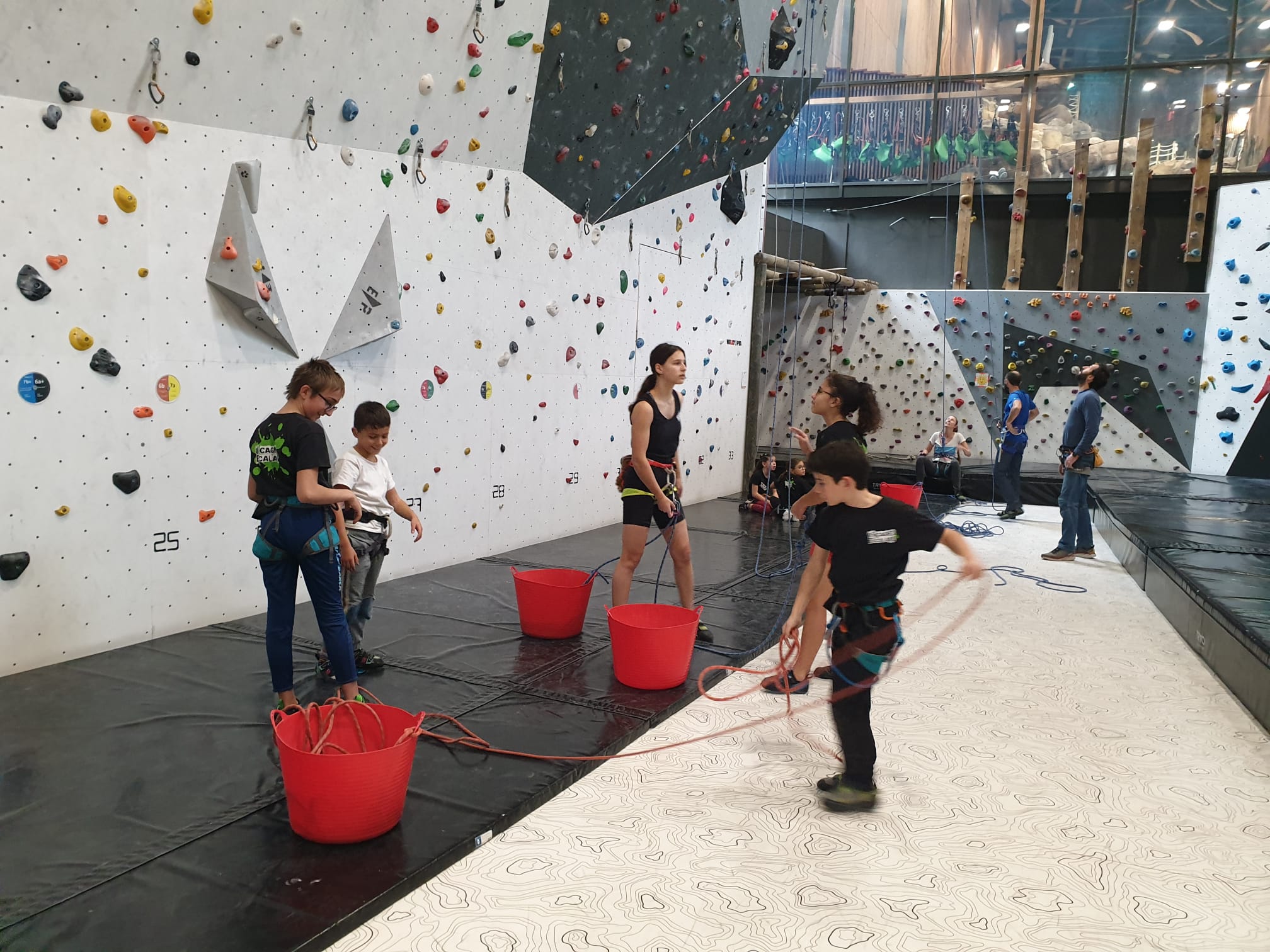 Déjà l’heure de la pause où se partagent les cakes et autres gâteaux, un peu de café et les jeunes sont déjà repartis. J’envoie Romane dans le long 5+ « symphonie de destruction » pour une belle ascension soldée malheureusement par un échec à quelques mètres de la fin. 30m de concentration et à gérer l’engagement, c’est déjà une belle performance ! Adèle la suivra en moulinette tandis que Boris s’essaie dans un 6c encore un peu trop dur pour lui avant de finir en tête dans une voie plus facile pour travailler la manip. Les autres ne sont pas en reste et « Zed et Gnougnou » a beaucoup de succès également, avec son pas d’allonge et son réta pas évident à négocier que Louise essaiera plusieurs fois. Jeanne et Paul se la jouent « tranquille » en moulinette dans toutes les voies installées tandis que Milo s’essaie aux voies un peu dures.