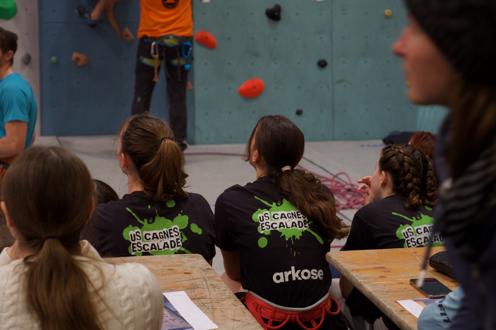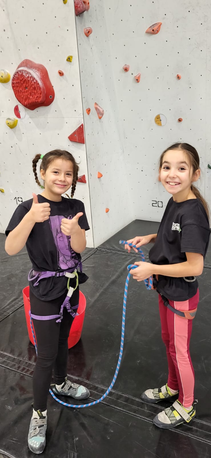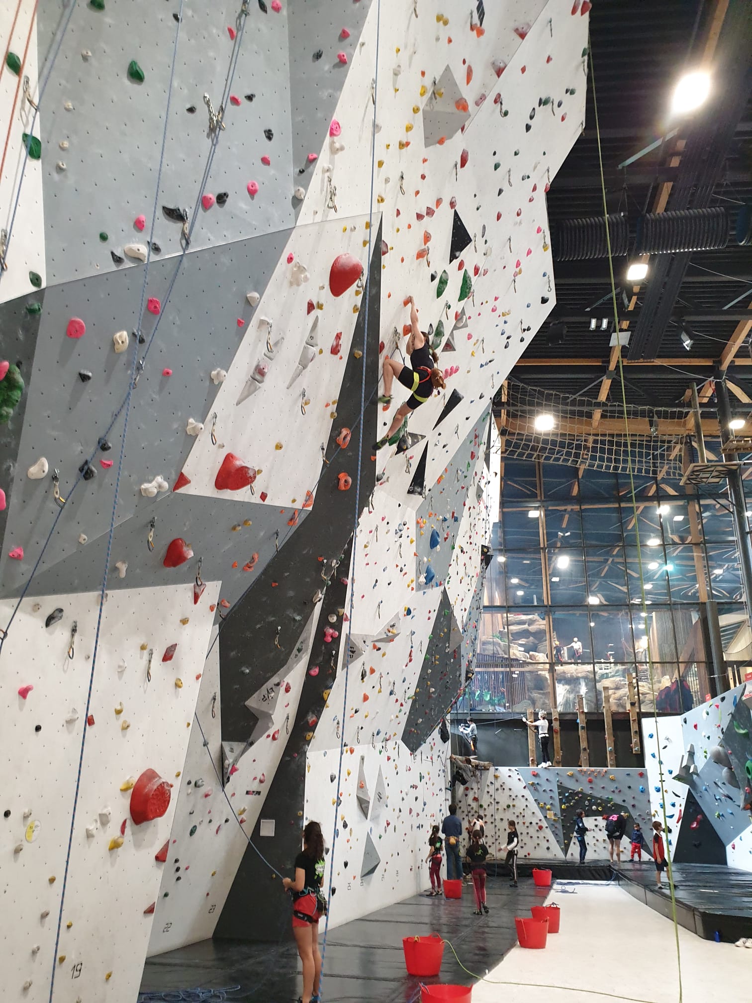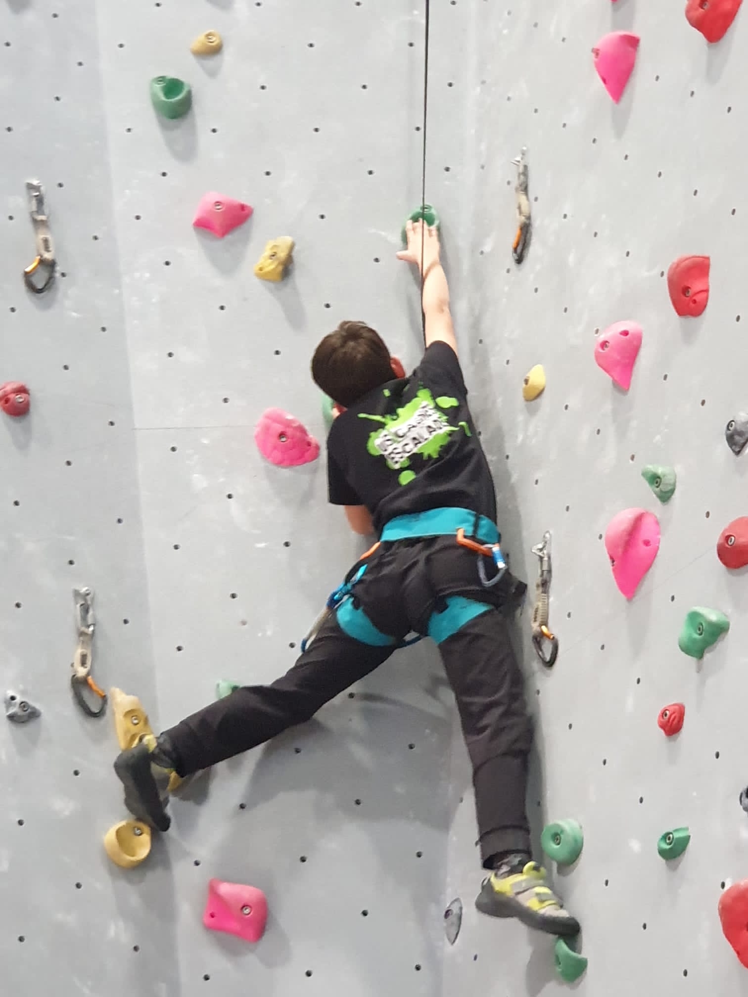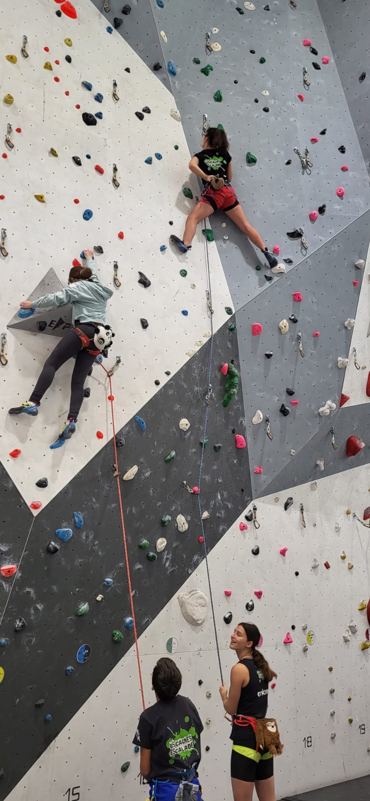 Déjà l’heure de la pause où se partagent les cakes et autres gâteaux, un peu de café et les jeunes sont déjà repartis. J’envoie Romane dans le long 5+ « symphonie de destruction » pour une belle ascension soldée malheureusement par un échec à quelques mètres de la fin. 30m de concentration et à gérer l’engagement, c’est déjà une belle performance ! Adèle la suivra en moulinette tandis que Boris s’essaie dans un 6c encore un peu trop dur pour lui avant de finir en tête dans une voie plus facile pour travailler la manip. Les autres ne sont pas en reste et « Zed et Gnougnou » a beaucoup de succès également, avec son pas d’allonge et son réta pas évident à négocier que Louise essaiera plusieurs fois. Jeanne et Paul se la jouent « tranquille » en moulinette dans toutes les voies installées tandis que Milo s’essaie aux voies un peu dures.