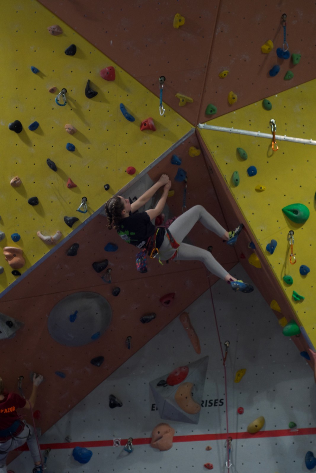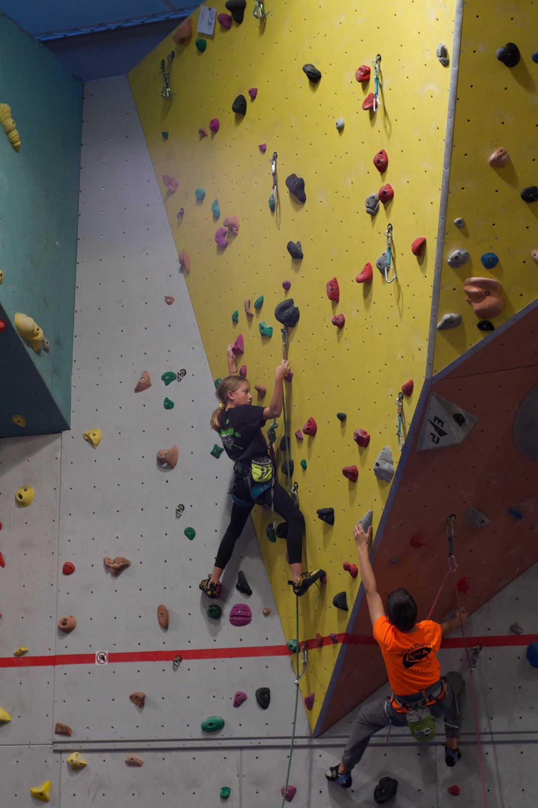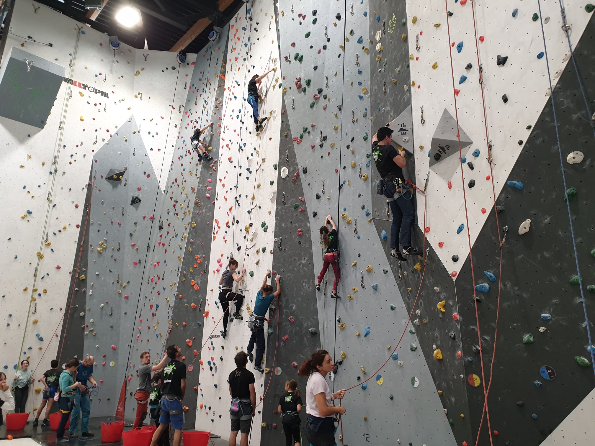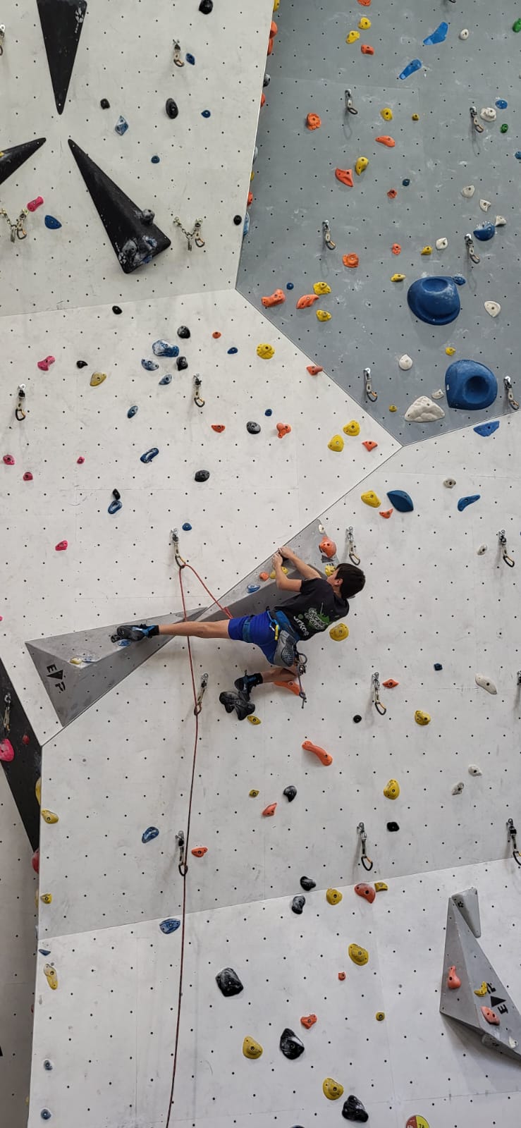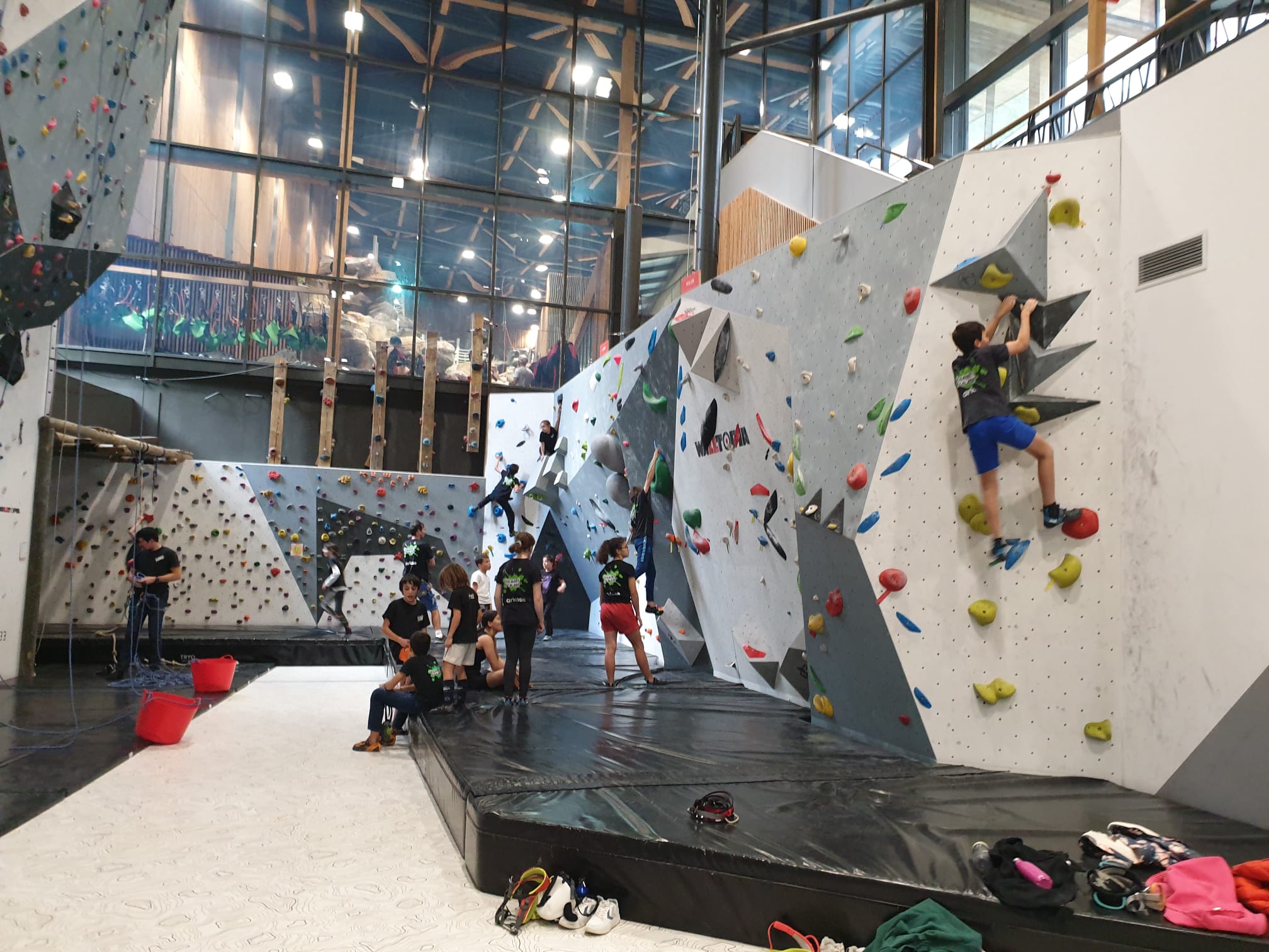 Déjà l’heure de la pause où se partagent les cakes et autres gâteaux, un peu de café et les jeunes sont déjà repartis. J’envoie Romane dans le long 5+ « symphonie de destruction » pour une belle ascension soldée malheureusement par un échec à quelques mètres de la fin. 30m de concentration et à gérer l’engagement, c’est déjà une belle performance ! Adèle la suivra en moulinette tandis que Boris s’essaie dans un 6c encore un peu trop dur pour lui avant de finir en tête dans une voie plus facile pour travailler la manip. Les autres ne sont pas en reste et « Zed et Gnougnou » a beaucoup de succès également, avec son pas d’allonge et son réta pas évident à négocier que Louise essaiera plusieurs fois. Jeanne et Paul se la jouent « tranquille » en moulinette dans toutes les voies installées tandis que Milo s’essaie aux voies un peu dures.