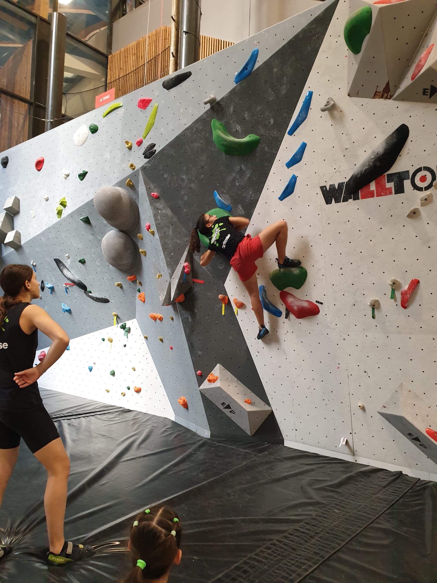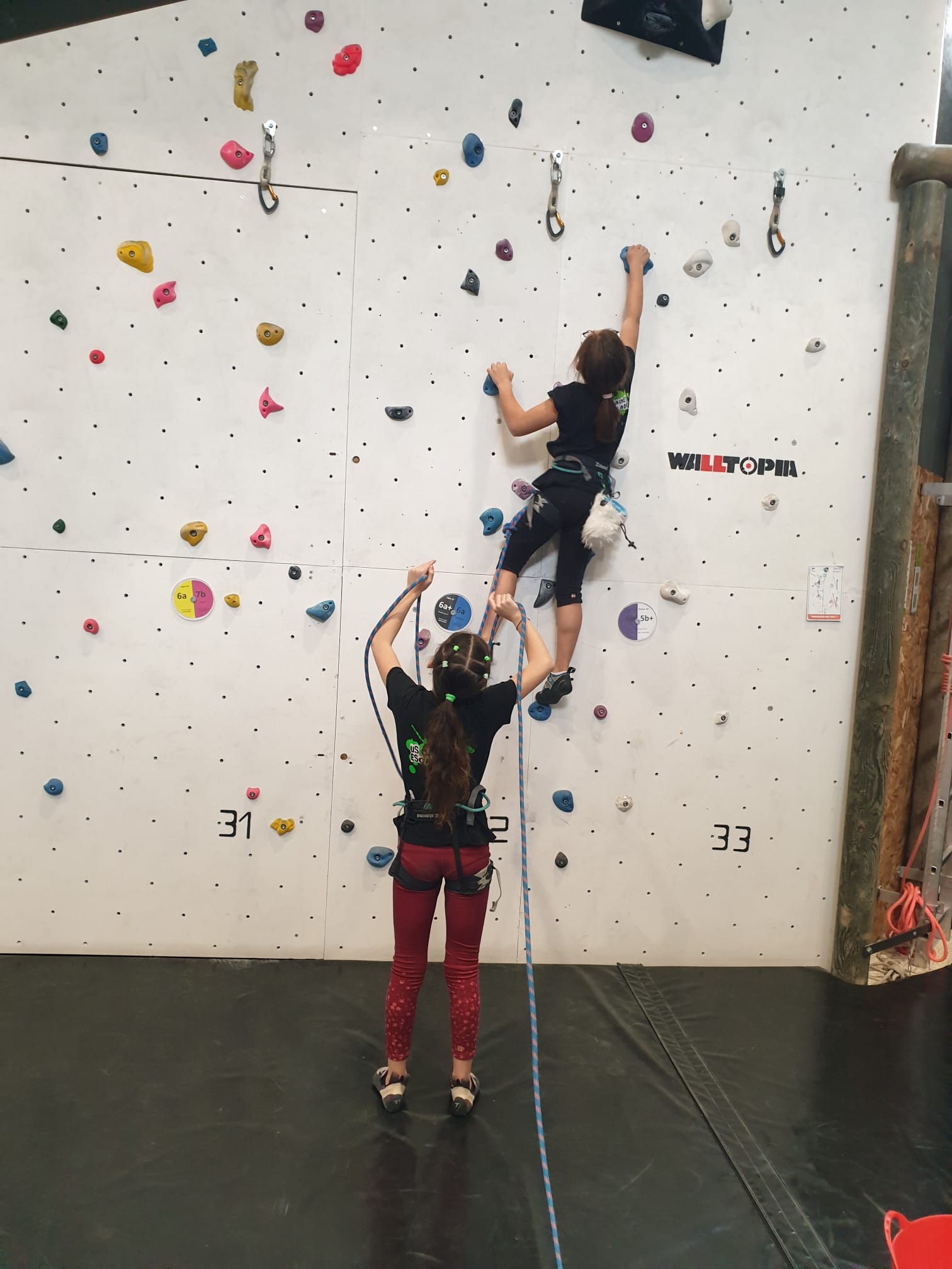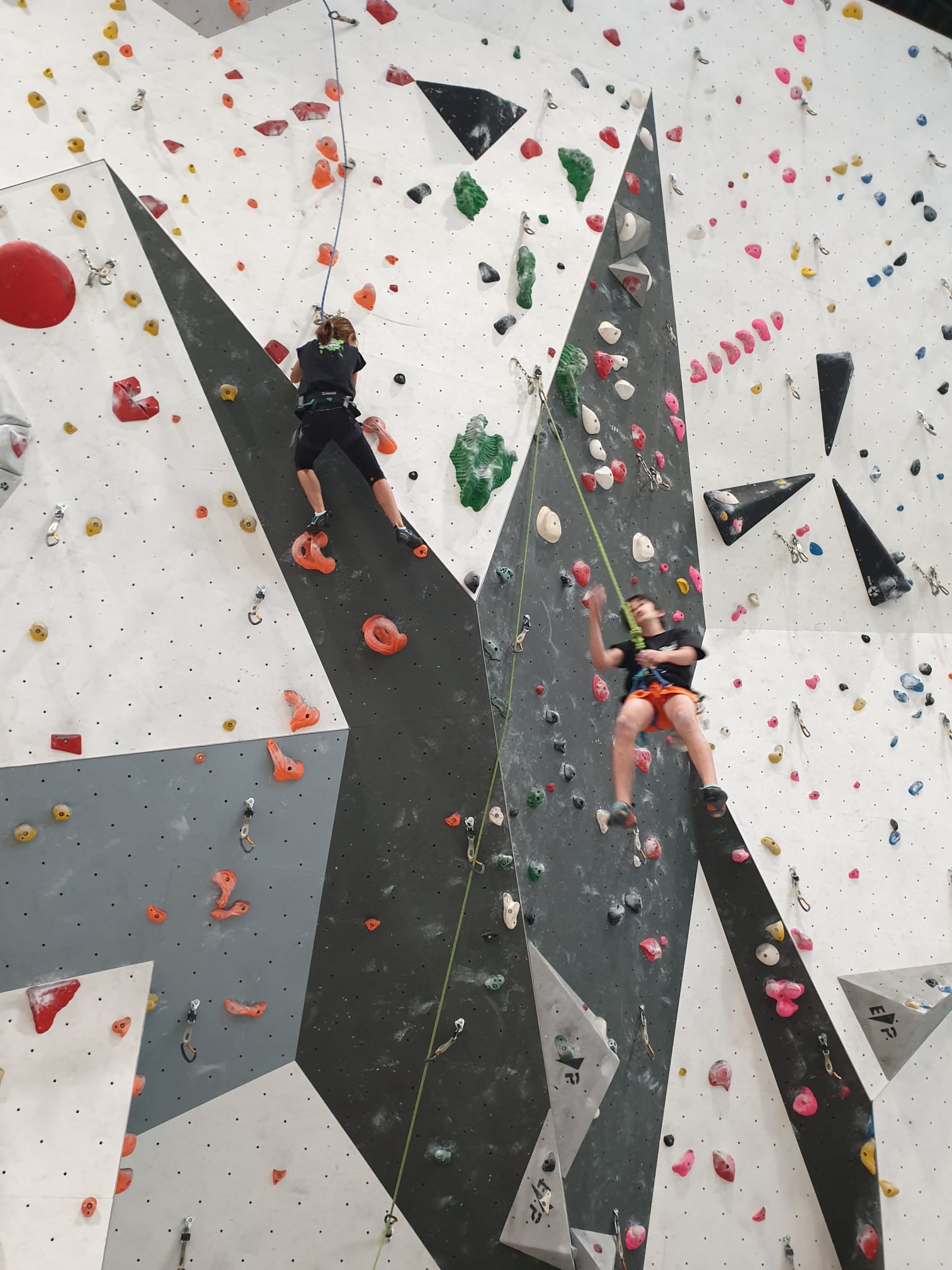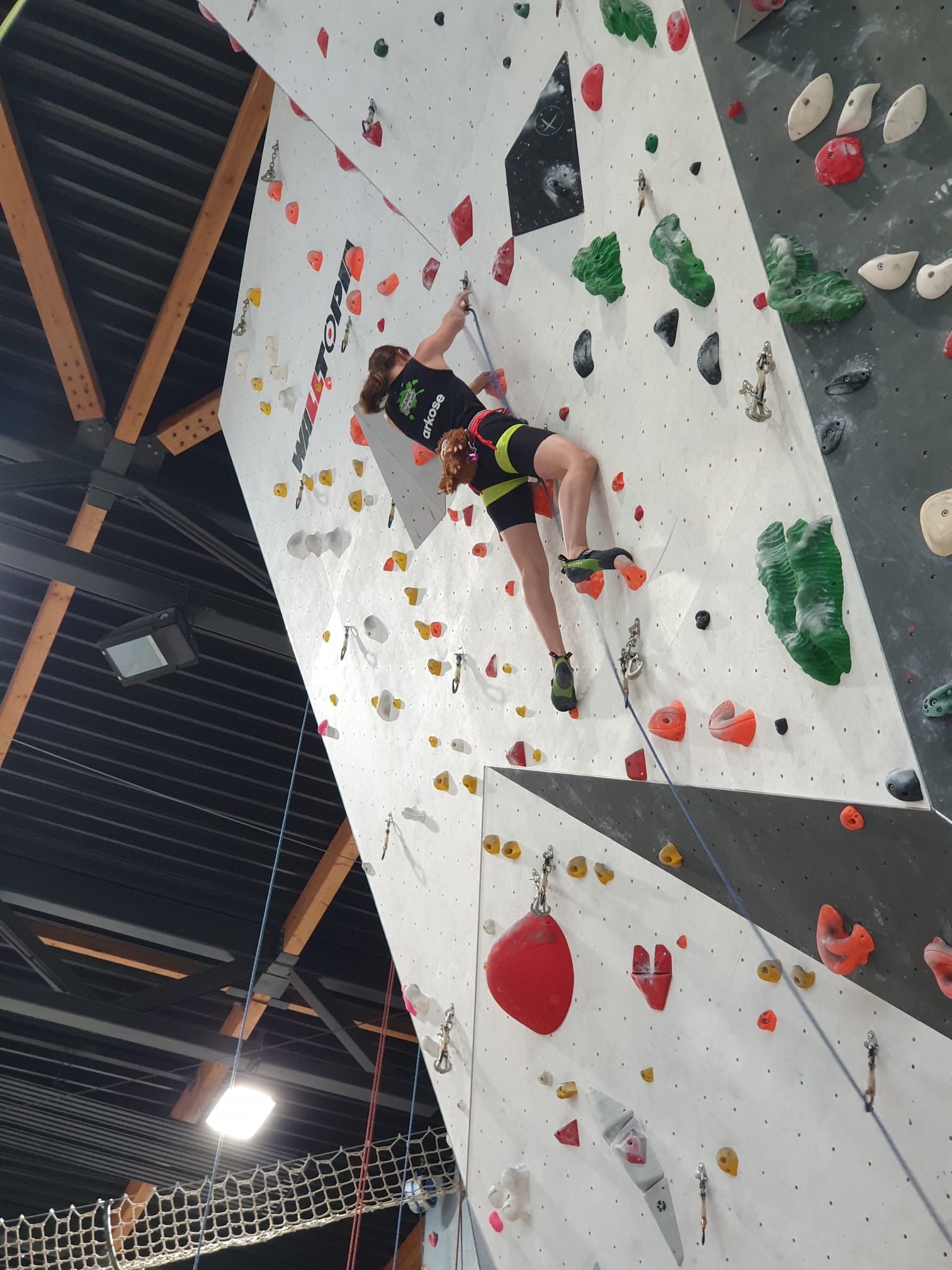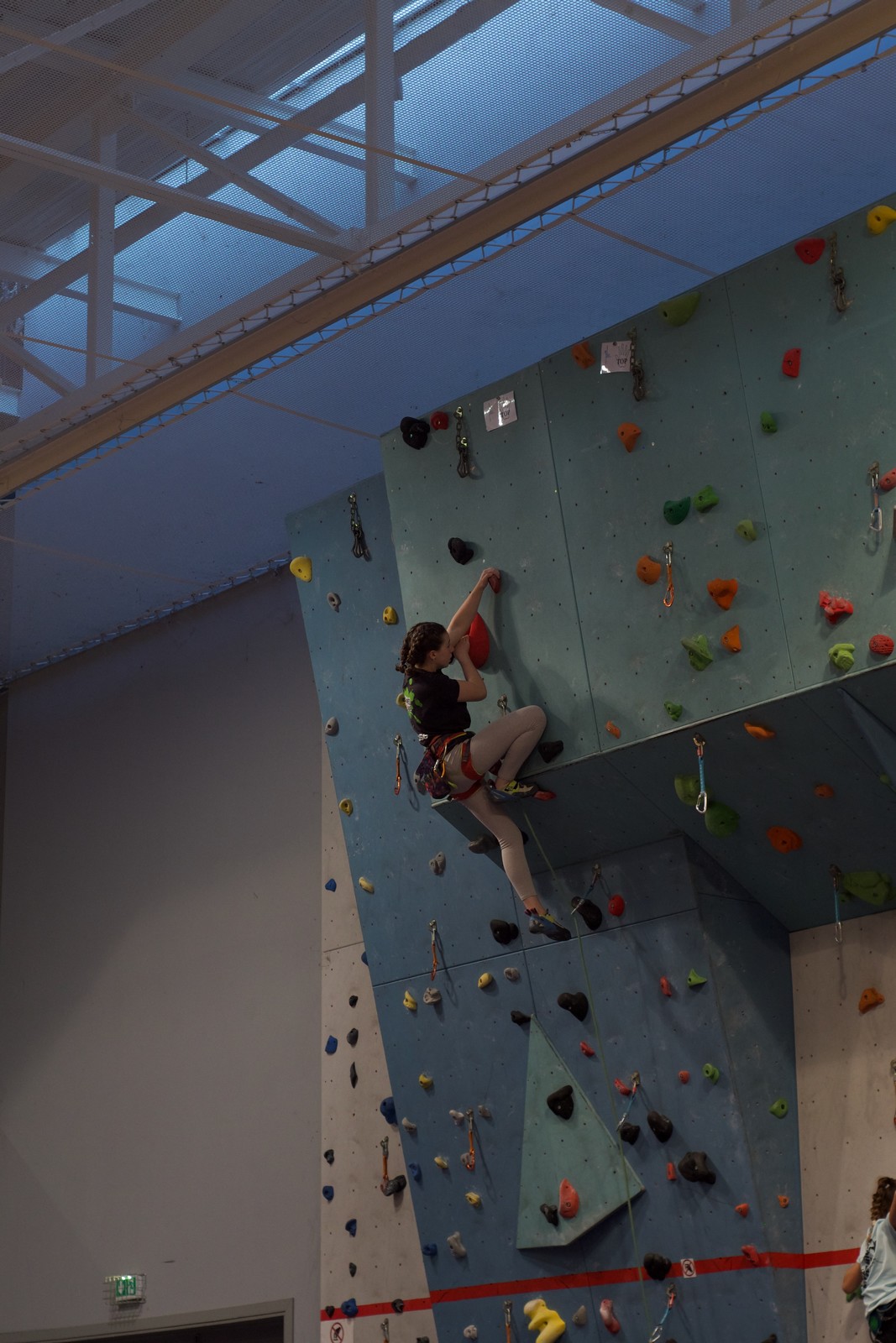 Déjà l’heure de la pause où se partagent les cakes et autres gâteaux, un peu de café et les jeunes sont déjà repartis. J’envoie Romane dans le long 5+ « symphonie de destruction » pour une belle ascension soldée malheureusement par un échec à quelques mètres de la fin. 30m de concentration et à gérer l’engagement, c’est déjà une belle performance ! Adèle la suivra en moulinette tandis que Boris s’essaie dans un 6c encore un peu trop dur pour lui avant de finir en tête dans une voie plus facile pour travailler la manip. Les autres ne sont pas en reste et « Zed et Gnougnou » a beaucoup de succès également, avec son pas d’allonge et son réta pas évident à négocier que Louise essaiera plusieurs fois. Jeanne et Paul se la jouent « tranquille » en moulinette dans toutes les voies installées tandis que Milo s’essaie aux voies un peu dures.
