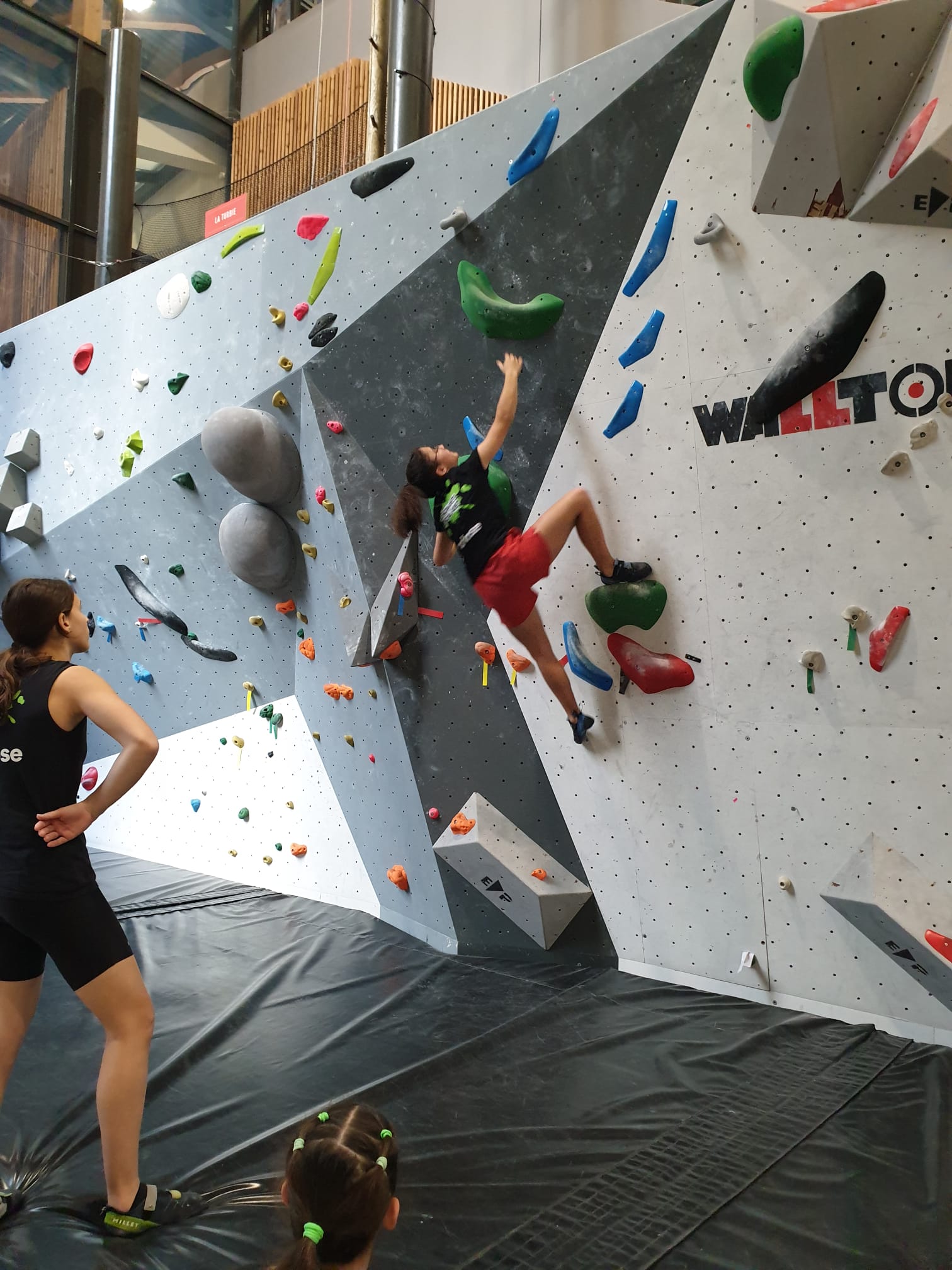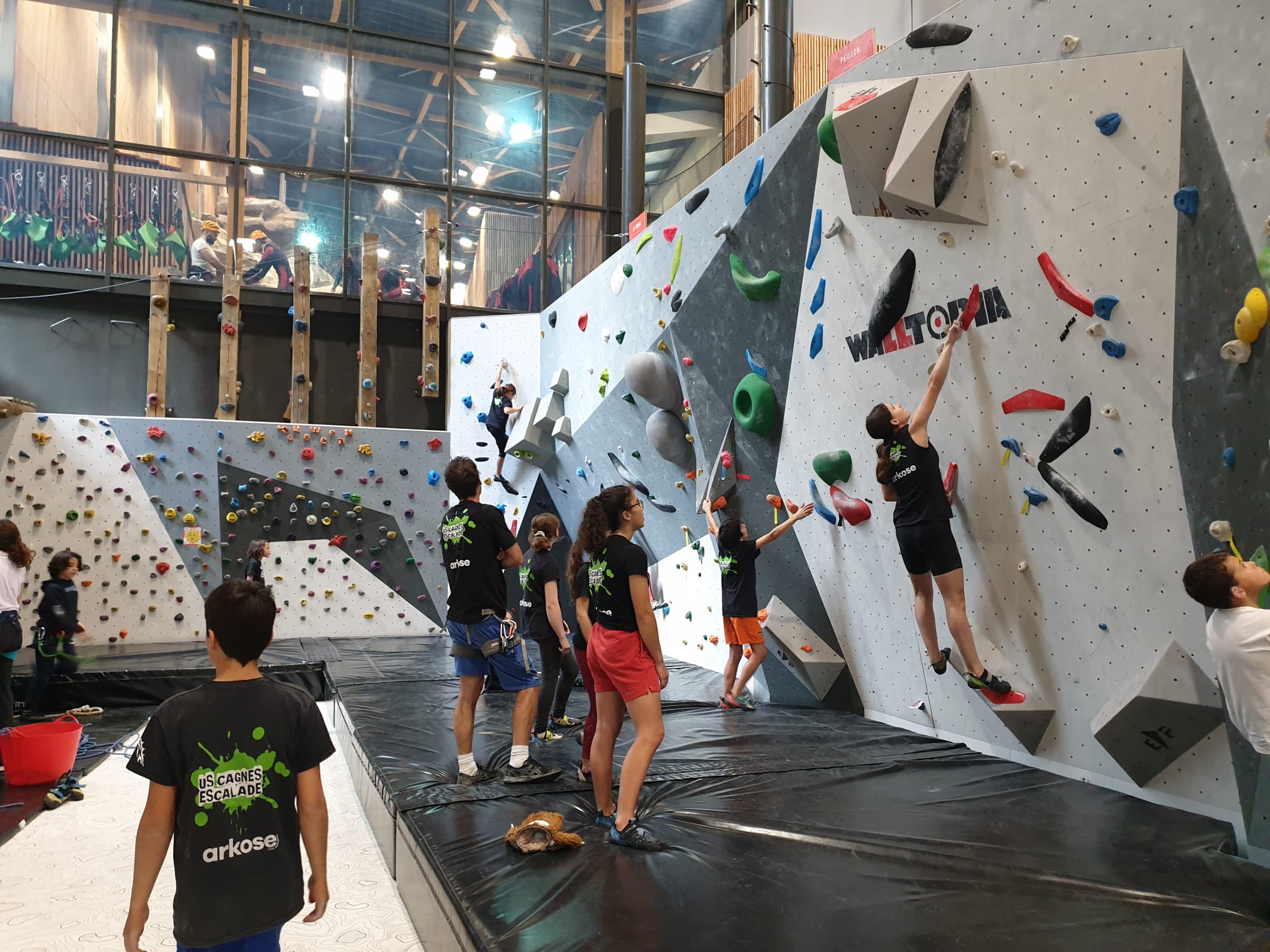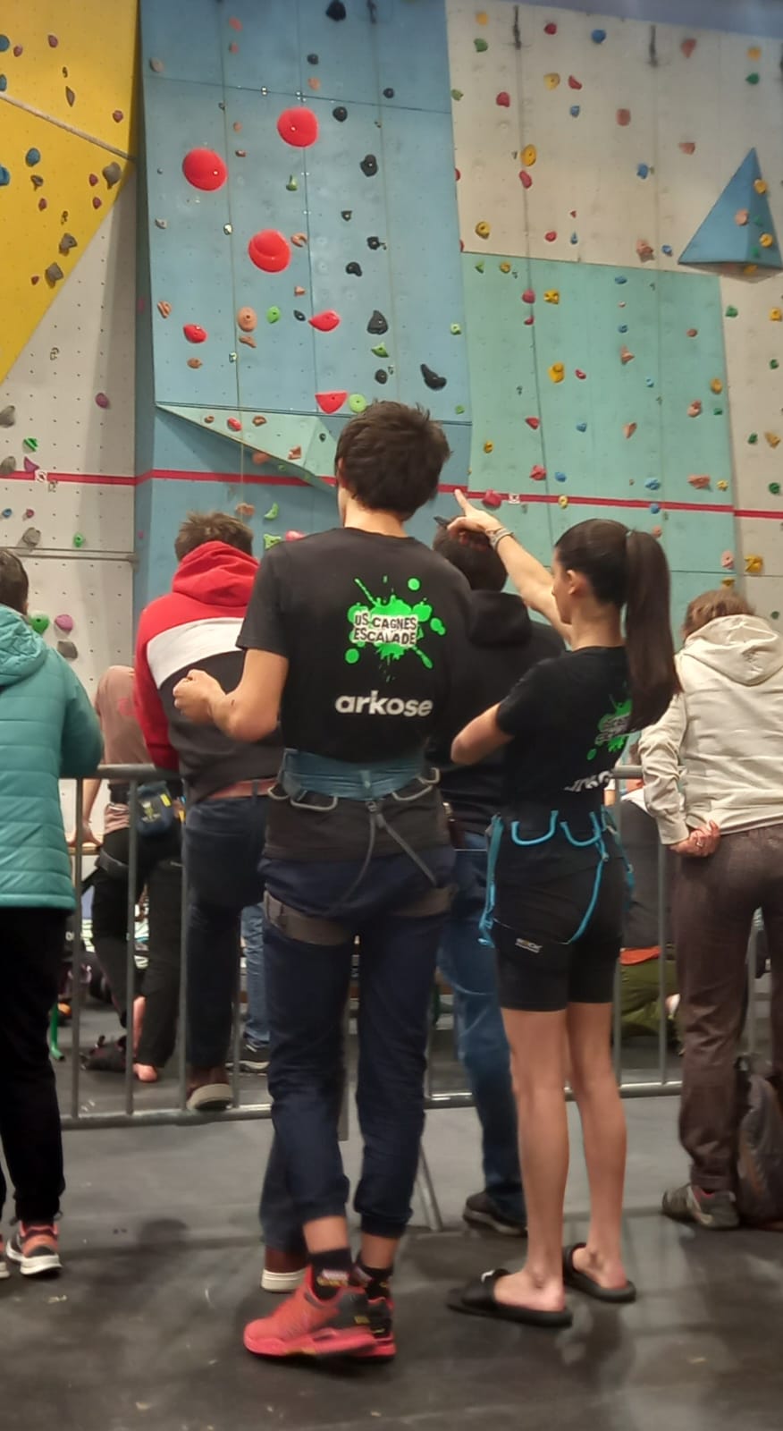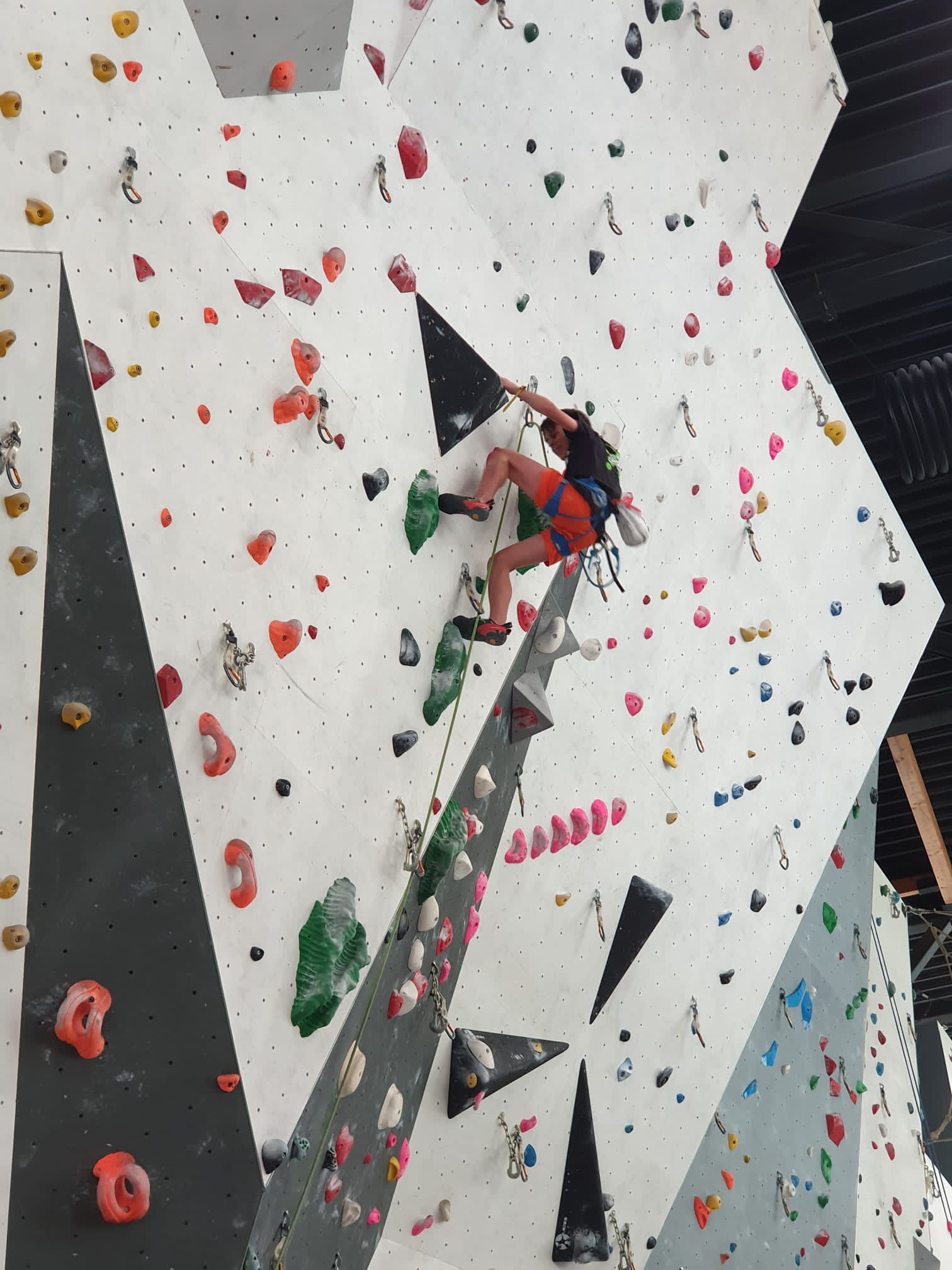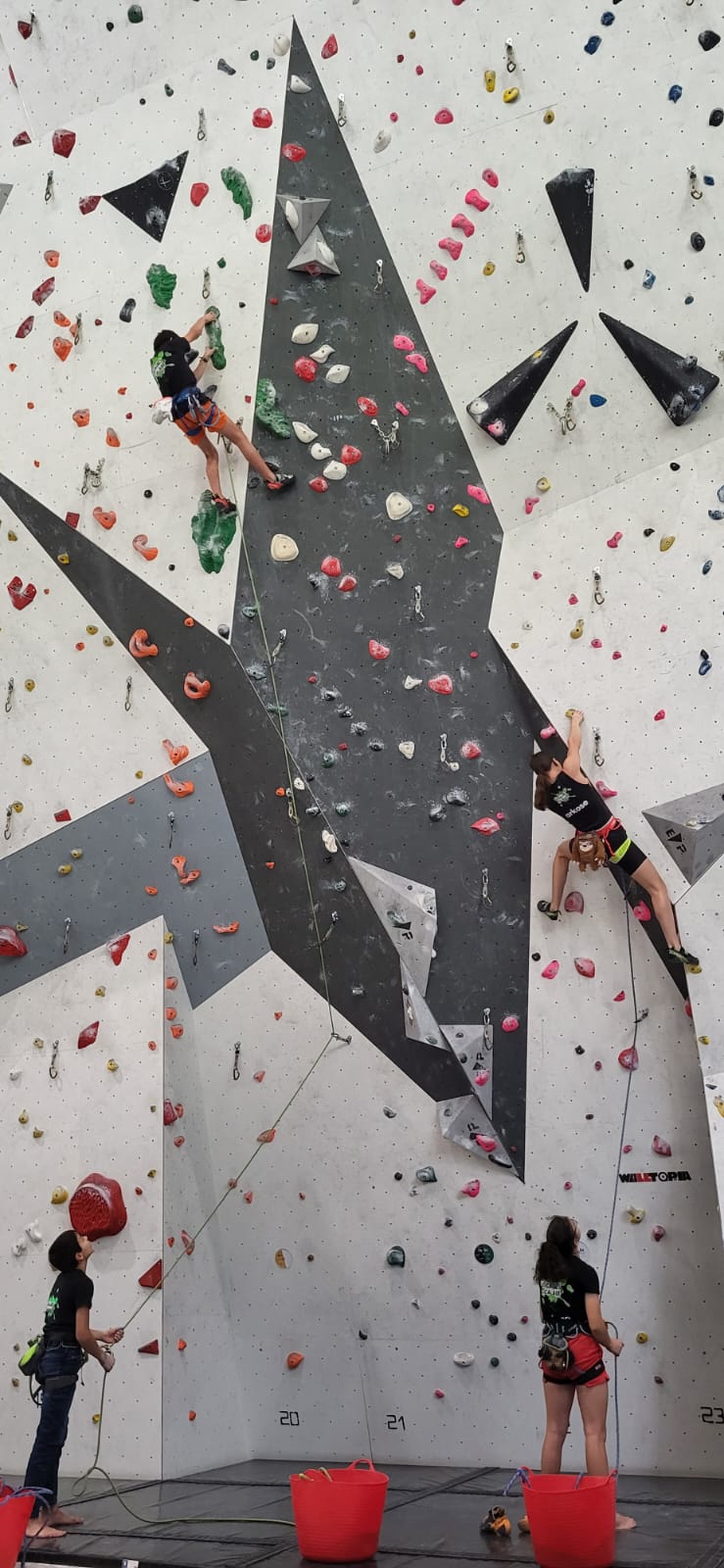 Déjà l’heure de la pause où se partagent les cakes et autres gâteaux, un peu de café et les jeunes sont déjà repartis. J’envoie Romane dans le long 5+ « symphonie de destruction » pour une belle ascension soldée malheureusement par un échec à quelques mètres de la fin. 30m de concentration et à gérer l’engagement, c’est déjà une belle performance ! Adèle la suivra en moulinette tandis que Boris s’essaie dans un 6c encore un peu trop dur pour lui avant de finir en tête dans une voie plus facile pour travailler la manip. Les autres ne sont pas en reste et « Zed et Gnougnou » a beaucoup de succès également, avec son pas d’allonge et son réta pas évident à négocier que Louise essaiera plusieurs fois. Jeanne et Paul se la jouent « tranquille » en moulinette dans toutes les voies installées tandis que Milo s’essaie aux voies un peu dures.