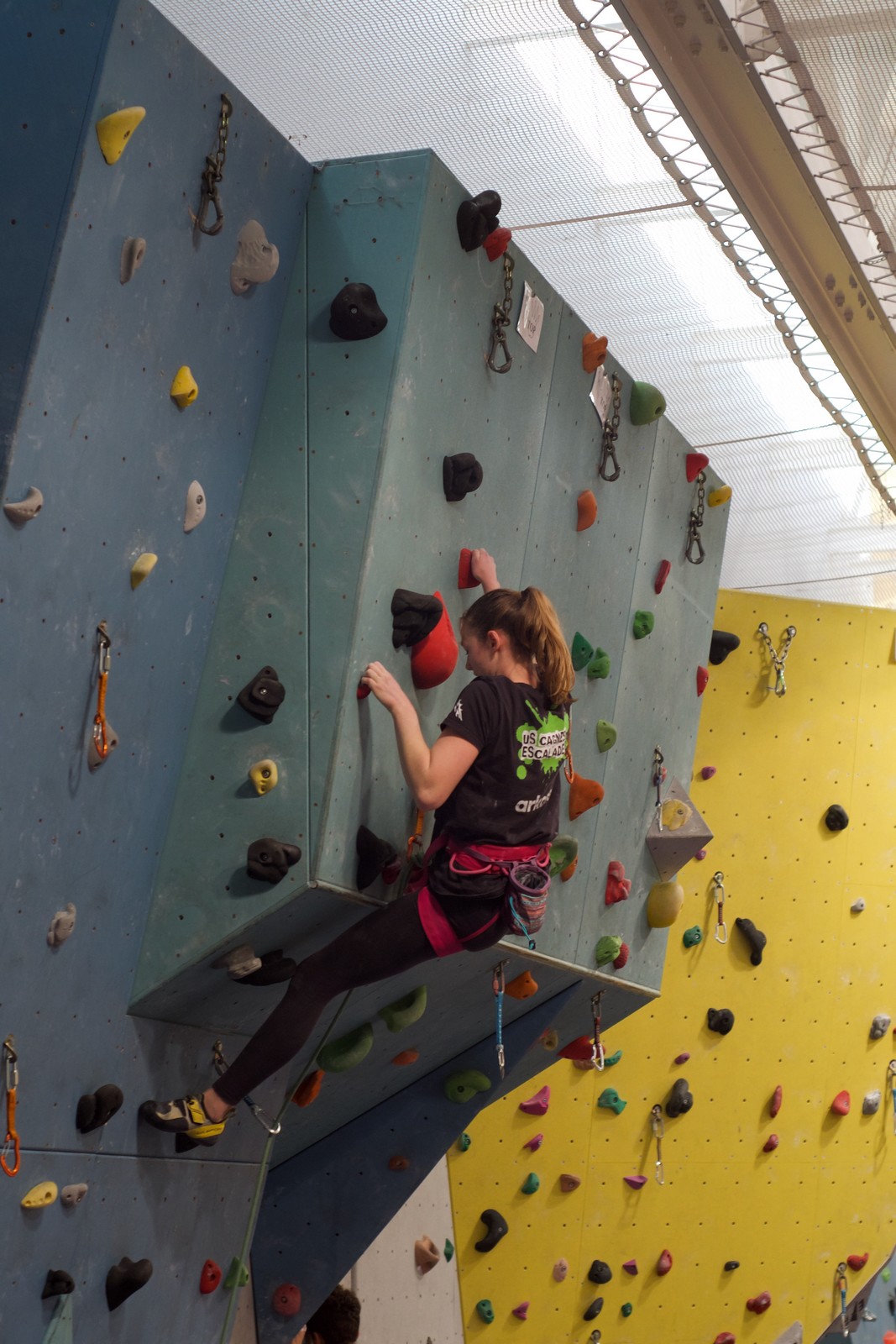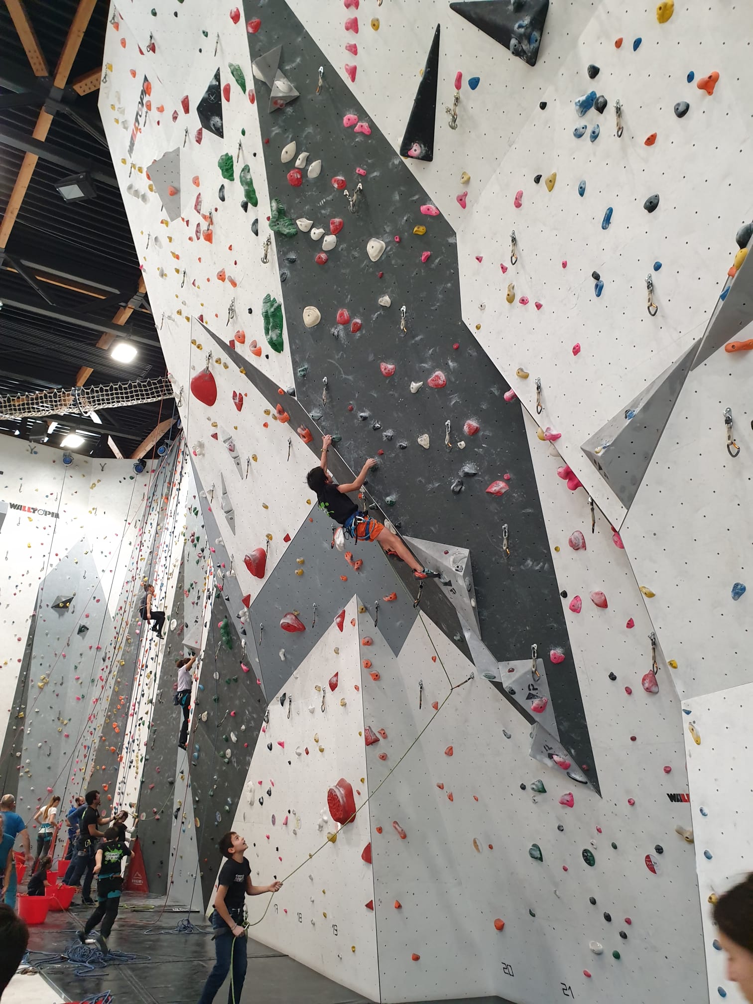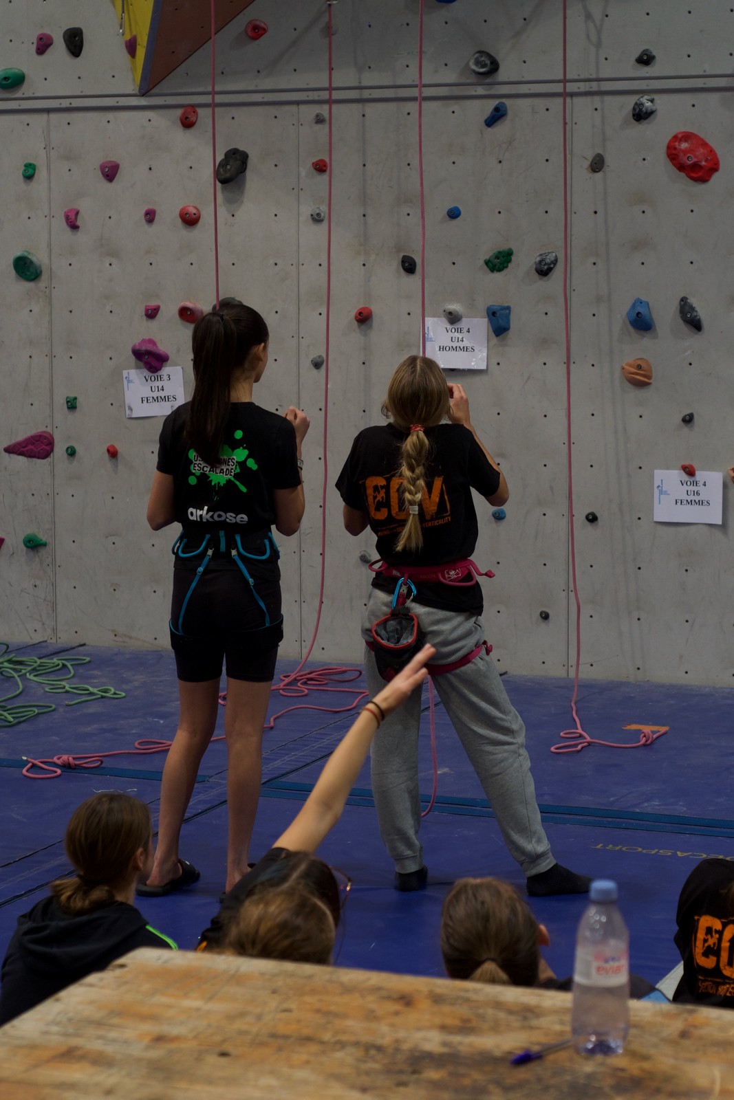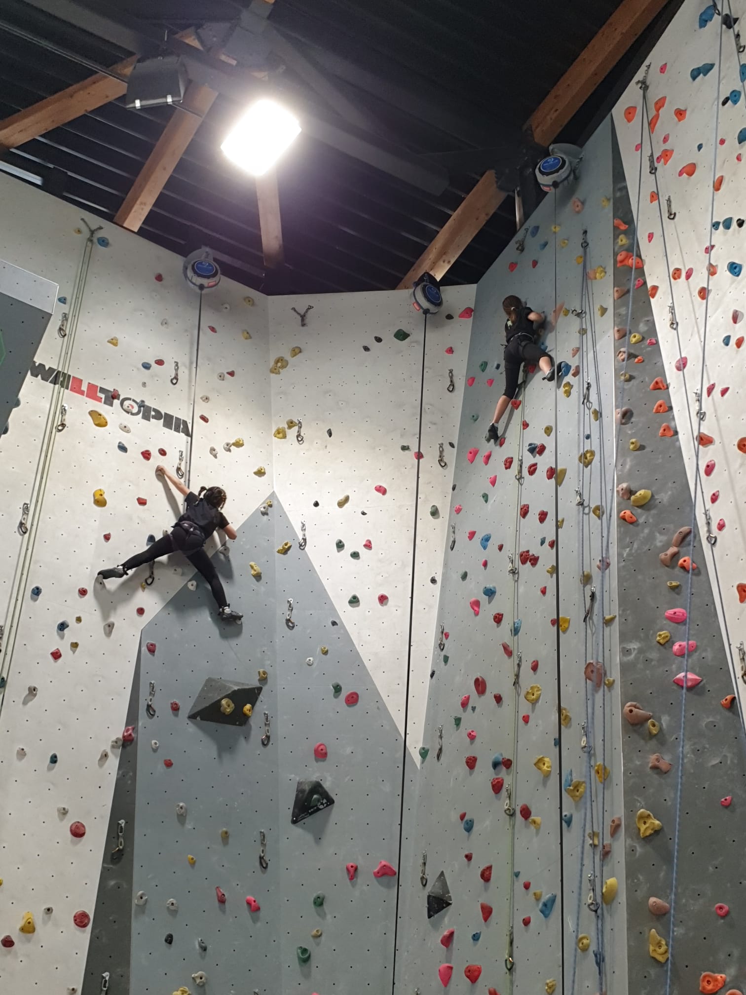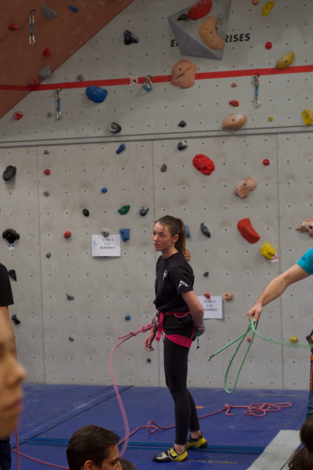 Déjà l’heure de la pause où se partagent les cakes et autres gâteaux, un peu de café et les jeunes sont déjà repartis. J’envoie Romane dans le long 5+ « symphonie de destruction » pour une belle ascension soldée malheureusement par un échec à quelques mètres de la fin. 30m de concentration et à gérer l’engagement, c’est déjà une belle performance ! Adèle la suivra en moulinette tandis que Boris s’essaie dans un 6c encore un peu trop dur pour lui avant de finir en tête dans une voie plus facile pour travailler la manip. Les autres ne sont pas en reste et « Zed et Gnougnou » a beaucoup de succès également, avec son pas d’allonge et son réta pas évident à négocier que Louise essaiera plusieurs fois. Jeanne et Paul se la jouent « tranquille » en moulinette dans toutes les voies installées tandis que Milo s’essaie aux voies un peu dures.