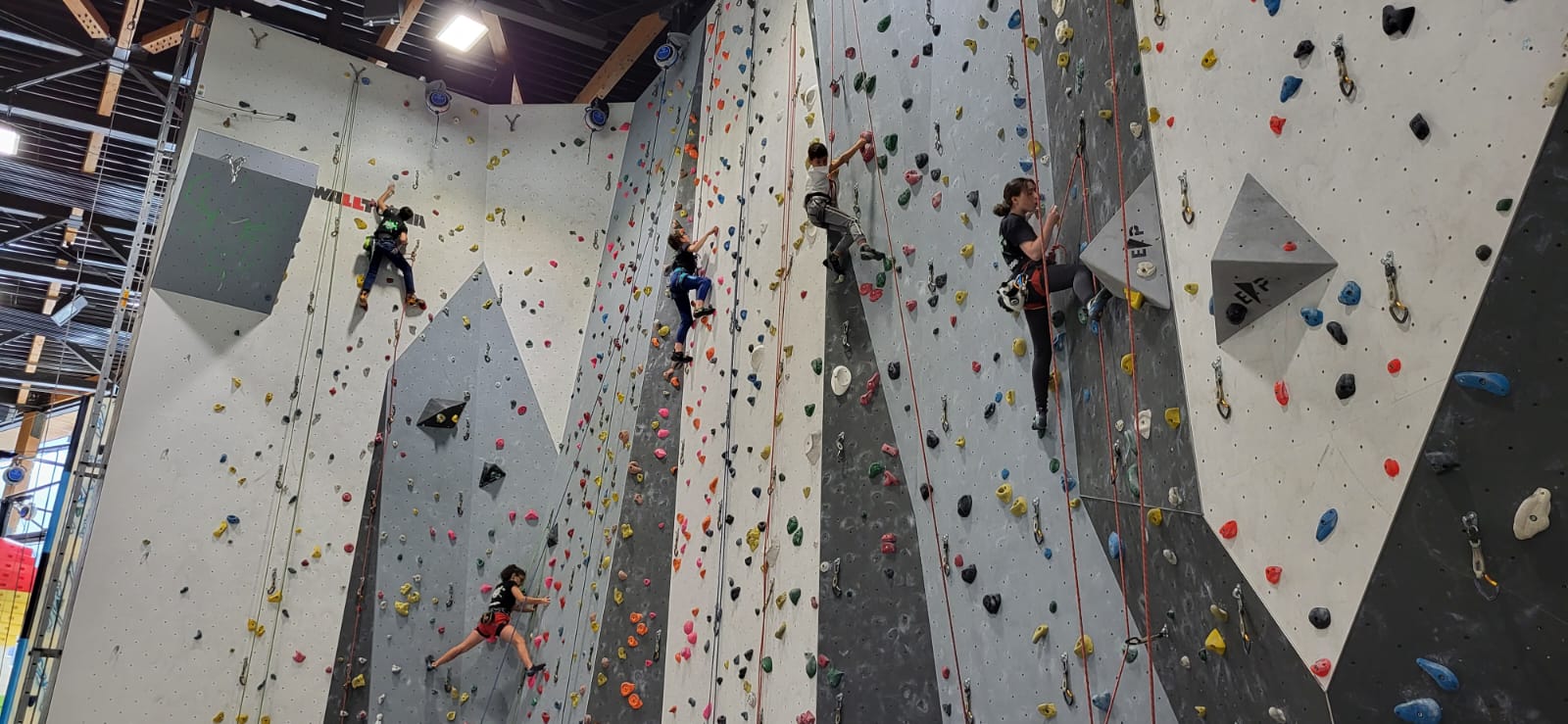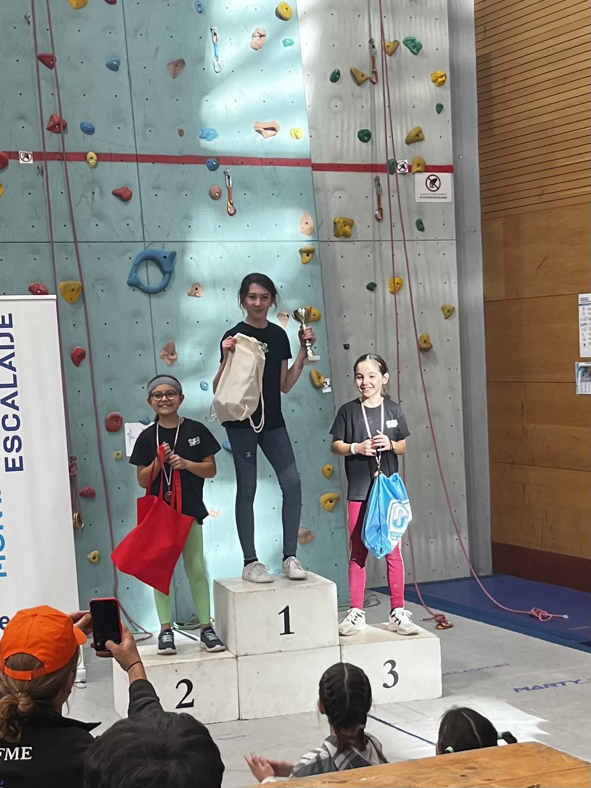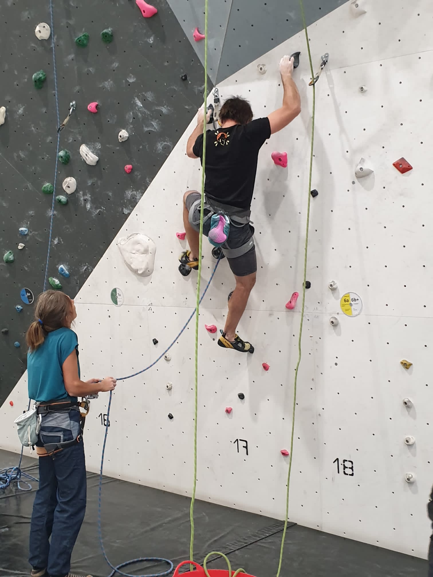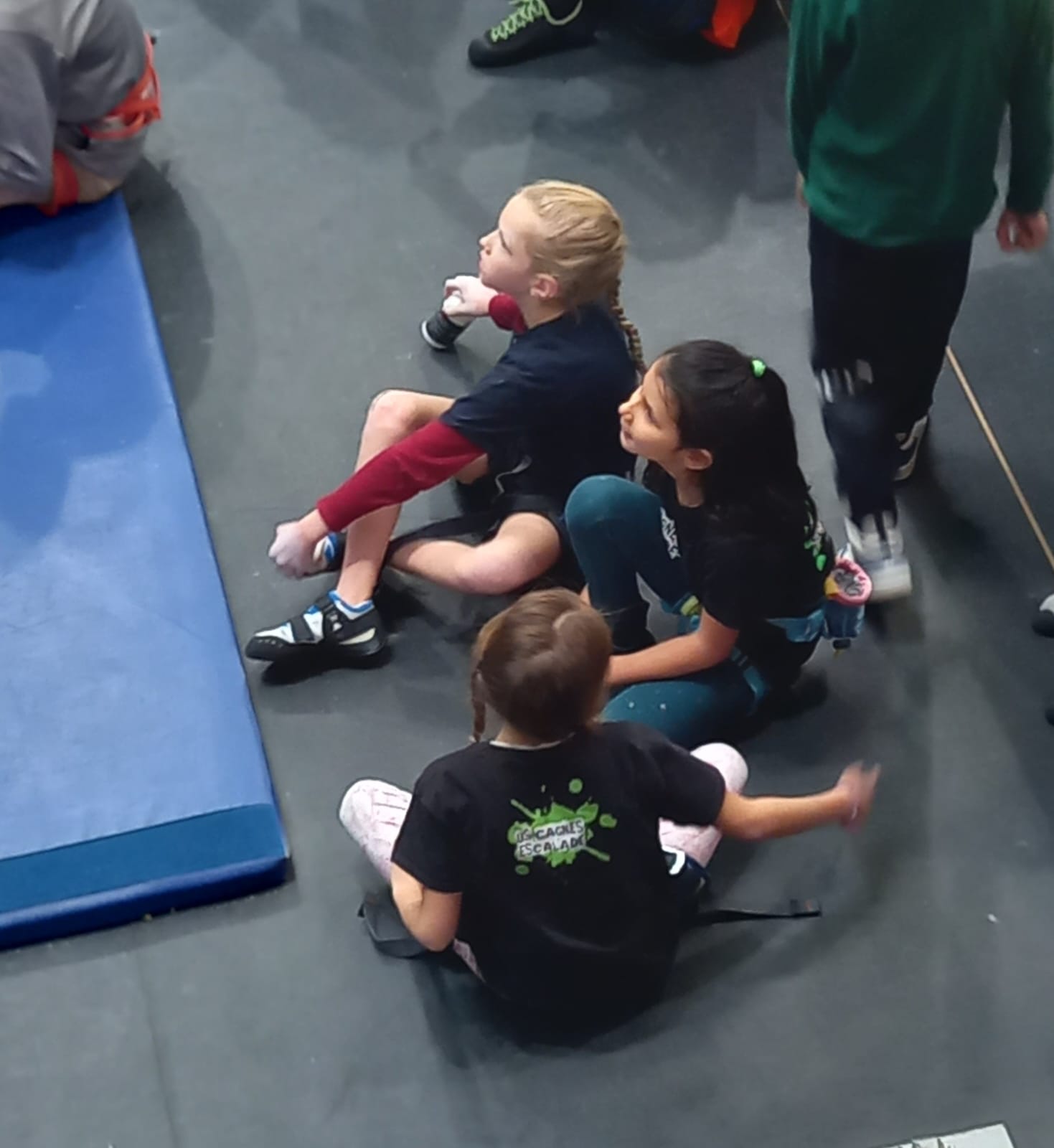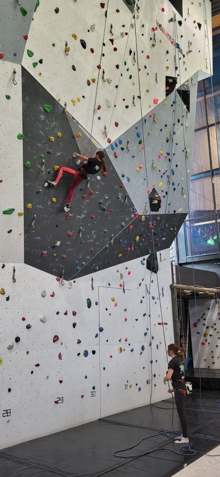 Déjà l’heure de la pause où se partagent les cakes et autres gâteaux, un peu de café et les jeunes sont déjà repartis. J’envoie Romane dans le long 5+ « symphonie de destruction » pour une belle ascension soldée malheureusement par un échec à quelques mètres de la fin. 30m de concentration et à gérer l’engagement, c’est déjà une belle performance ! Adèle la suivra en moulinette tandis que Boris s’essaie dans un 6c encore un peu trop dur pour lui avant de finir en tête dans une voie plus facile pour travailler la manip. Les autres ne sont pas en reste et « Zed et Gnougnou » a beaucoup de succès également, avec son pas d’allonge et son réta pas évident à négocier que Louise essaiera plusieurs fois. Jeanne et Paul se la jouent « tranquille » en moulinette dans toutes les voies installées tandis que Milo s’essaie aux voies un peu dures.