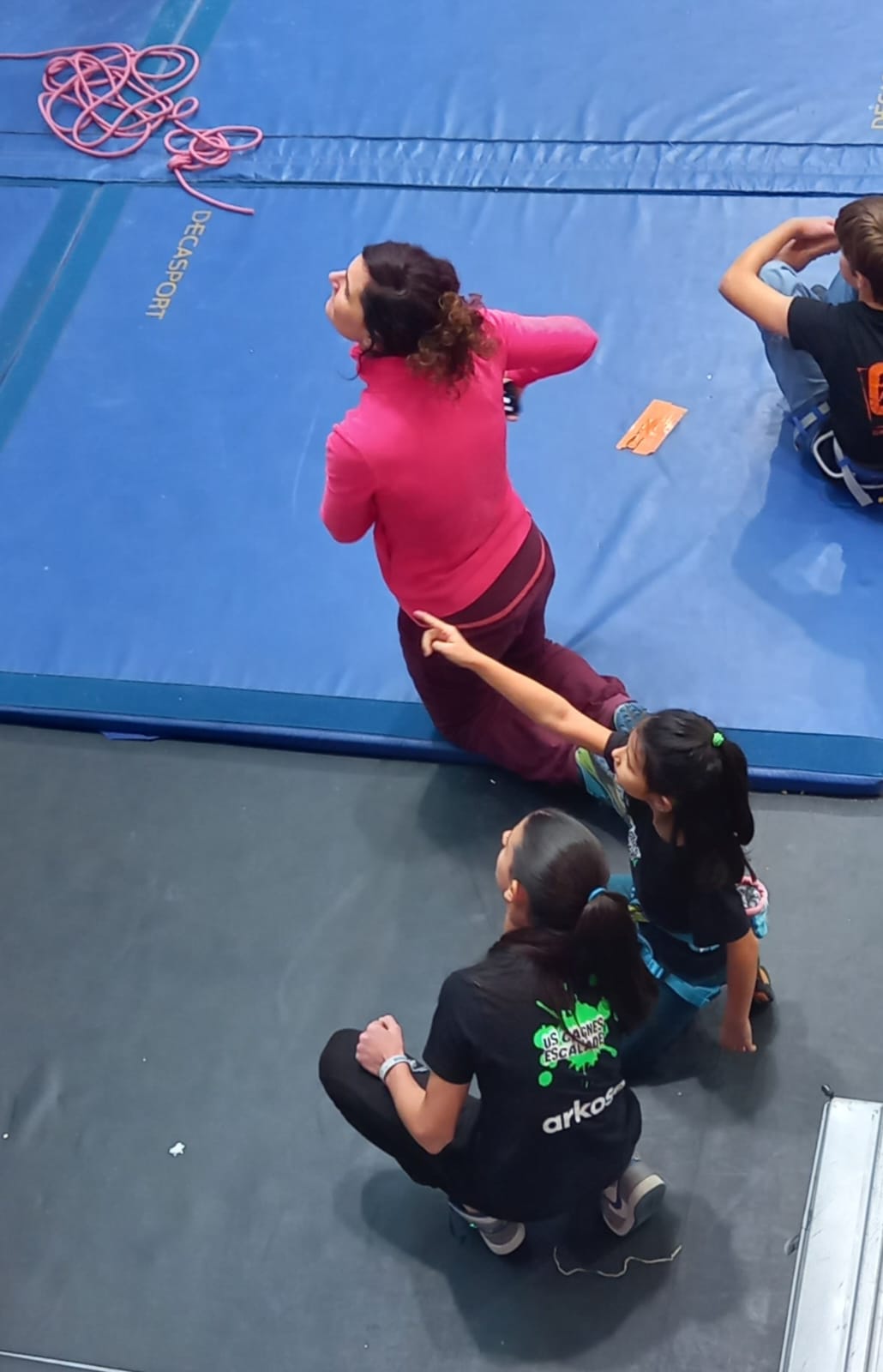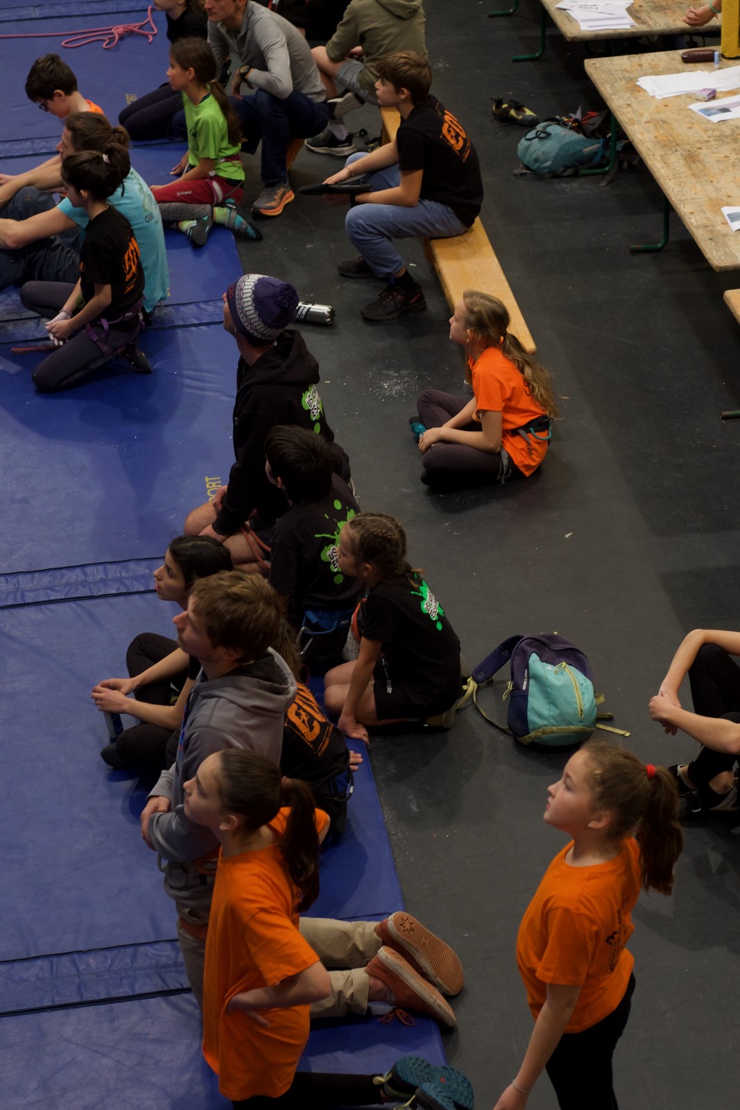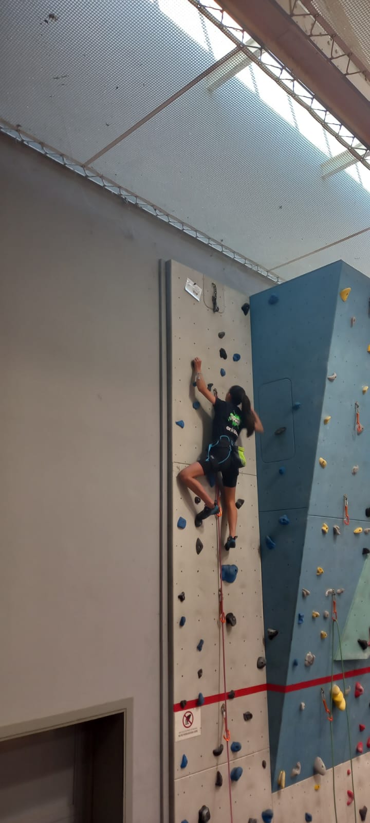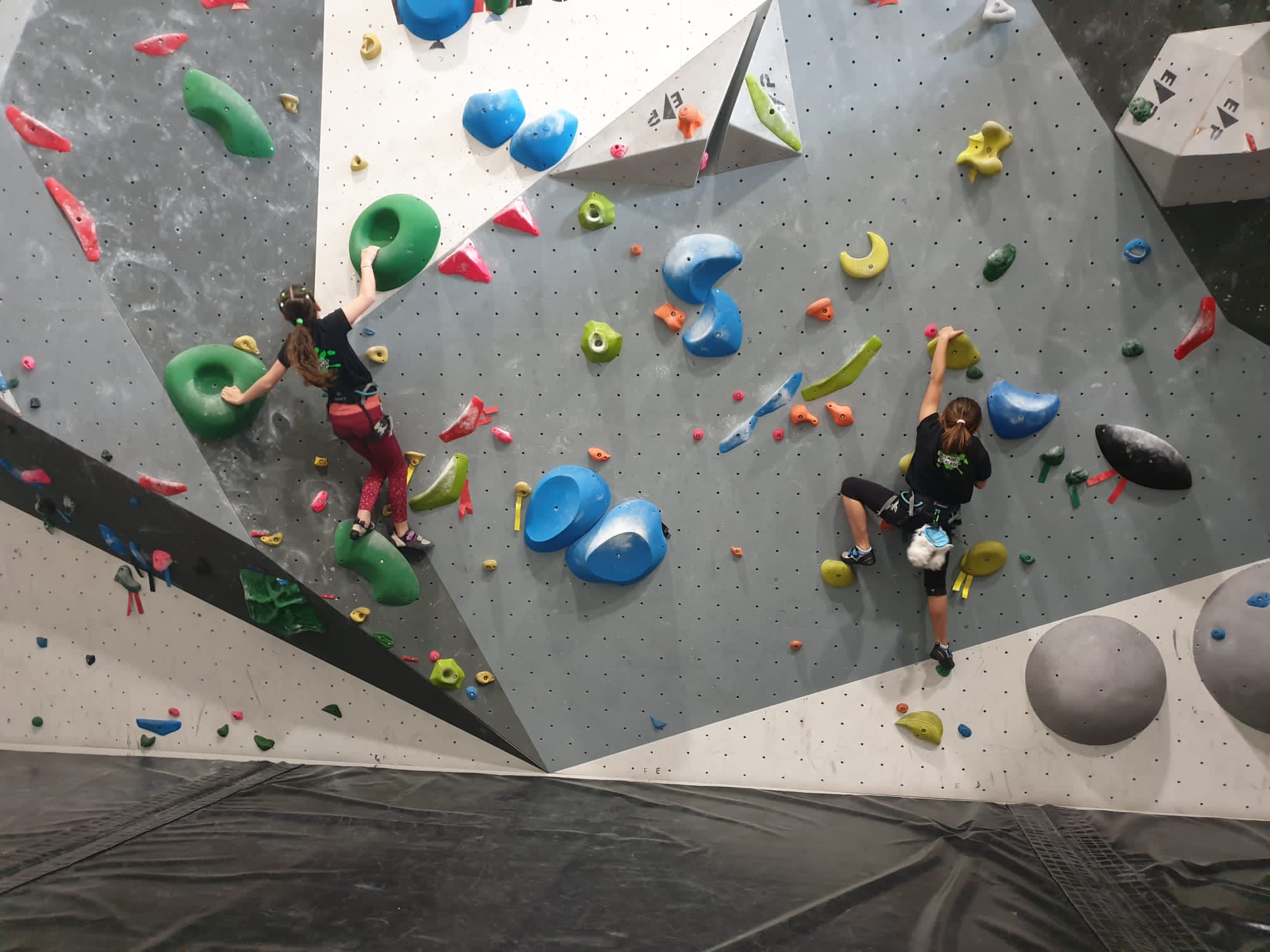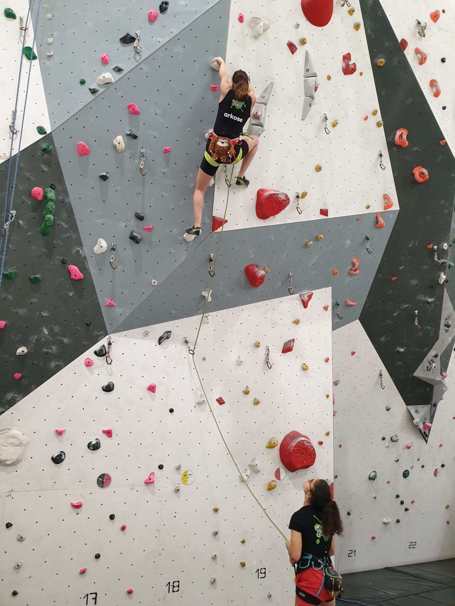 Déjà l’heure de la pause où se partagent les cakes et autres gâteaux, un peu de café et les jeunes sont déjà repartis. J’envoie Romane dans le long 5+ « symphonie de destruction » pour une belle ascension soldée malheureusement par un échec à quelques mètres de la fin. 30m de concentration et à gérer l’engagement, c’est déjà une belle performance ! Adèle la suivra en moulinette tandis que Boris s’essaie dans un 6c encore un peu trop dur pour lui avant de finir en tête dans une voie plus facile pour travailler la manip. Les autres ne sont pas en reste et « Zed et Gnougnou » a beaucoup de succès également, avec son pas d’allonge et son réta pas évident à négocier que Louise essaiera plusieurs fois. Jeanne et Paul se la jouent « tranquille » en moulinette dans toutes les voies installées tandis que Milo s’essaie aux voies un peu dures.