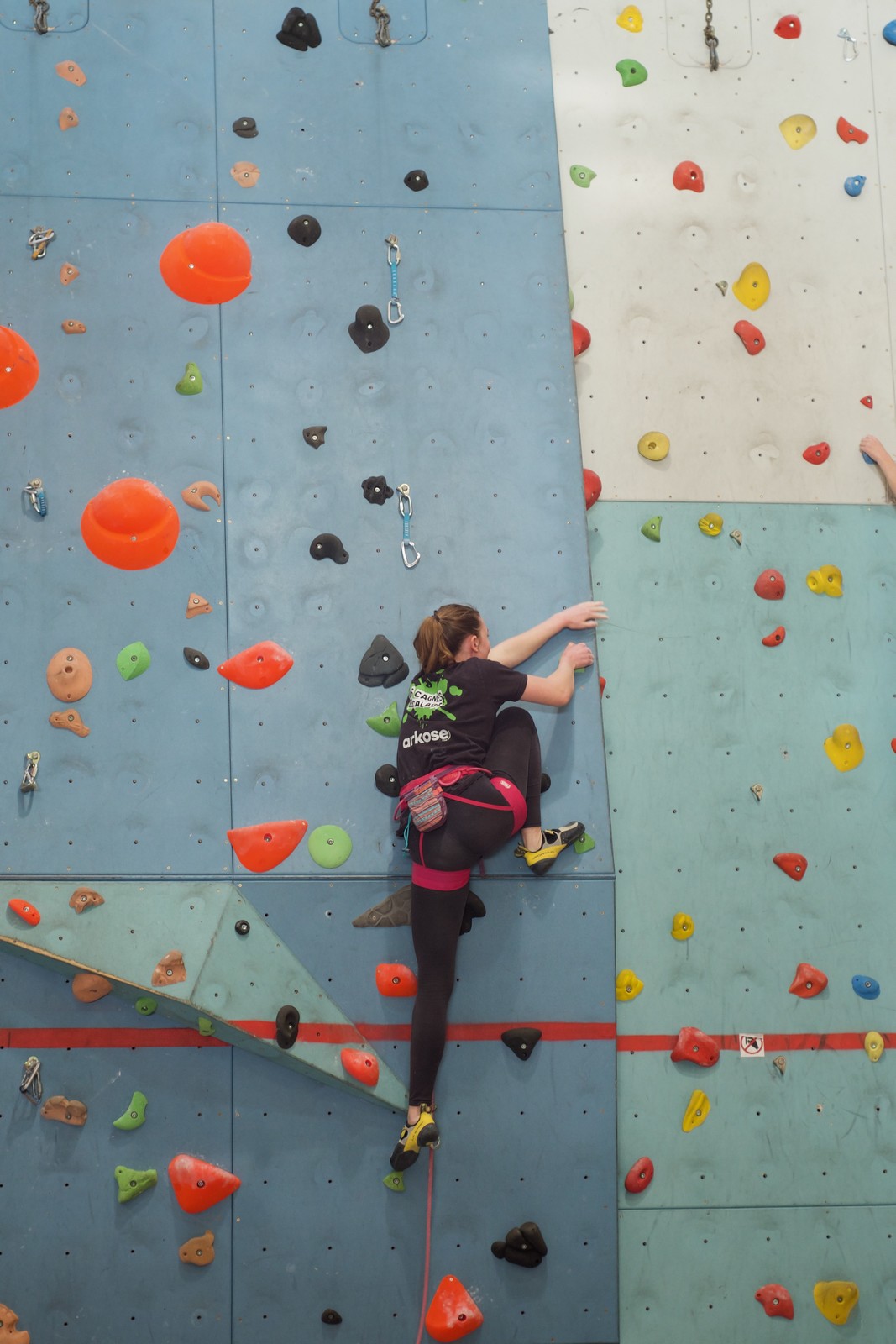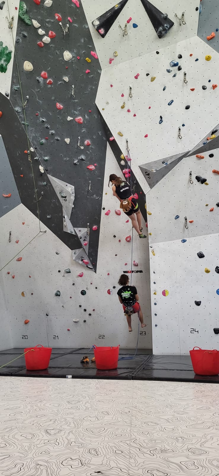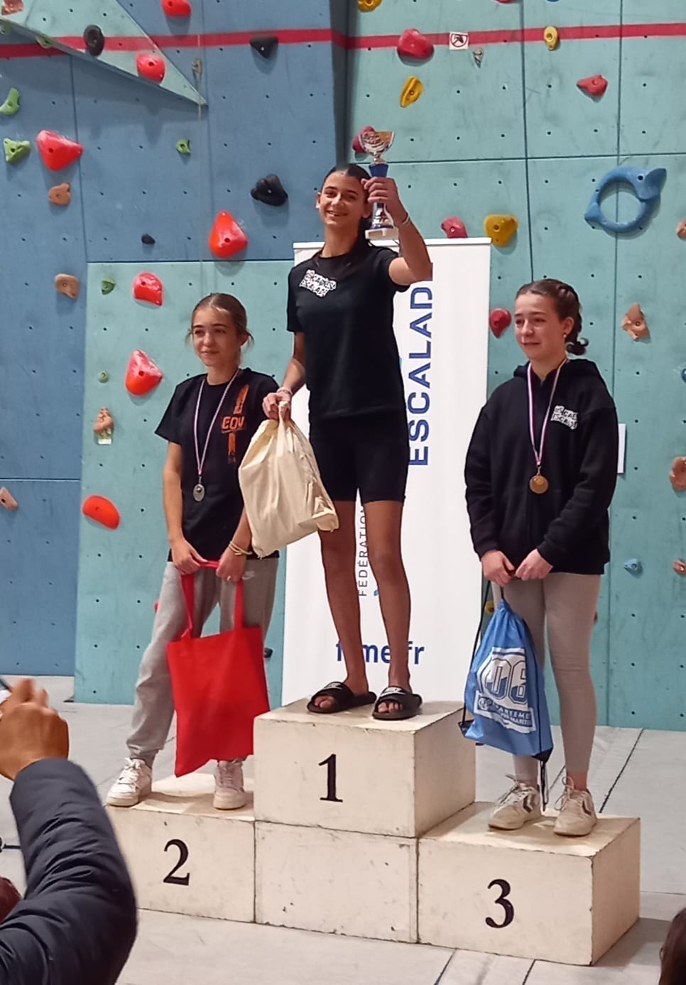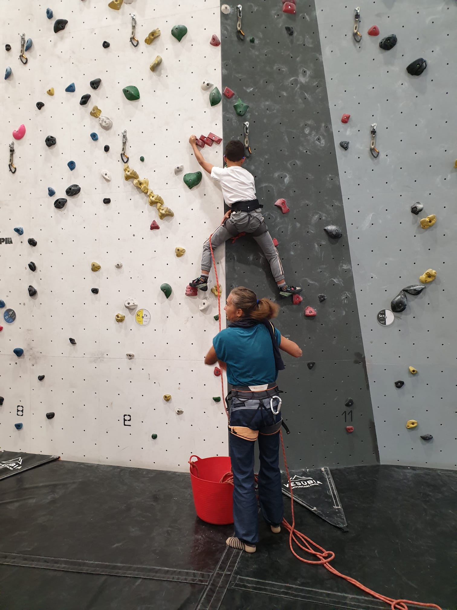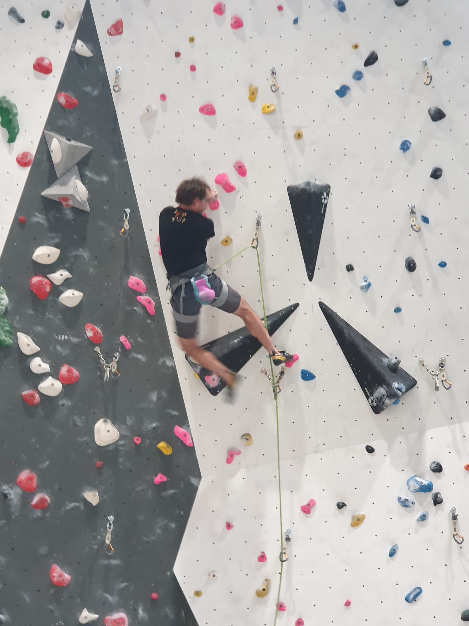 Déjà l’heure de la pause où se partagent les cakes et autres gâteaux, un peu de café et les jeunes sont déjà repartis. J’envoie Romane dans le long 5+ « symphonie de destruction » pour une belle ascension soldée malheureusement par un échec à quelques mètres de la fin. 30m de concentration et à gérer l’engagement, c’est déjà une belle performance ! Adèle la suivra en moulinette tandis que Boris s’essaie dans un 6c encore un peu trop dur pour lui avant de finir en tête dans une voie plus facile pour travailler la manip. Les autres ne sont pas en reste et « Zed et Gnougnou » a beaucoup de succès également, avec son pas d’allonge et son réta pas évident à négocier que Louise essaiera plusieurs fois. Jeanne et Paul se la jouent « tranquille » en moulinette dans toutes les voies installées tandis que Milo s’essaie aux voies un peu dures.