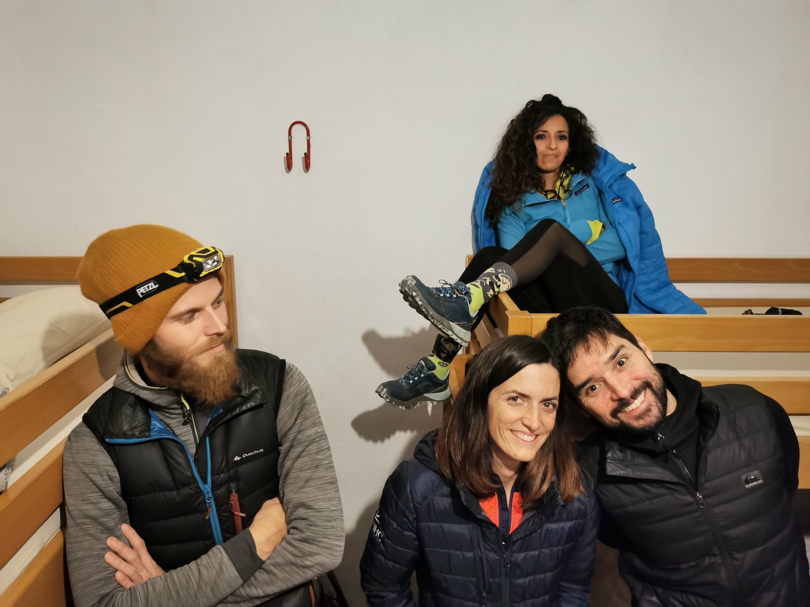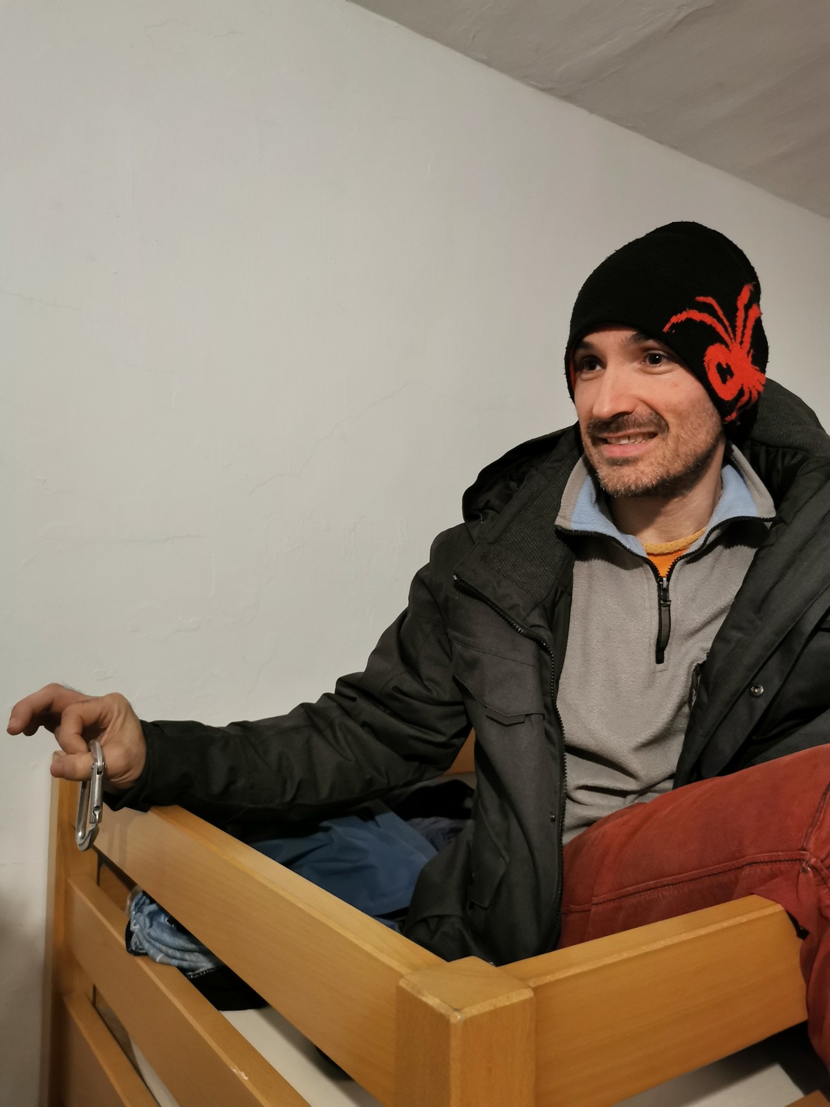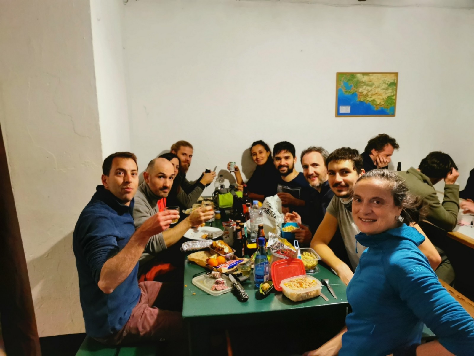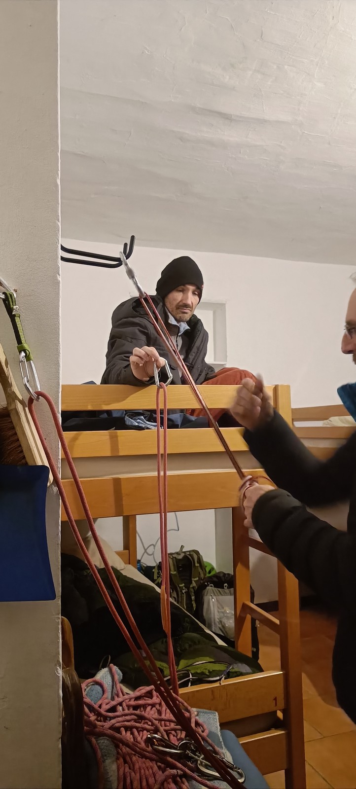 Arrivés à bon port, on s’installe sur les tables au chaud et chacun sort son repas. Pour ma part, je suis très fatigué de ma semaine mais il me reste encore à faire un briefing pour le lendemain. On se retrouve dans le dortoir pour confirmer les cordées et les voies du lendemain. Cette année, petite nouveauté, certains se lancent dans le terrain d’aventure. Comprenez qu’il faut placer soi-même des protections amovibles, ce qui rajoute pas mal de matériel et de l’ambiance ! Pour la plupart, c’est complètement nouveau. Même s’ils seront au final assez peu à grimper en tête dans ce type de voies, il faut bien que j’explique un peu les bases : pose de friends, relais 3 points, j’oublie plein de choses mais je fais au mieux avant l’extinction des feux à 23h. Chacun rejoint son dortoir et son lit pour une nuit plus ou moins bonne.