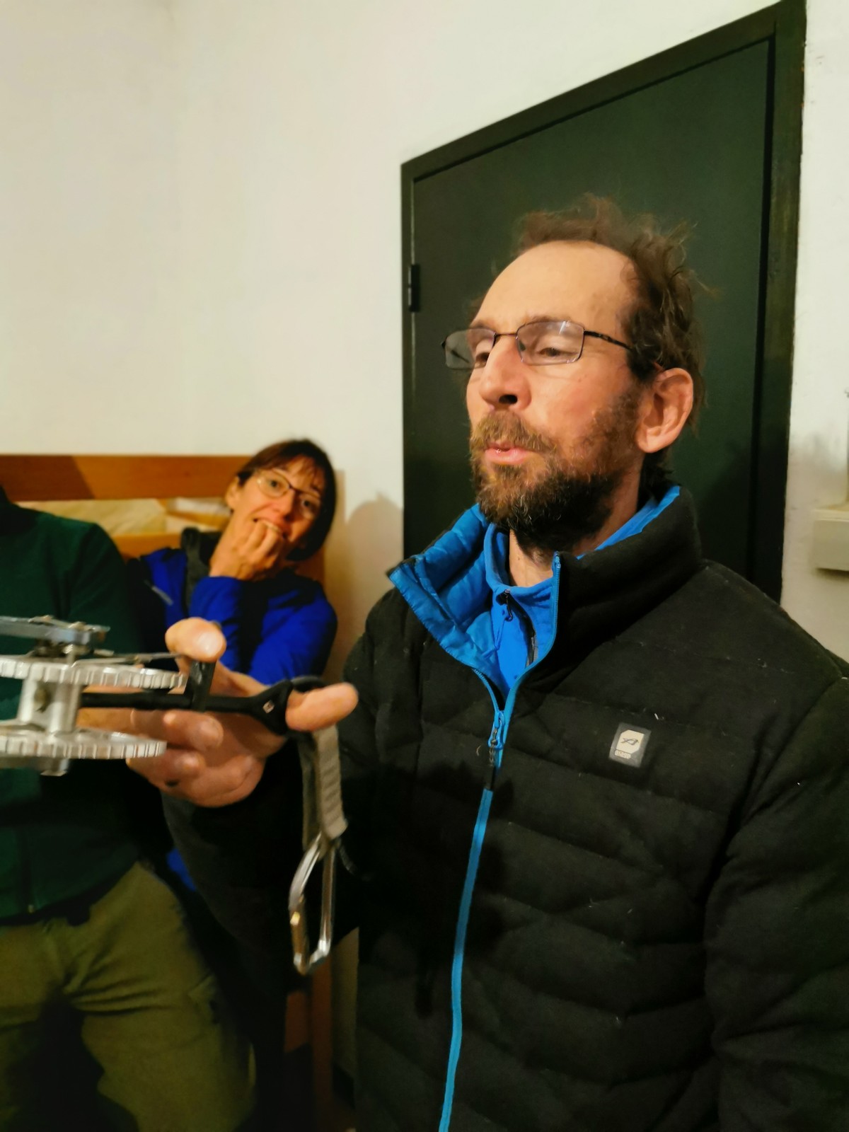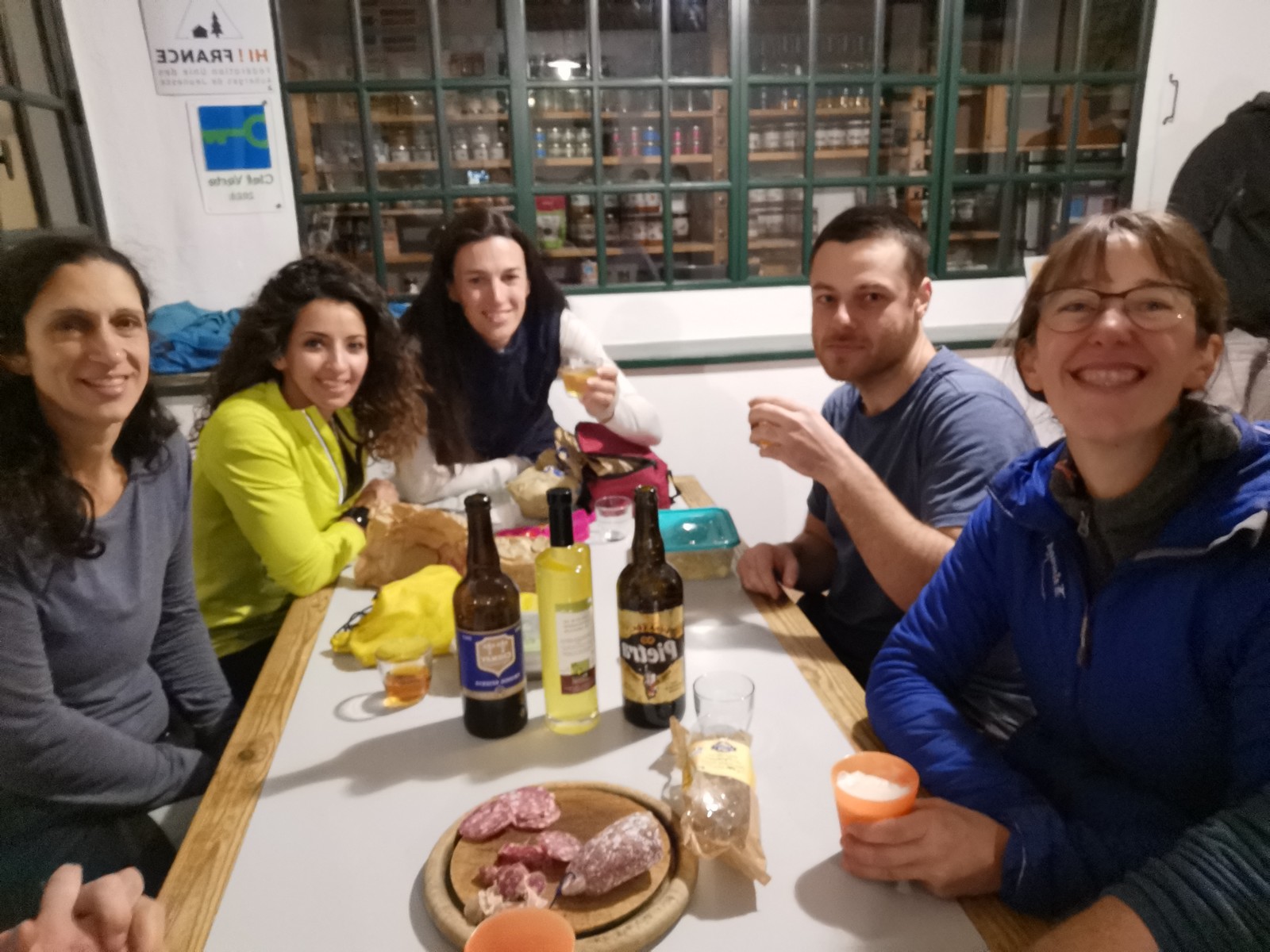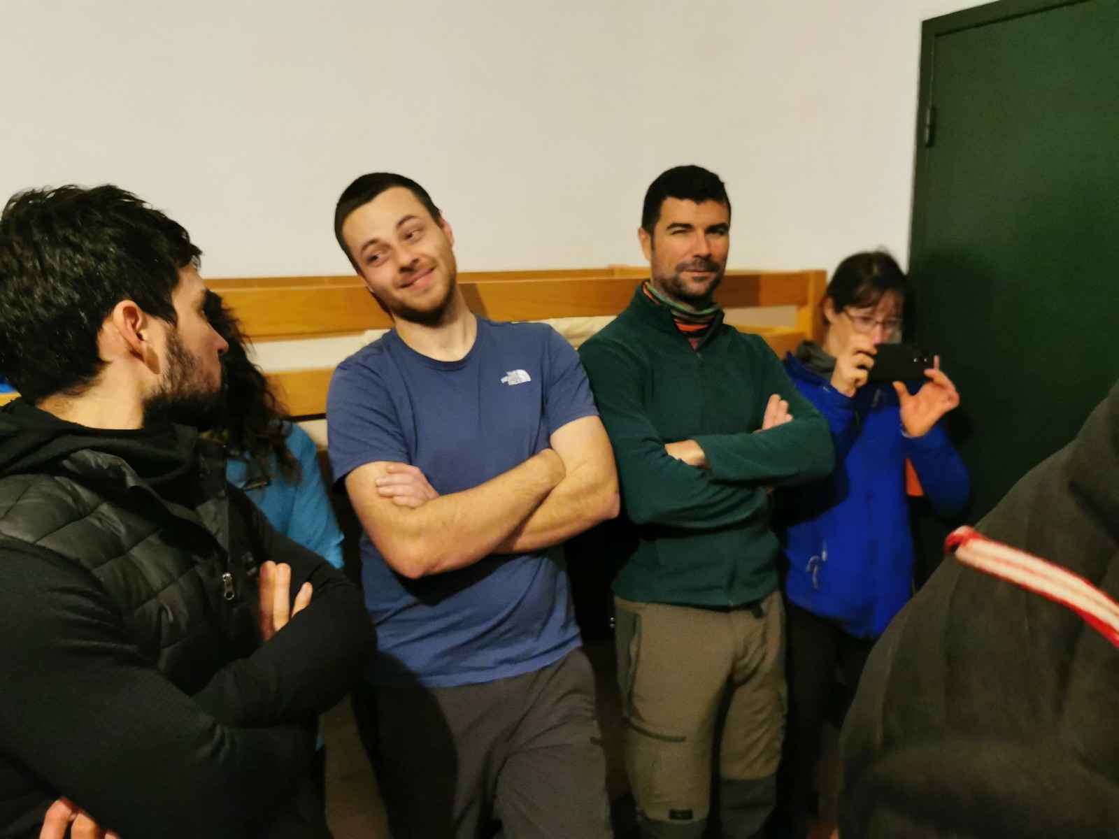 Arrivés à bon port, on s’installe sur les tables au chaud et chacun sort son repas. Pour ma part, je suis très fatigué de ma semaine mais il me reste encore à faire un briefing pour le lendemain. On se retrouve dans le dortoir pour confirmer les cordées et les voies du lendemain. Cette année, petite nouveauté, certains se lancent dans le terrain d’aventure. Comprenez qu’il faut placer soi-même des protections amovibles, ce qui rajoute pas mal de matériel et de l’ambiance ! Pour la plupart, c’est complètement nouveau. Même s’ils seront au final assez peu à grimper en tête dans ce type de voies, il faut bien que j’explique un peu les bases : pose de friends, relais 3 points, j’oublie plein de choses mais je fais au mieux avant l’extinction des feux à 23h. Chacun rejoint son dortoir et son lit pour une nuit plus ou moins bonne.