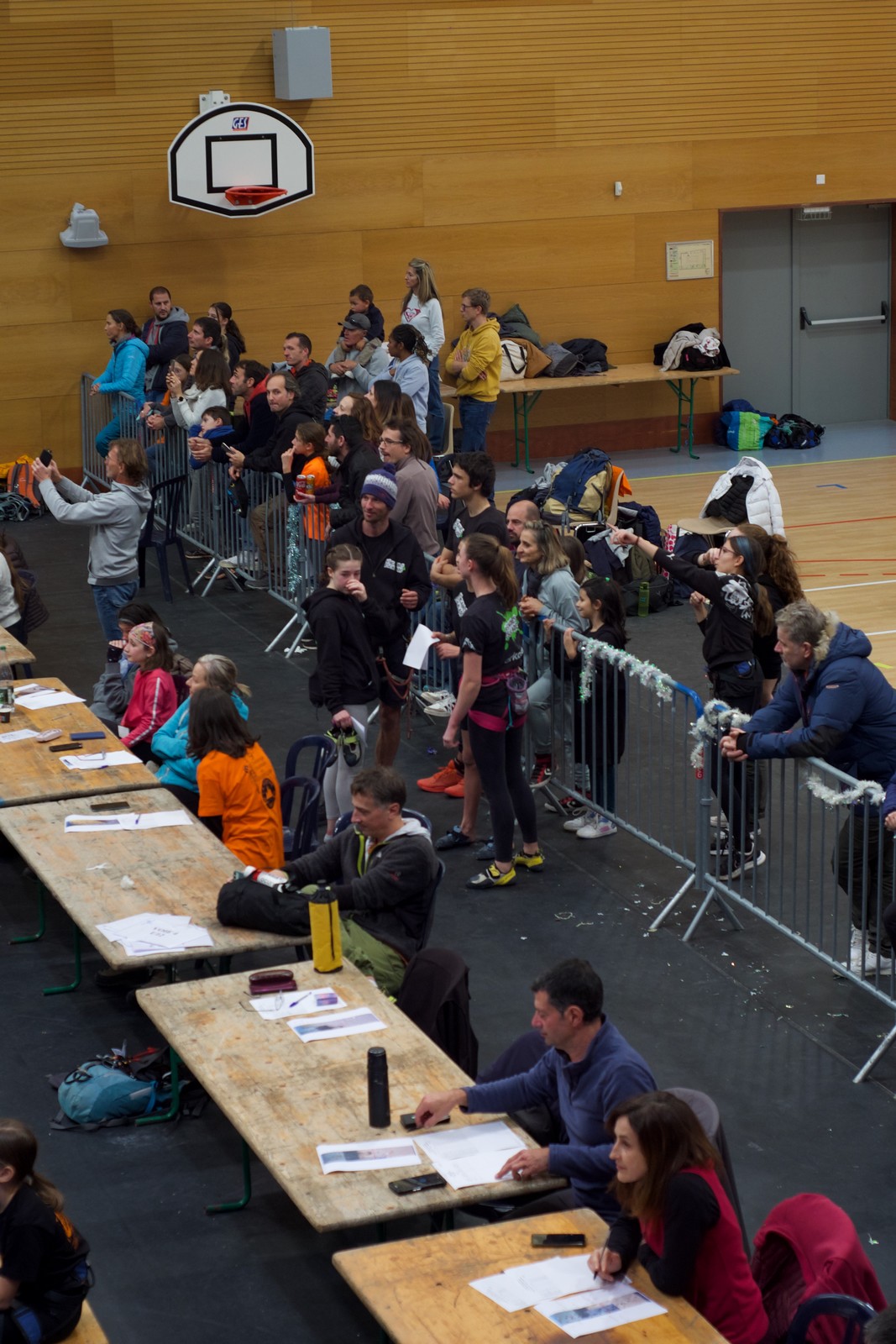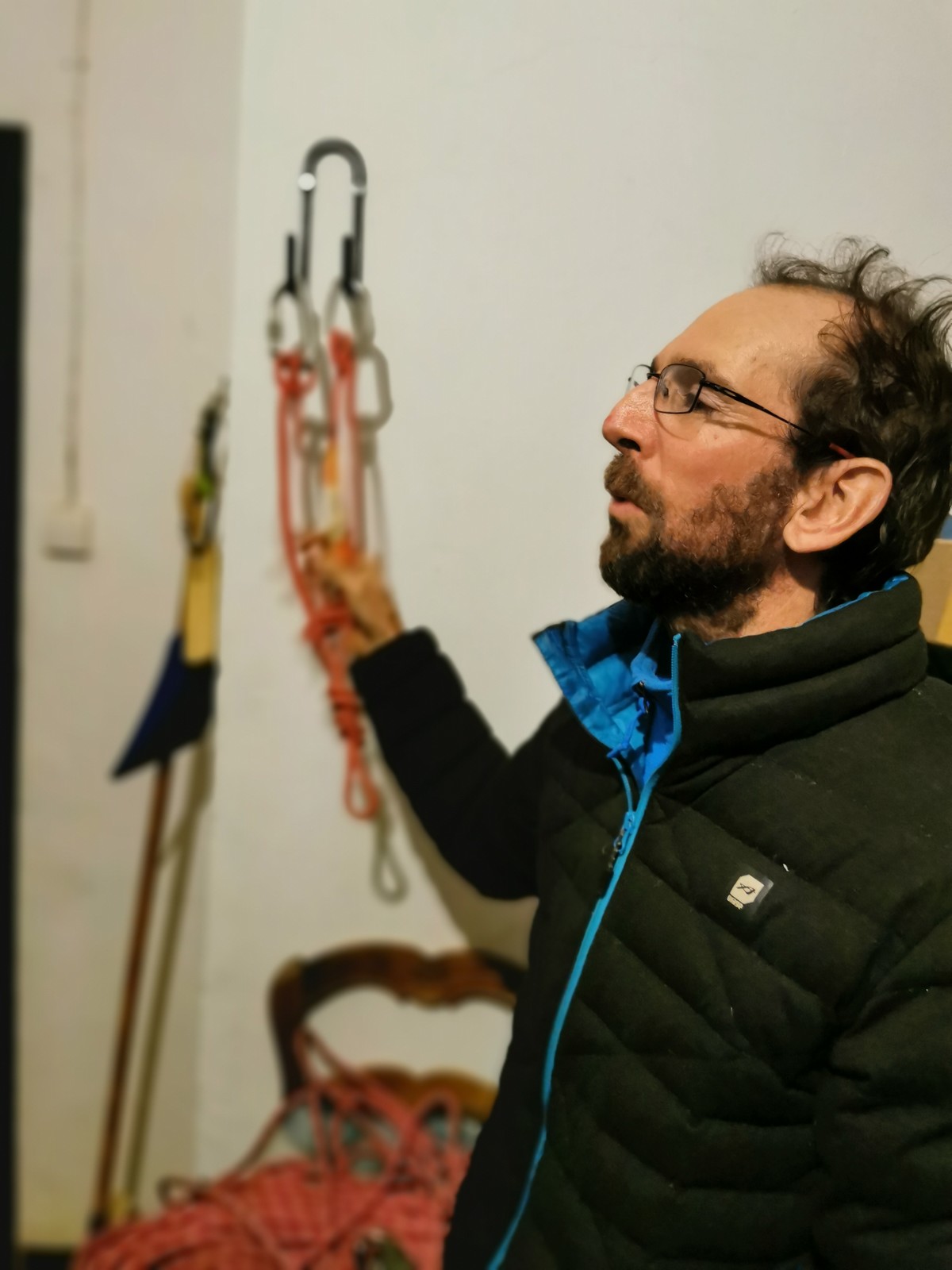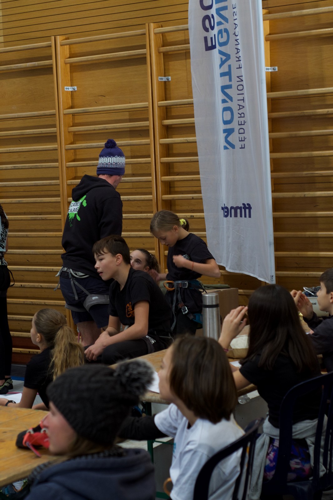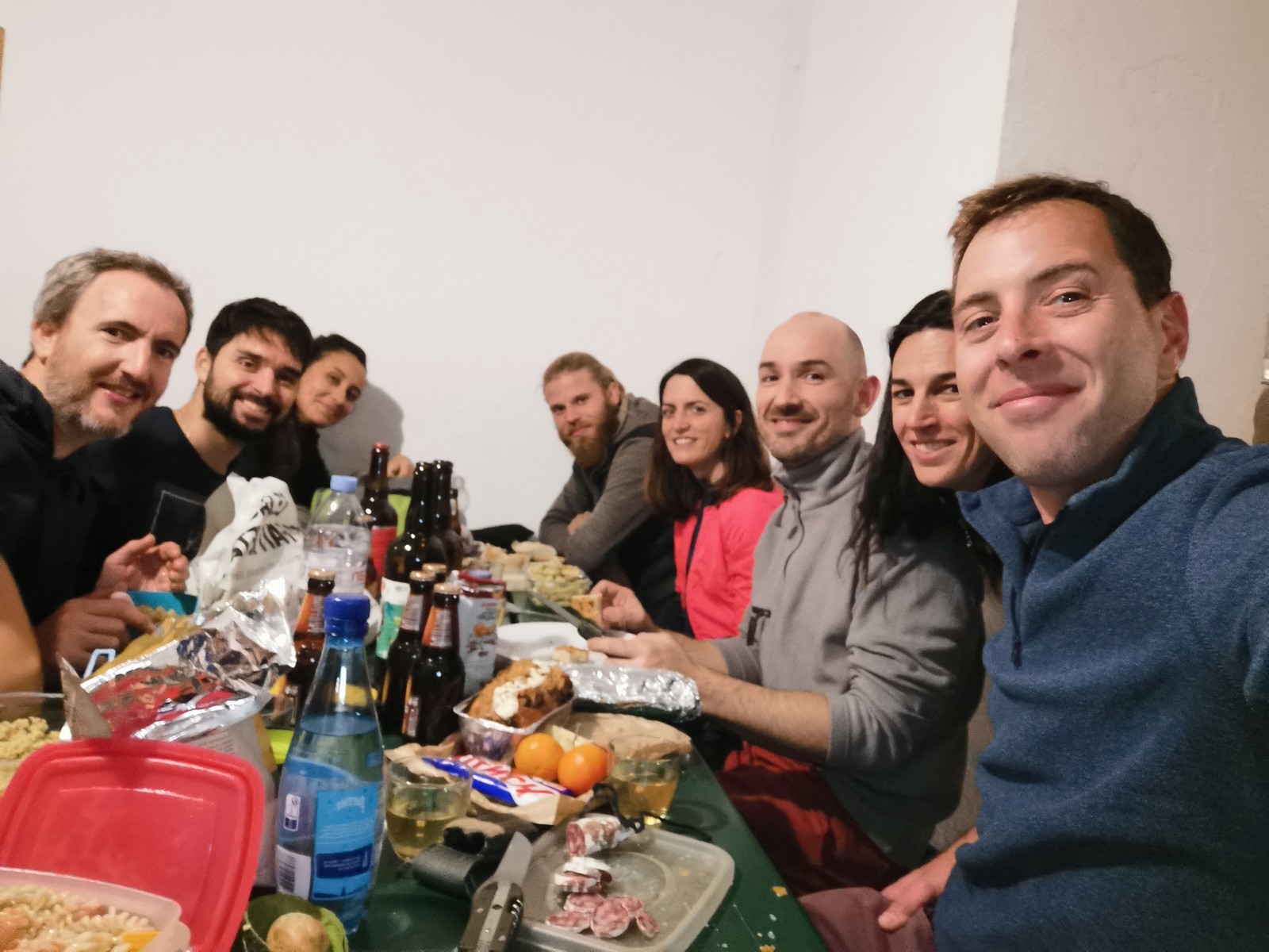 Arrivés à bon port, on s’installe sur les tables au chaud et chacun sort son repas. Pour ma part, je suis très fatigué de ma semaine mais il me reste encore à faire un briefing pour le lendemain. On se retrouve dans le dortoir pour confirmer les cordées et les voies du lendemain. Cette année, petite nouveauté, certains se lancent dans le terrain d’aventure. Comprenez qu’il faut placer soi-même des protections amovibles, ce qui rajoute pas mal de matériel et de l’ambiance ! Pour la plupart, c’est complètement nouveau. Même s’ils seront au final assez peu à grimper en tête dans ce type de voies, il faut bien que j’explique un peu les bases : pose de friends, relais 3 points, j’oublie plein de choses mais je fais au mieux avant l’extinction des feux à 23h. Chacun rejoint son dortoir et son lit pour une nuit plus ou moins bonne.