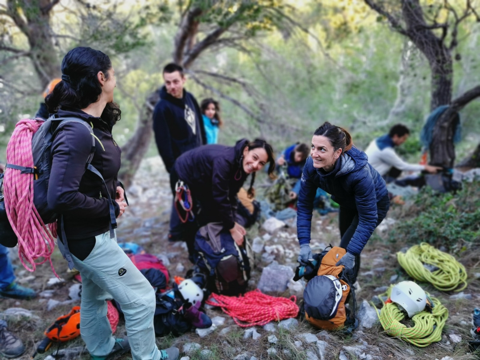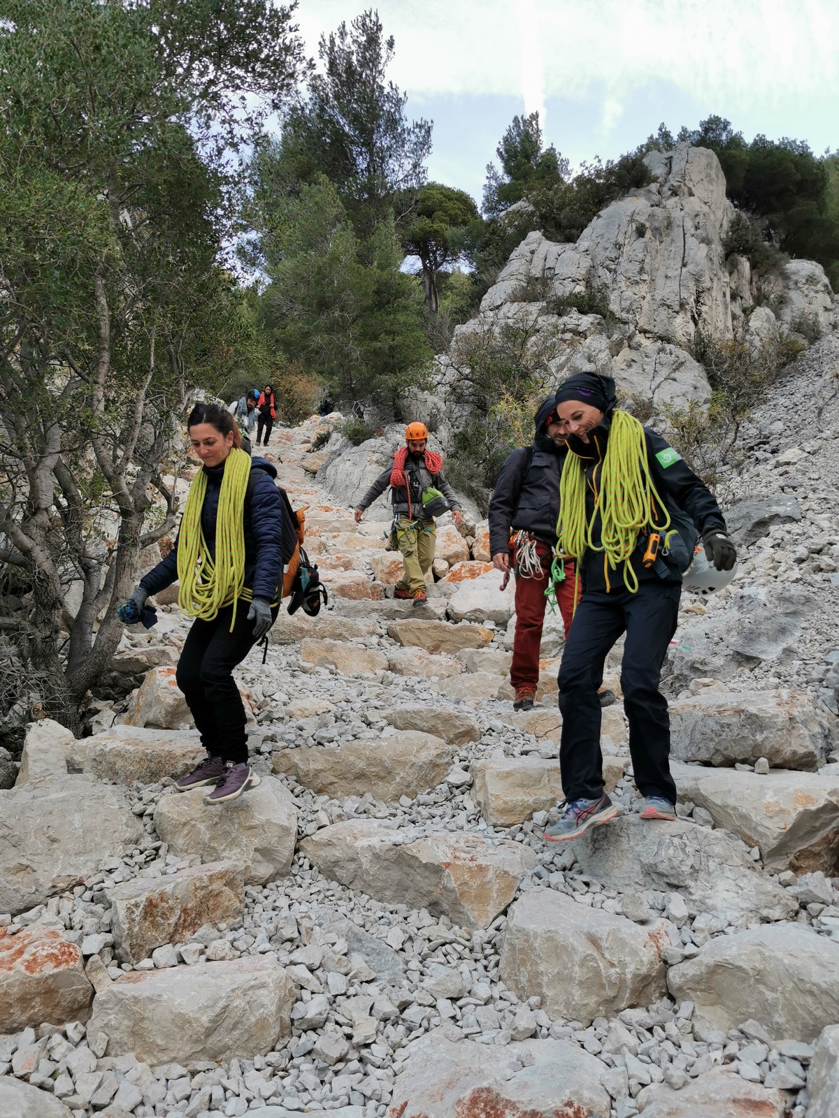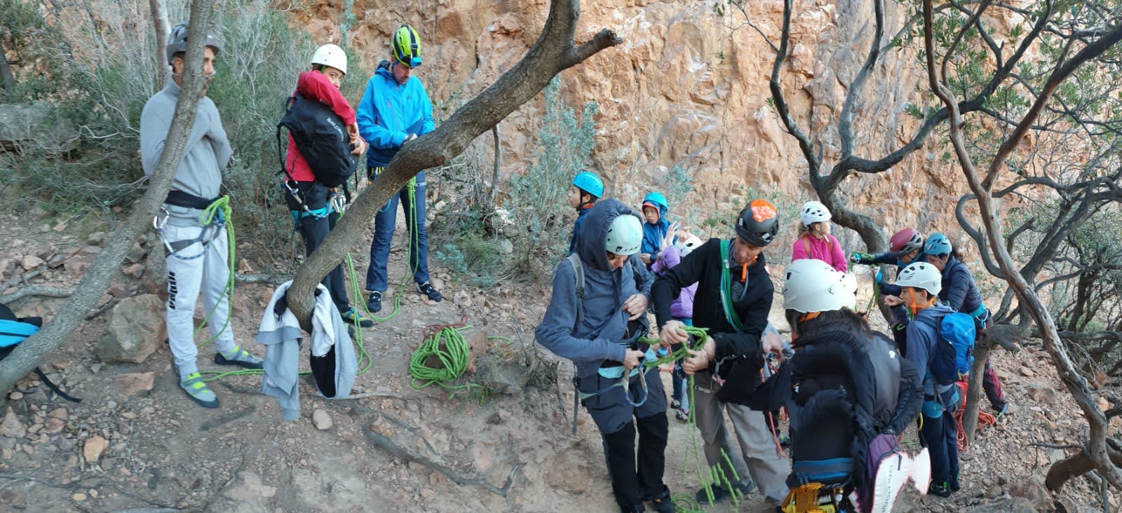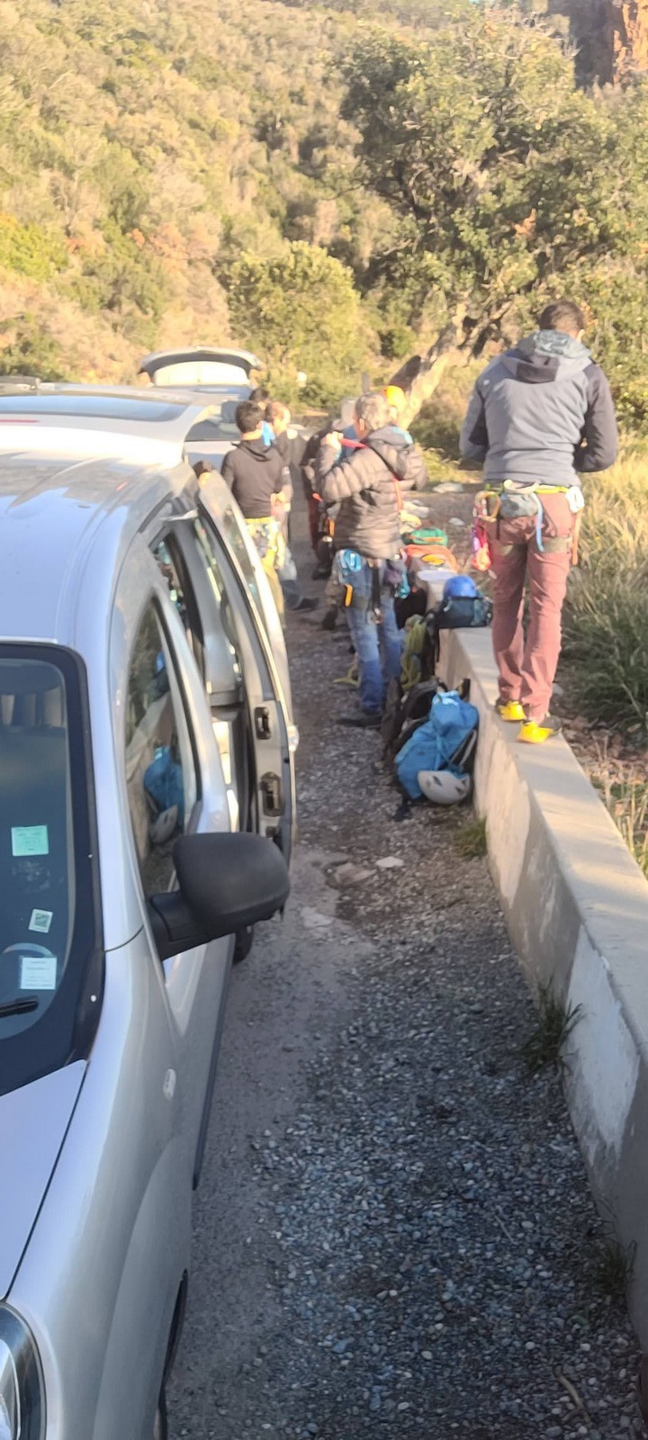 C’est donc à 16 que nous débarquons au parking, Julien étant déjà sur place. Le temps de distribuer le matériel pour les 6 cordées du matin (ce qui n’est pas une mince affaire, mais nous gagnons en efficacité à chaque nouvelle sortie) et les premiers sont déjà partis sur la courte marche d’approche. Je finis par fermer la voiture et rejoins les différentes cordées pour m’assurer que tout le monde a bien trouvé son départ.