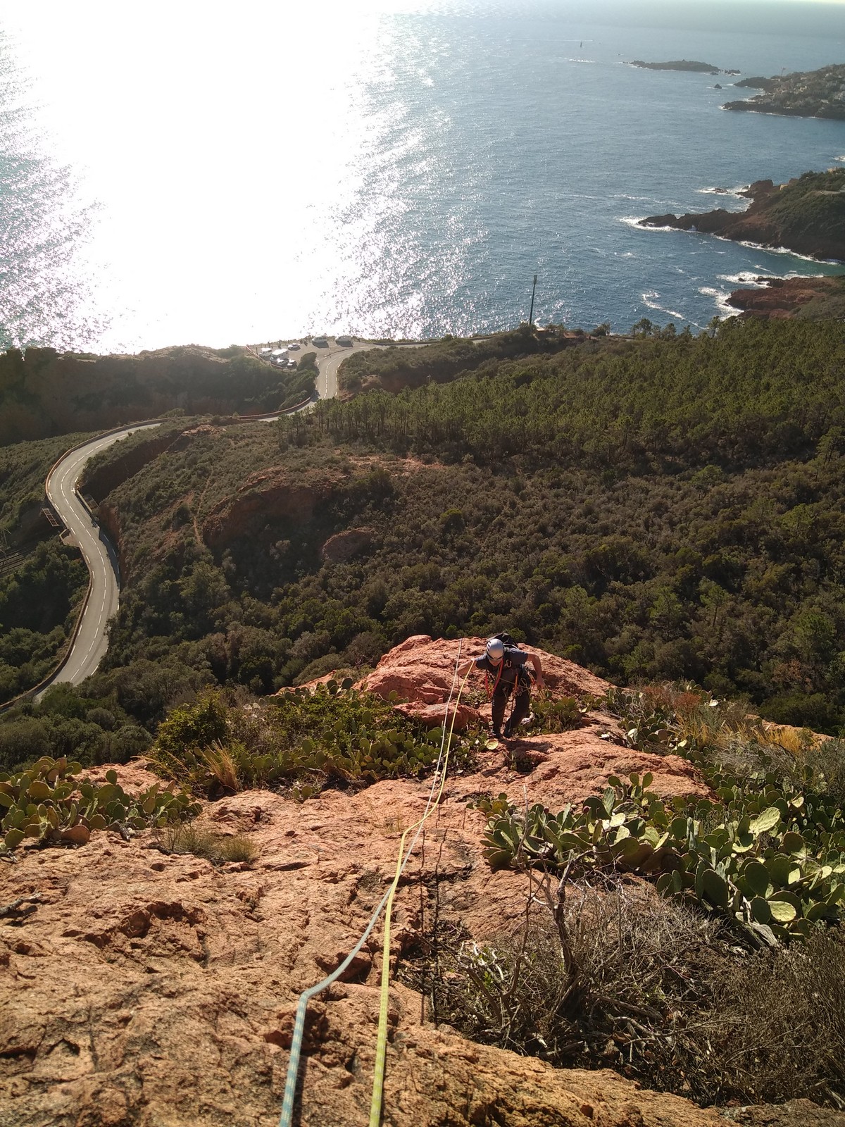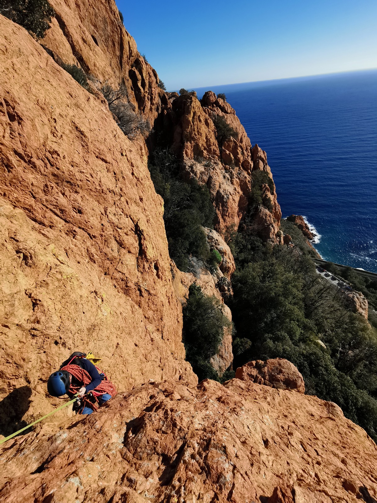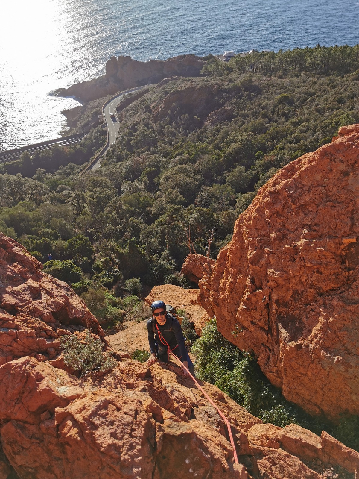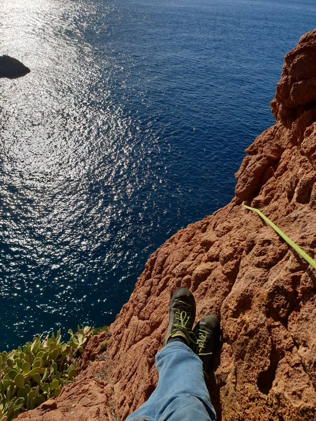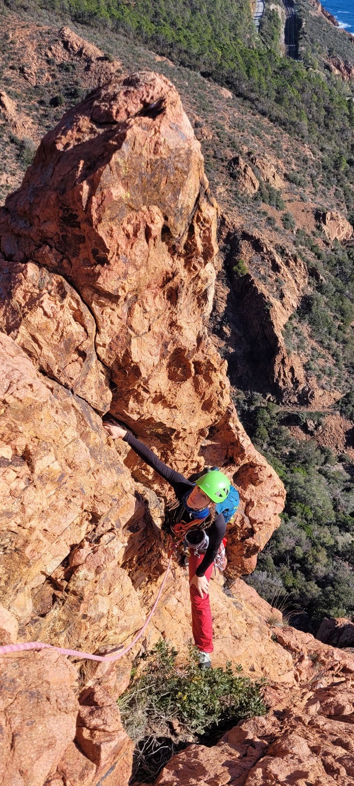Souvent, il n’est pas besoin d’aller bien loin pour se faire plaisir. Pour cette deuxième session du cycle grandes voies, nous sommes allés au rocher St Barthélémy, dans le massif de l’Esterel. Surplombant la route de la corniche d’or, un peu avant Anthéor, ce petit massif offre une orientation principalement au sud, face à la mer, ce qui est un avantage non négligeable un 17 décembre !