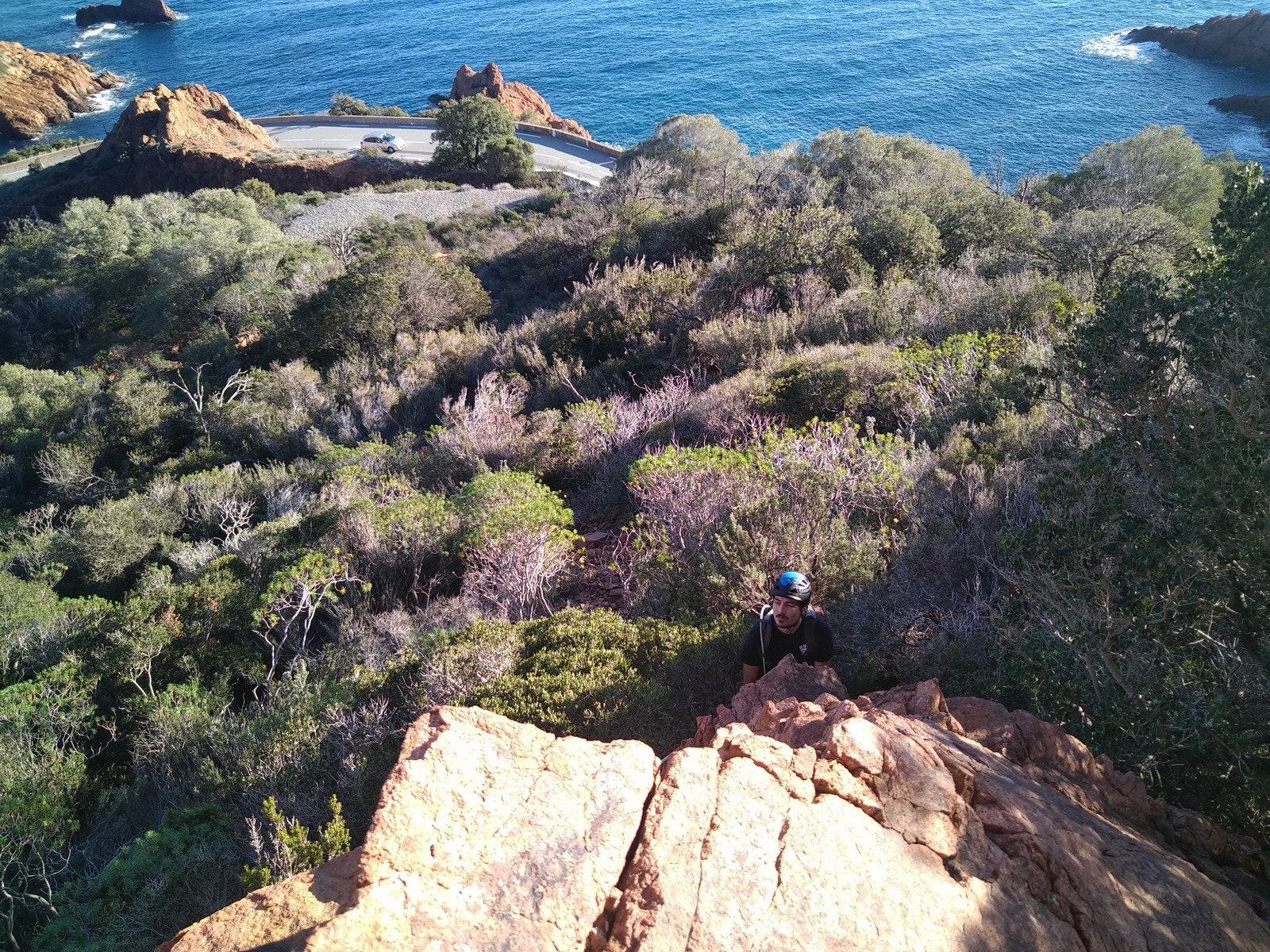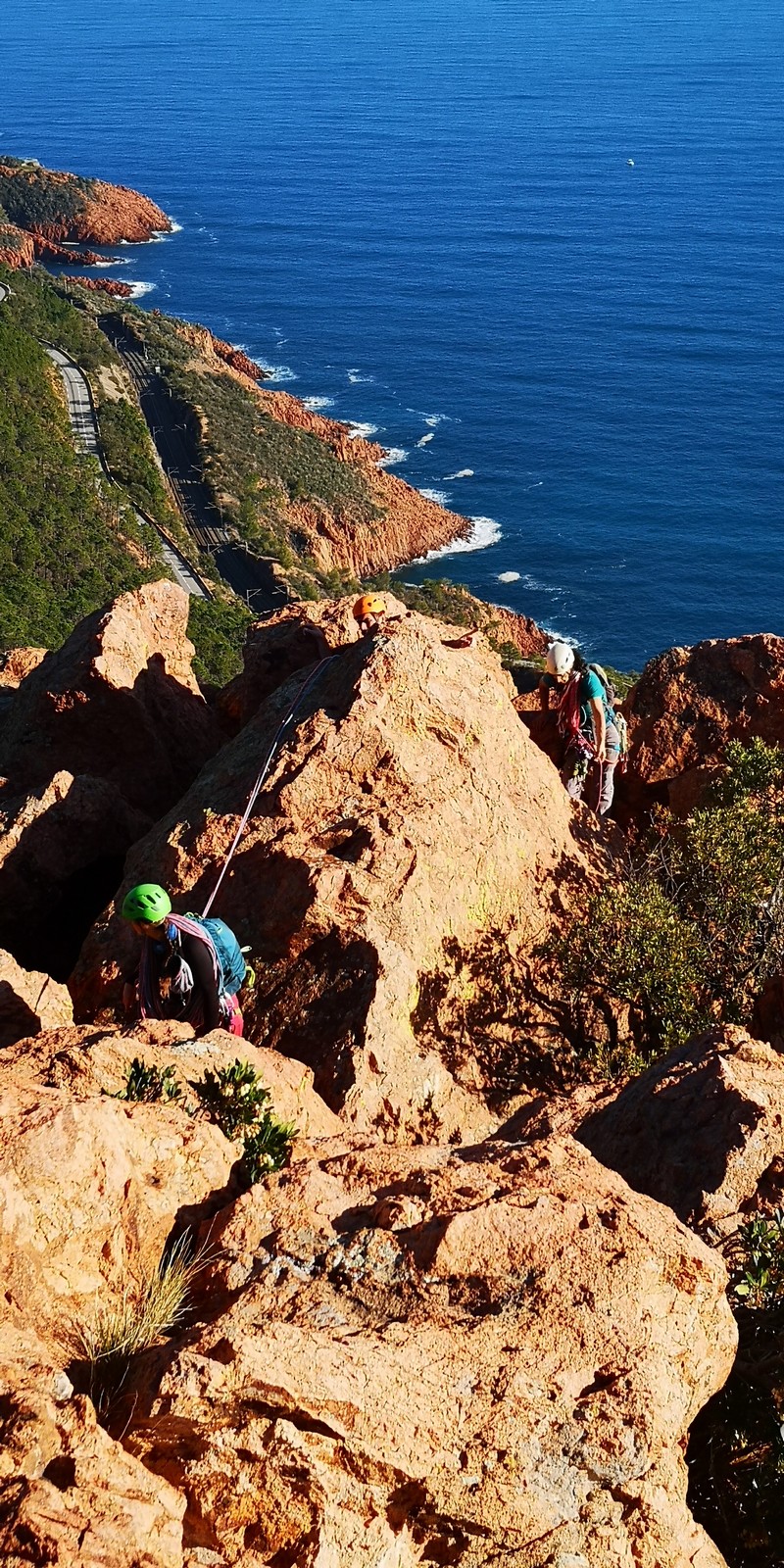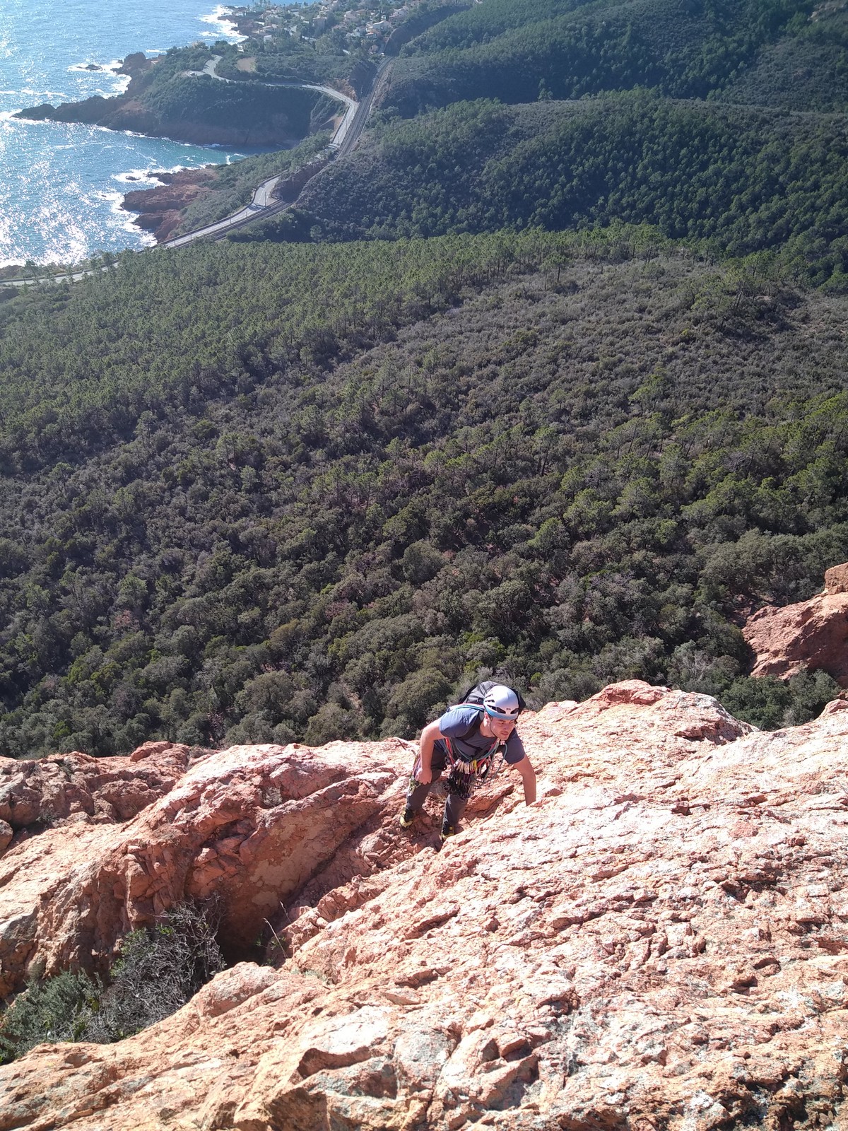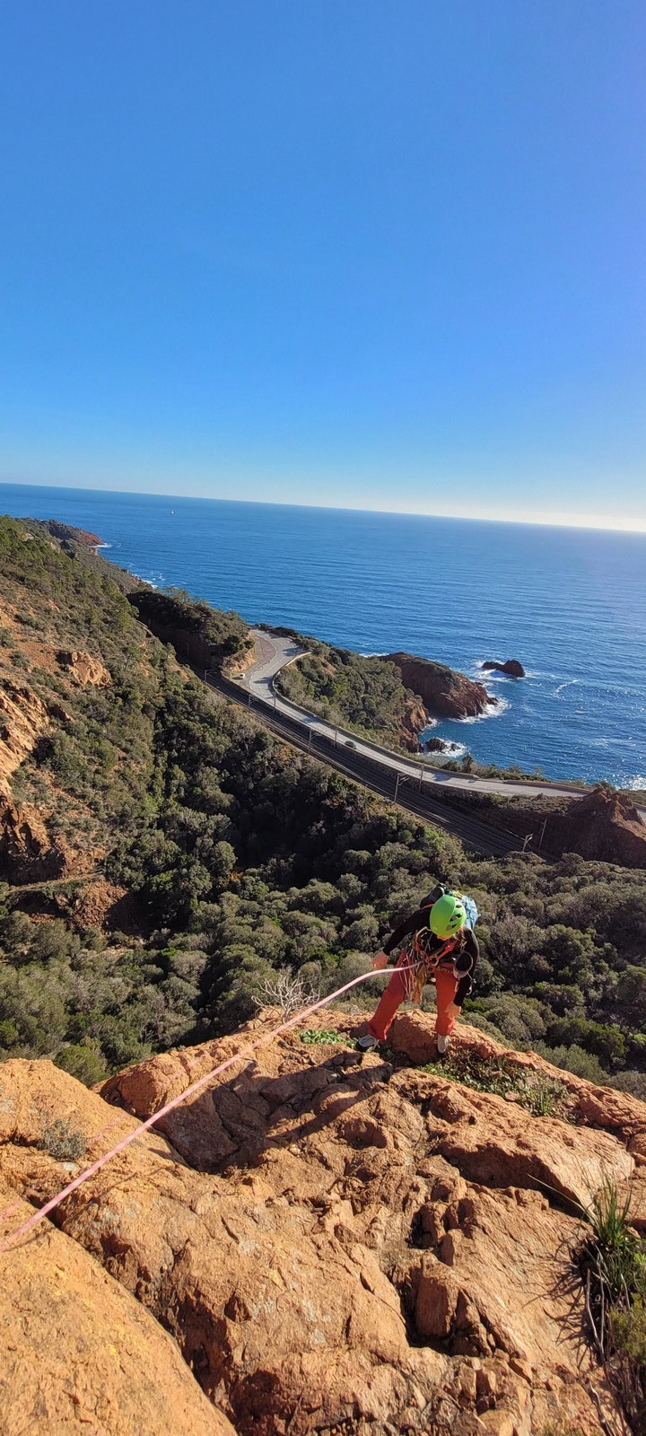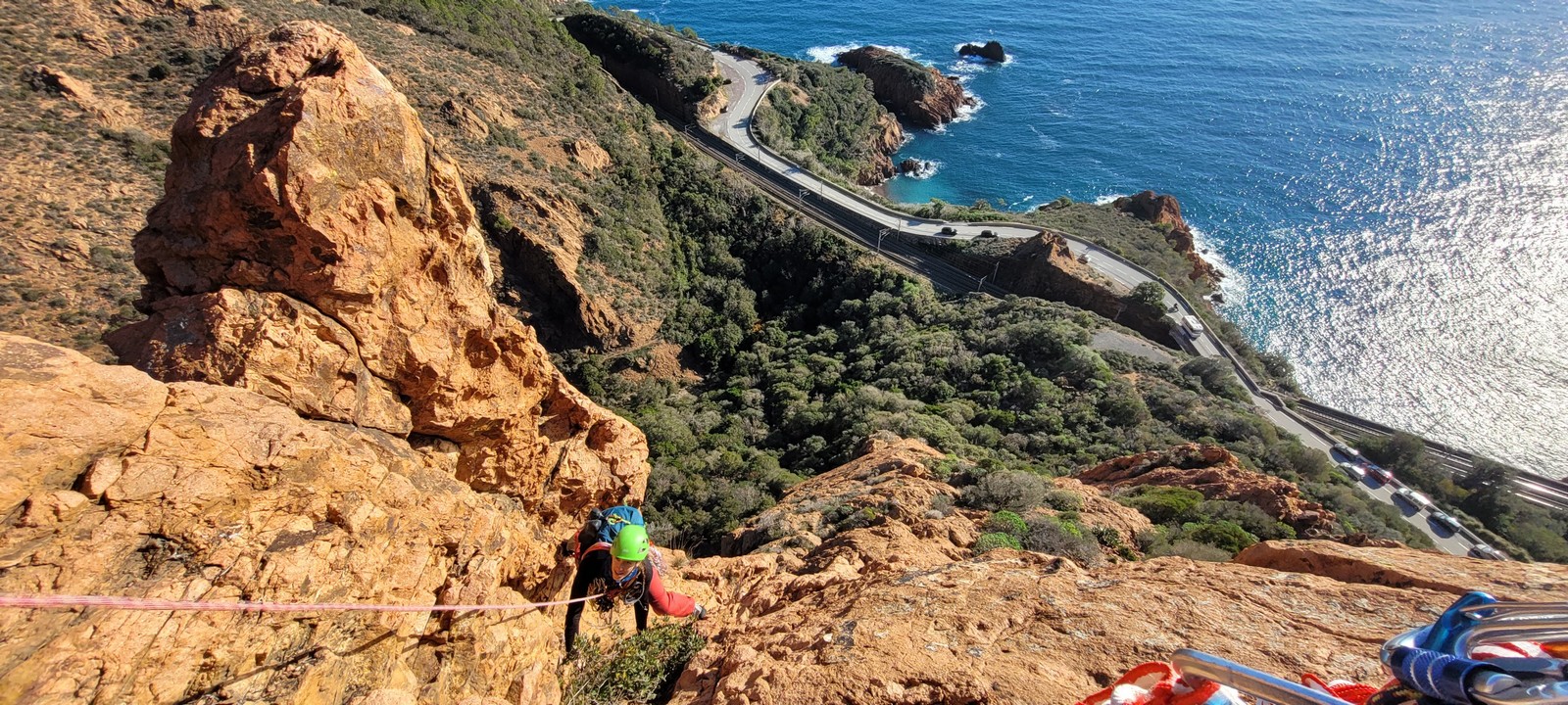Souvent, il n’est pas besoin d’aller bien loin pour se faire plaisir. Pour cette deuxième session du cycle grandes voies, nous sommes allés au rocher St Barthélémy, dans le massif de l’Esterel. Surplombant la route de la corniche d’or, un peu avant Anthéor, ce petit massif offre une orientation principalement au sud, face à la mer, ce qui est un avantage non négligeable un 17 décembre !