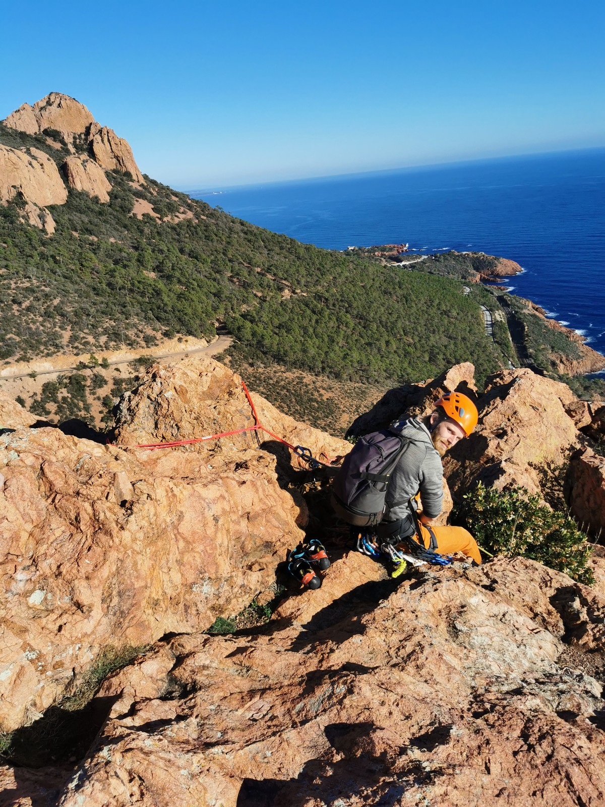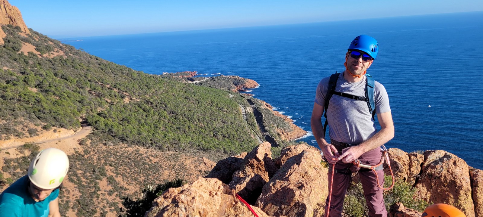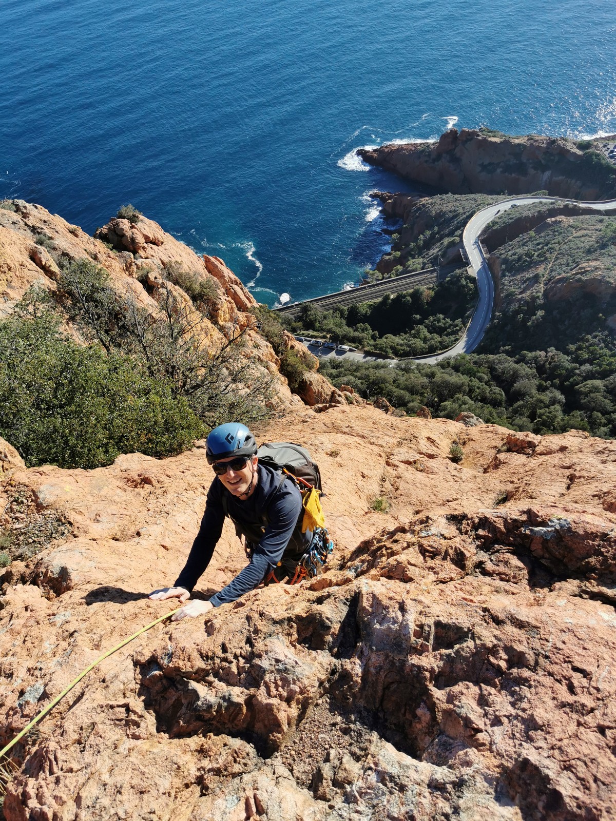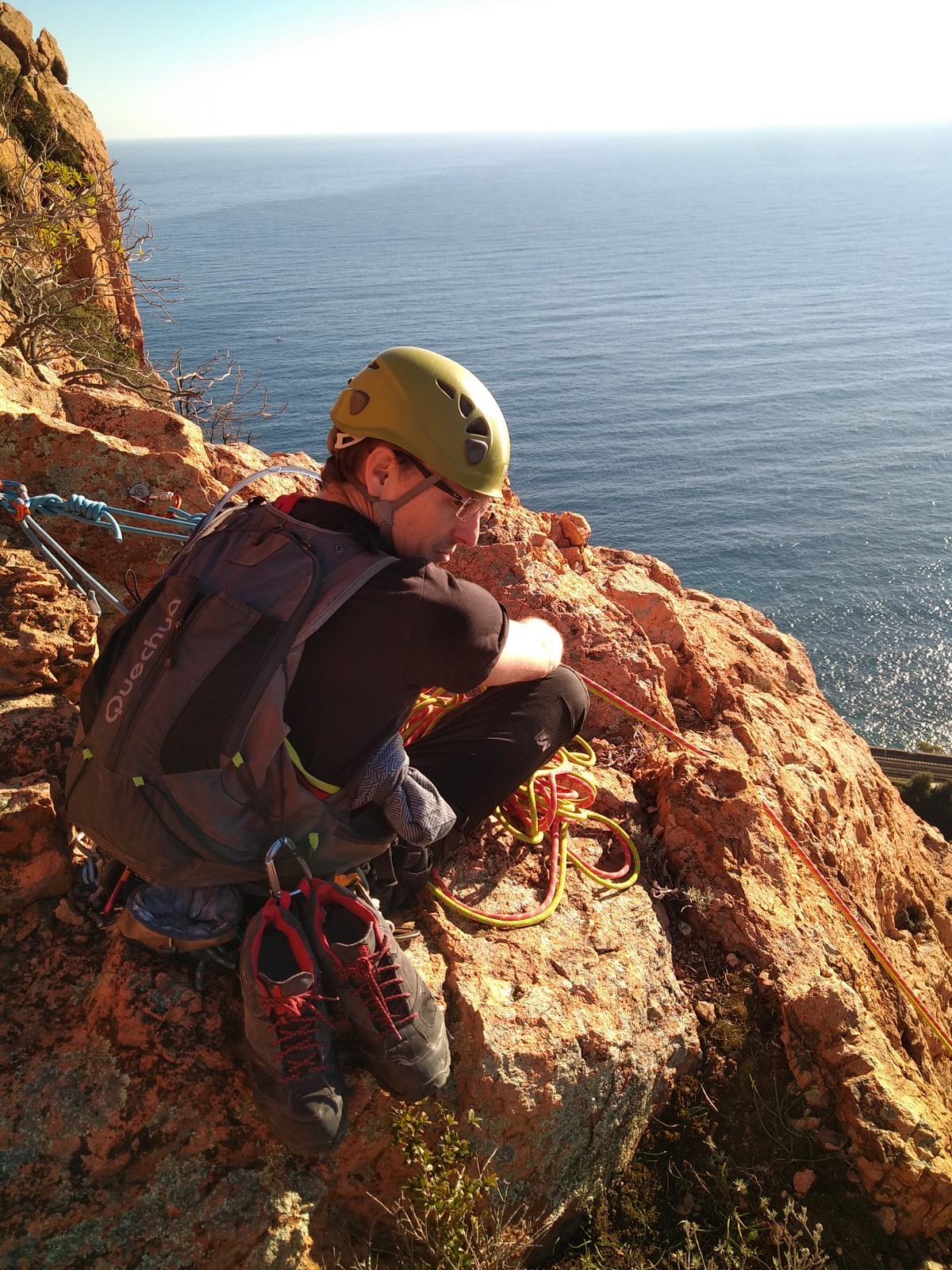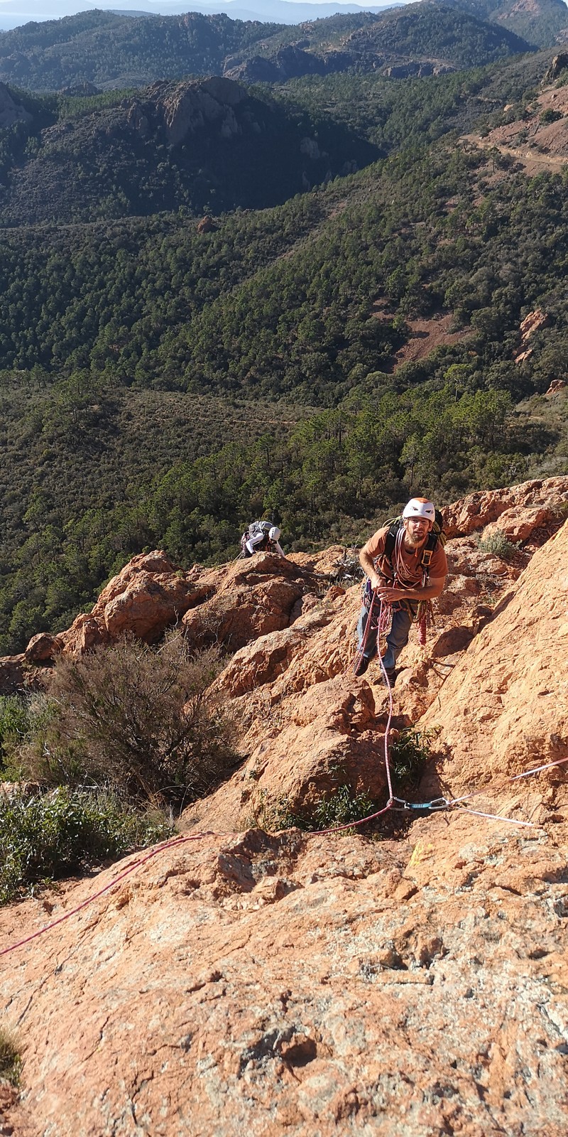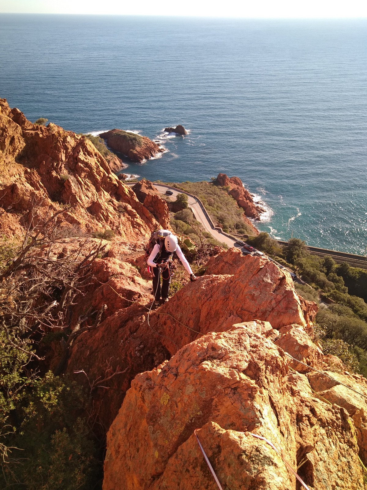 Souvent, il n’est pas besoin d’aller bien loin pour se faire plaisir. Pour cette deuxième session du cycle grandes voies, nous sommes allés au rocher St Barthélémy, dans le massif de l’Esterel. Surplombant la route de la corniche d’or, un peu avant Anthéor, ce petit massif offre une orientation principalement au sud, face à la mer, ce qui est un avantage non négligeable un 17 décembre !