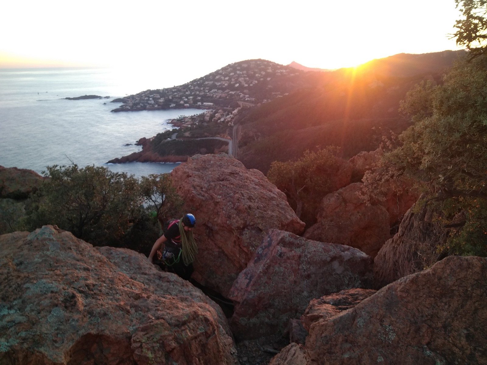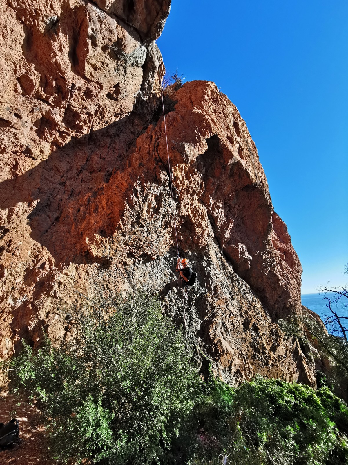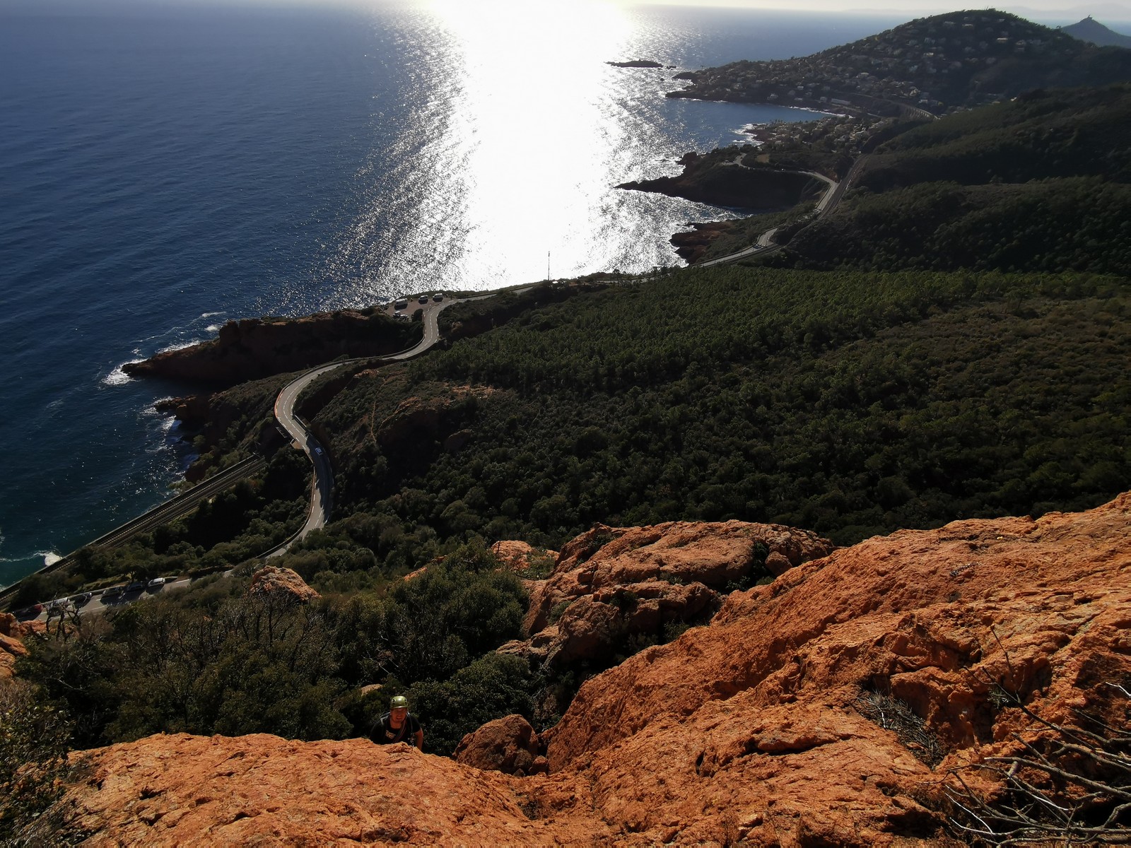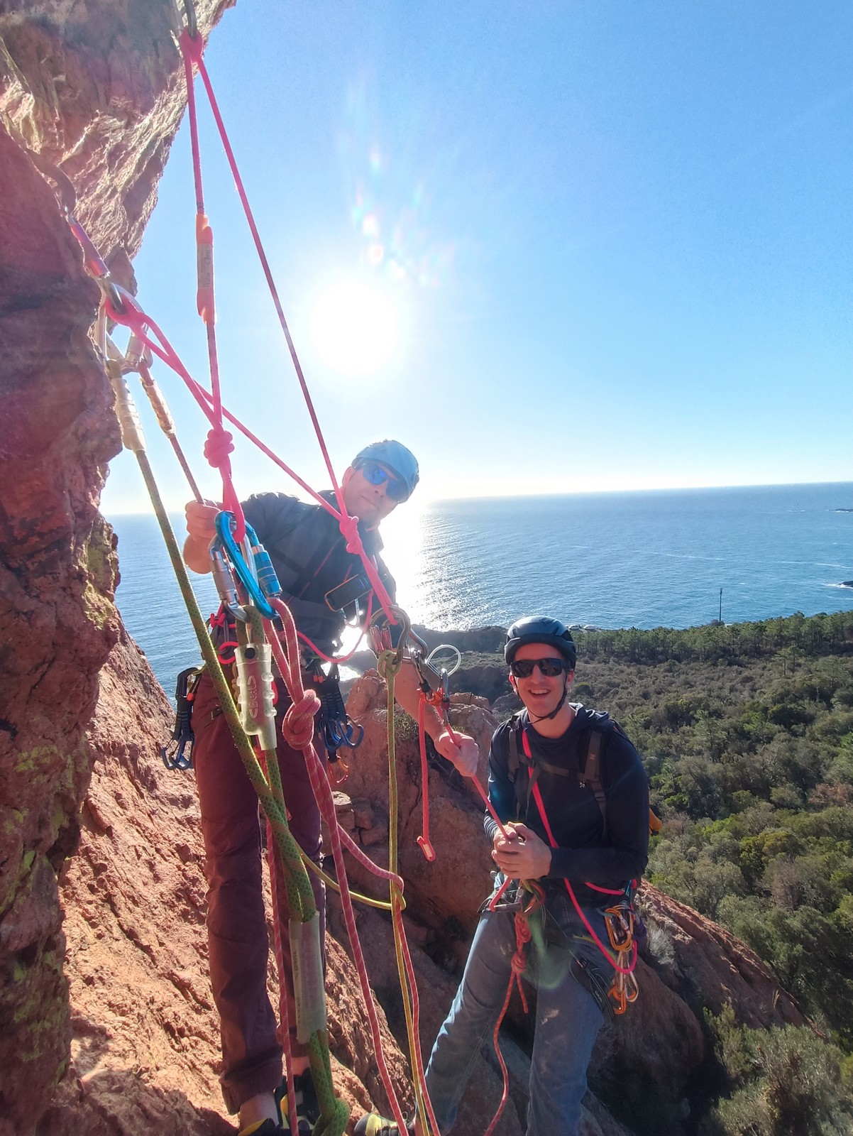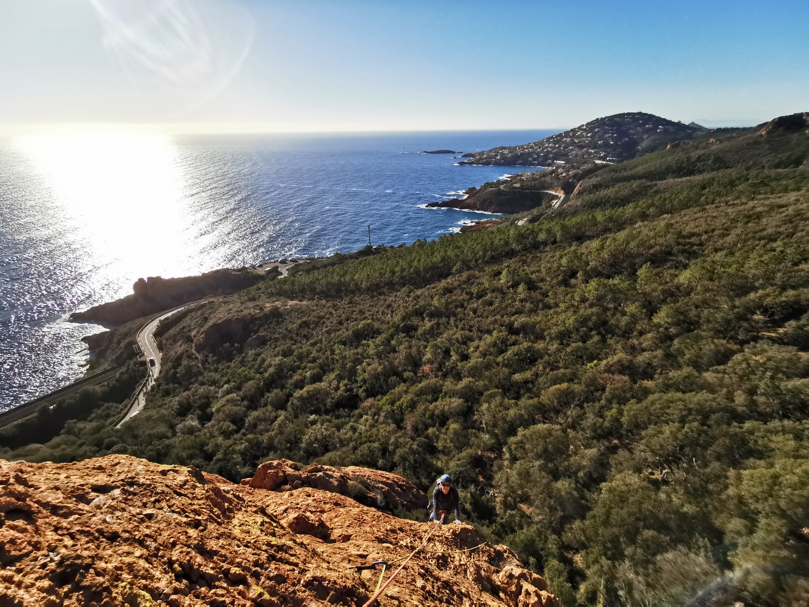 Souvent, il n’est pas besoin d’aller bien loin pour se faire plaisir. Pour cette deuxième session du cycle grandes voies, nous sommes allés au rocher St Barthélémy, dans le massif de l’Esterel. Surplombant la route de la corniche d’or, un peu avant Anthéor, ce petit massif offre une orientation principalement au sud, face à la mer, ce qui est un avantage non négligeable un 17 décembre !