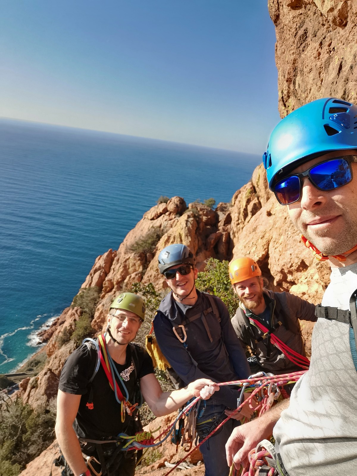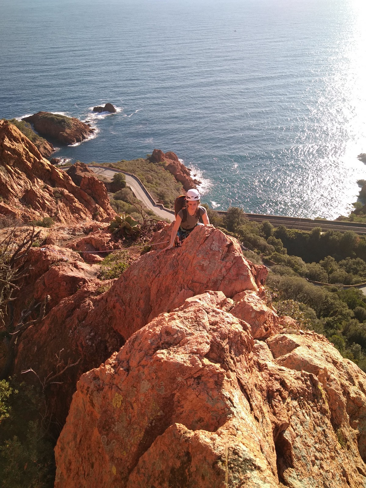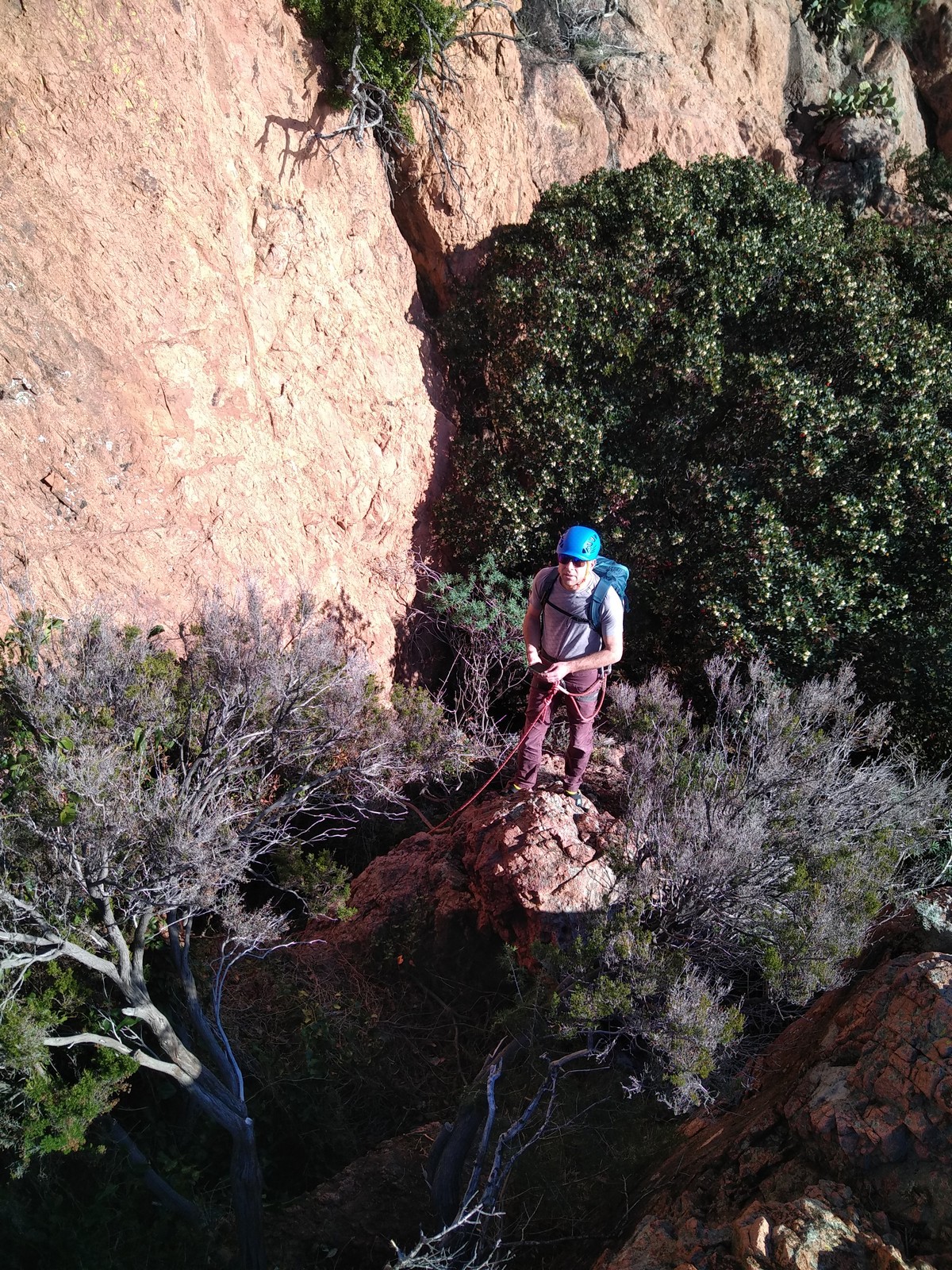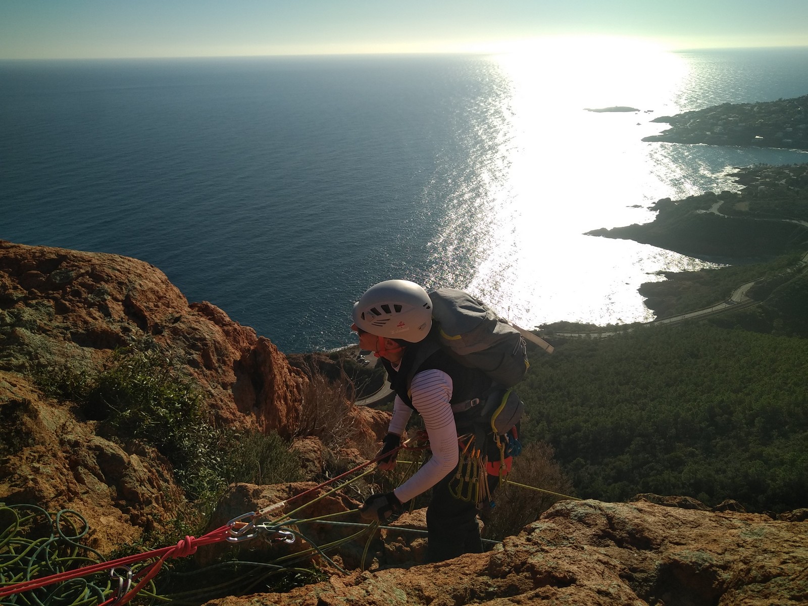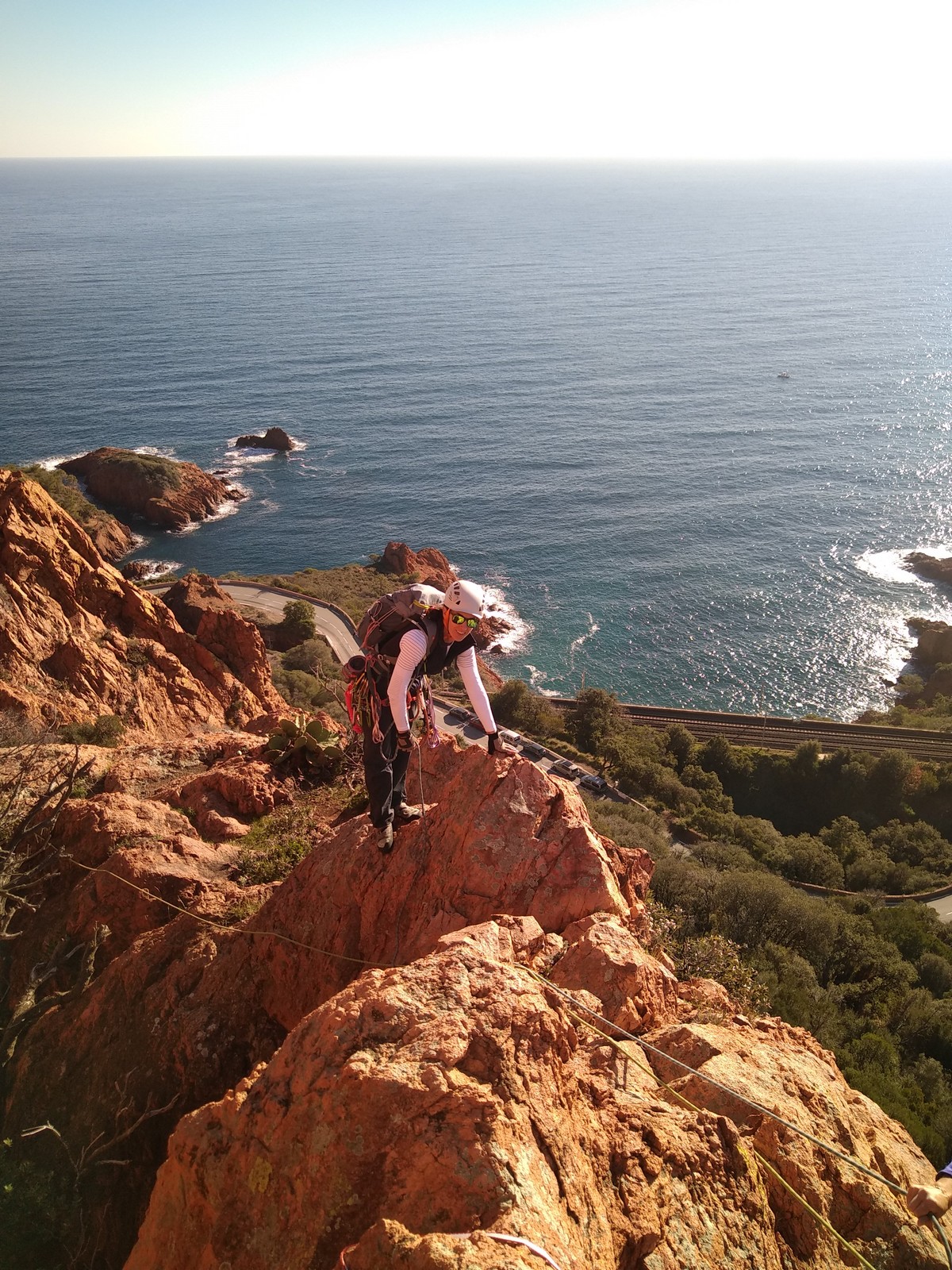 Souvent, il n’est pas besoin d’aller bien loin pour se faire plaisir. Pour cette deuxième session du cycle grandes voies, nous sommes allés au rocher St Barthélémy, dans le massif de l’Esterel. Surplombant la route de la corniche d’or, un peu avant Anthéor, ce petit massif offre une orientation principalement au sud, face à la mer, ce qui est un avantage non négligeable un 17 décembre !