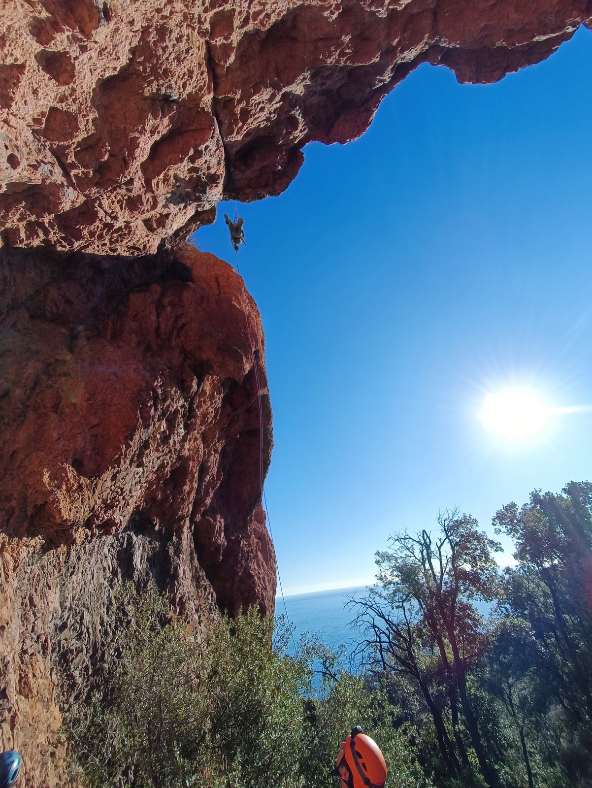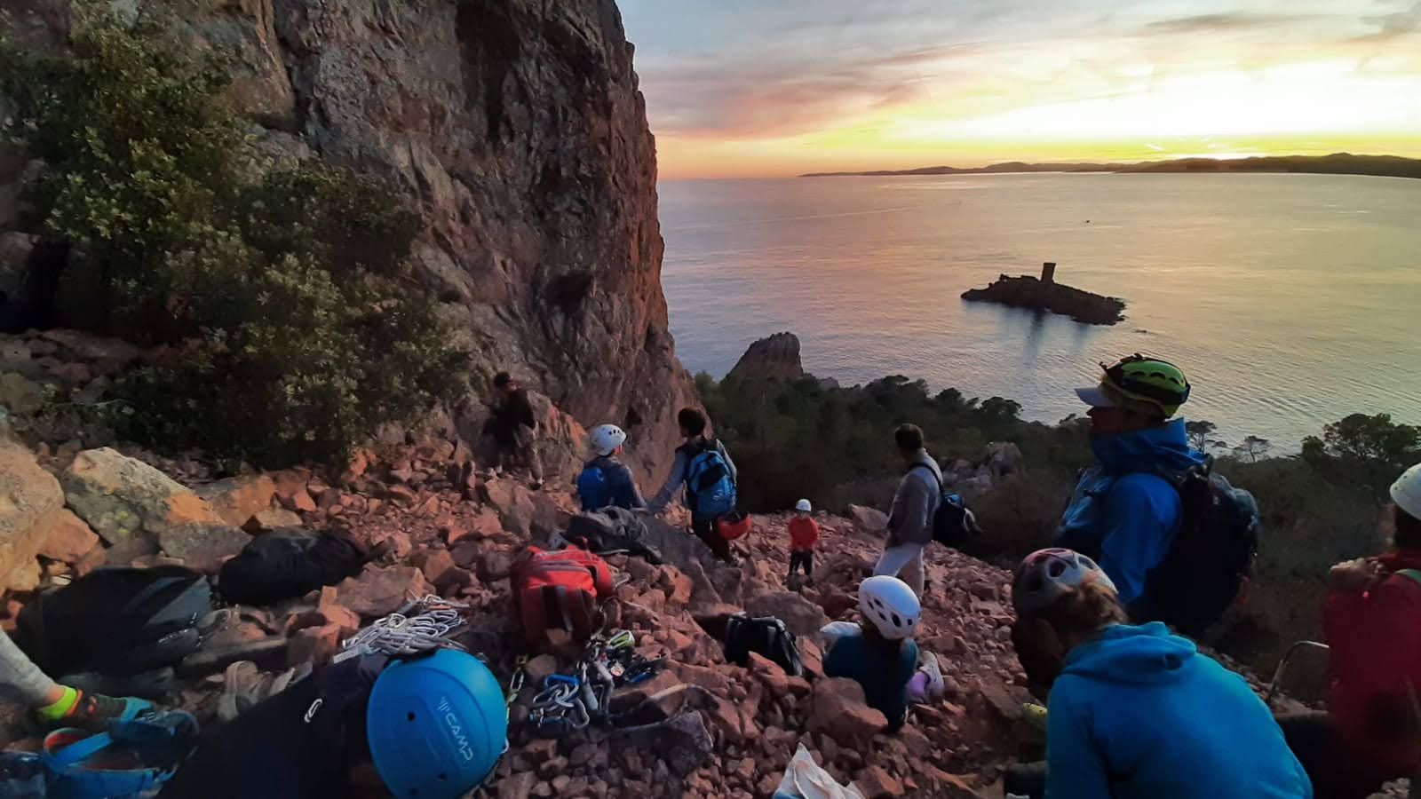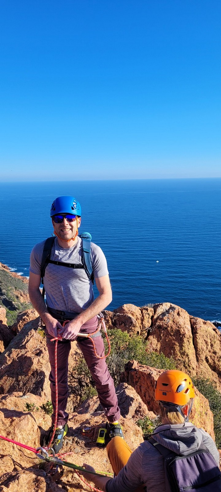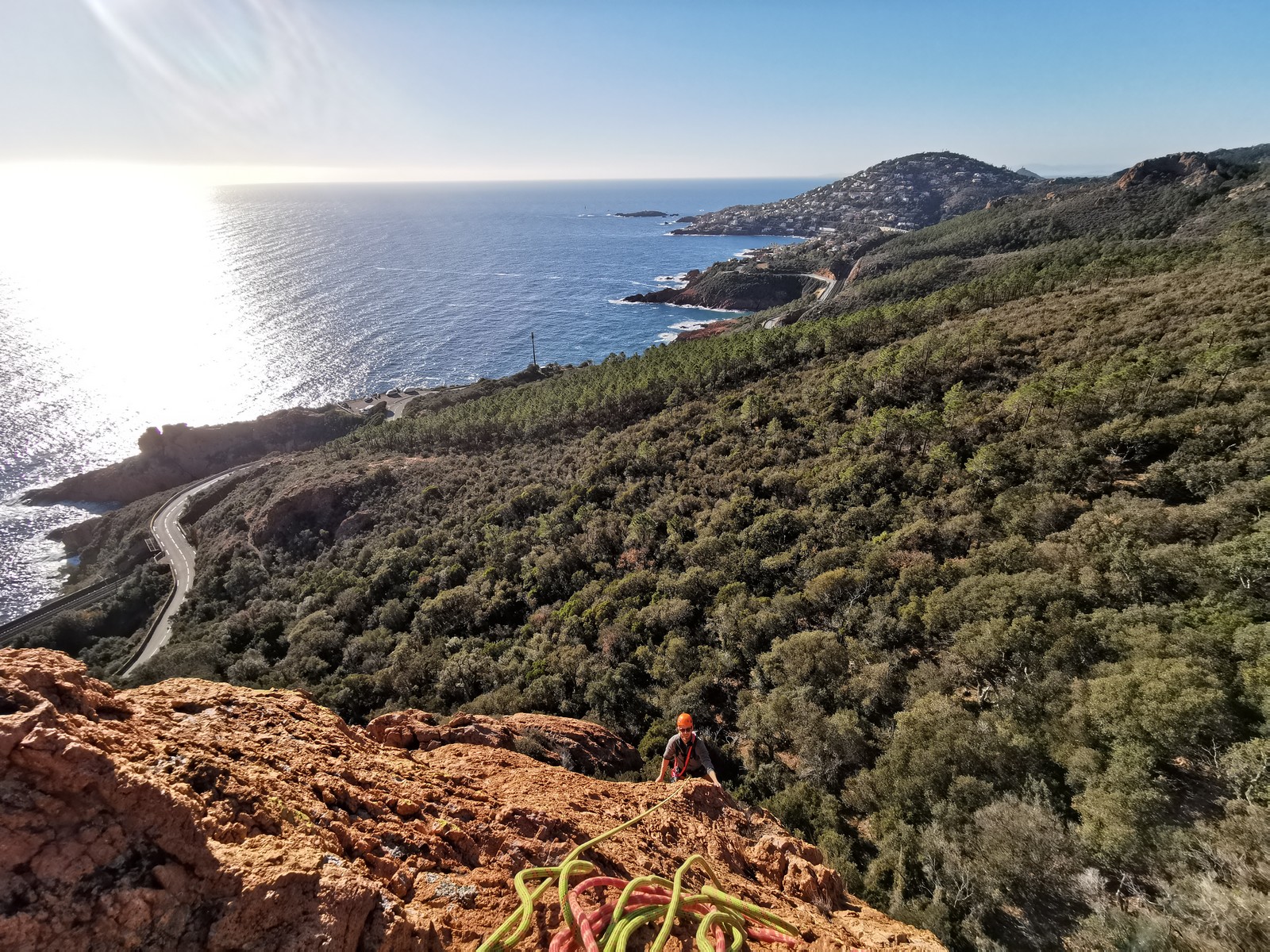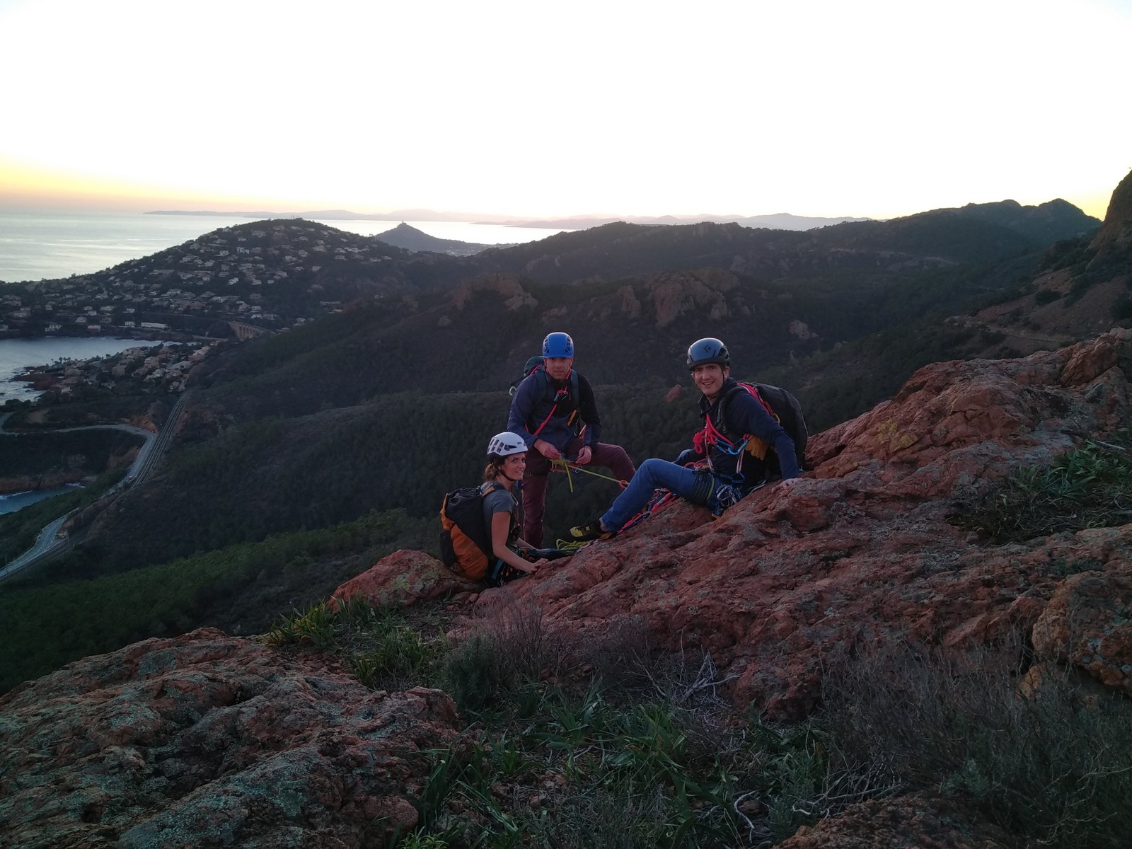 Souvent, il n’est pas besoin d’aller bien loin pour se faire plaisir. Pour cette deuxième session du cycle grandes voies, nous sommes allés au rocher St Barthélémy, dans le massif de l’Esterel. Surplombant la route de la corniche d’or, un peu avant Anthéor, ce petit massif offre une orientation principalement au sud, face à la mer, ce qui est un avantage non négligeable un 17 décembre !