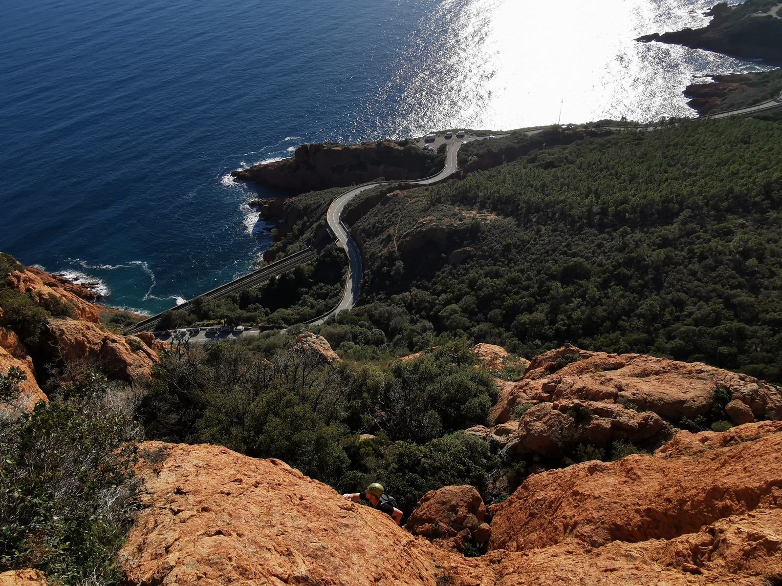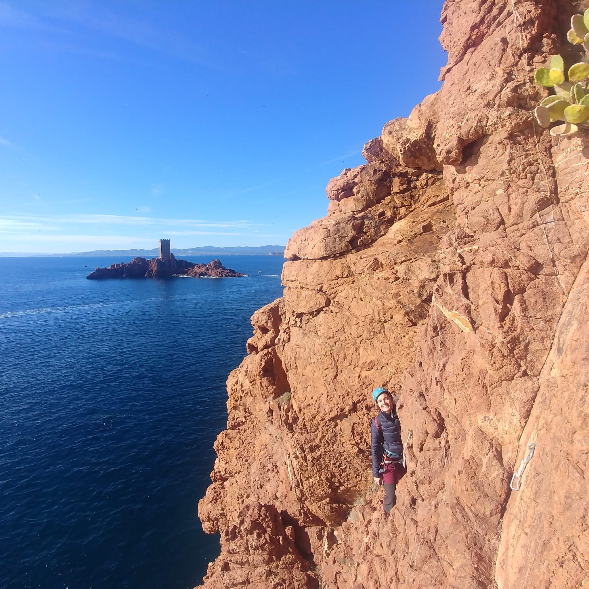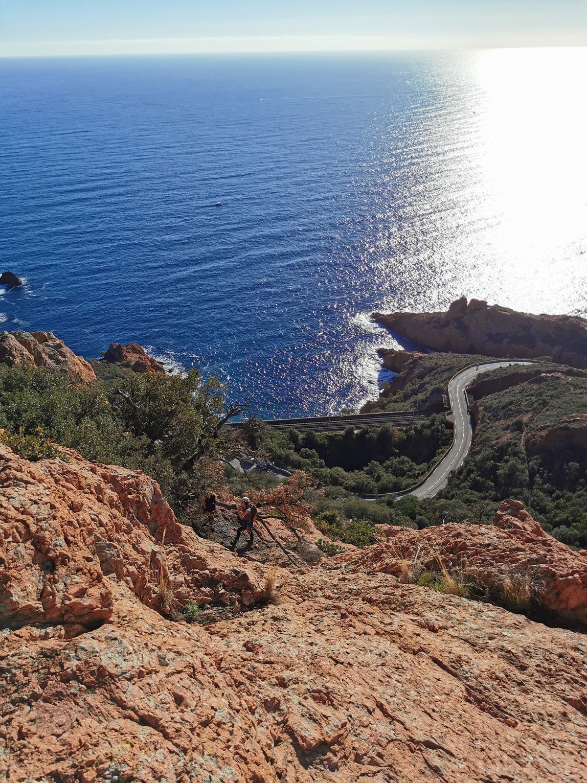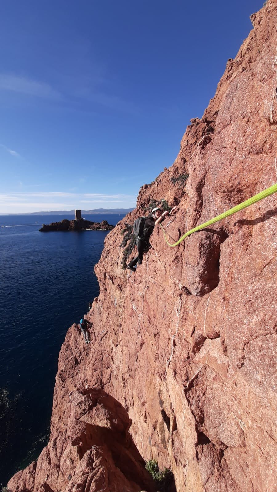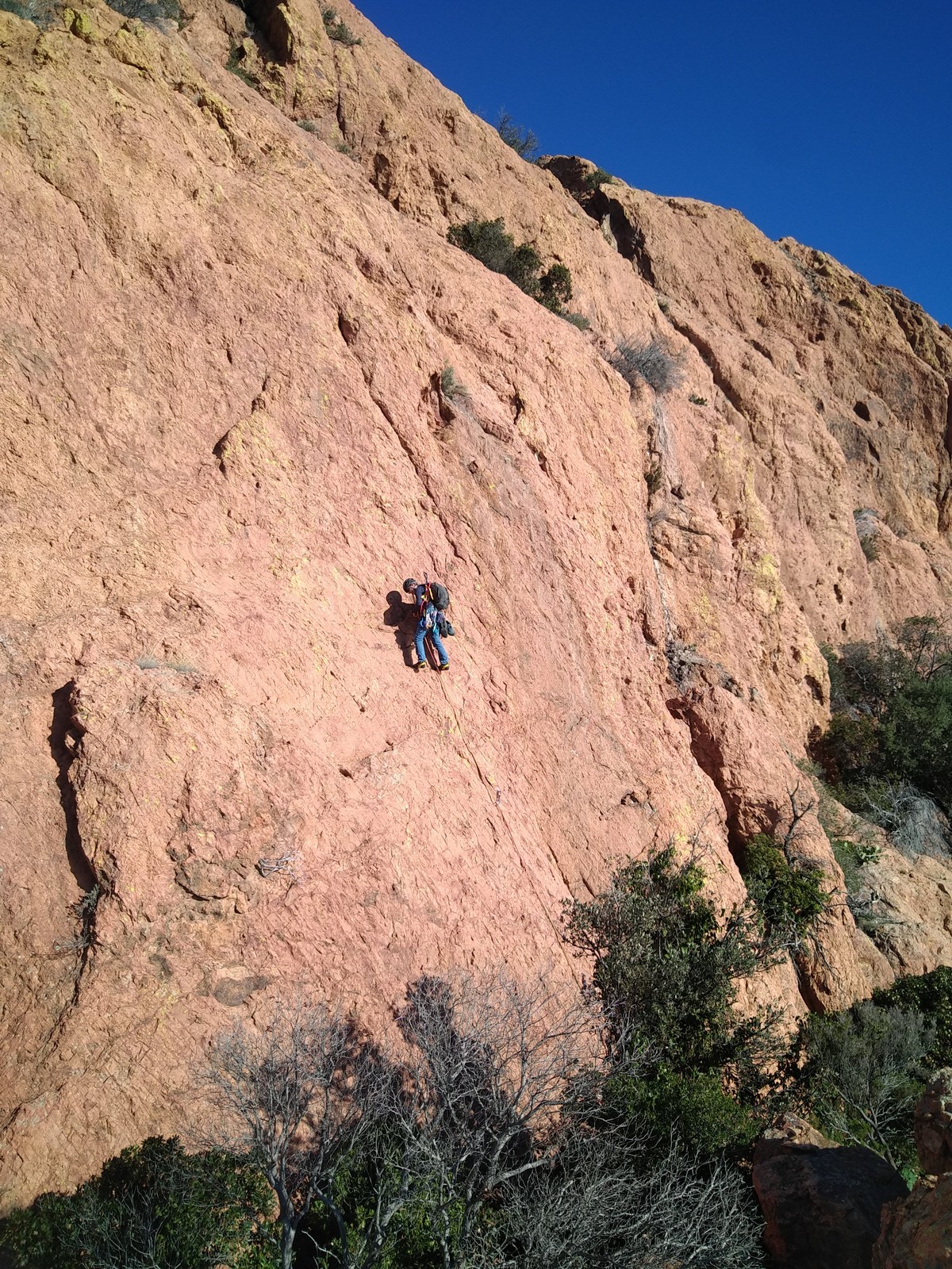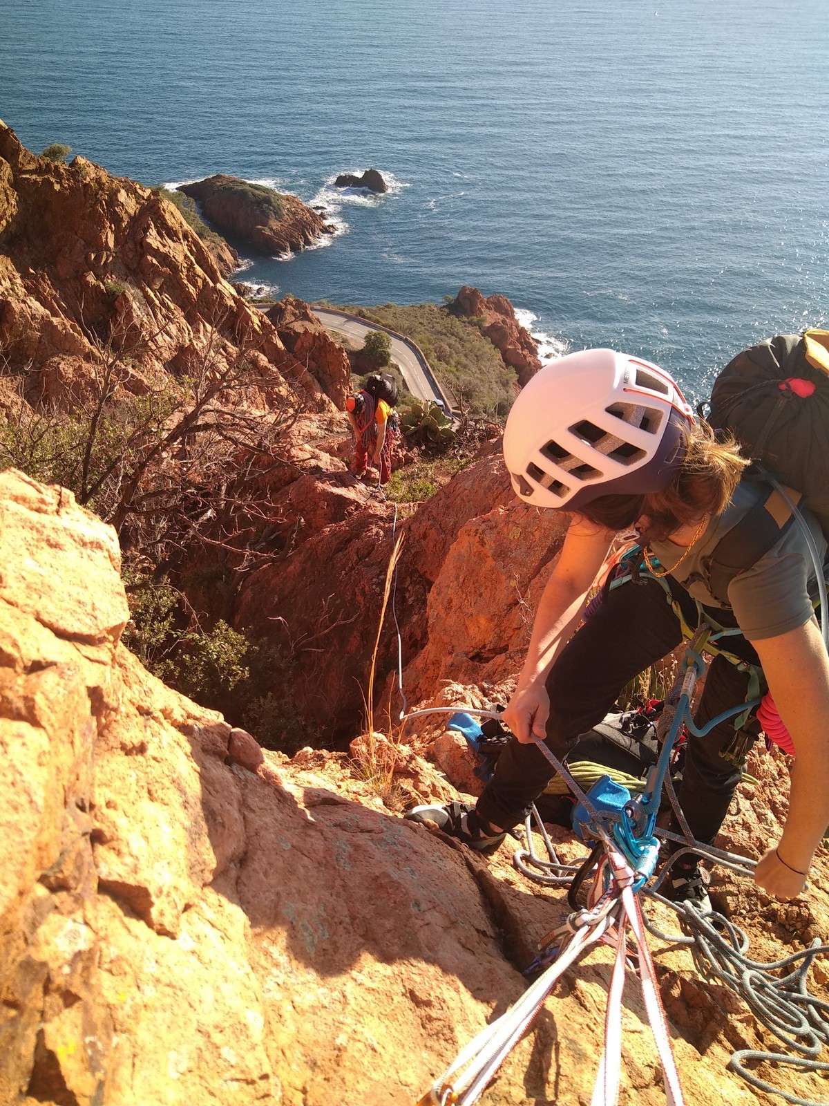 Souvent, il n’est pas besoin d’aller bien loin pour se faire plaisir. Pour cette deuxième session du cycle grandes voies, nous sommes allés au rocher St Barthélémy, dans le massif de l’Esterel. Surplombant la route de la corniche d’or, un peu avant Anthéor, ce petit massif offre une orientation principalement au sud, face à la mer, ce qui est un avantage non négligeable un 17 décembre !