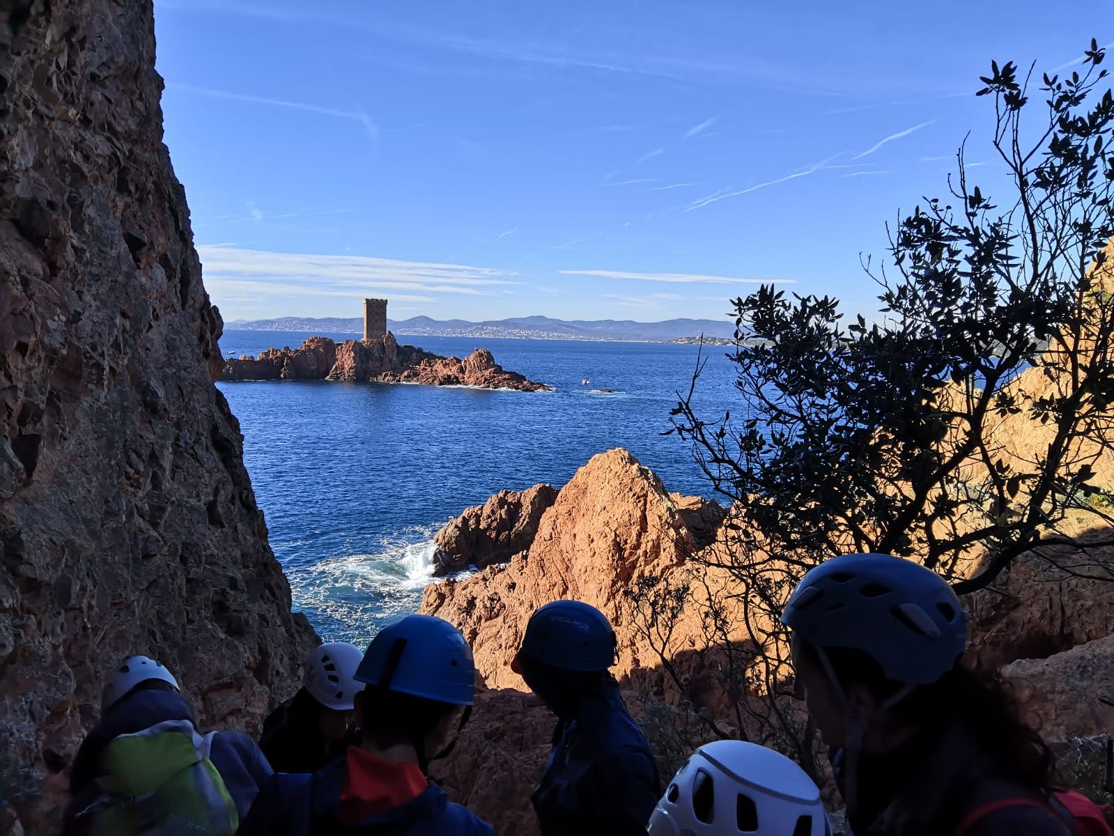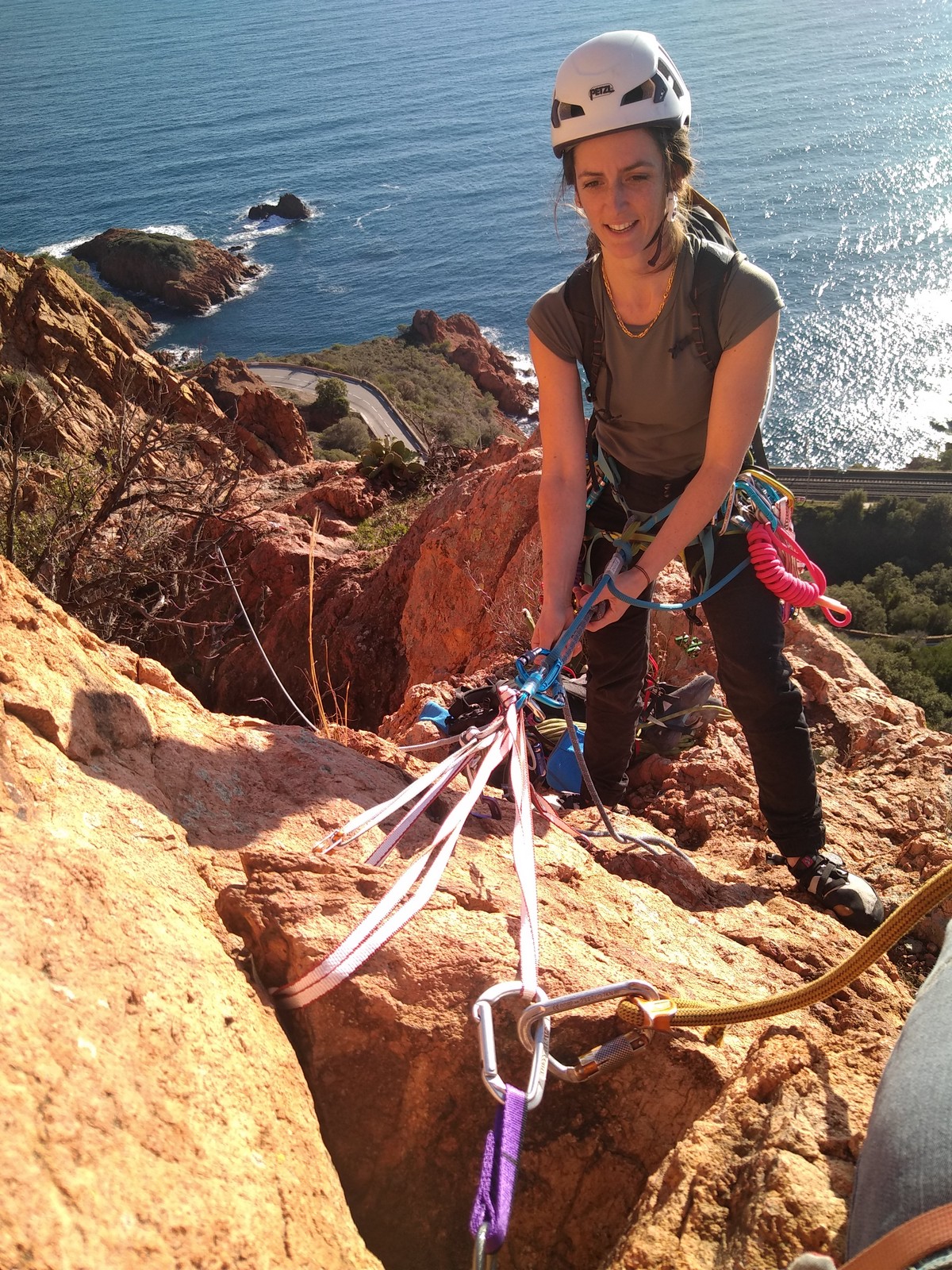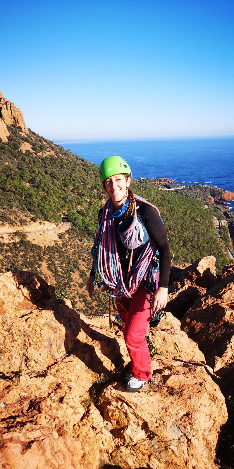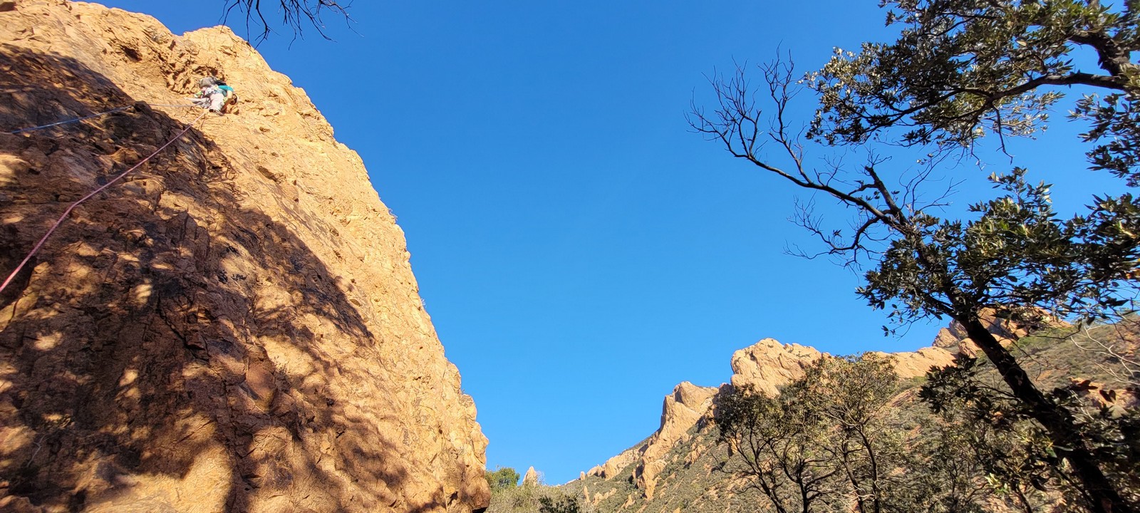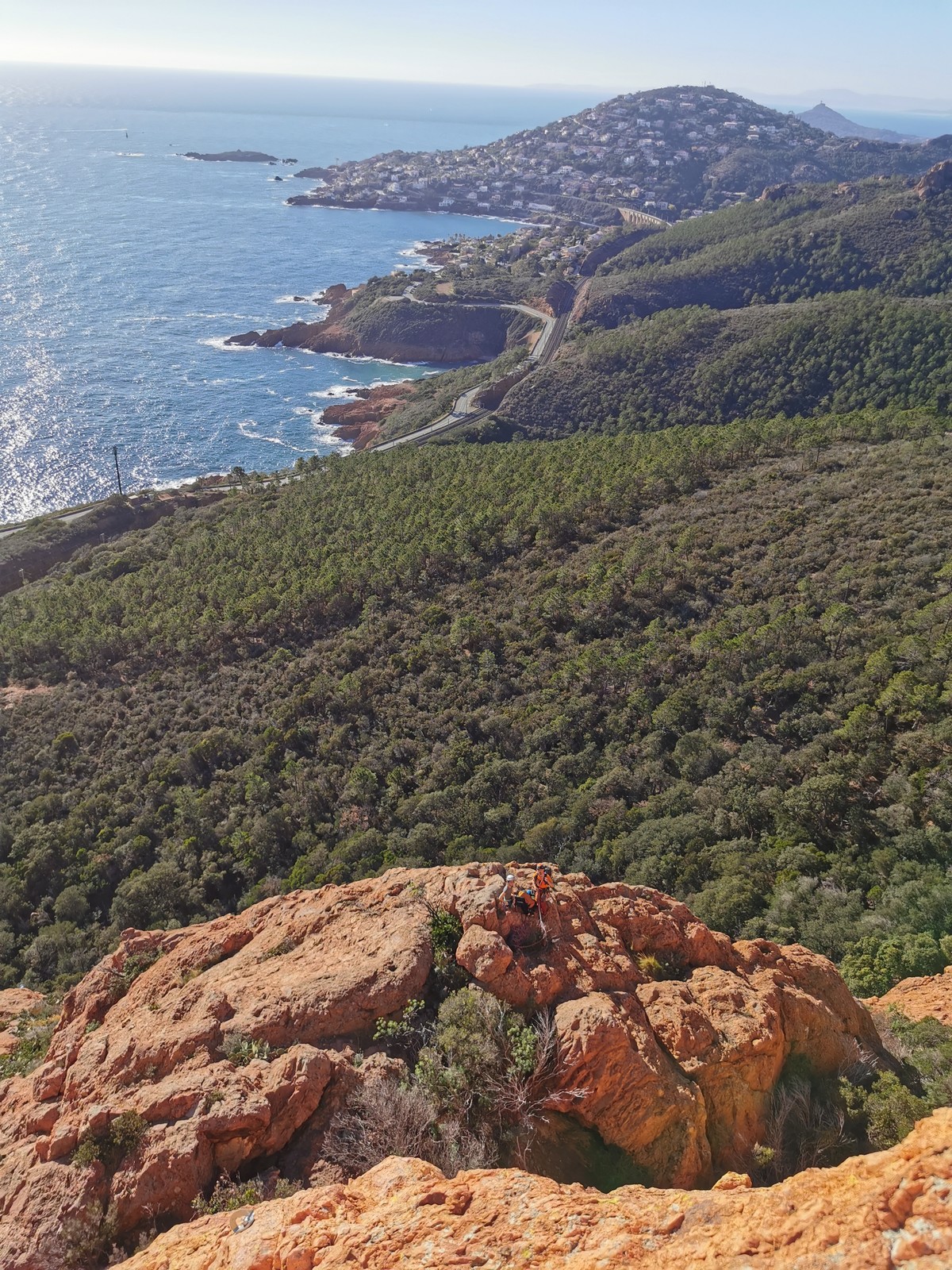 Souvent, il n’est pas besoin d’aller bien loin pour se faire plaisir. Pour cette deuxième session du cycle grandes voies, nous sommes allés au rocher St Barthélémy, dans le massif de l’Esterel. Surplombant la route de la corniche d’or, un peu avant Anthéor, ce petit massif offre une orientation principalement au sud, face à la mer, ce qui est un avantage non négligeable un 17 décembre !