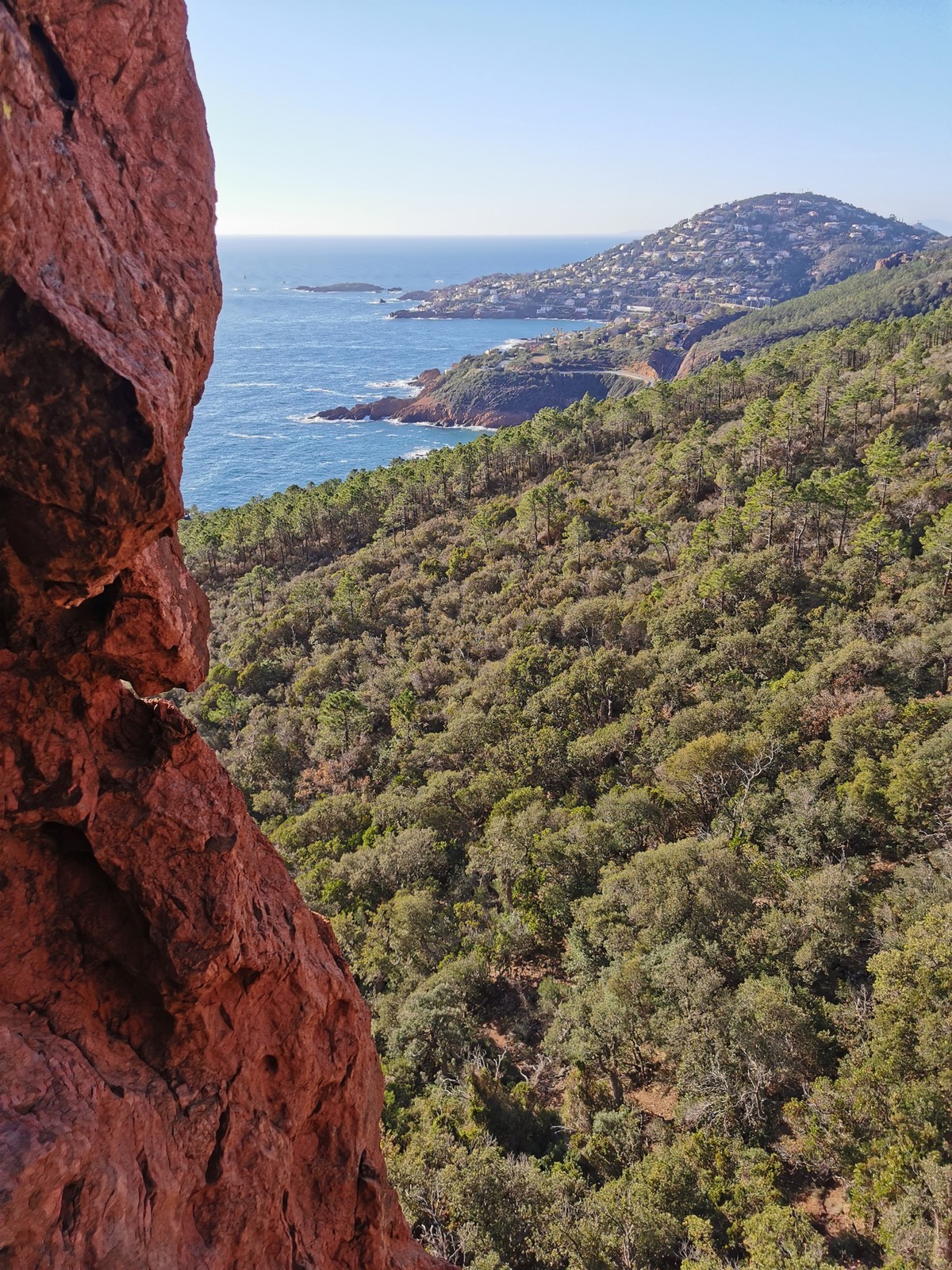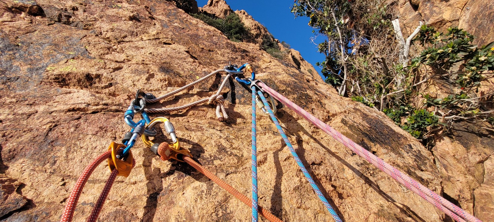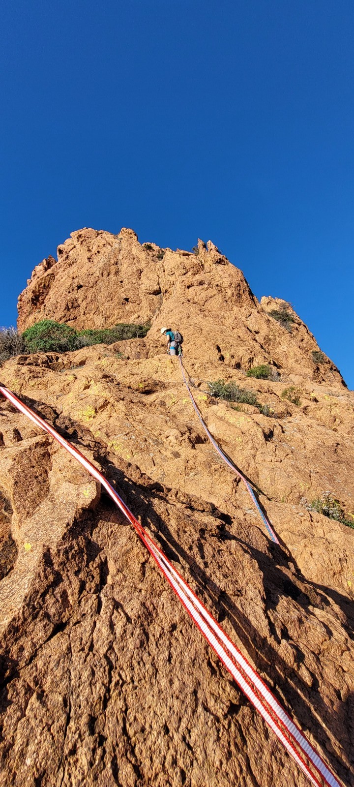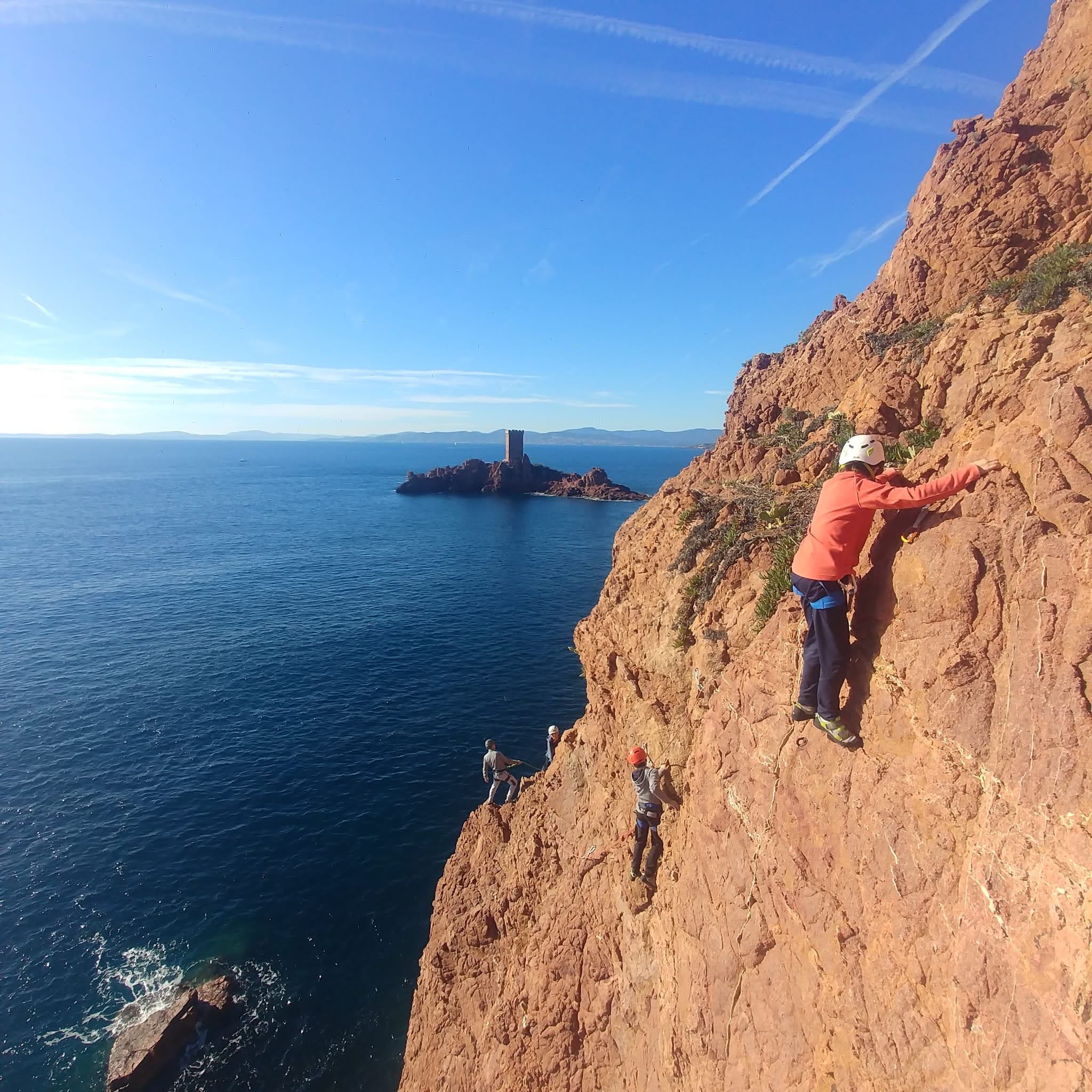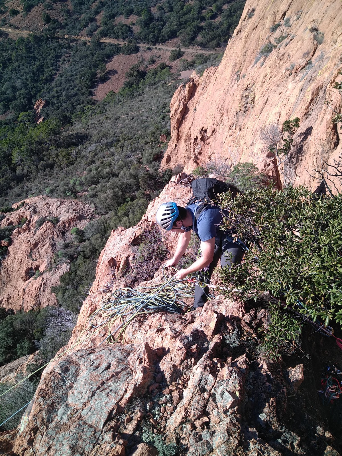Souvent, il n’est pas besoin d’aller bien loin pour se faire plaisir. Pour cette deuxième session du cycle grandes voies, nous sommes allés au rocher St Barthélémy, dans le massif de l’Esterel. Surplombant la route de la corniche d’or, un peu avant Anthéor, ce petit massif offre une orientation principalement au sud, face à la mer, ce qui est un avantage non négligeable un 17 décembre !