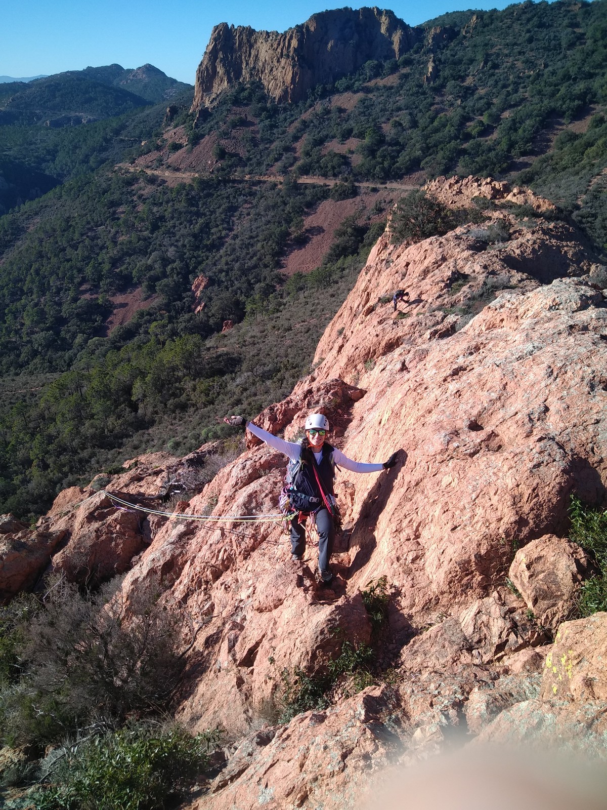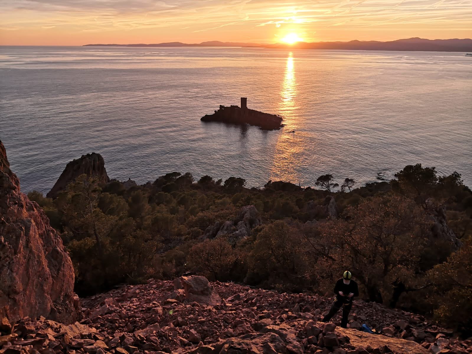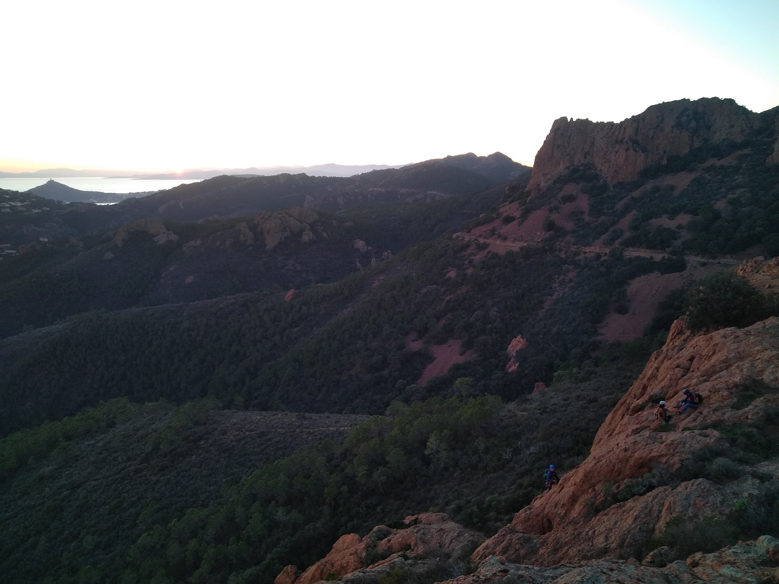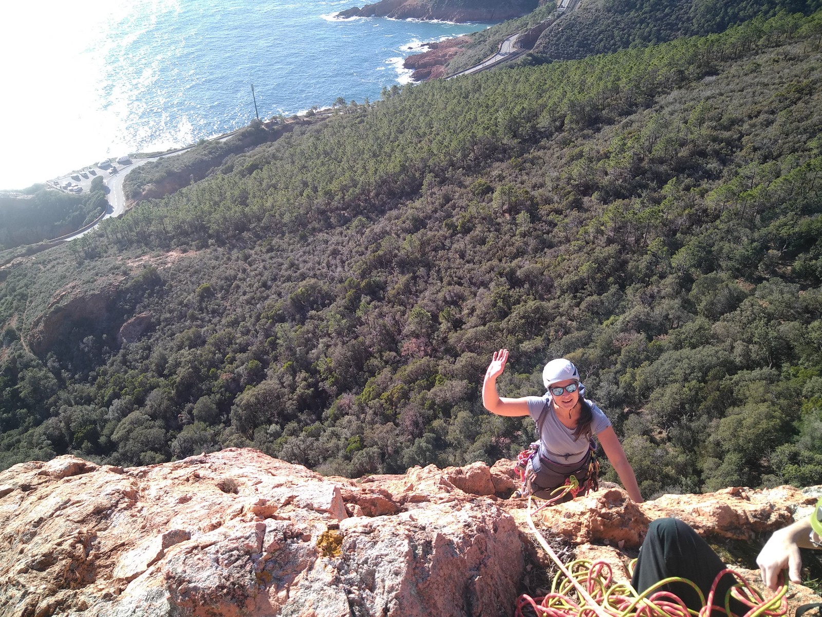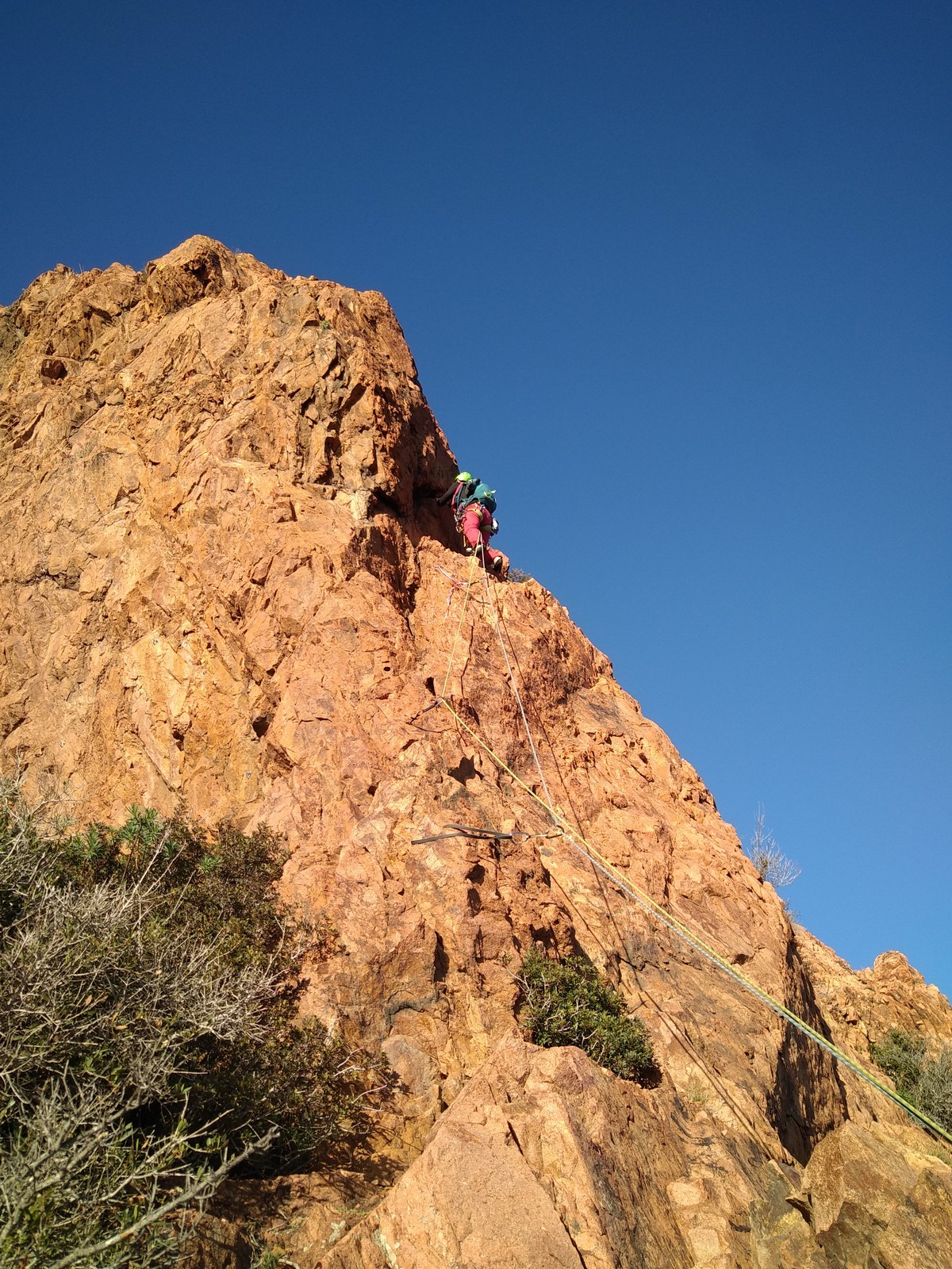 Souvent, il n’est pas besoin d’aller bien loin pour se faire plaisir. Pour cette deuxième session du cycle grandes voies, nous sommes allés au rocher St Barthélémy, dans le massif de l’Esterel. Surplombant la route de la corniche d’or, un peu avant Anthéor, ce petit massif offre une orientation principalement au sud, face à la mer, ce qui est un avantage non négligeable un 17 décembre !