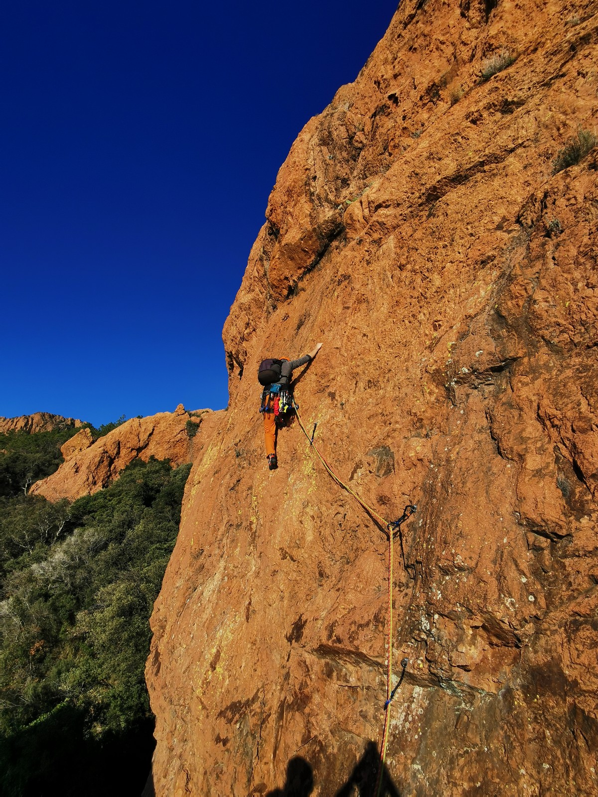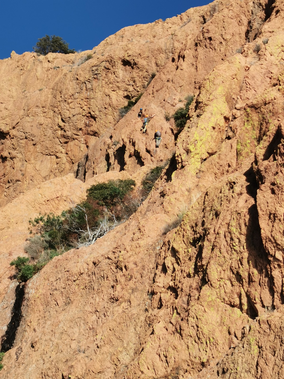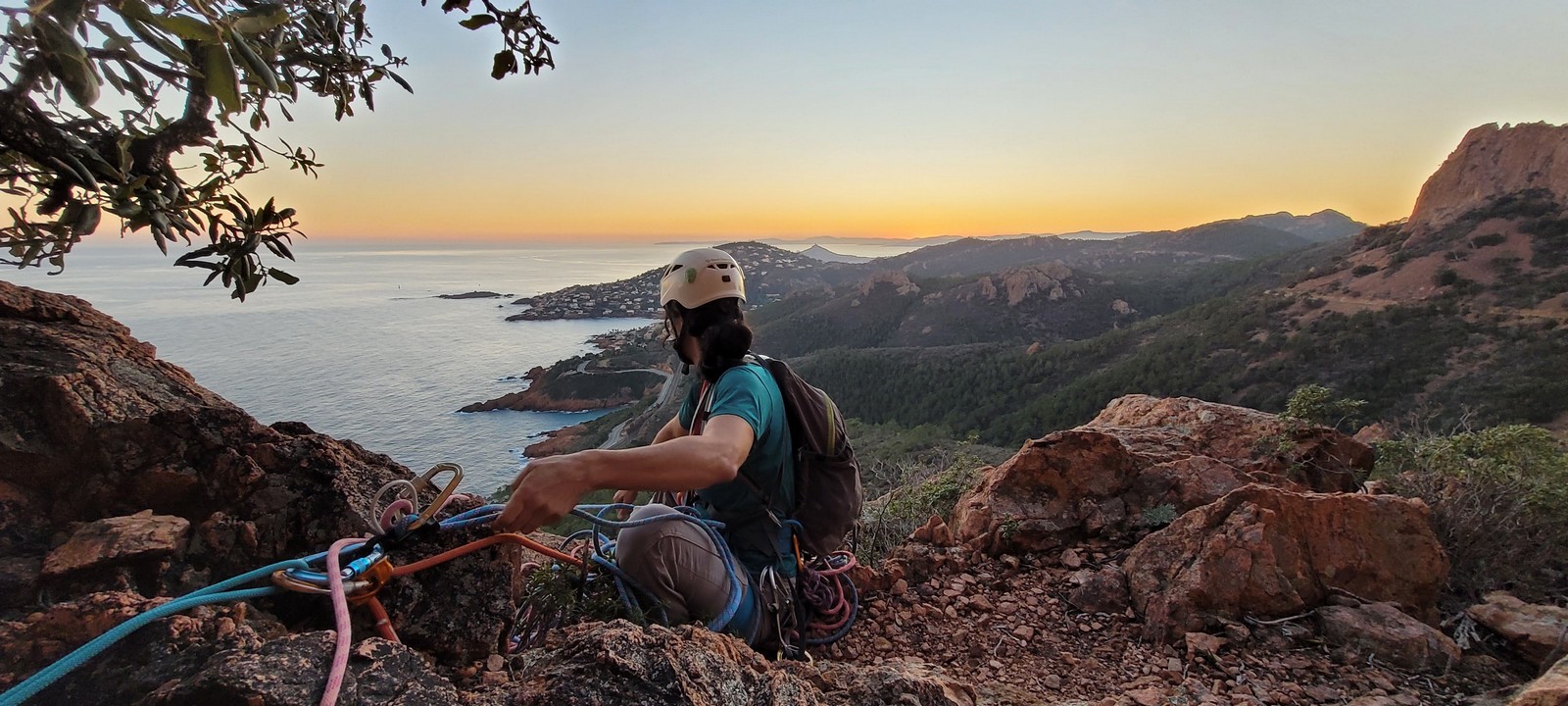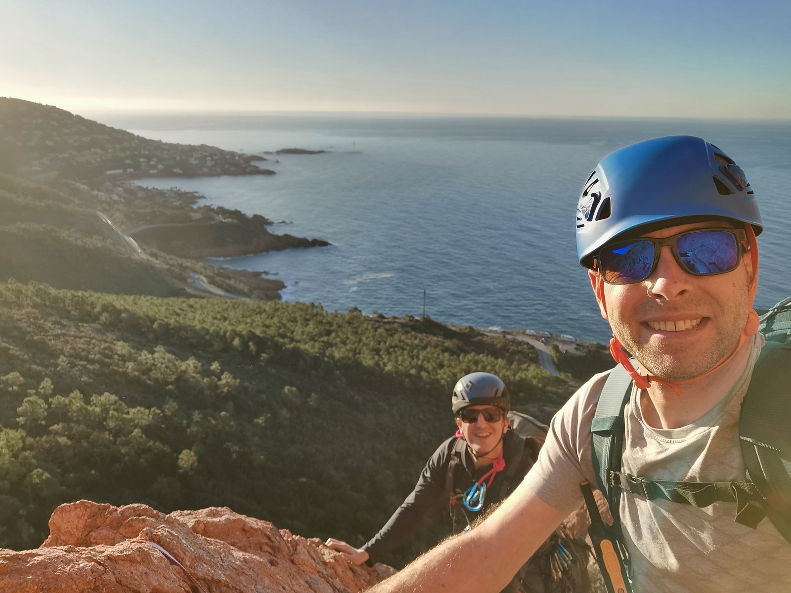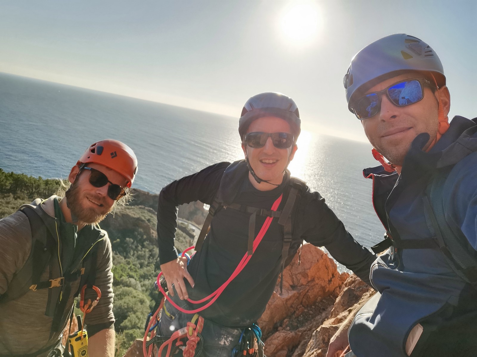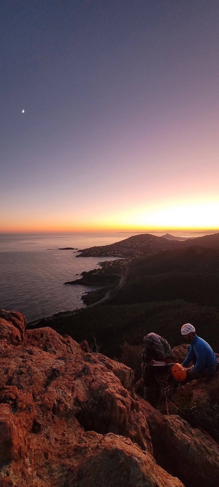 Souvent, il n’est pas besoin d’aller bien loin pour se faire plaisir. Pour cette deuxième session du cycle grandes voies, nous sommes allés au rocher St Barthélémy, dans le massif de l’Esterel. Surplombant la route de la corniche d’or, un peu avant Anthéor, ce petit massif offre une orientation principalement au sud, face à la mer, ce qui est un avantage non négligeable un 17 décembre !