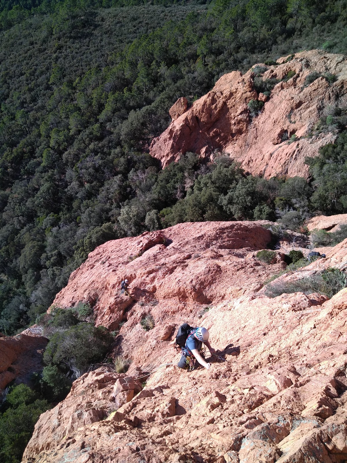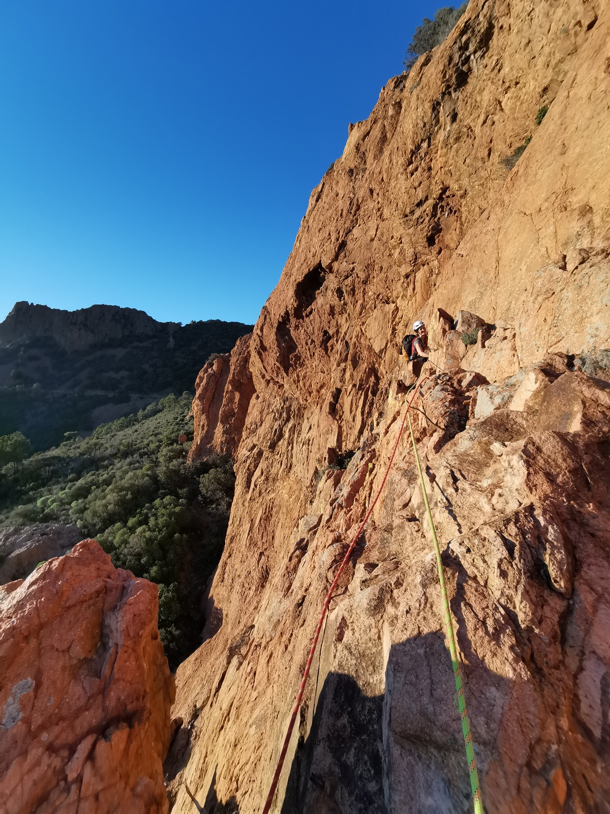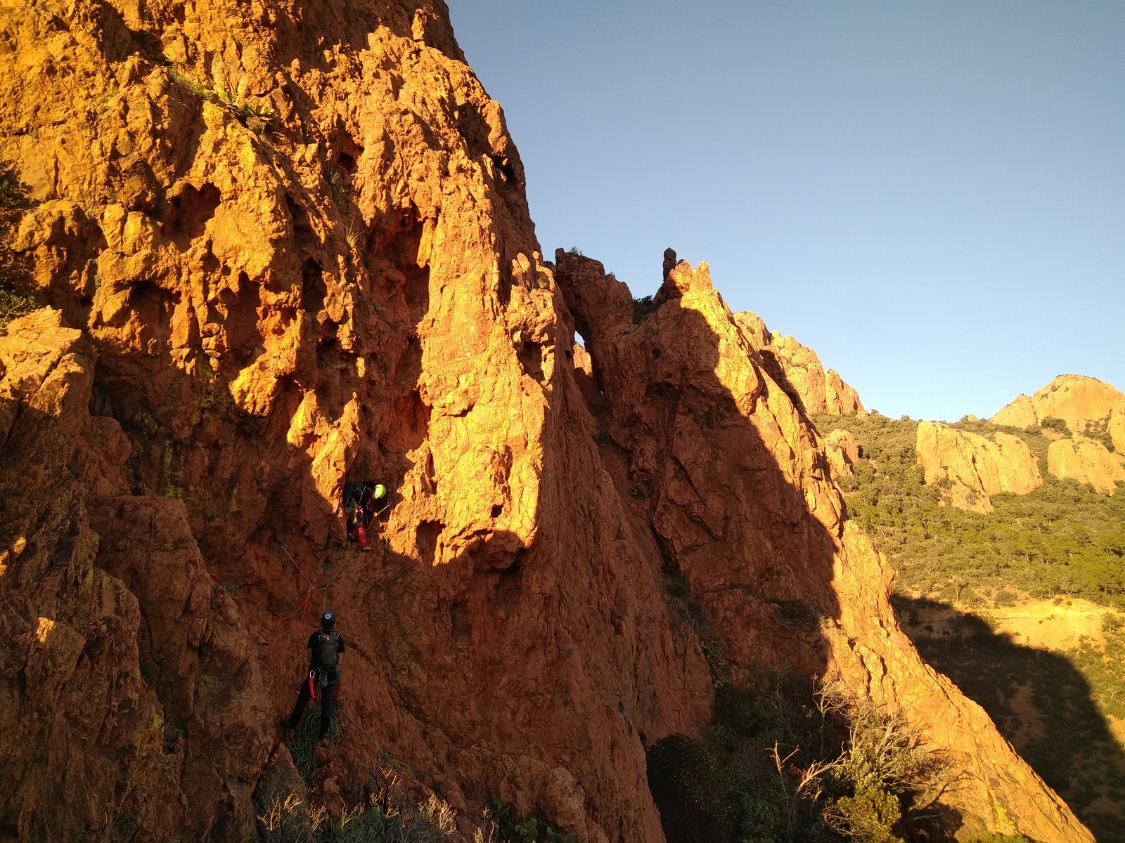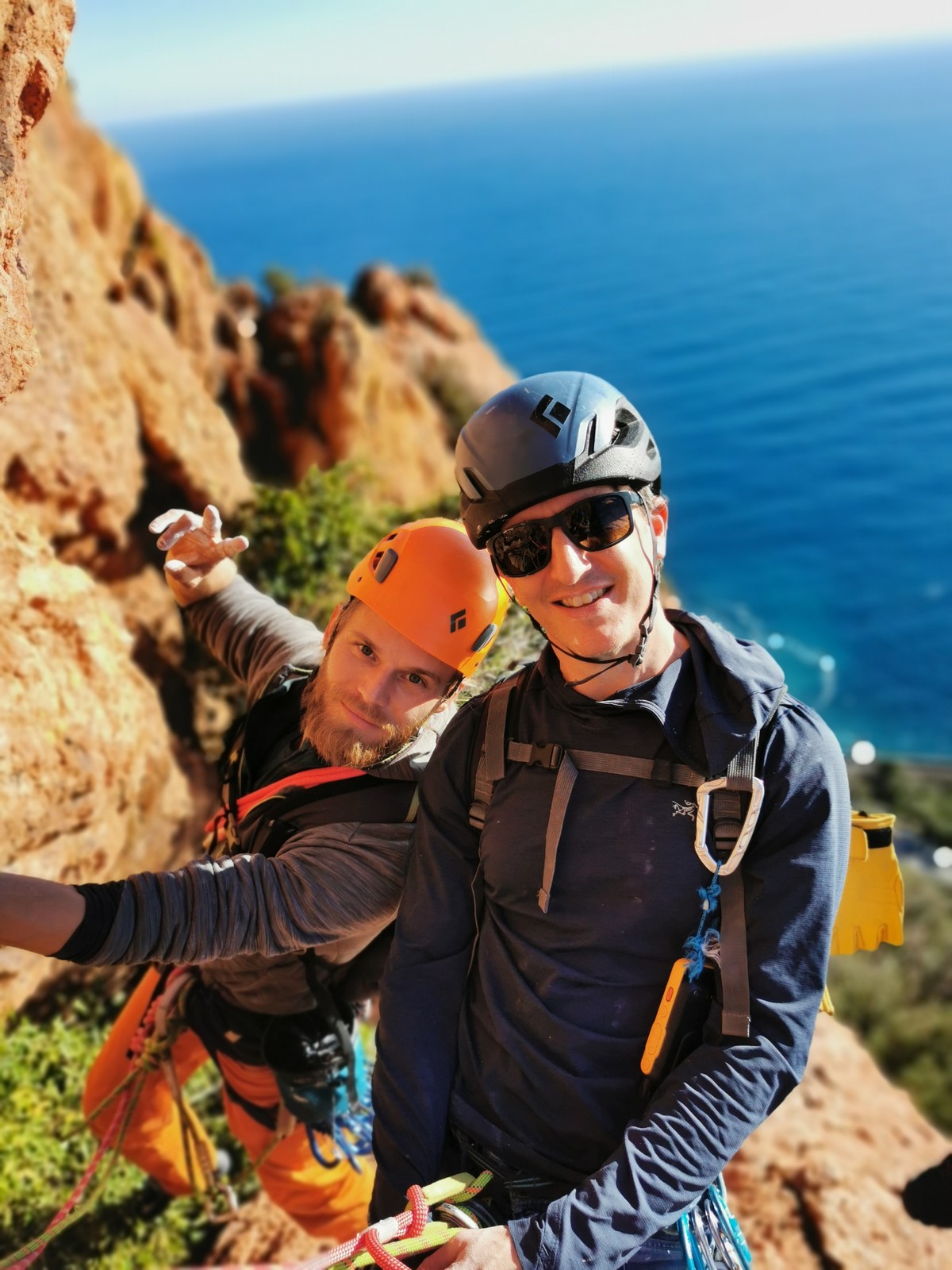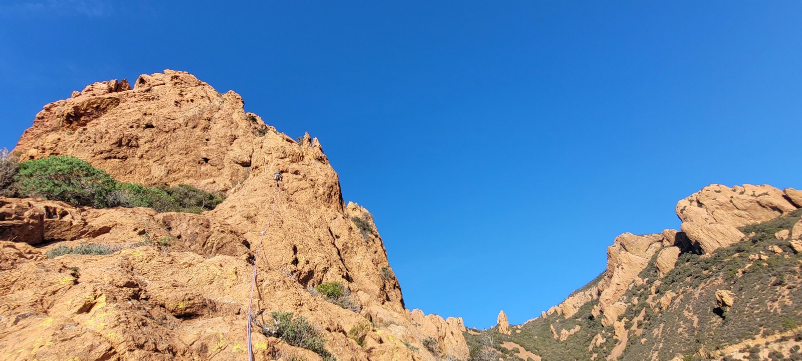 Souvent, il n’est pas besoin d’aller bien loin pour se faire plaisir. Pour cette deuxième session du cycle grandes voies, nous sommes allés au rocher St Barthélémy, dans le massif de l’Esterel. Surplombant la route de la corniche d’or, un peu avant Anthéor, ce petit massif offre une orientation principalement au sud, face à la mer, ce qui est un avantage non négligeable un 17 décembre !