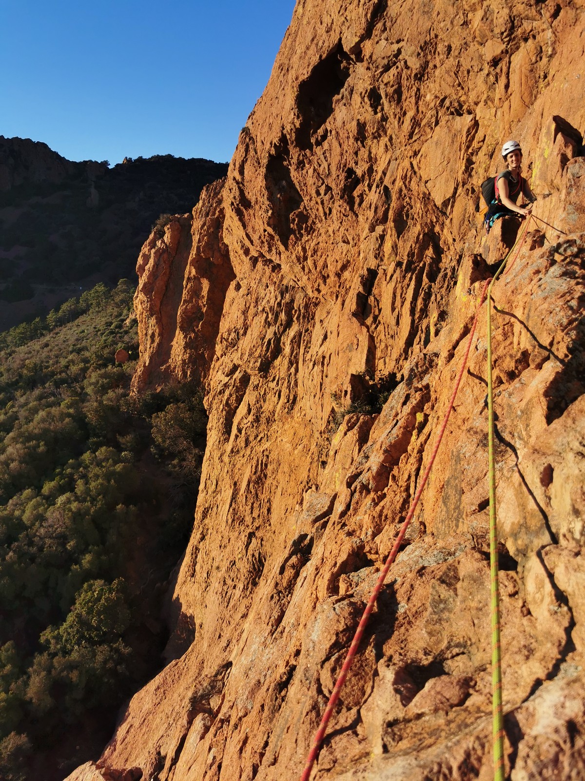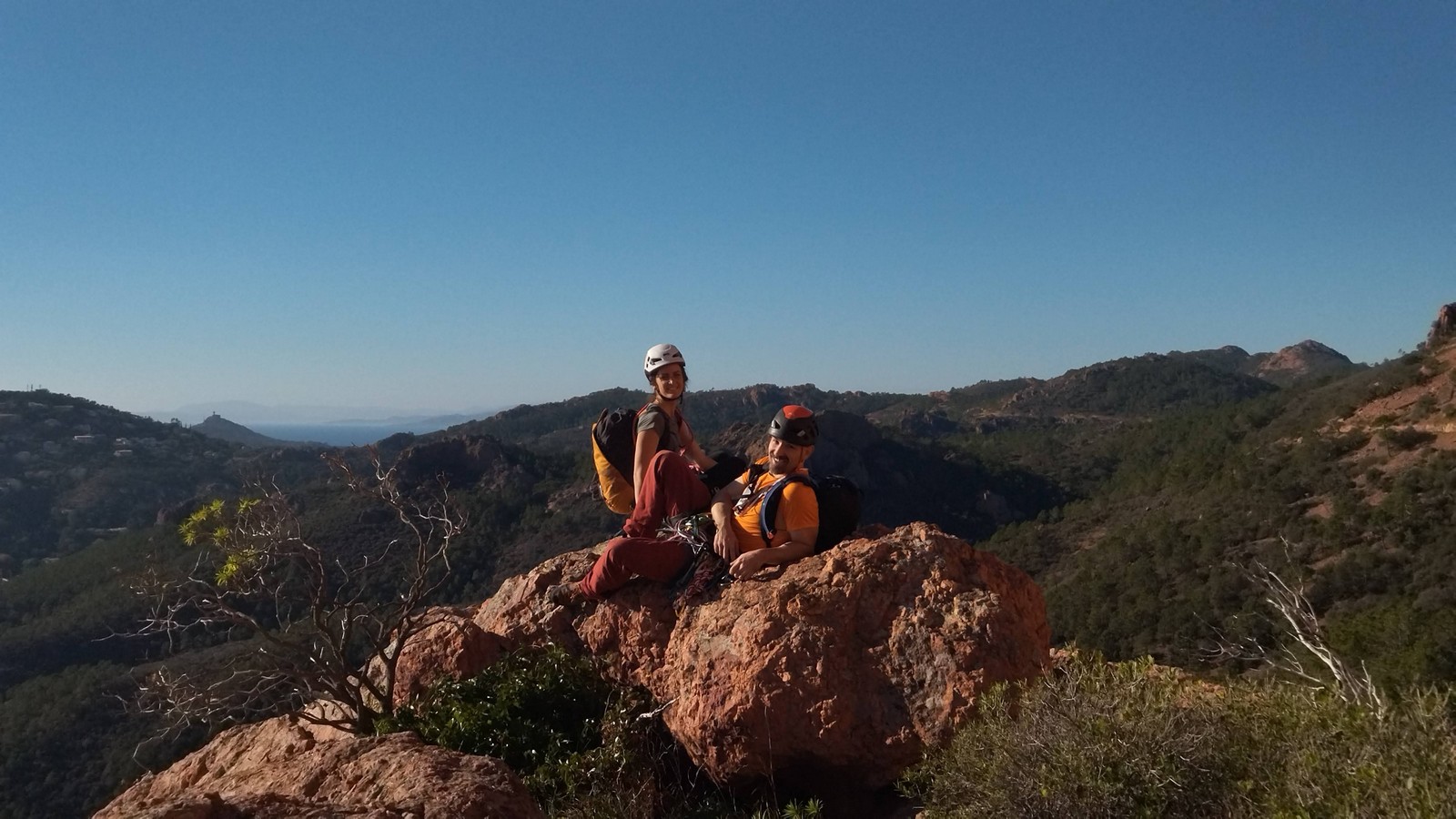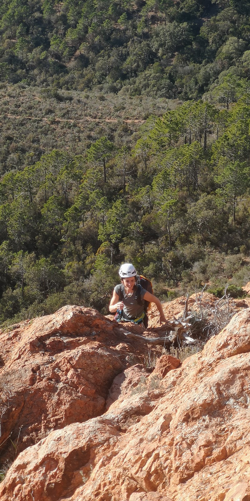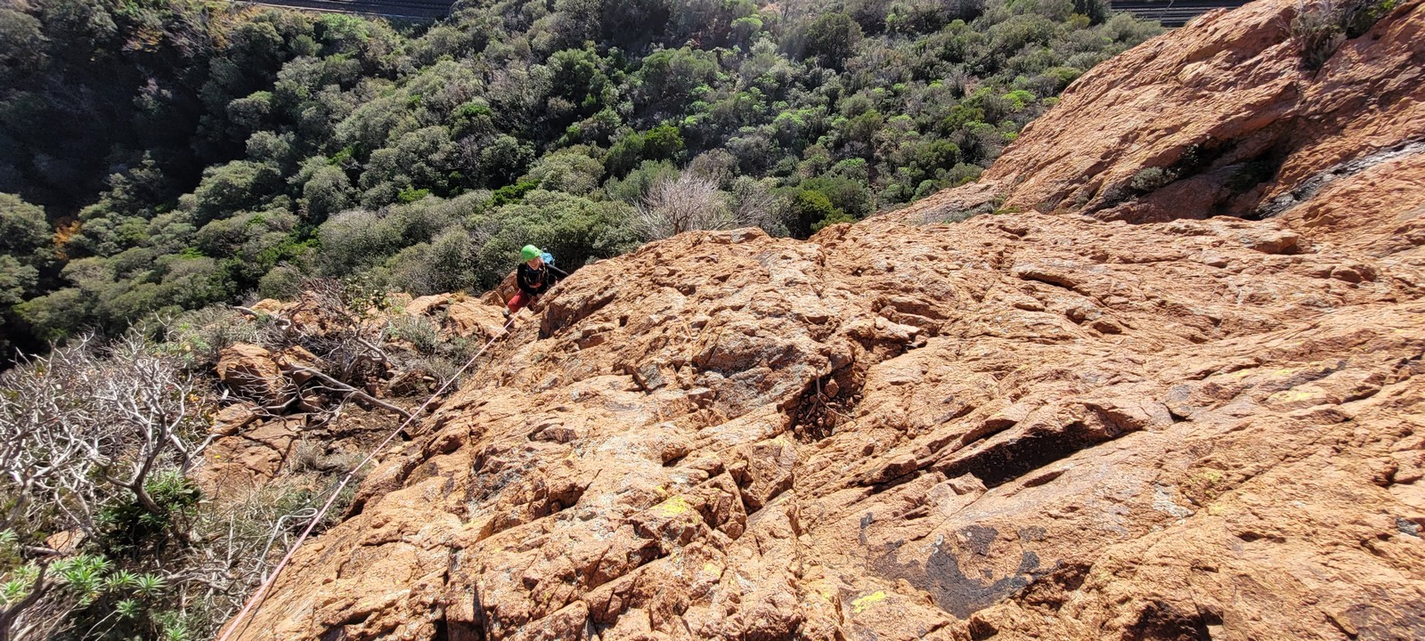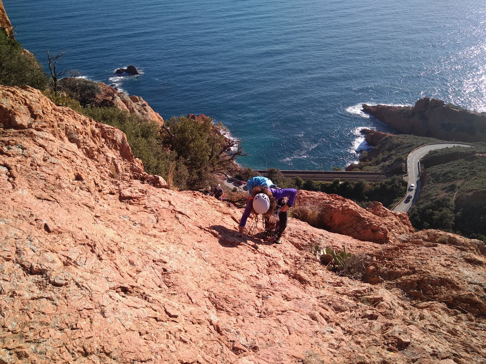 Souvent, il n’est pas besoin d’aller bien loin pour se faire plaisir. Pour cette deuxième session du cycle grandes voies, nous sommes allés au rocher St Barthélémy, dans le massif de l’Esterel. Surplombant la route de la corniche d’or, un peu avant Anthéor, ce petit massif offre une orientation principalement au sud, face à la mer, ce qui est un avantage non négligeable un 17 décembre !
