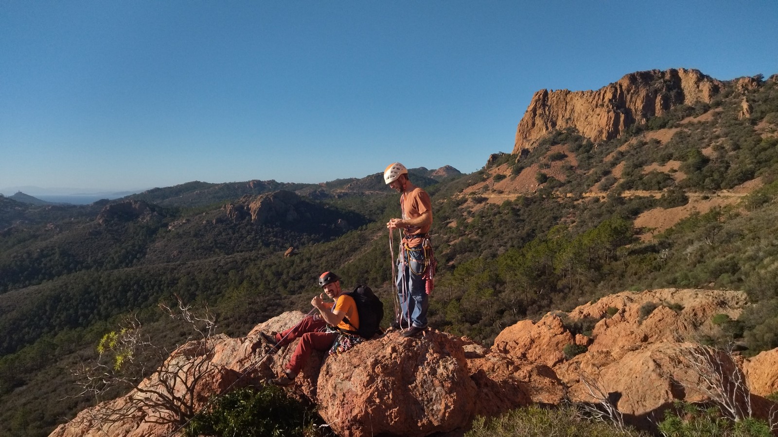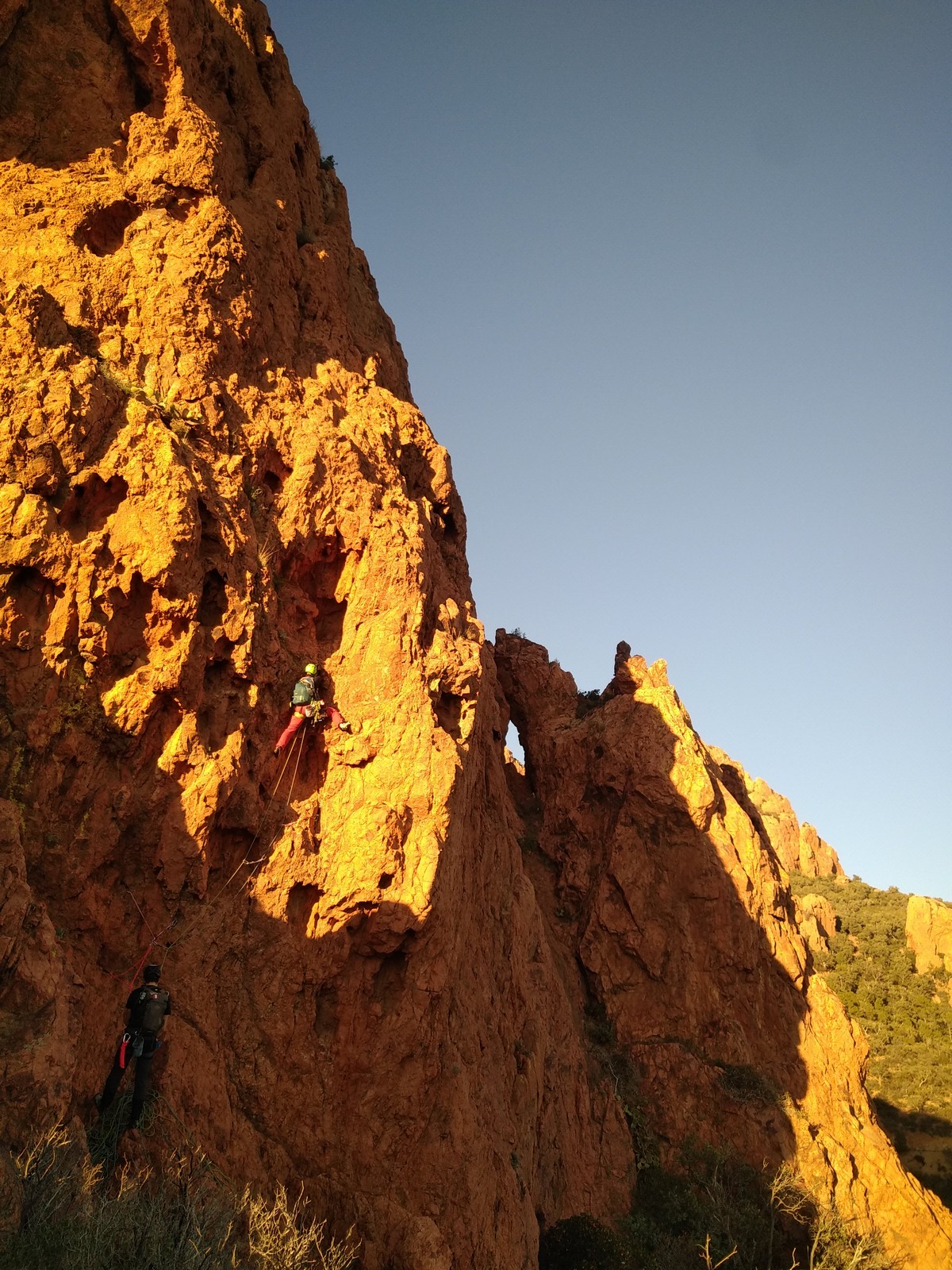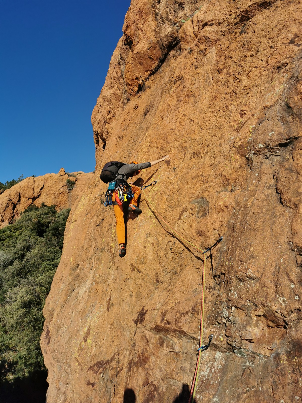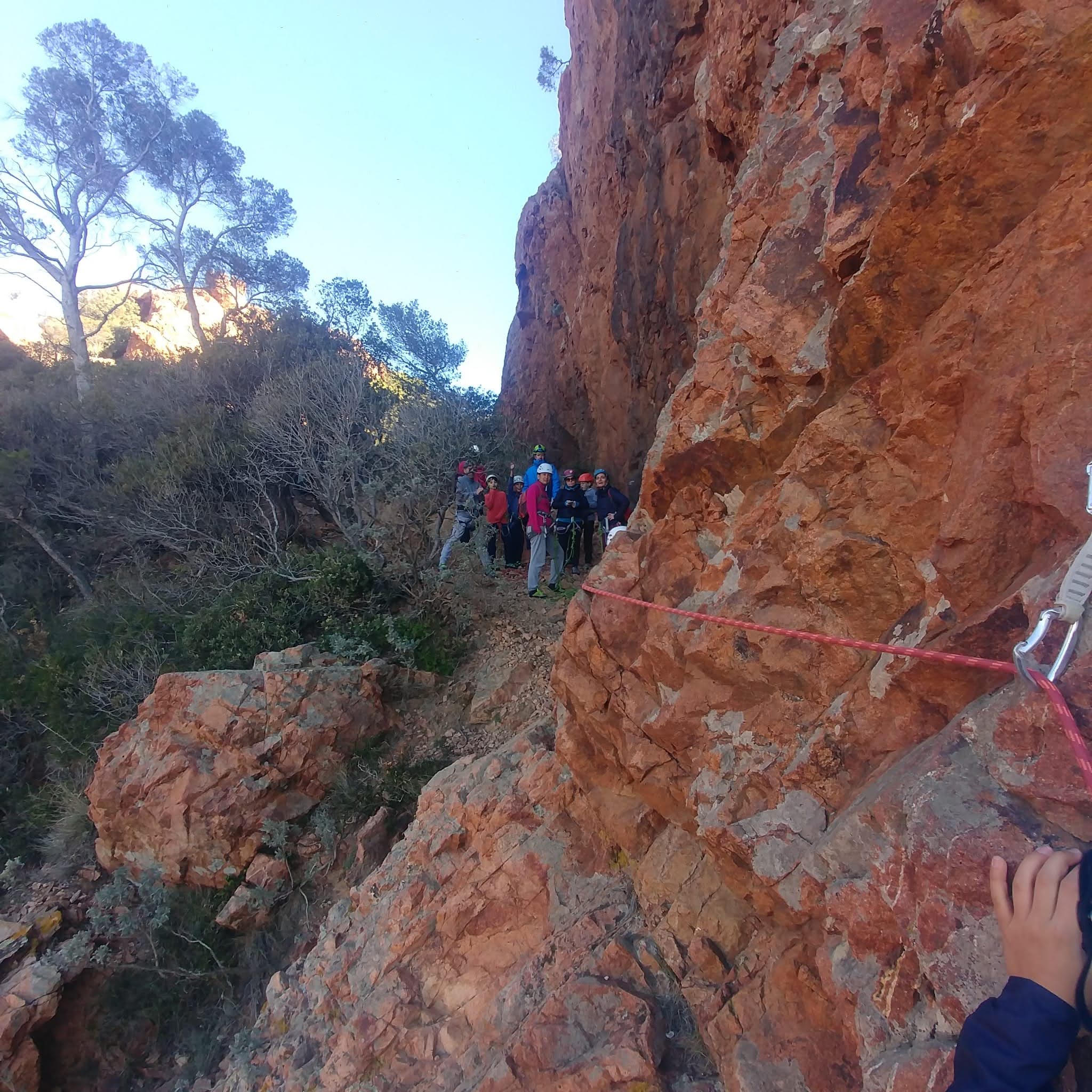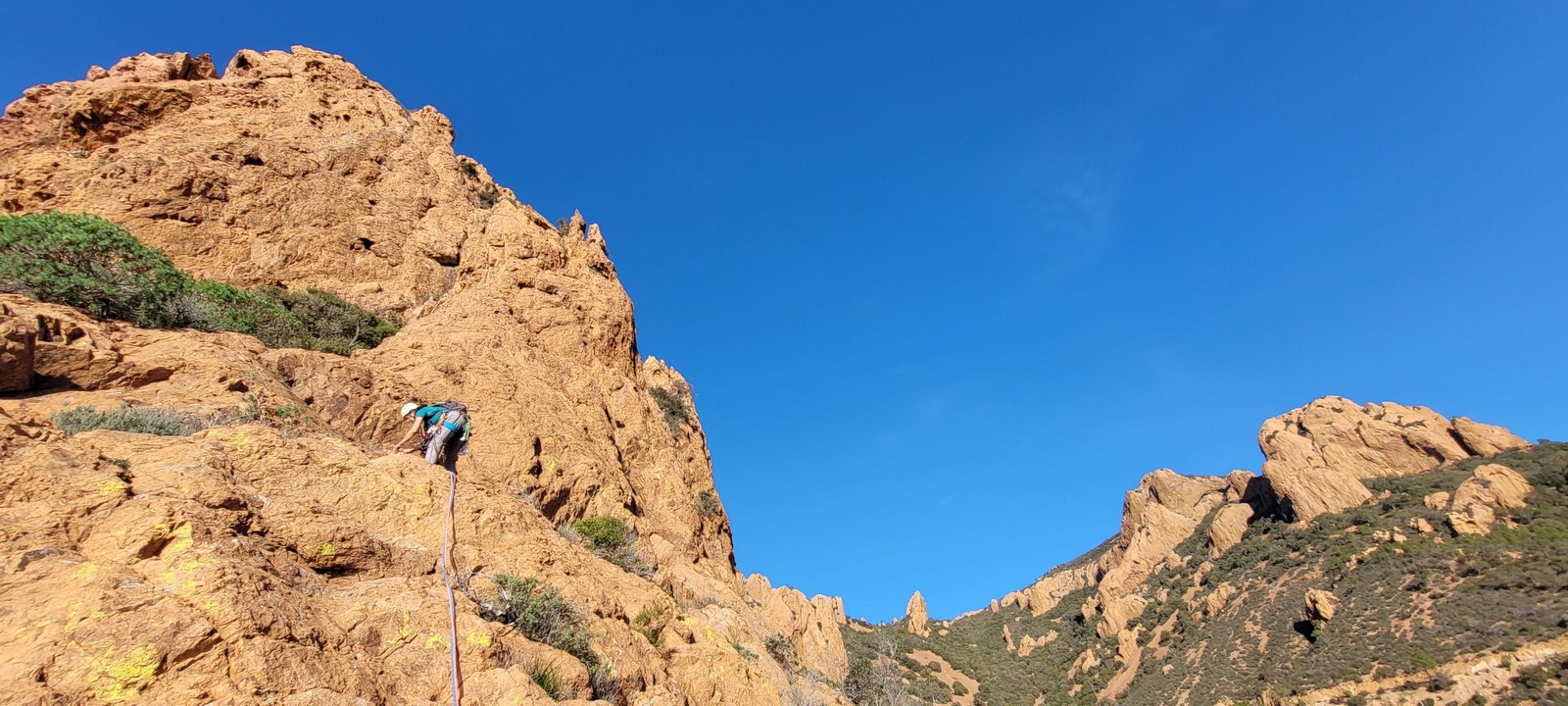 Souvent, il n’est pas besoin d’aller bien loin pour se faire plaisir. Pour cette deuxième session du cycle grandes voies, nous sommes allés au rocher St Barthélémy, dans le massif de l’Esterel. Surplombant la route de la corniche d’or, un peu avant Anthéor, ce petit massif offre une orientation principalement au sud, face à la mer, ce qui est un avantage non négligeable un 17 décembre !