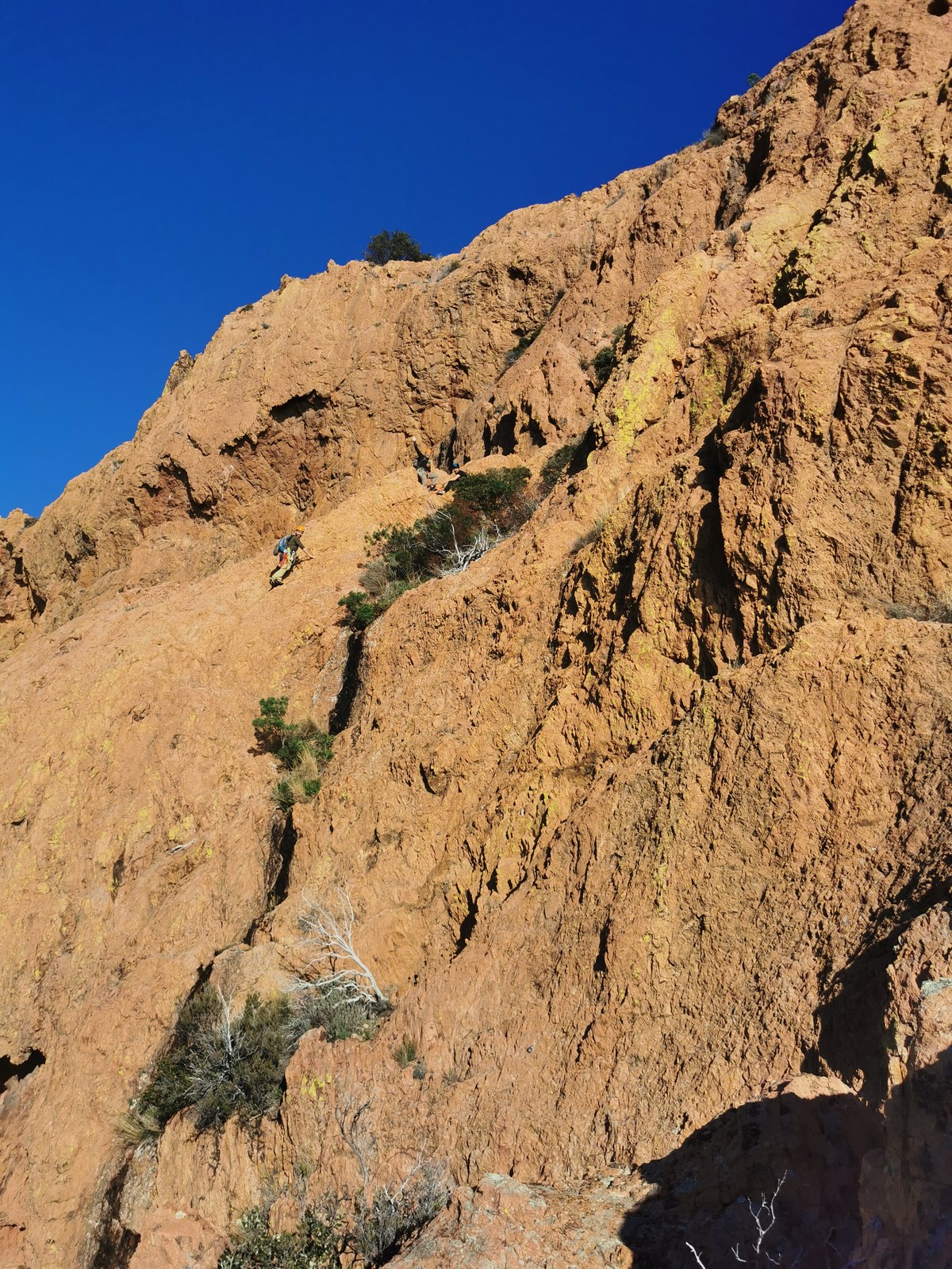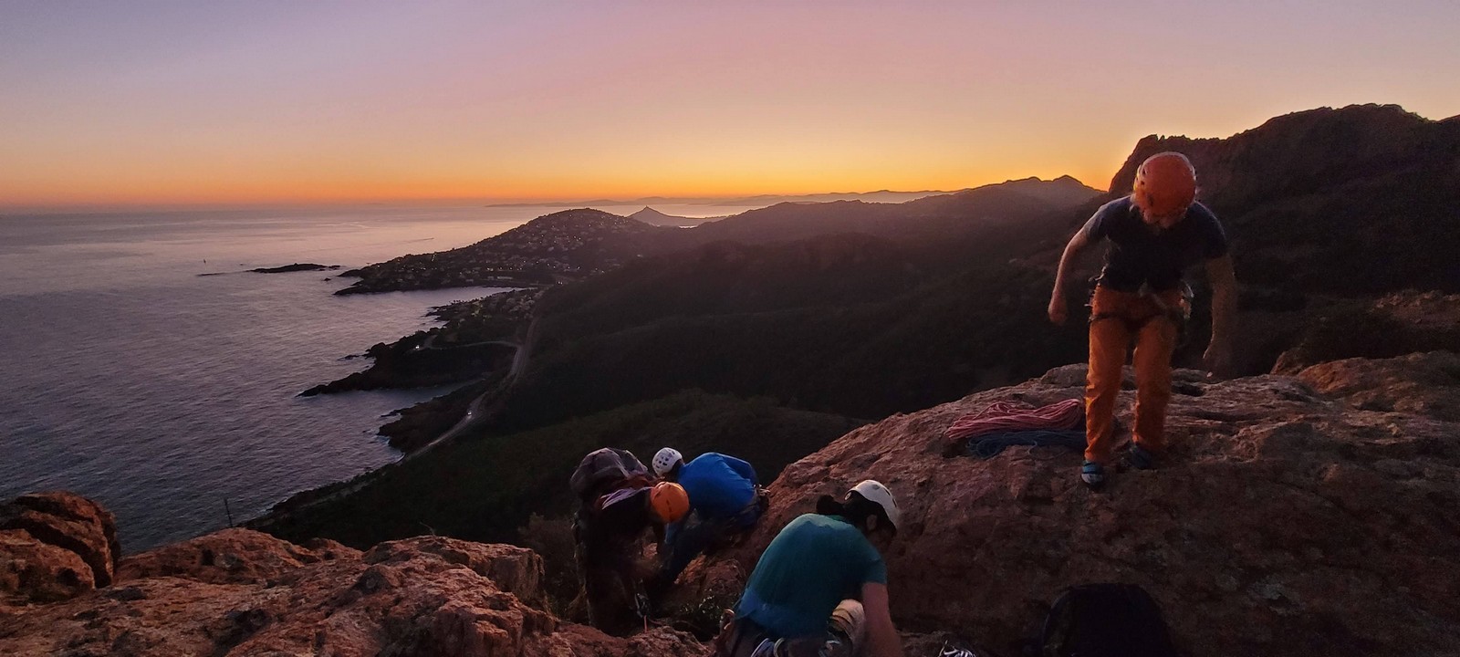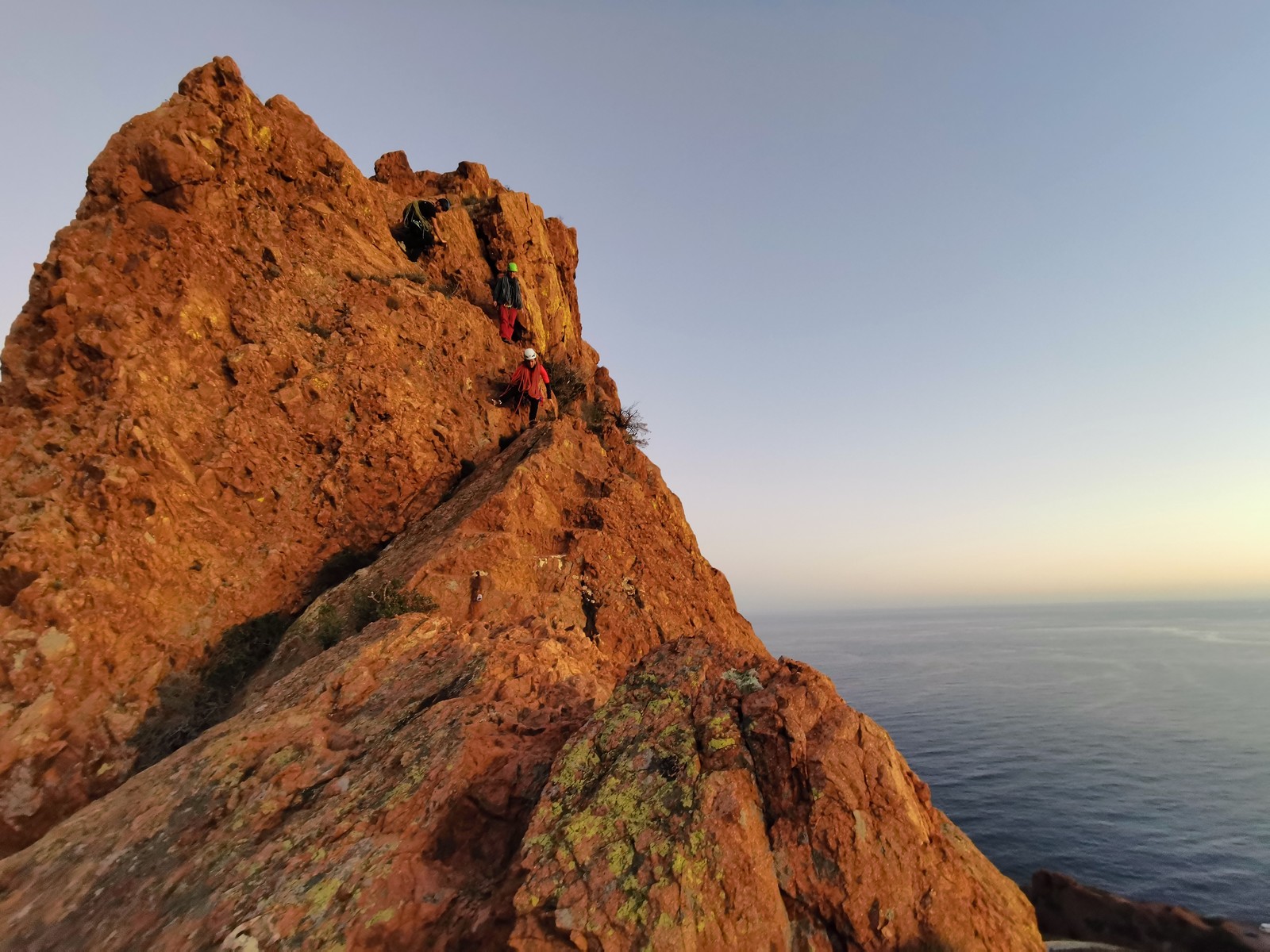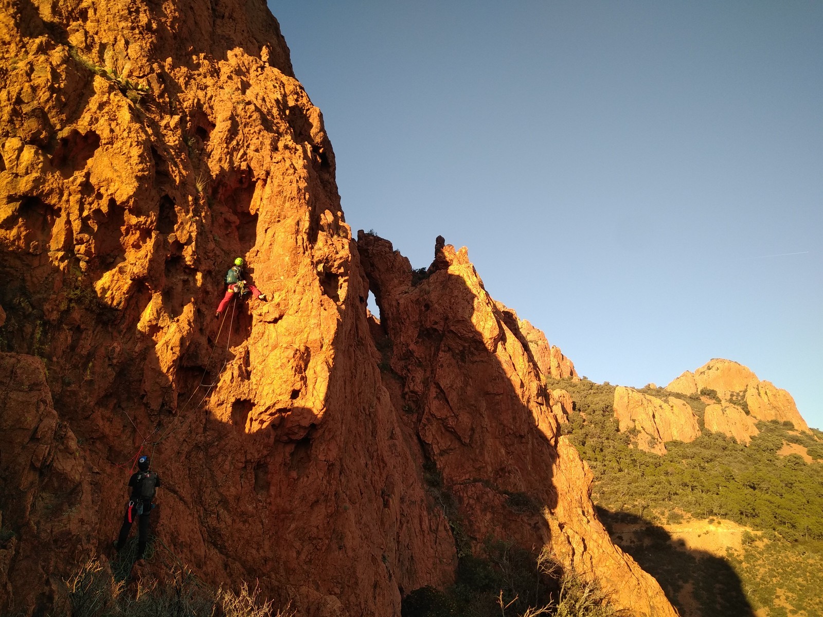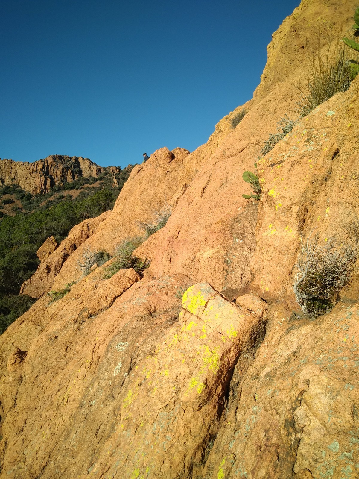 Souvent, il n’est pas besoin d’aller bien loin pour se faire plaisir. Pour cette deuxième session du cycle grandes voies, nous sommes allés au rocher St Barthélémy, dans le massif de l’Esterel. Surplombant la route de la corniche d’or, un peu avant Anthéor, ce petit massif offre une orientation principalement au sud, face à la mer, ce qui est un avantage non négligeable un 17 décembre !