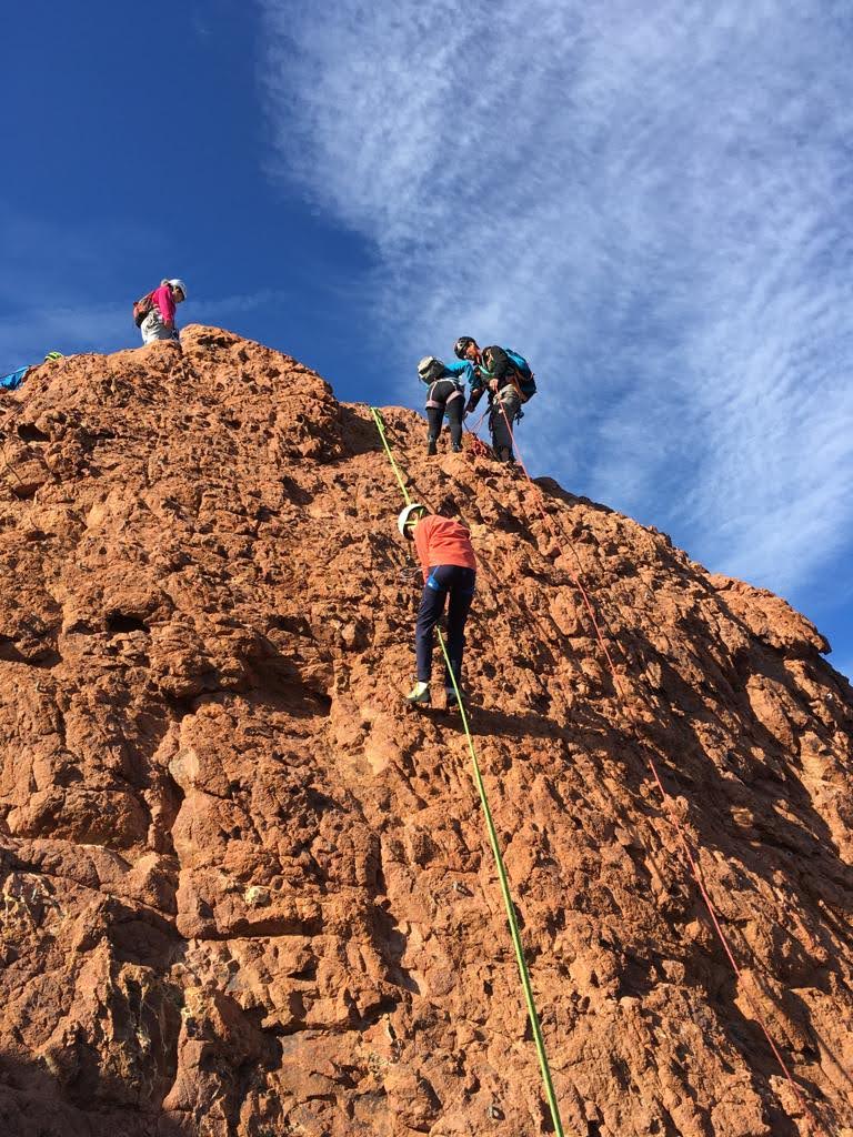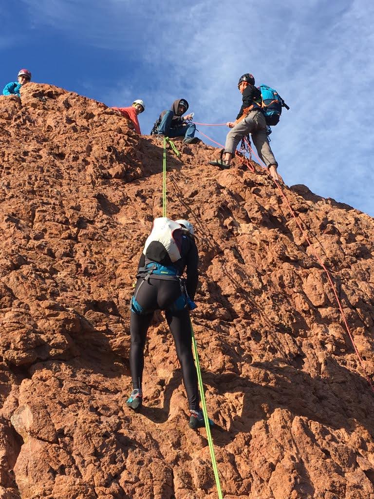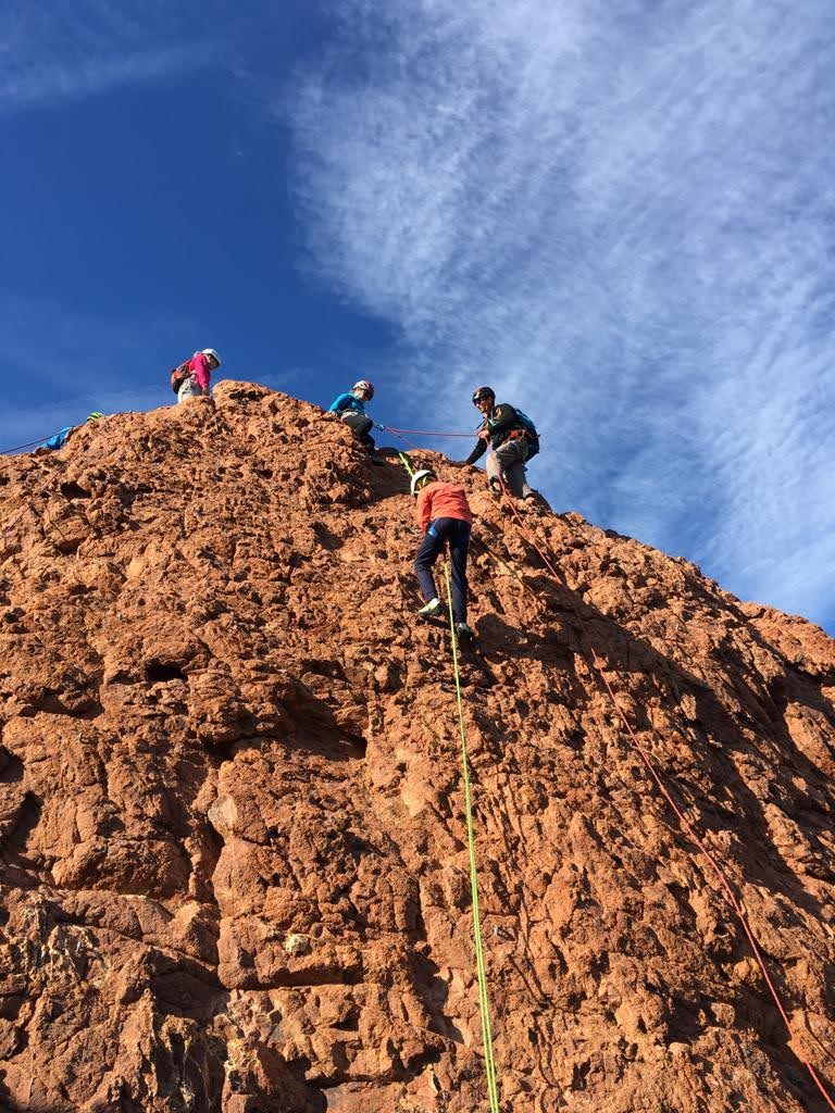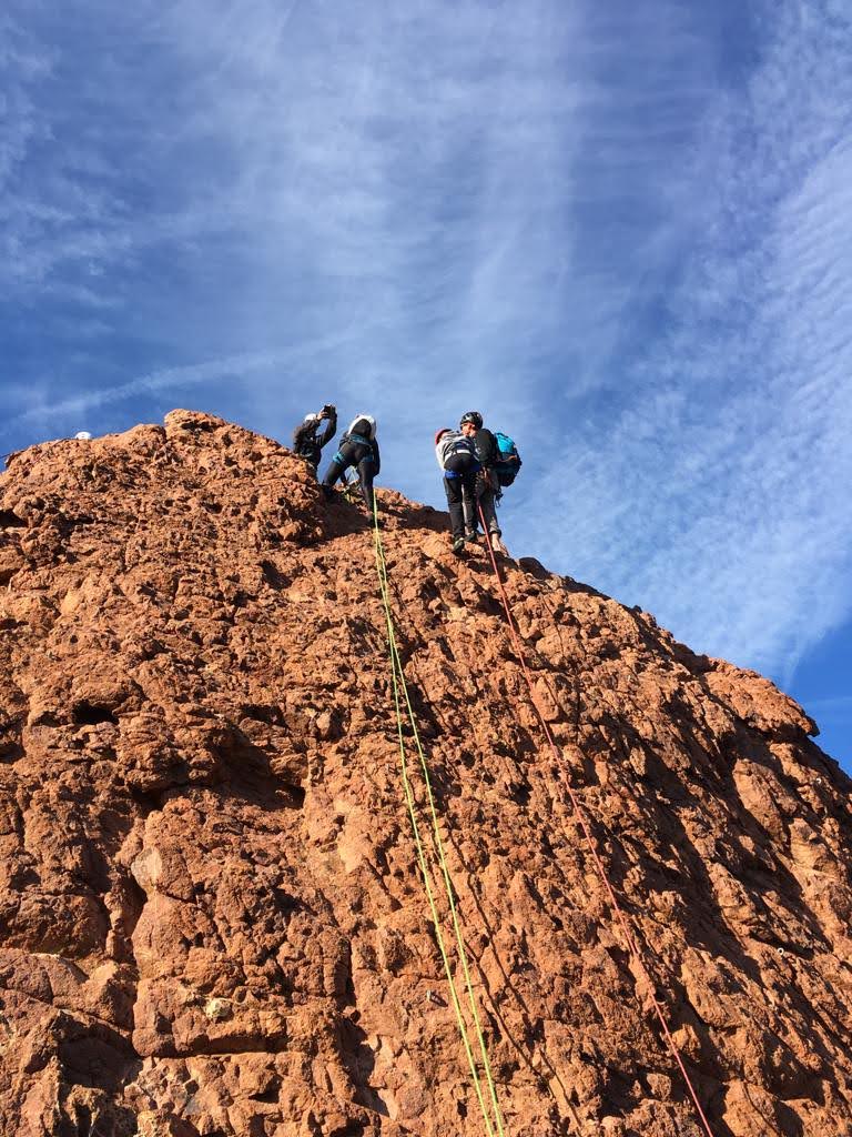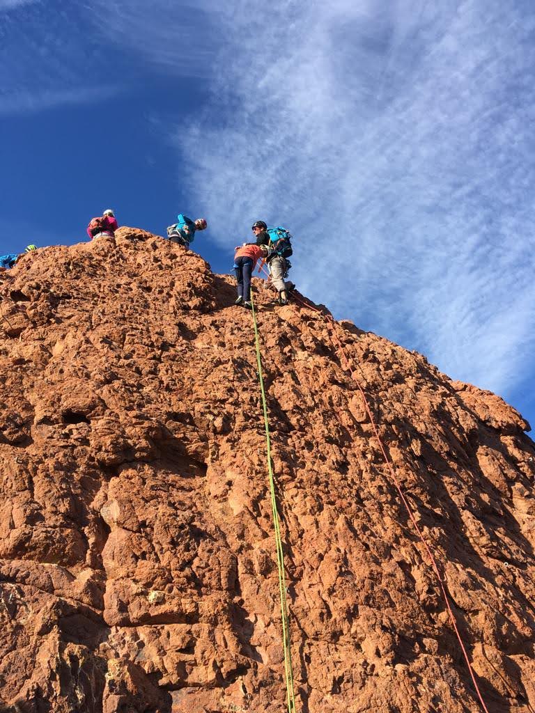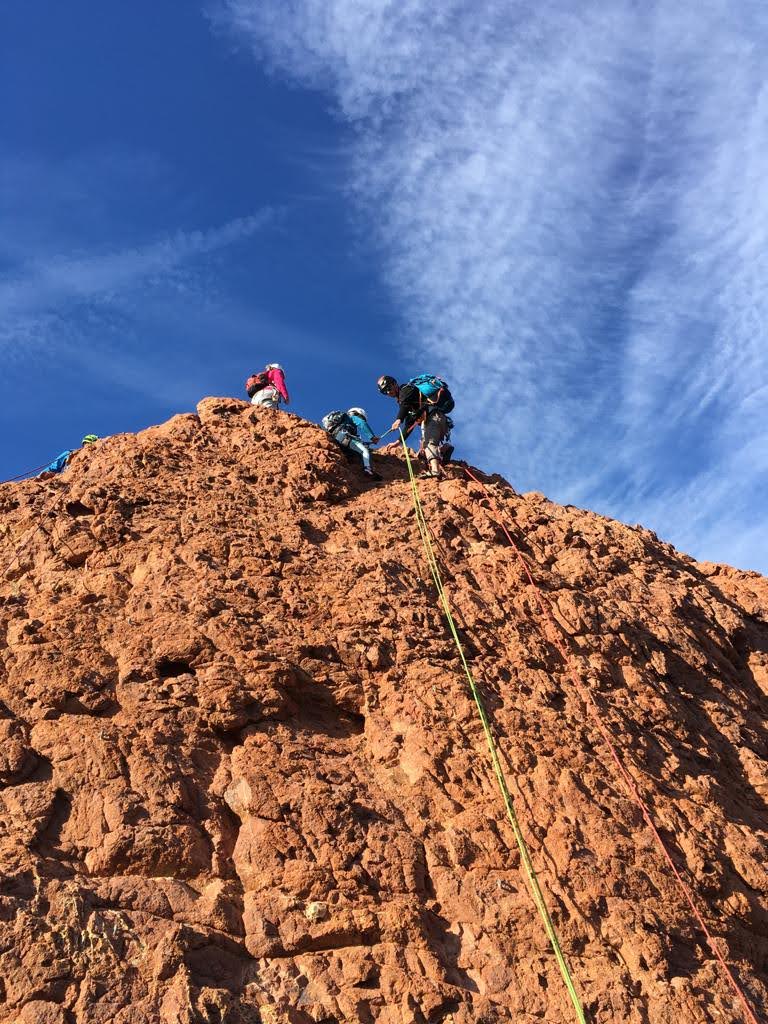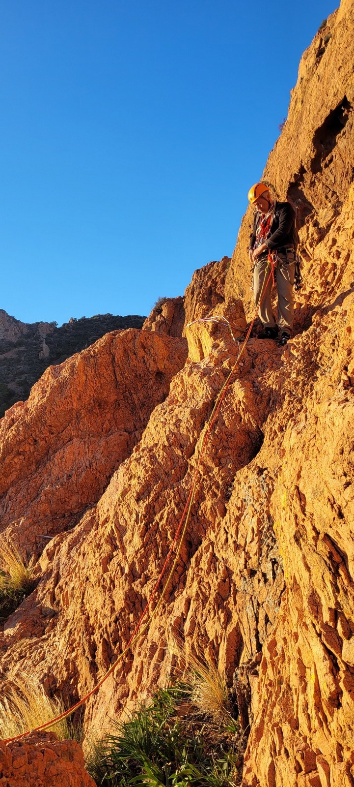 Nous planifions de nous retrouver au sommet pour manger un bout et repartir pour une seconde voie l’après-midi si le timing est correct (au moins une partie du groupe). Il faut garder à l’esprit que le soleil se couche à 17h et qu’il fait nuit à 17h30 ! Ainsi, les cordées s’activent aux sons des messages dans les talkies. Un « assuré » par-ci, un « départ bleu » par là me permet de garder à l’esprit où en est chacun de mes grimpeurs.