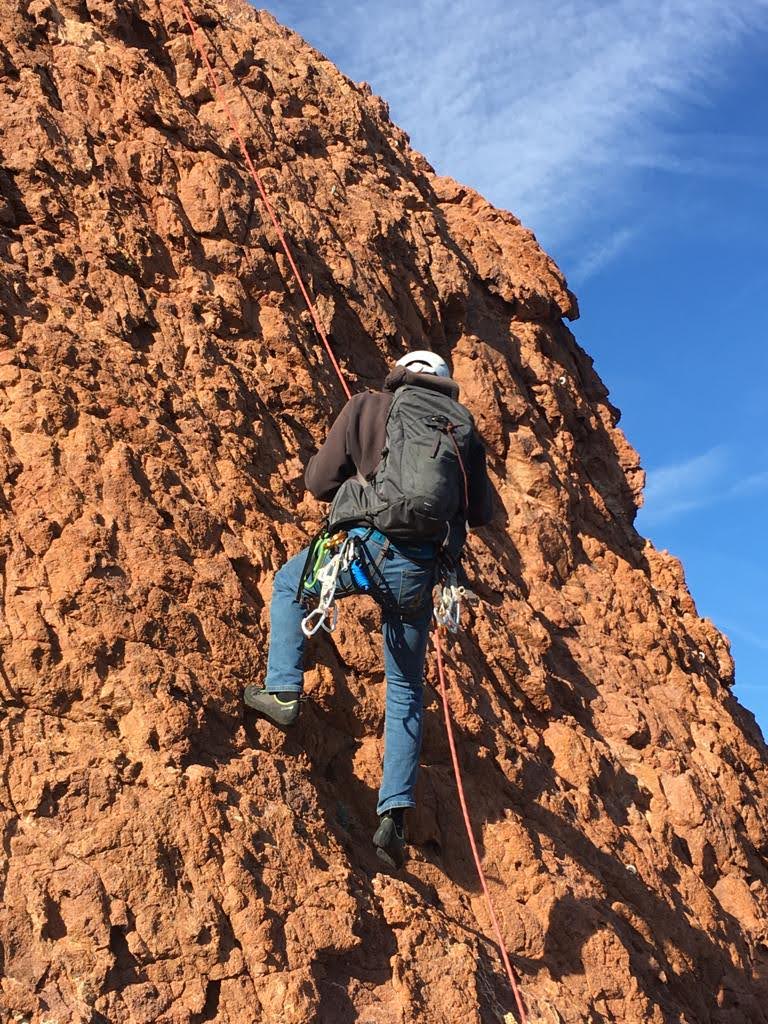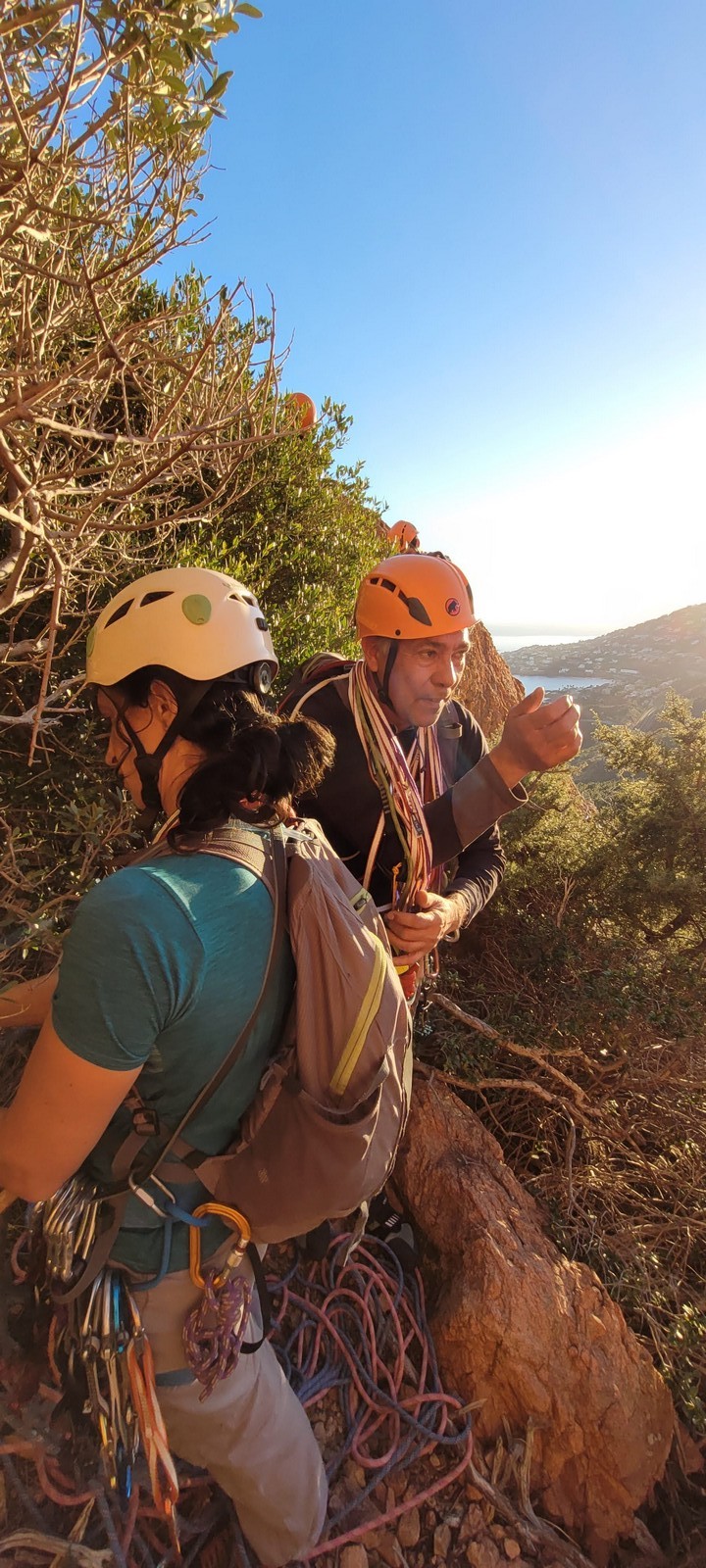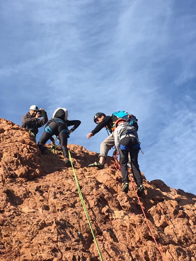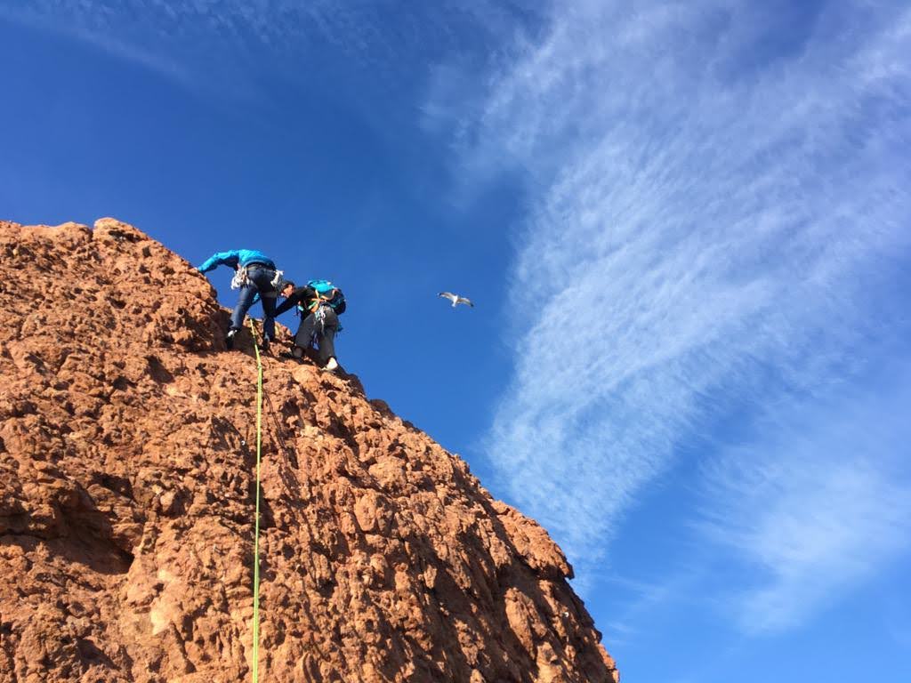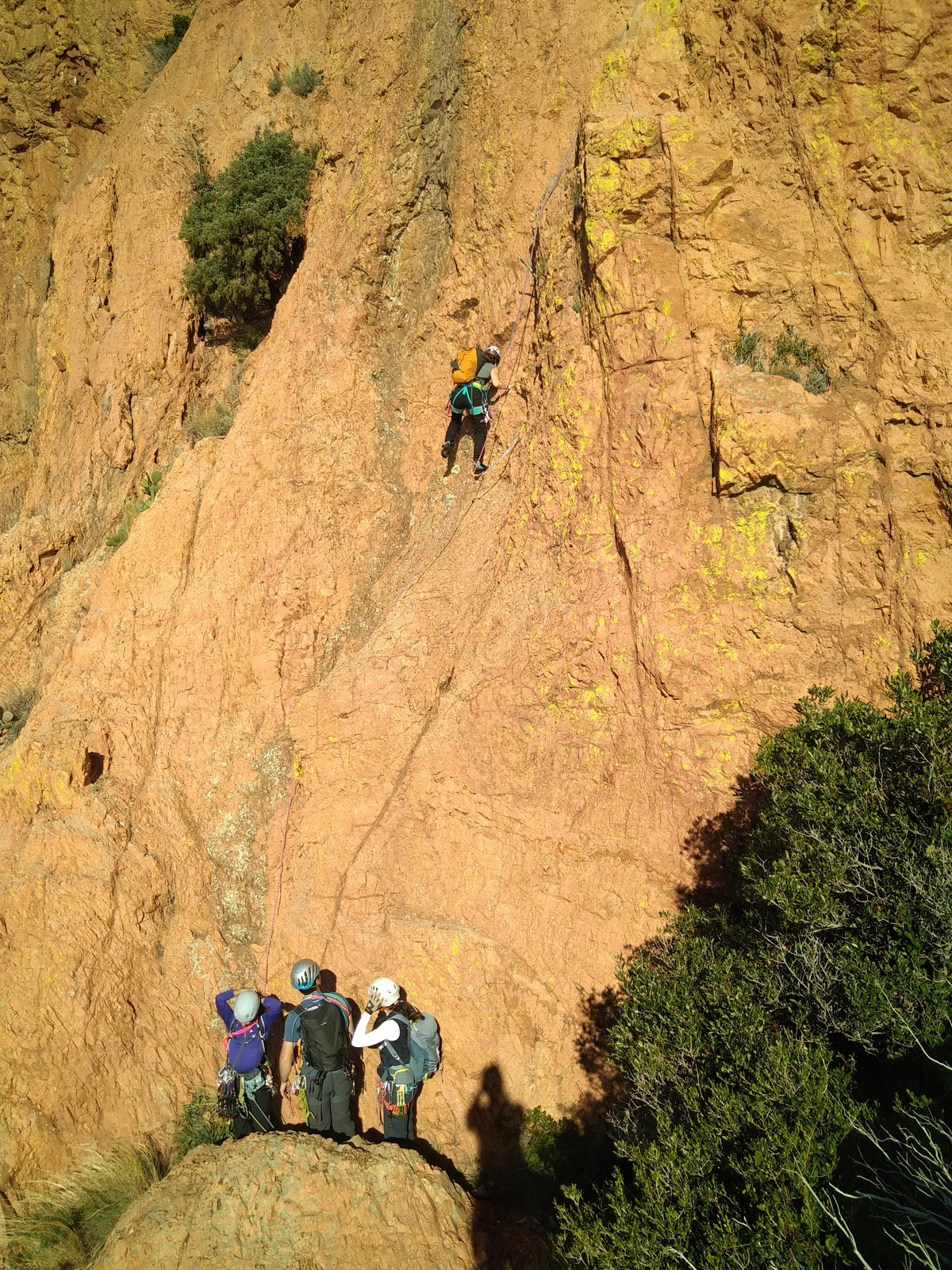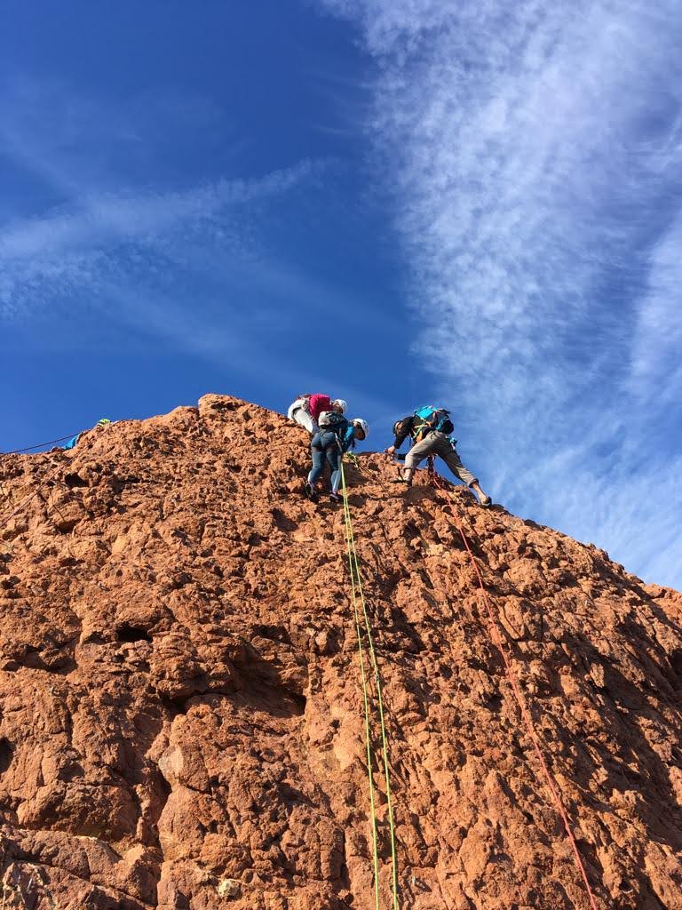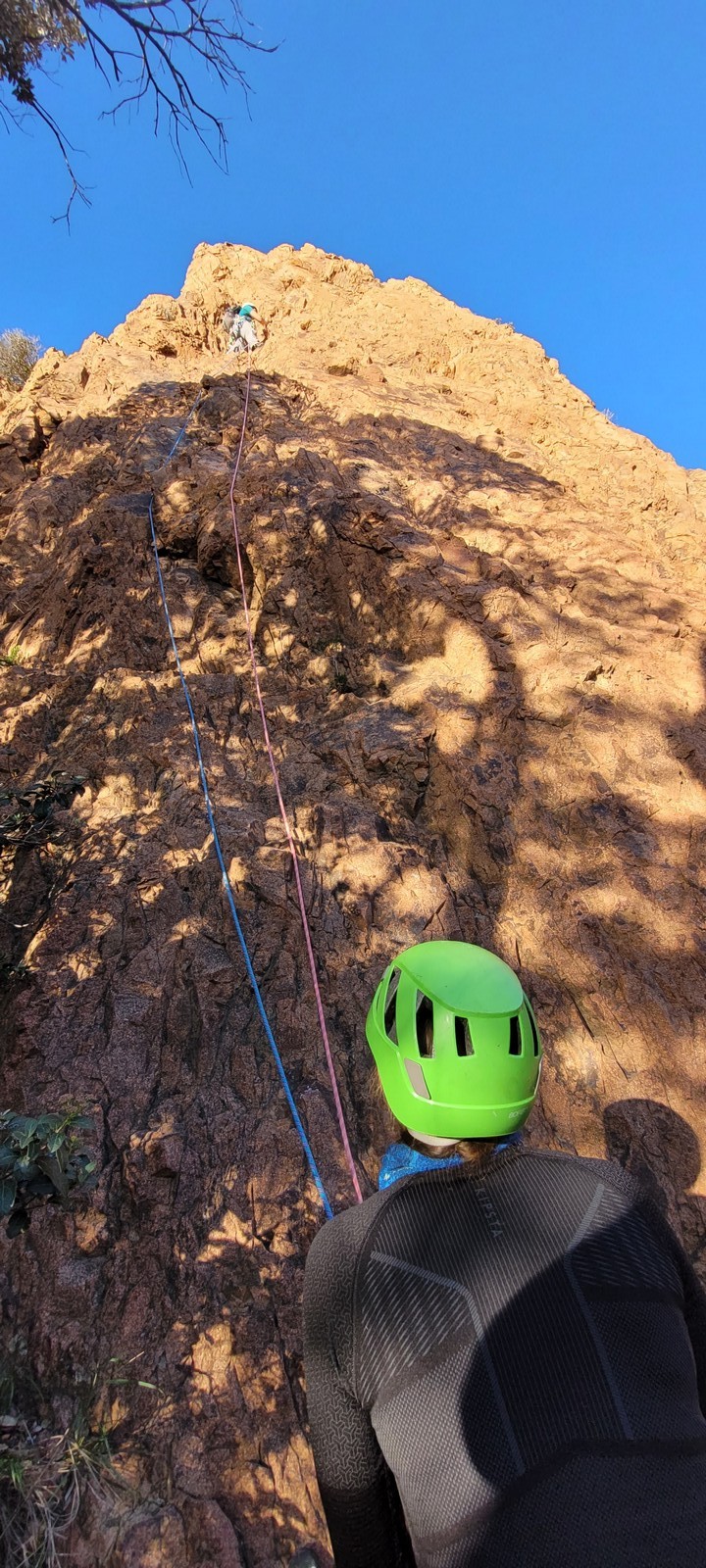 Nous planifions de nous retrouver au sommet pour manger un bout et repartir pour une seconde voie l’après-midi si le timing est correct (au moins une partie du groupe). Il faut garder à l’esprit que le soleil se couche à 17h et qu’il fait nuit à 17h30 ! Ainsi, les cordées s’activent aux sons des messages dans les talkies. Un « assuré » par-ci, un « départ bleu » par là me permet de garder à l’esprit où en est chacun de mes grimpeurs.