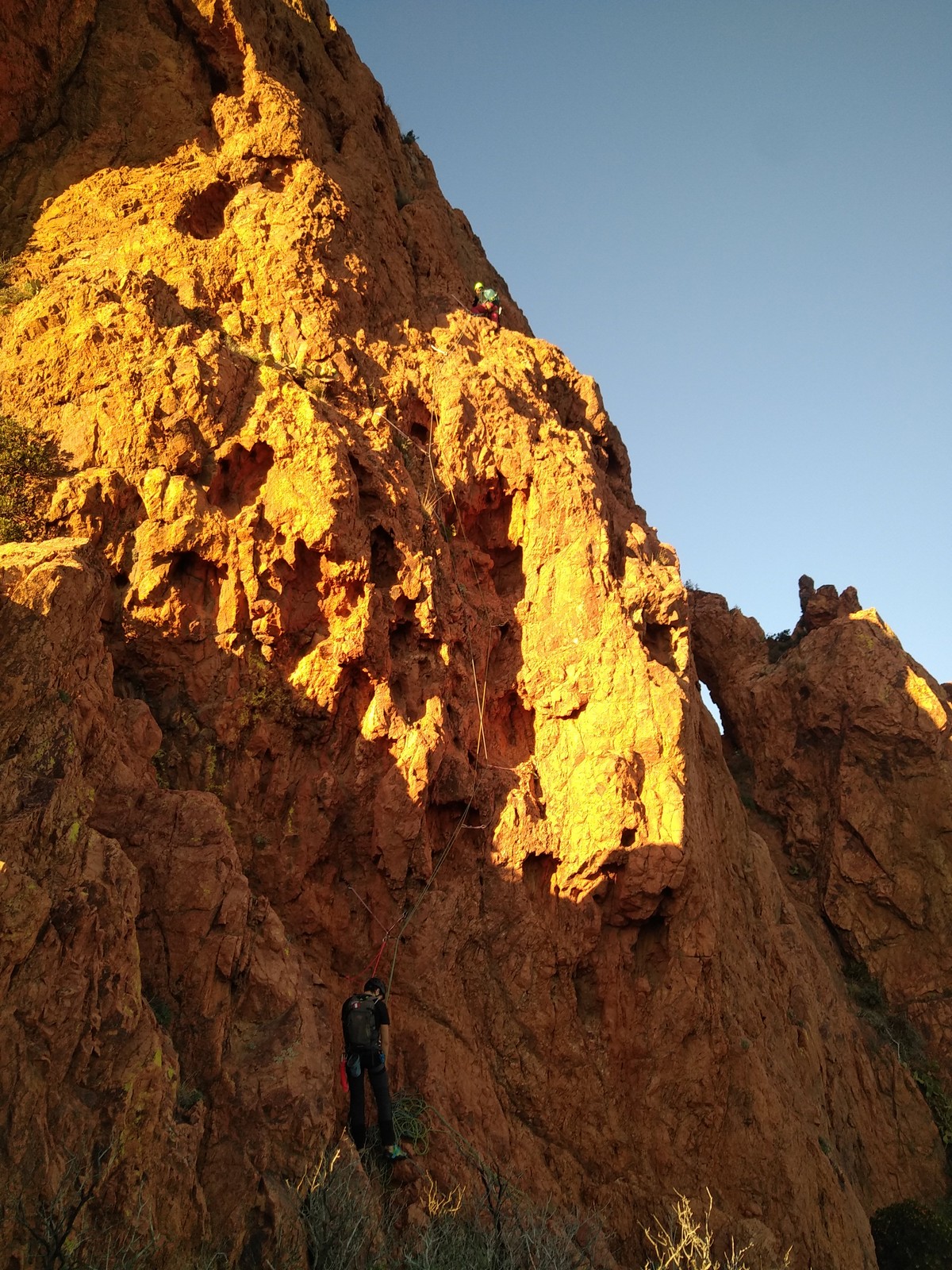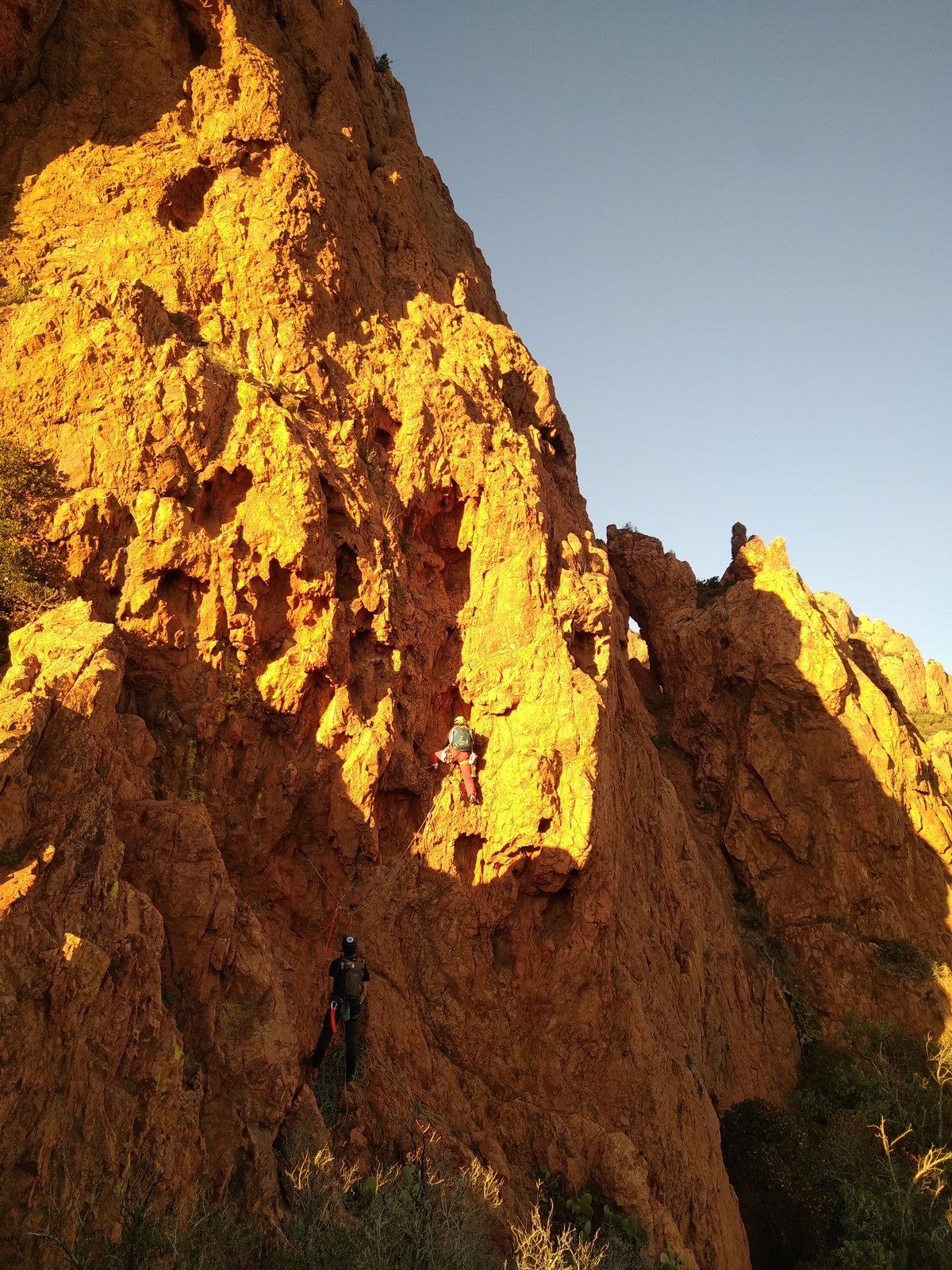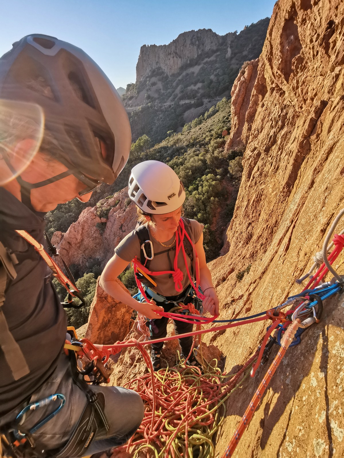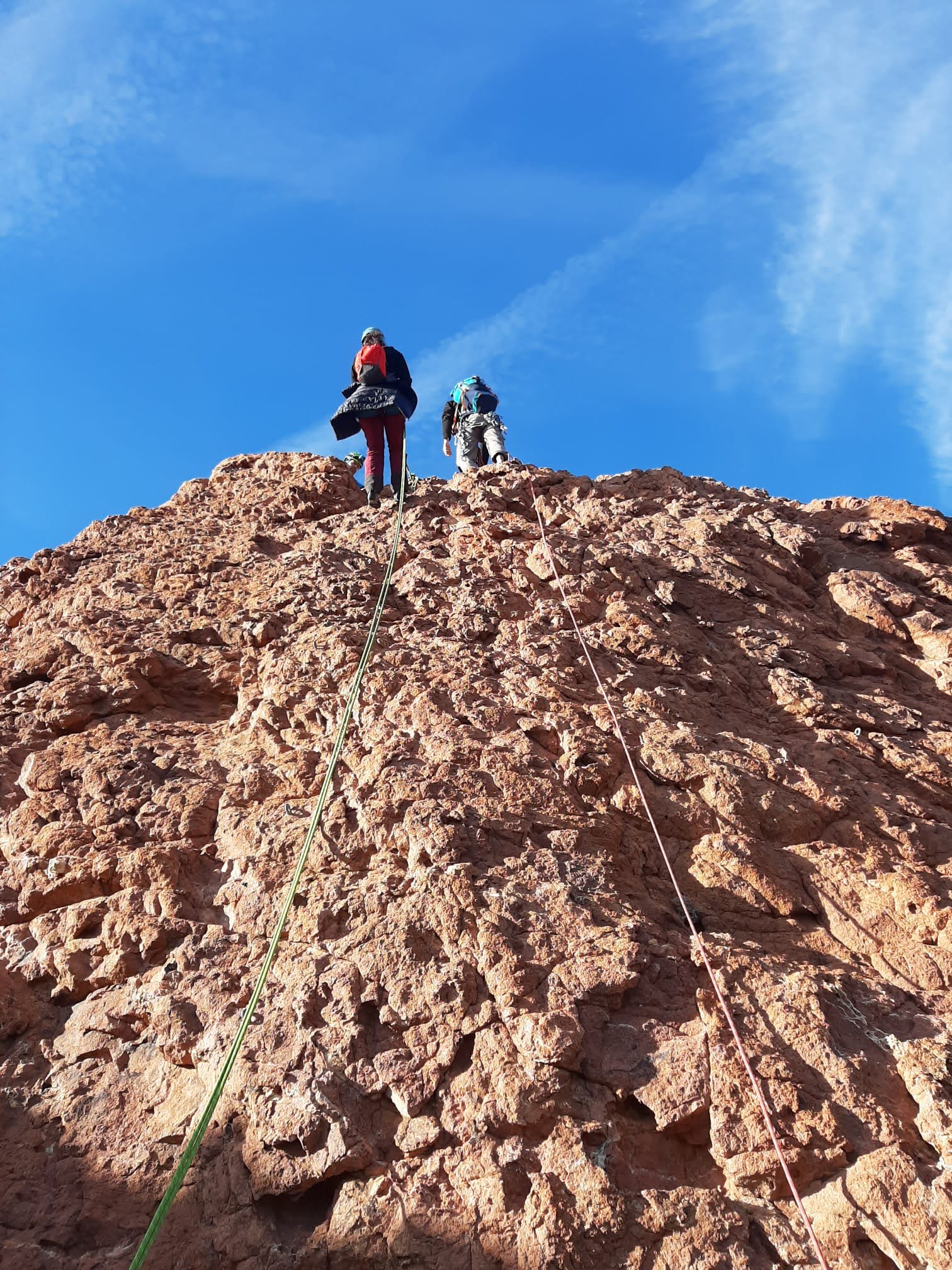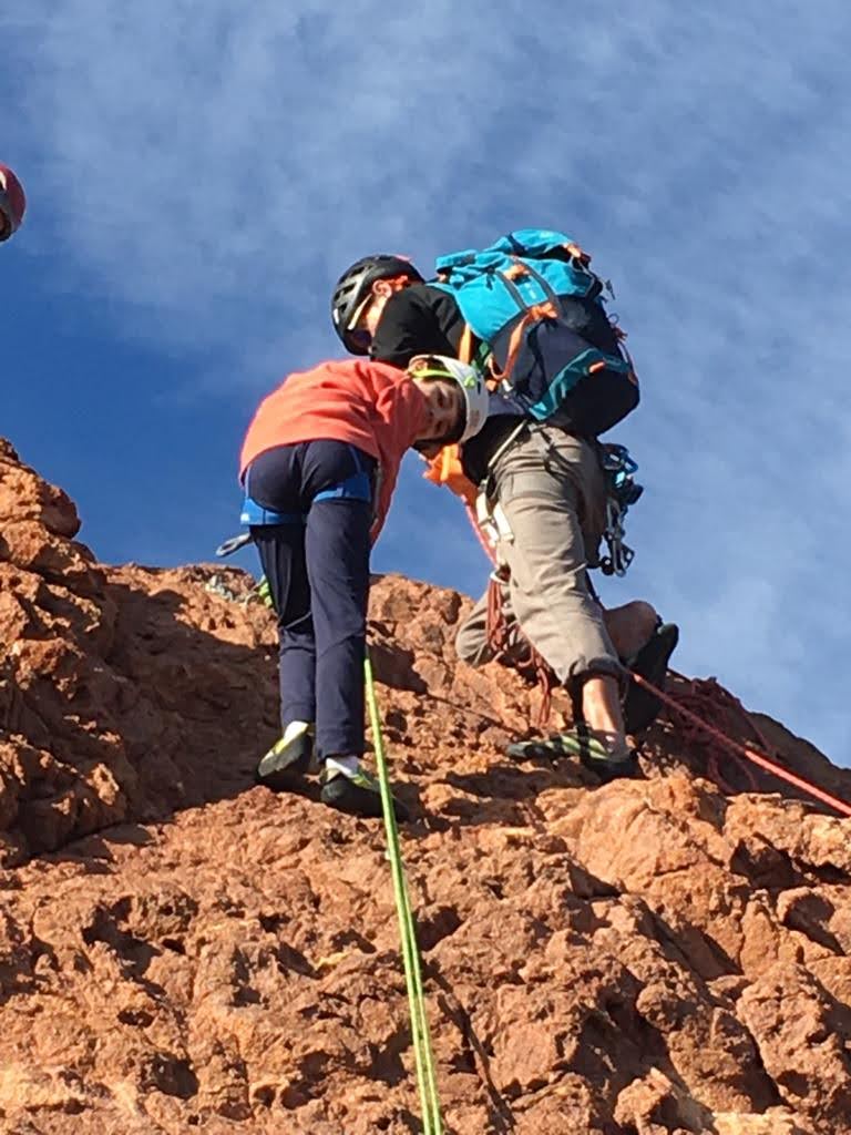 Nous planifions de nous retrouver au sommet pour manger un bout et repartir pour une seconde voie l’après-midi si le timing est correct (au moins une partie du groupe). Il faut garder à l’esprit que le soleil se couche à 17h et qu’il fait nuit à 17h30 ! Ainsi, les cordées s’activent aux sons des messages dans les talkies. Un « assuré » par-ci, un « départ bleu » par là me permet de garder à l’esprit où en est chacun de mes grimpeurs.