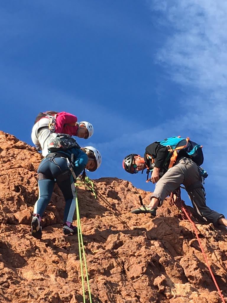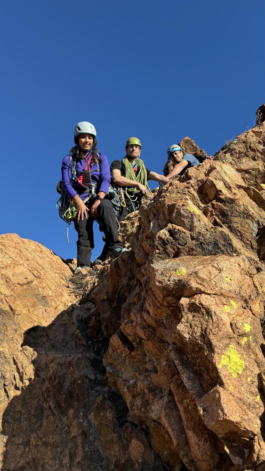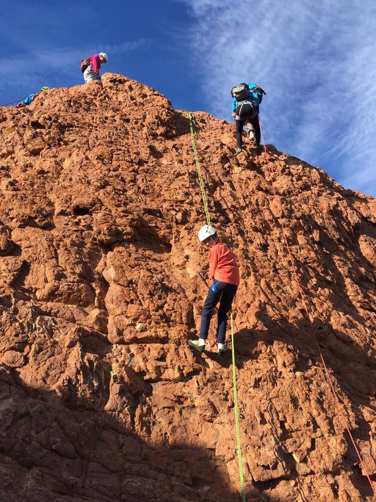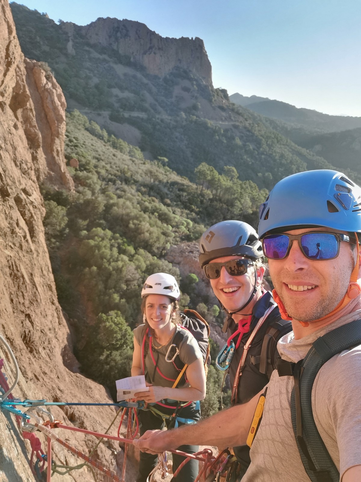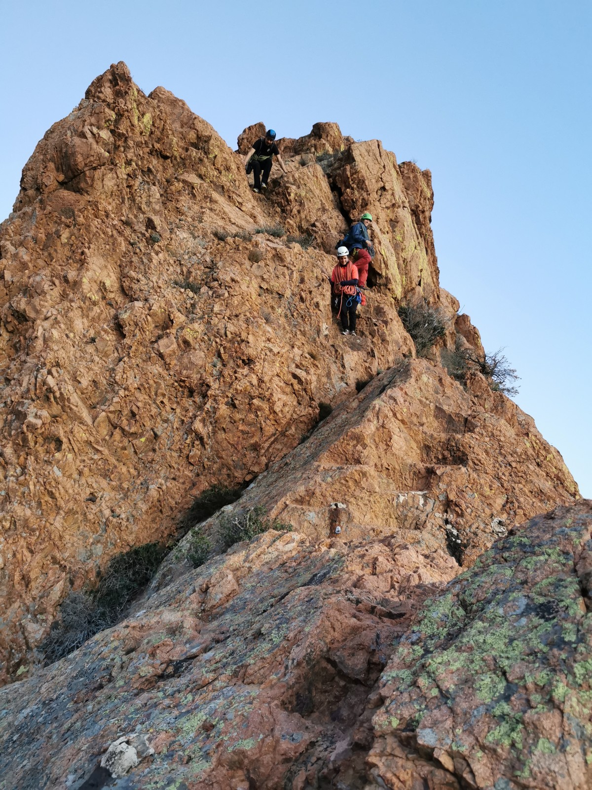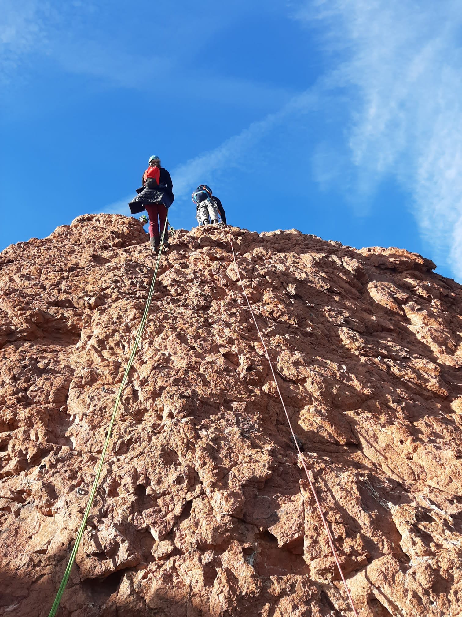 Nous planifions de nous retrouver au sommet pour manger un bout et repartir pour une seconde voie l’après-midi si le timing est correct (au moins une partie du groupe). Il faut garder à l’esprit que le soleil se couche à 17h et qu’il fait nuit à 17h30 ! Ainsi, les cordées s’activent aux sons des messages dans les talkies. Un « assuré » par-ci, un « départ bleu » par là me permet de garder à l’esprit où en est chacun de mes grimpeurs.