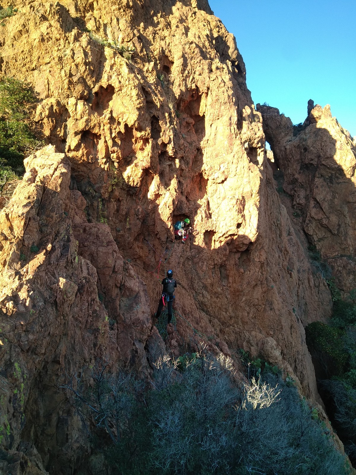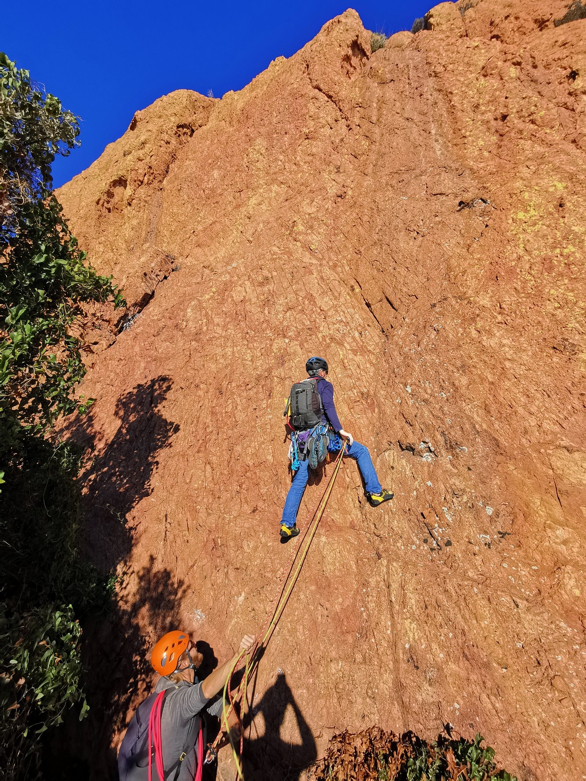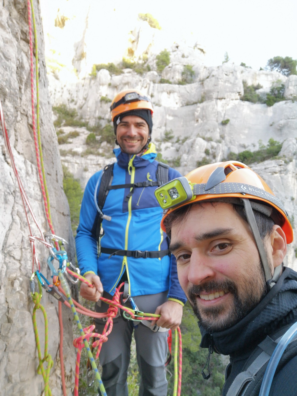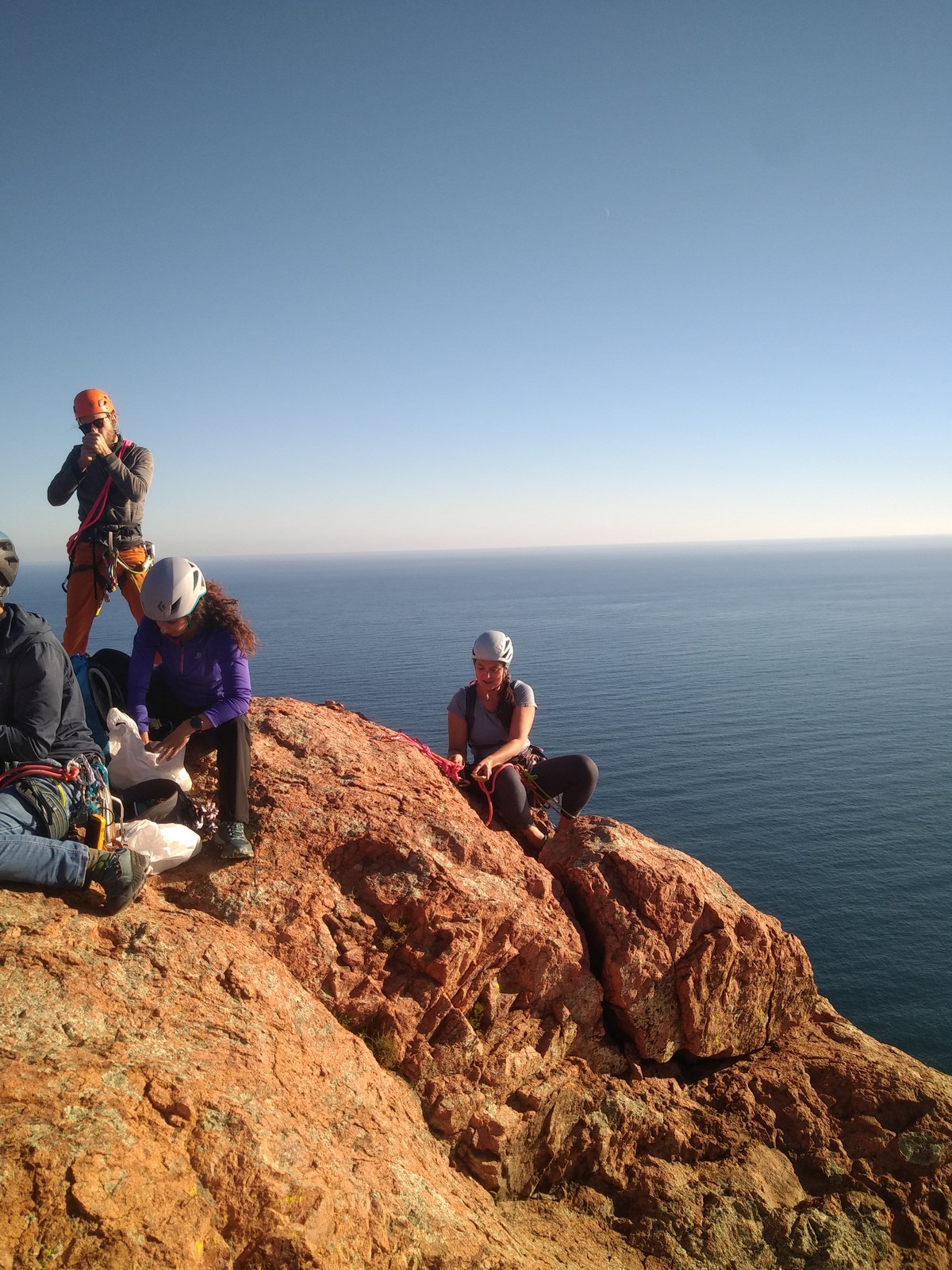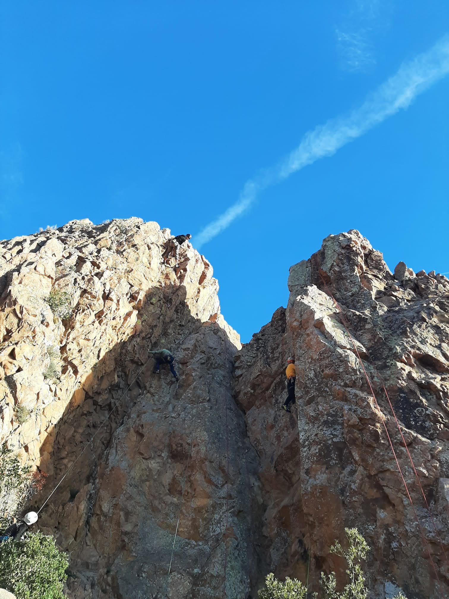 Nous planifions de nous retrouver au sommet pour manger un bout et repartir pour une seconde voie l’après-midi si le timing est correct (au moins une partie du groupe). Il faut garder à l’esprit que le soleil se couche à 17h et qu’il fait nuit à 17h30 ! Ainsi, les cordées s’activent aux sons des messages dans les talkies. Un « assuré » par-ci, un « départ bleu » par là me permet de garder à l’esprit où en est chacun de mes grimpeurs.