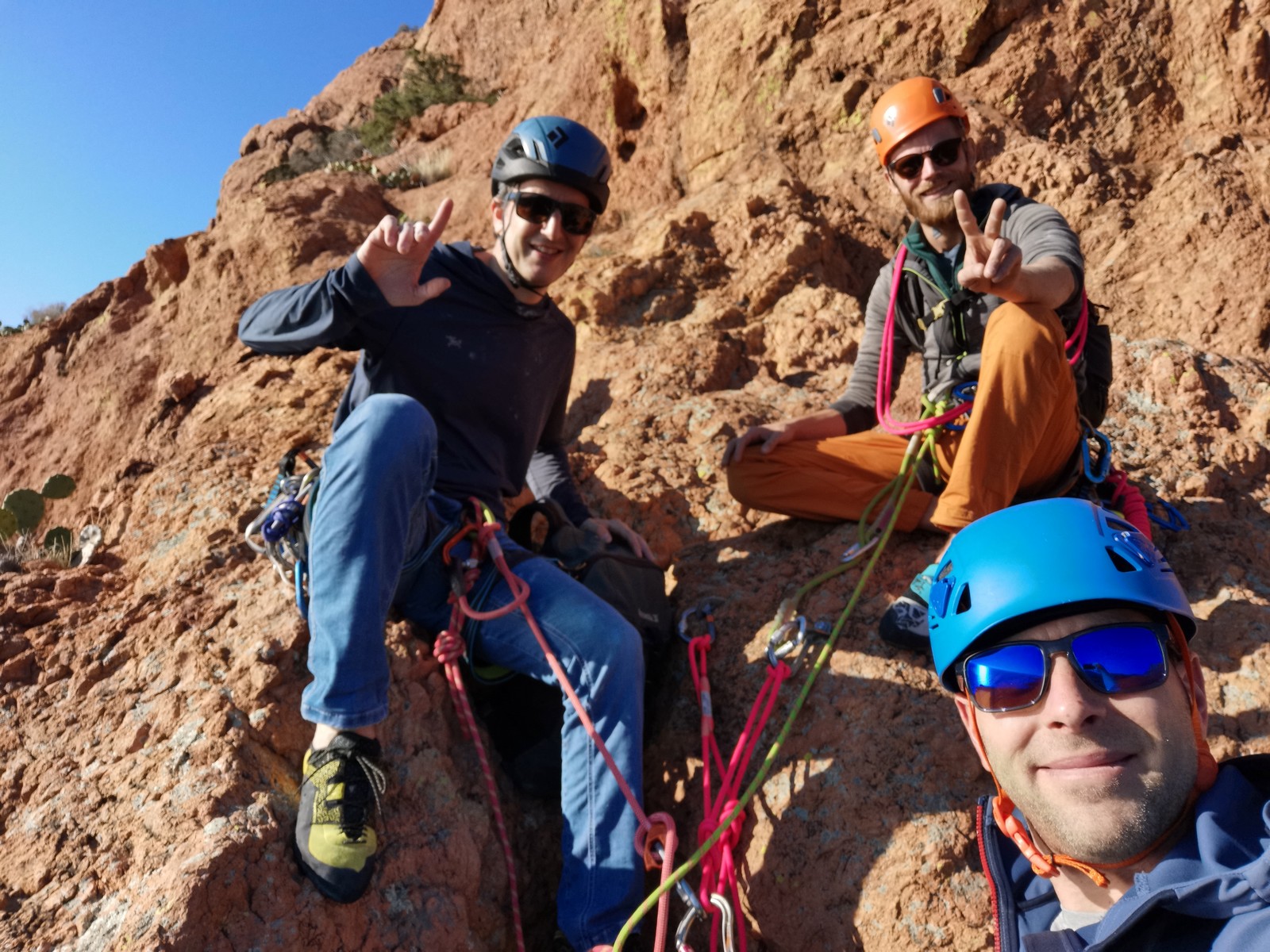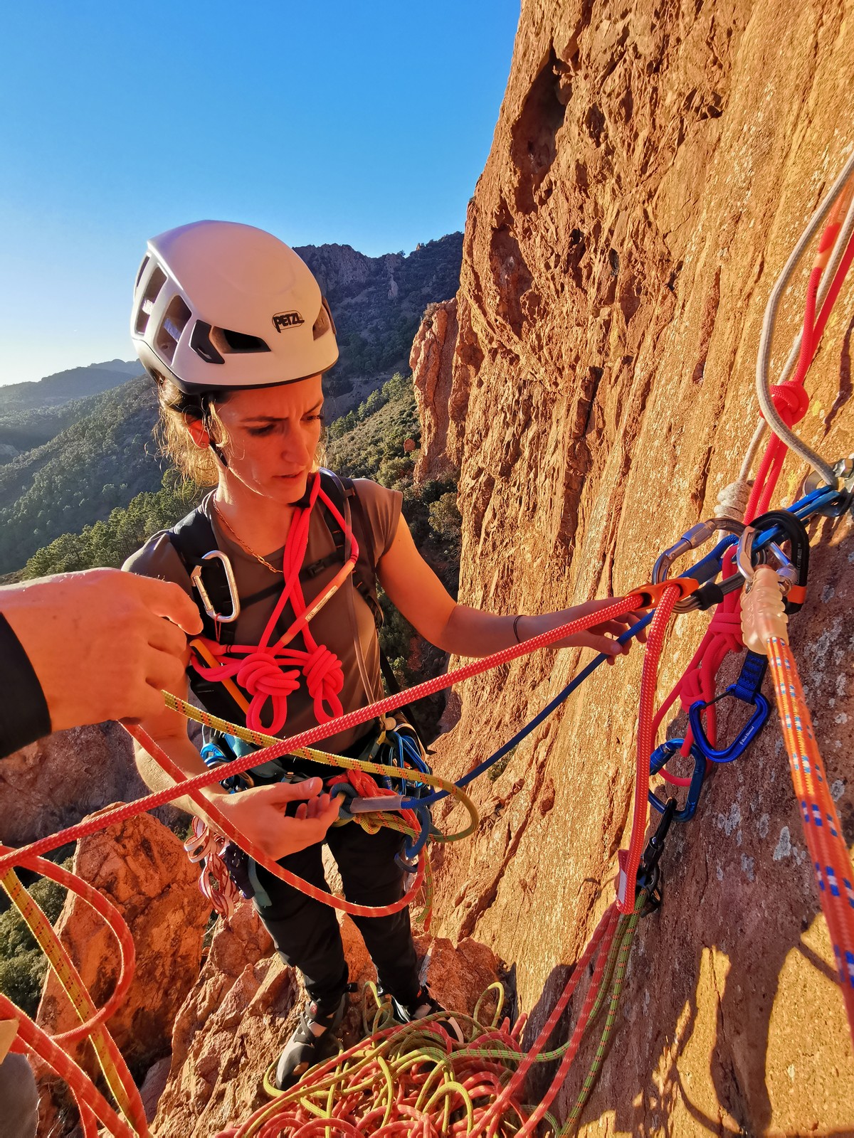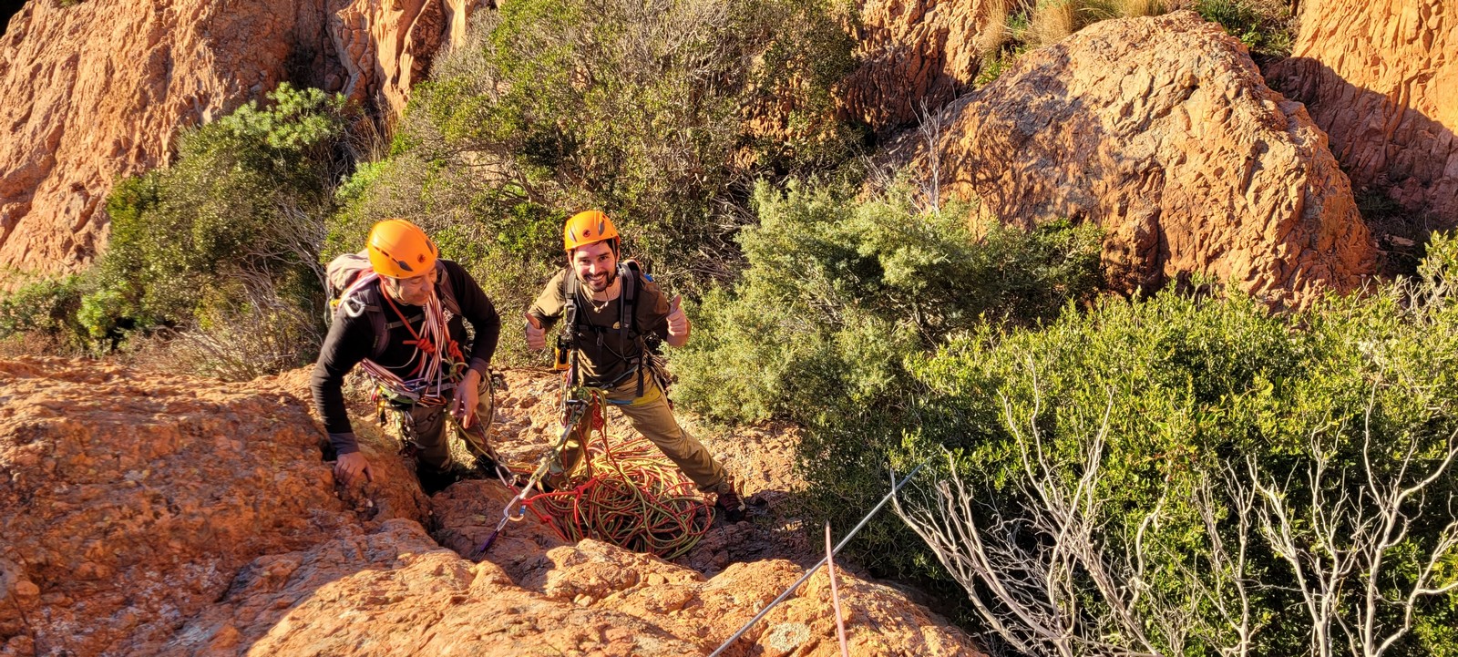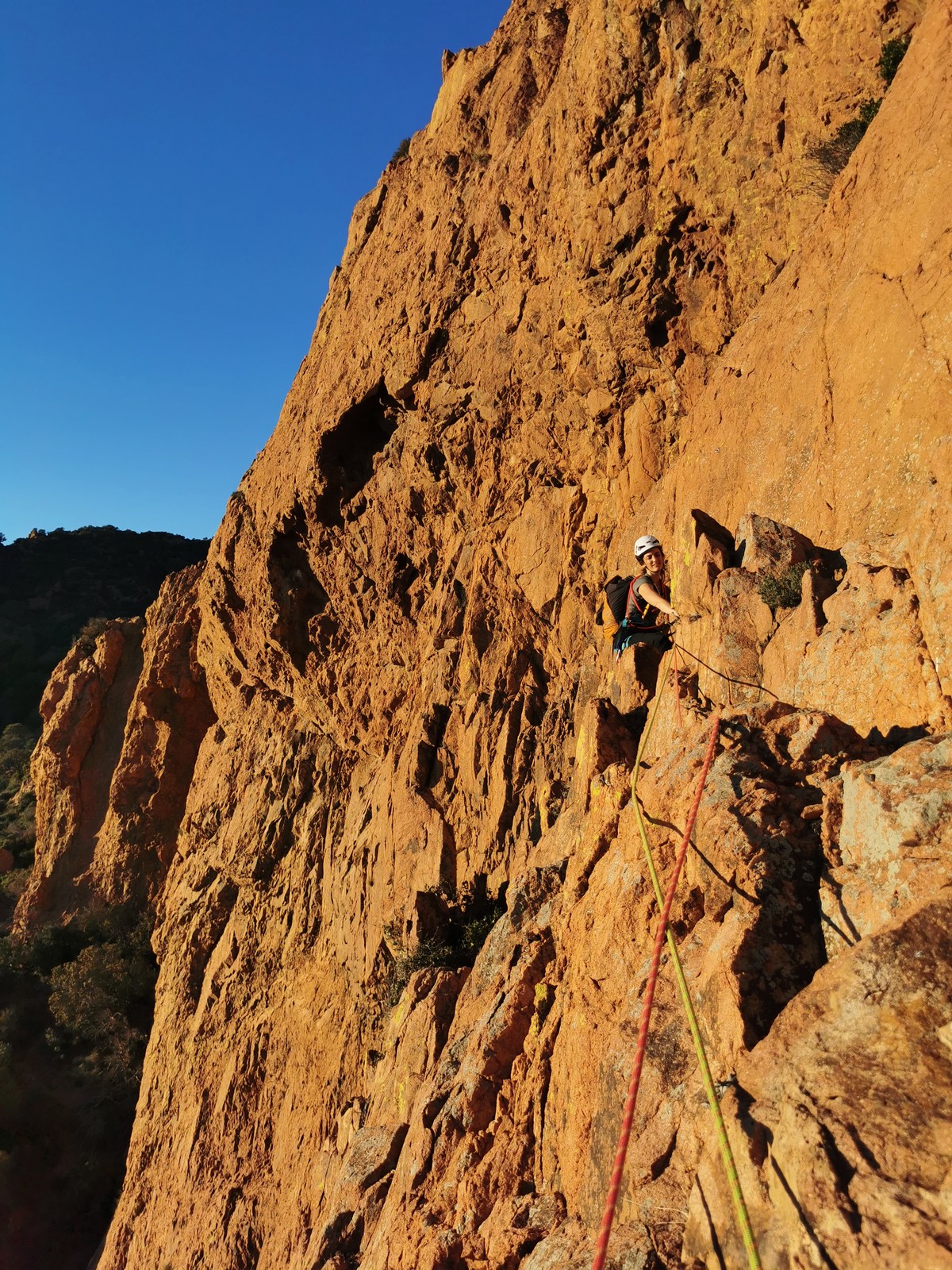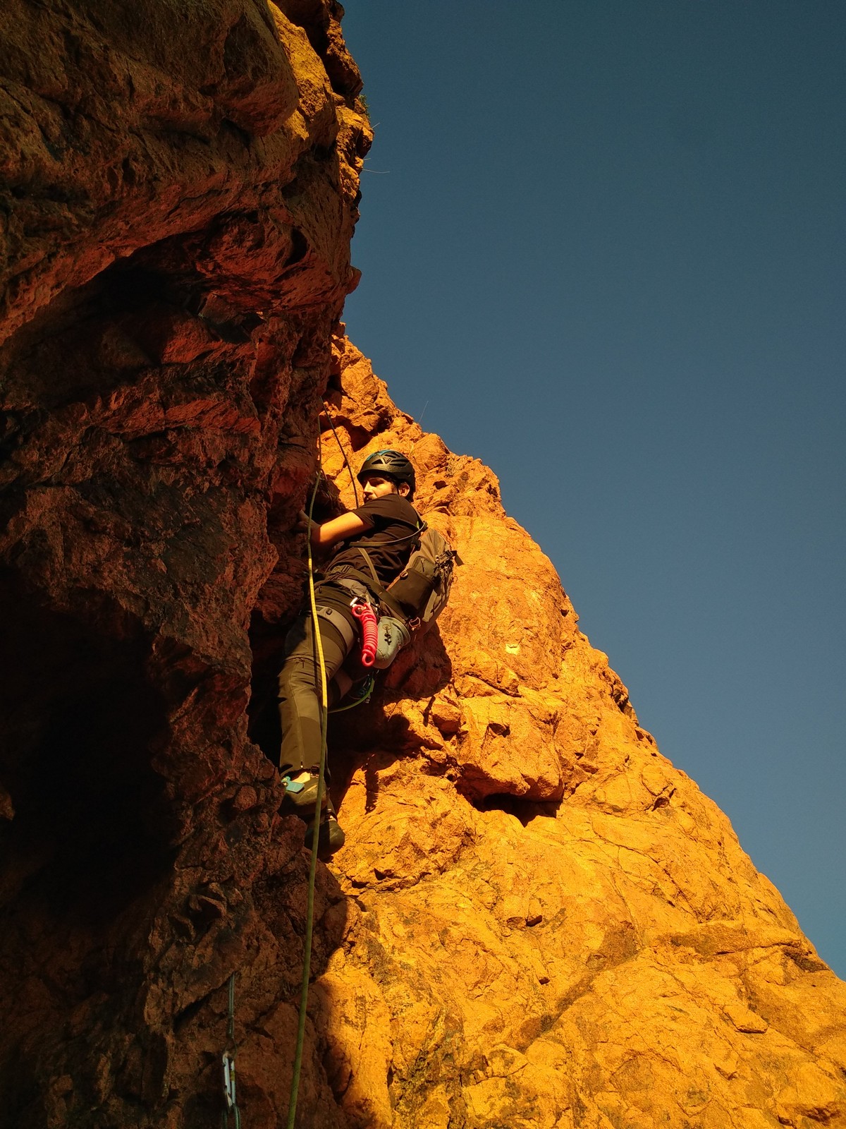 Nous planifions de nous retrouver au sommet pour manger un bout et repartir pour une seconde voie l’après-midi si le timing est correct (au moins une partie du groupe). Il faut garder à l’esprit que le soleil se couche à 17h et qu’il fait nuit à 17h30 ! Ainsi, les cordées s’activent aux sons des messages dans les talkies. Un « assuré » par-ci, un « départ bleu » par là me permet de garder à l’esprit où en est chacun de mes grimpeurs.