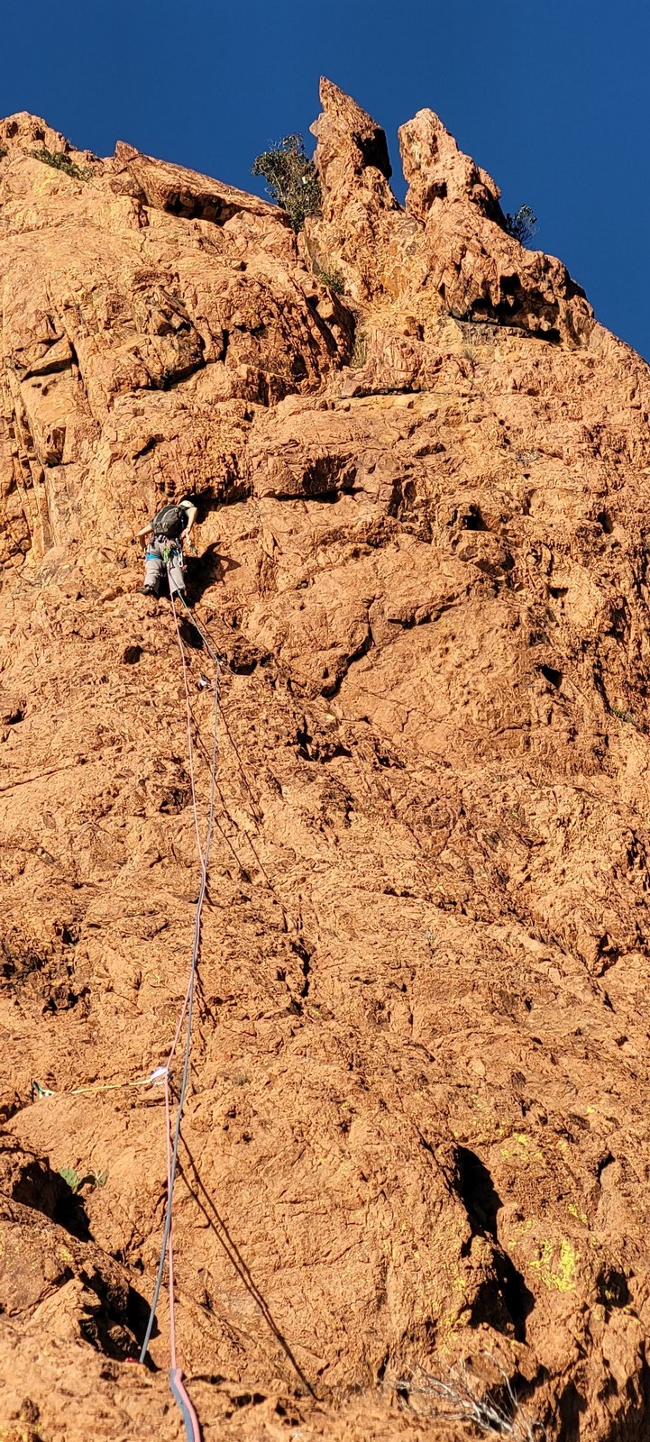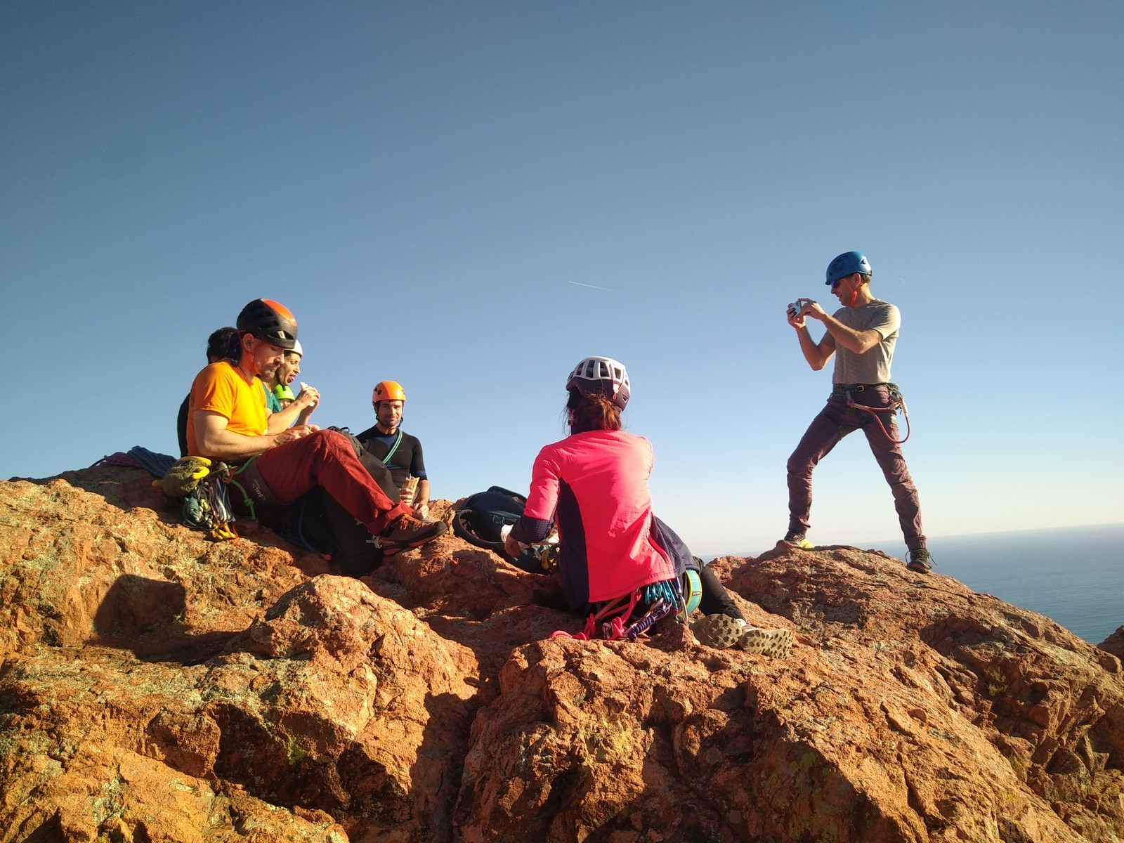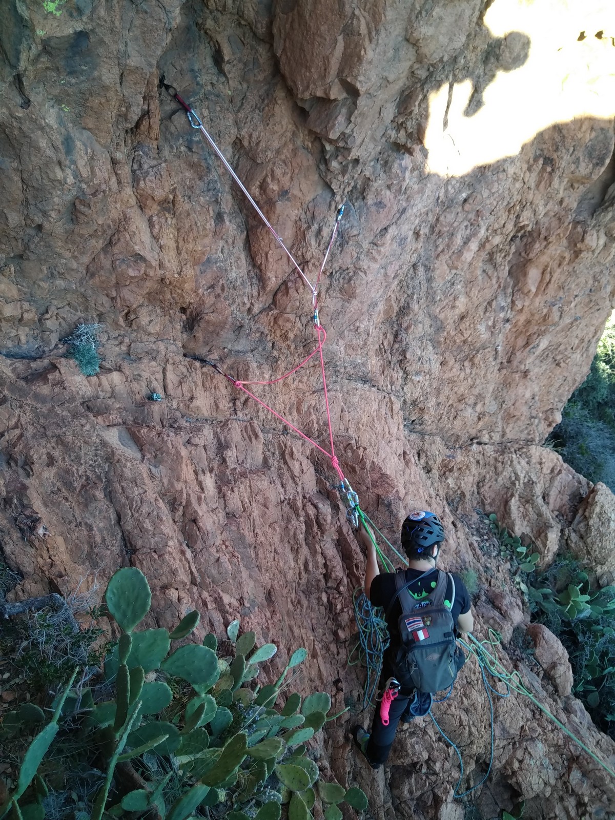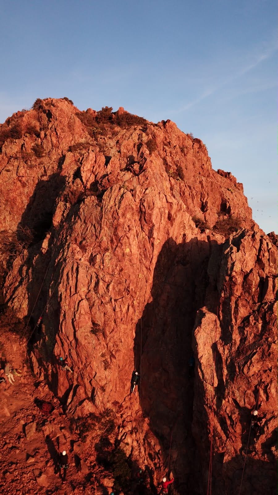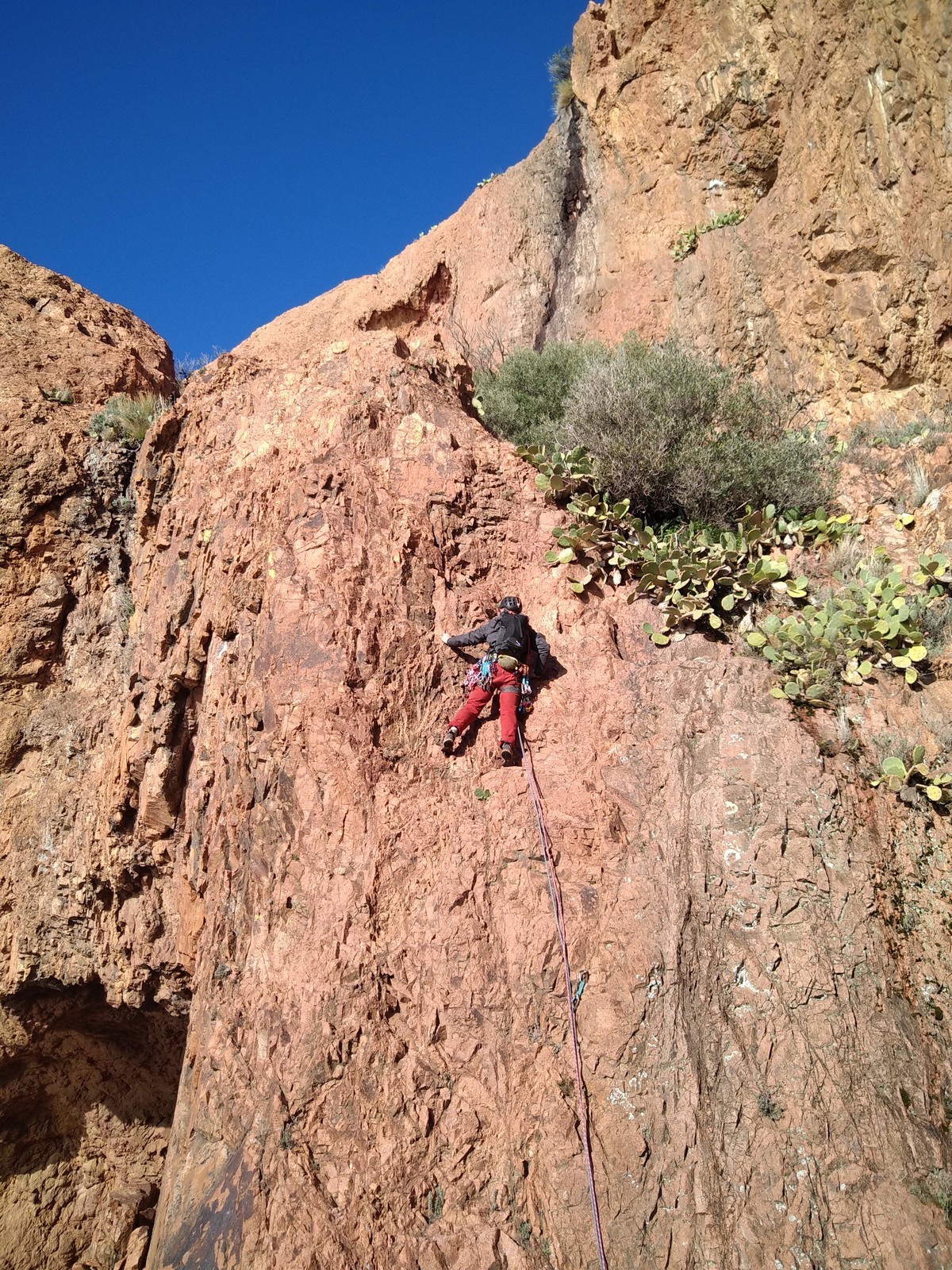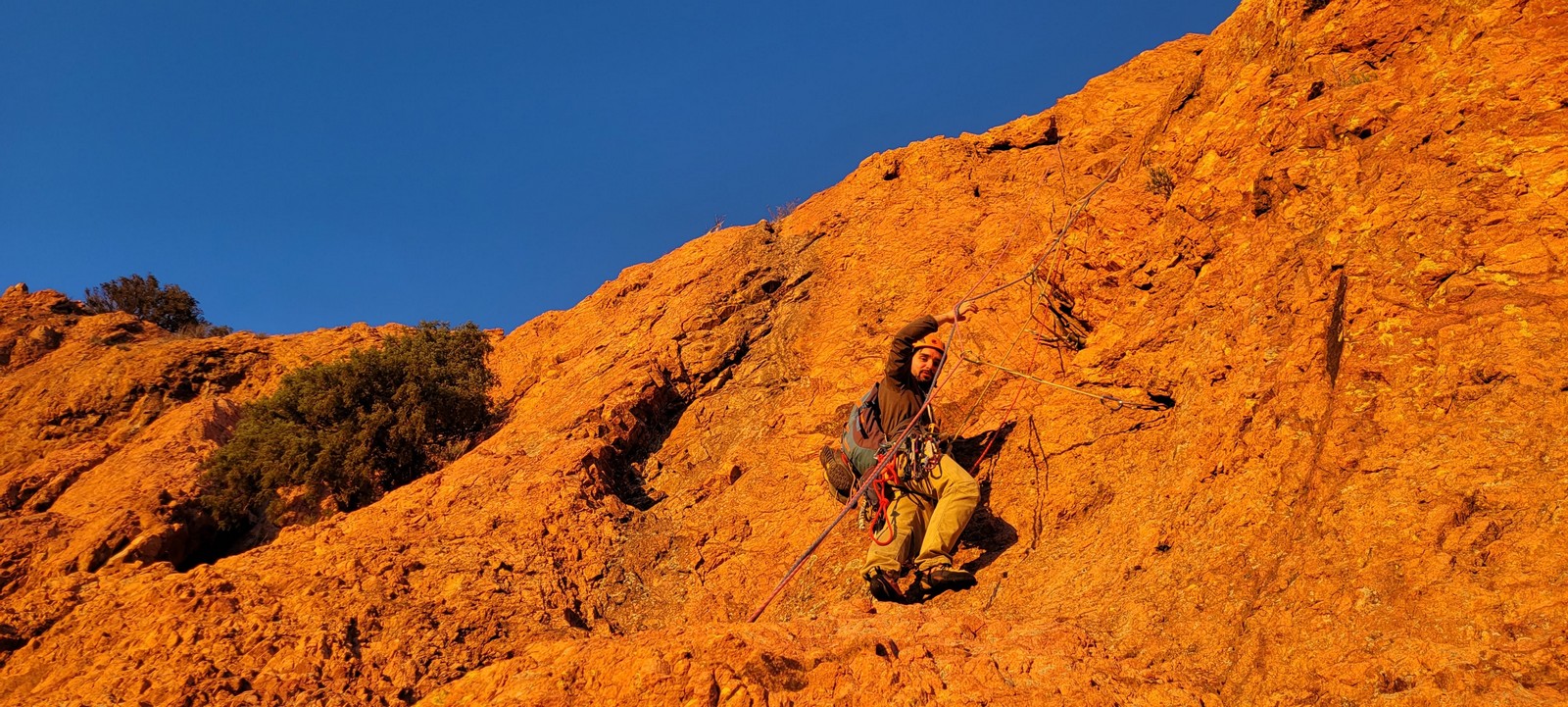 Nous planifions de nous retrouver au sommet pour manger un bout et repartir pour une seconde voie l’après-midi si le timing est correct (au moins une partie du groupe). Il faut garder à l’esprit que le soleil se couche à 17h et qu’il fait nuit à 17h30 ! Ainsi, les cordées s’activent aux sons des messages dans les talkies. Un « assuré » par-ci, un « départ bleu » par là me permet de garder à l’esprit où en est chacun de mes grimpeurs.